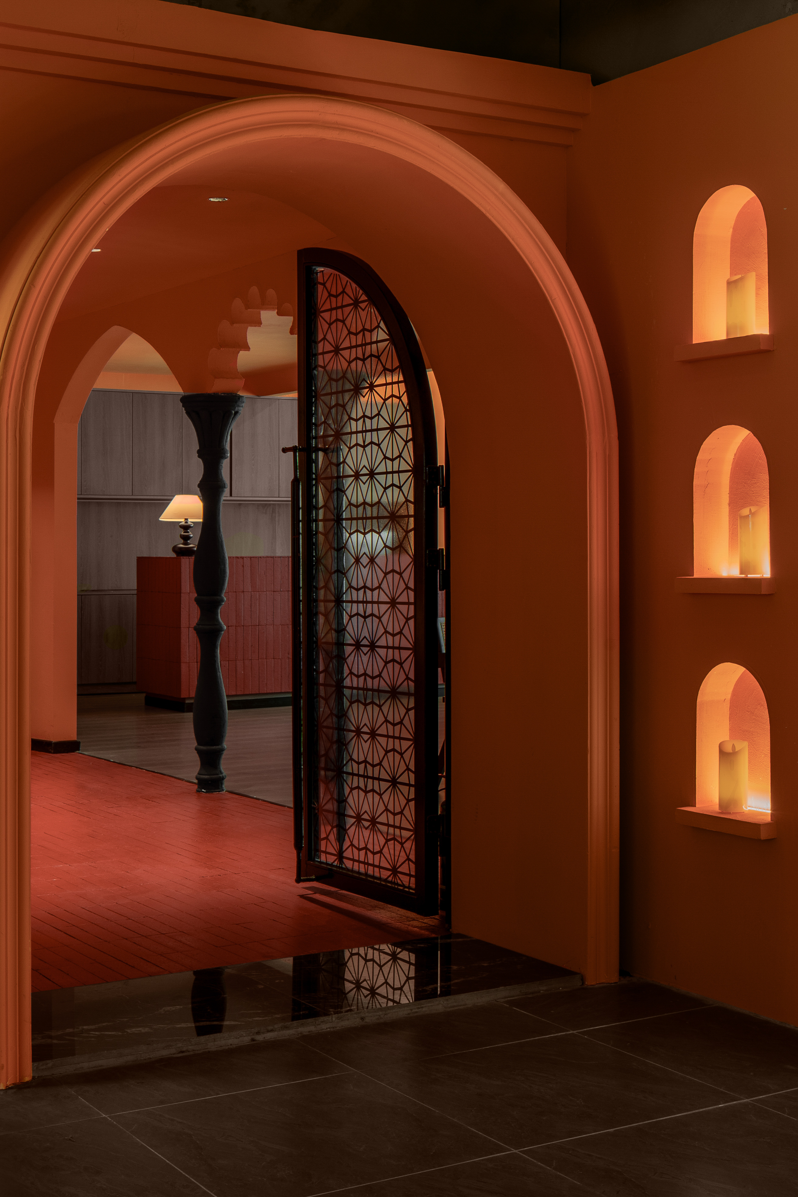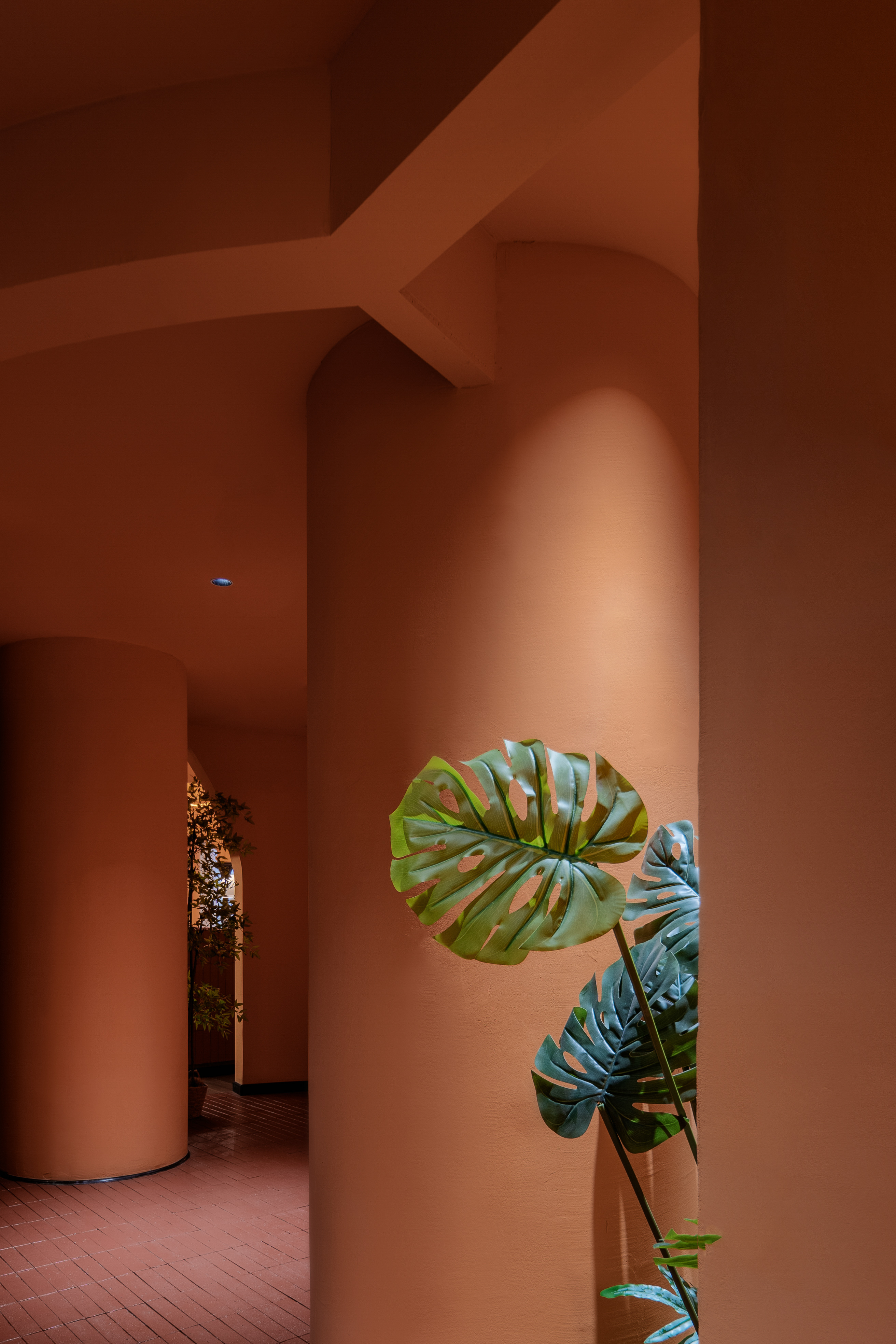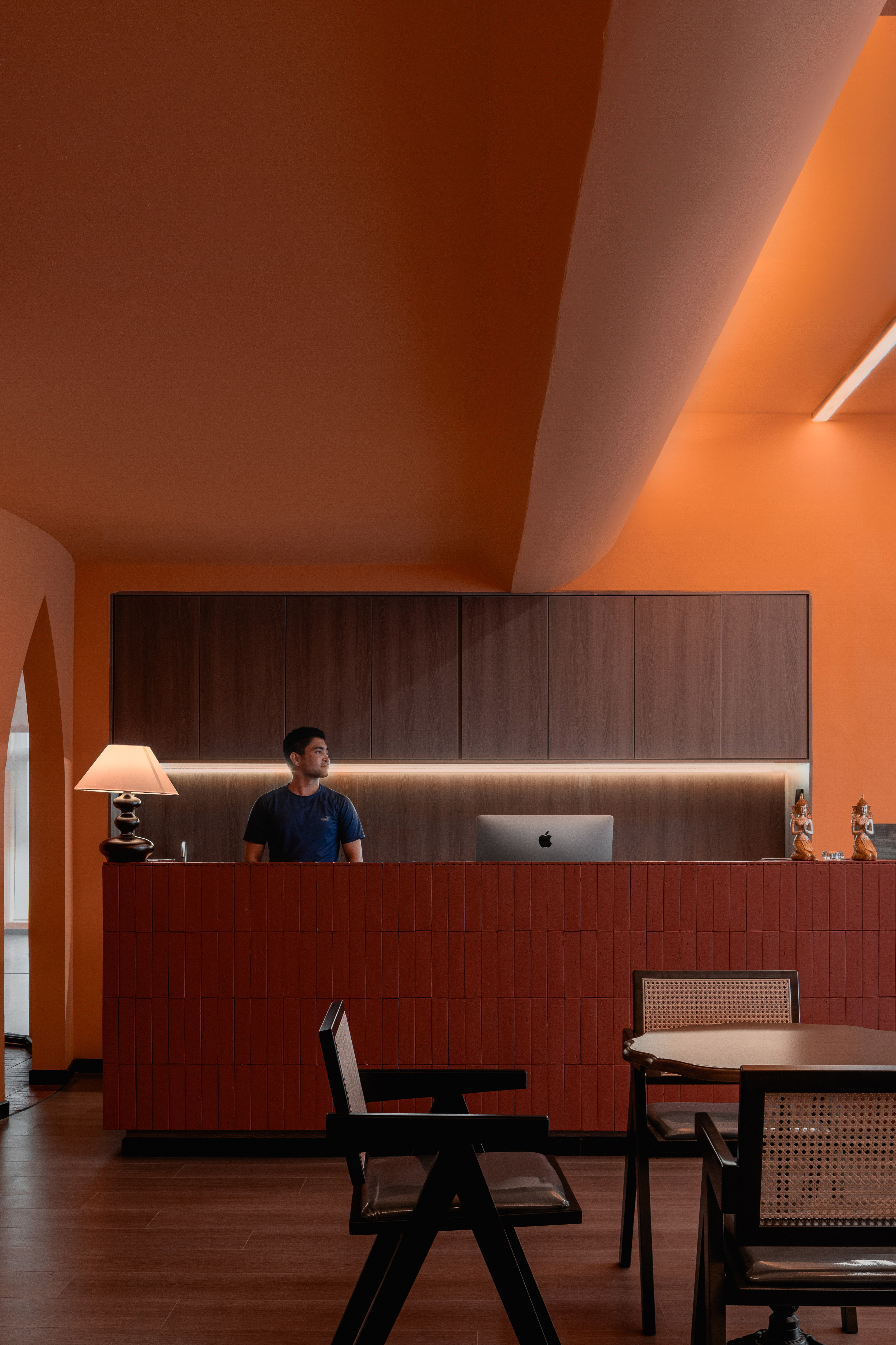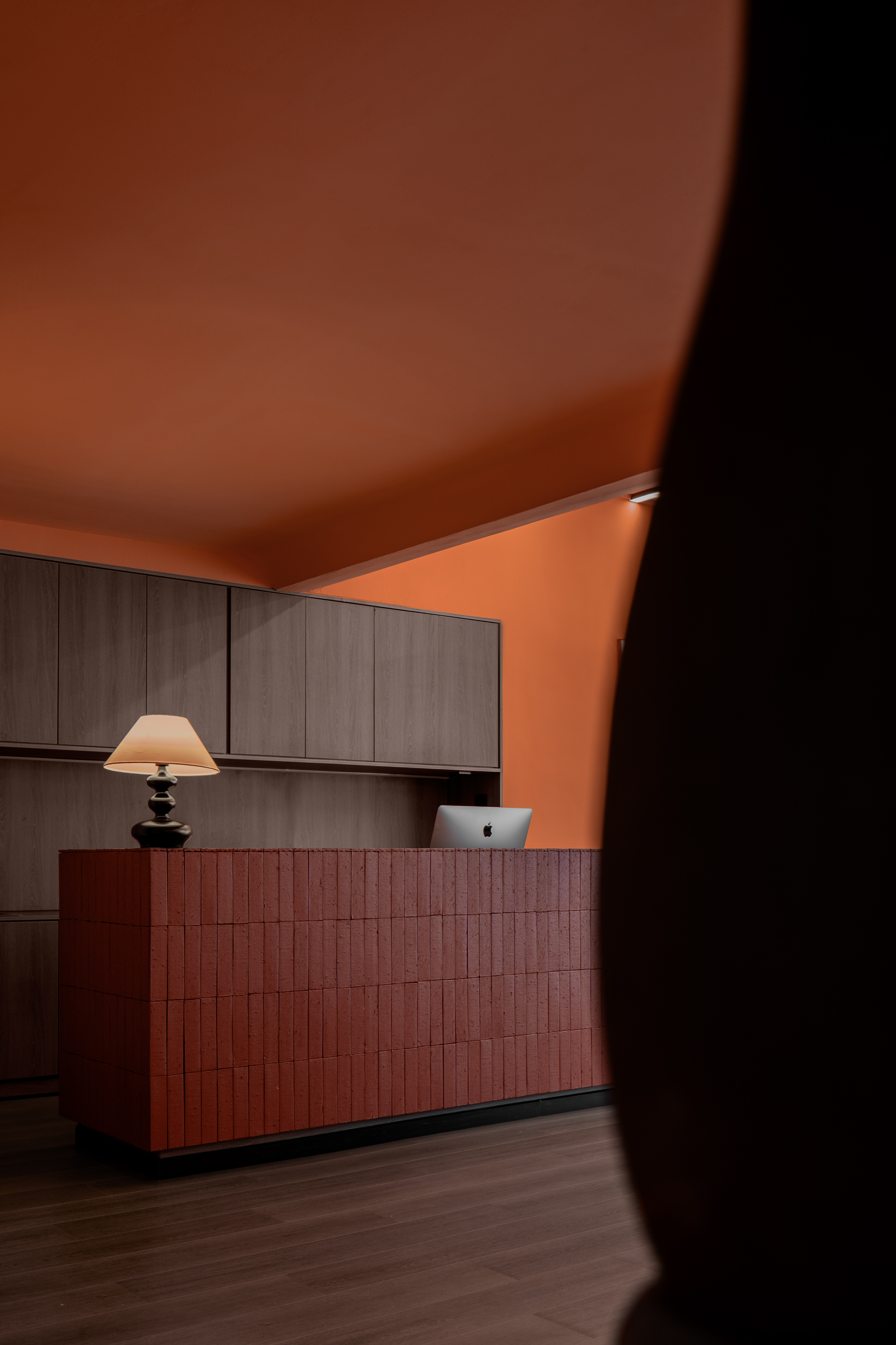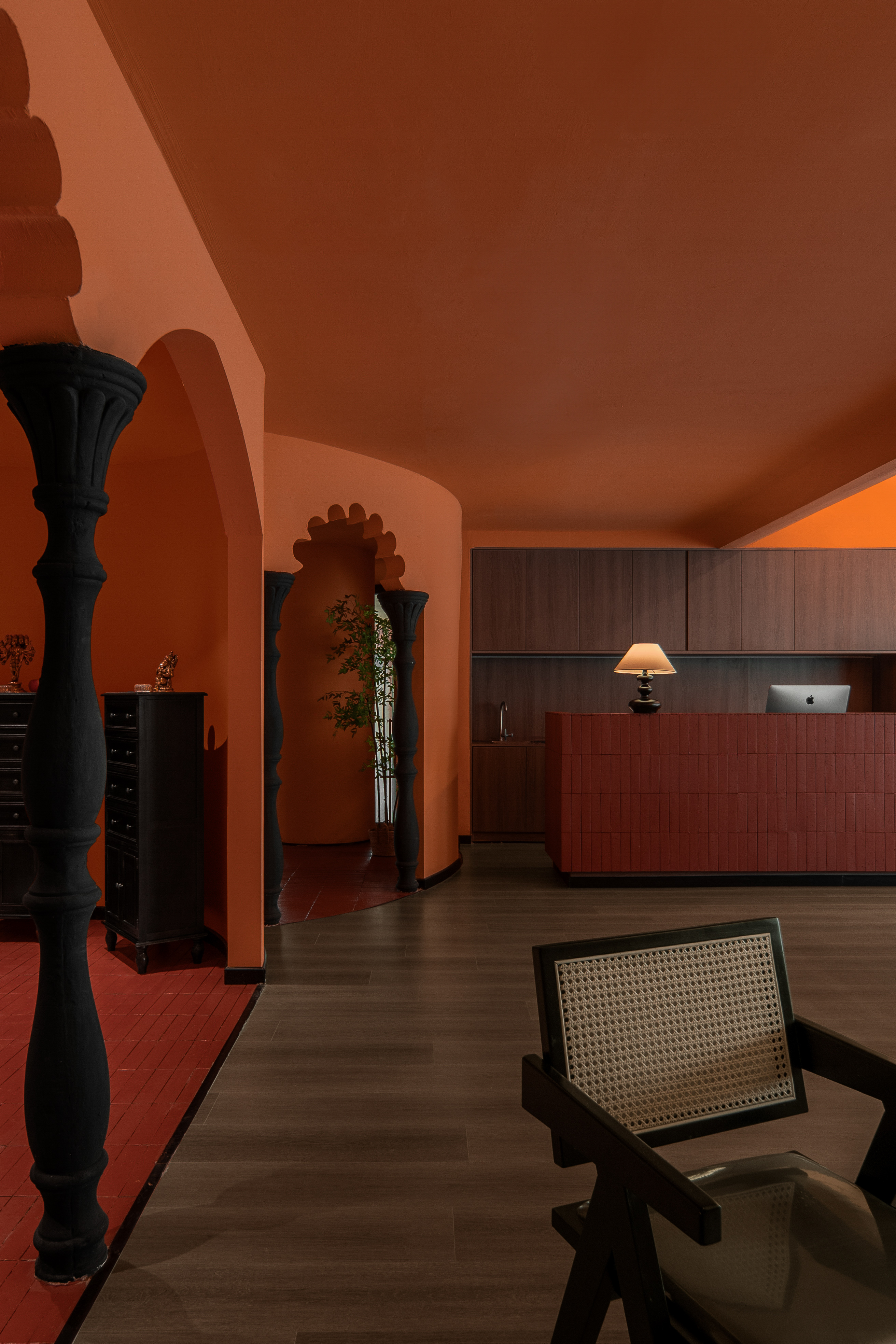 复古橘由门头开始延伸,拱门洞与一侧壁龛相呼应,纵向照明突出入口位置;茶桌与前台相互穿插,木纹与橘色艺术漆的组合,空间层次呼应。