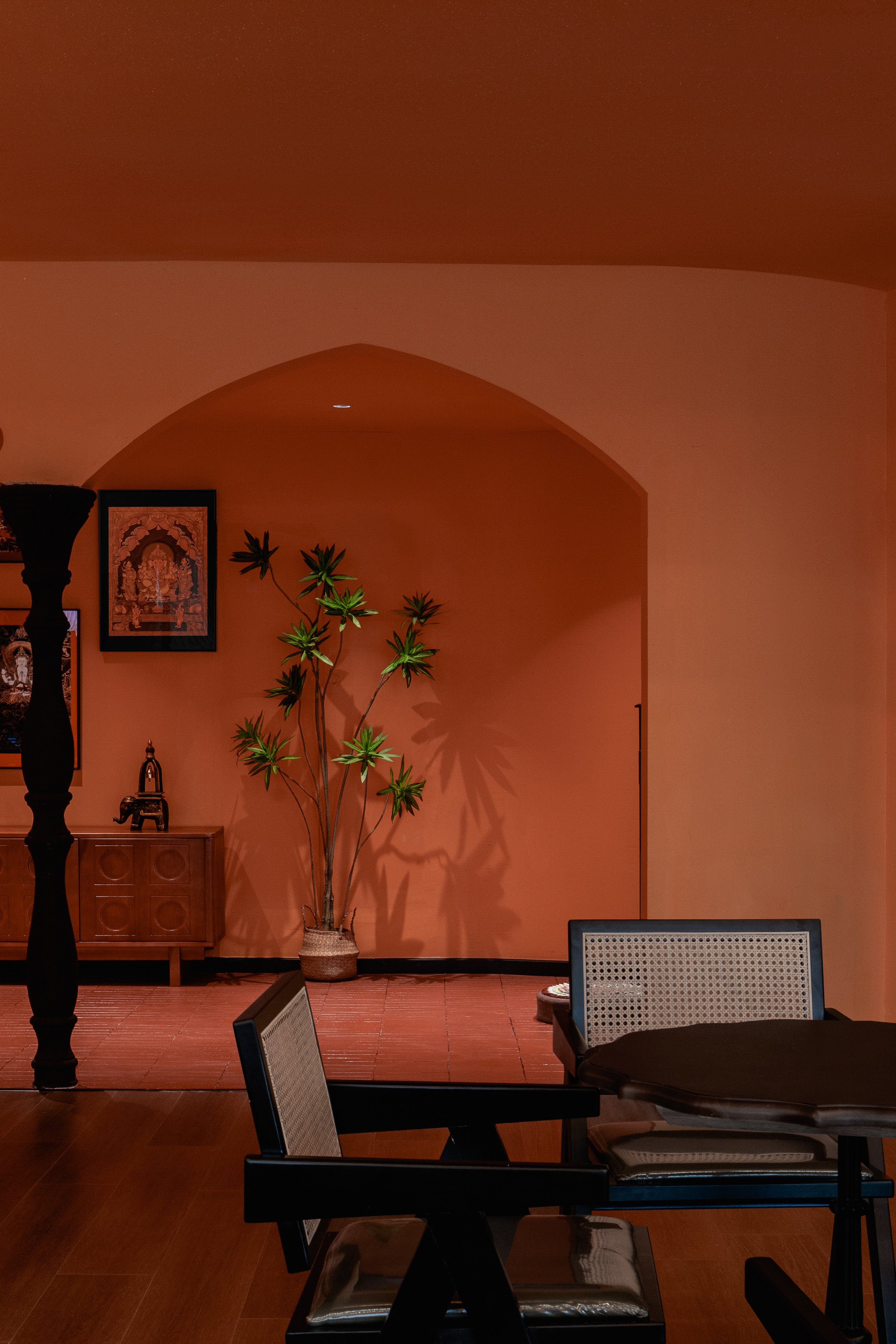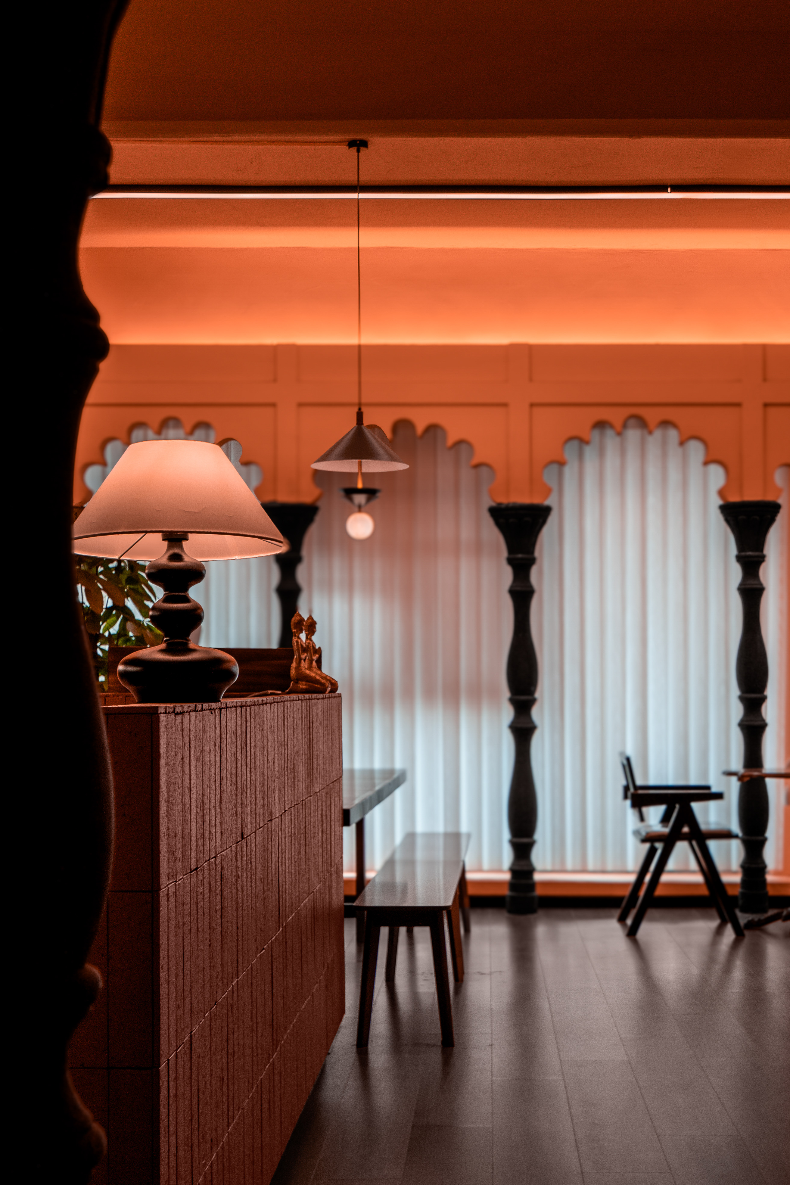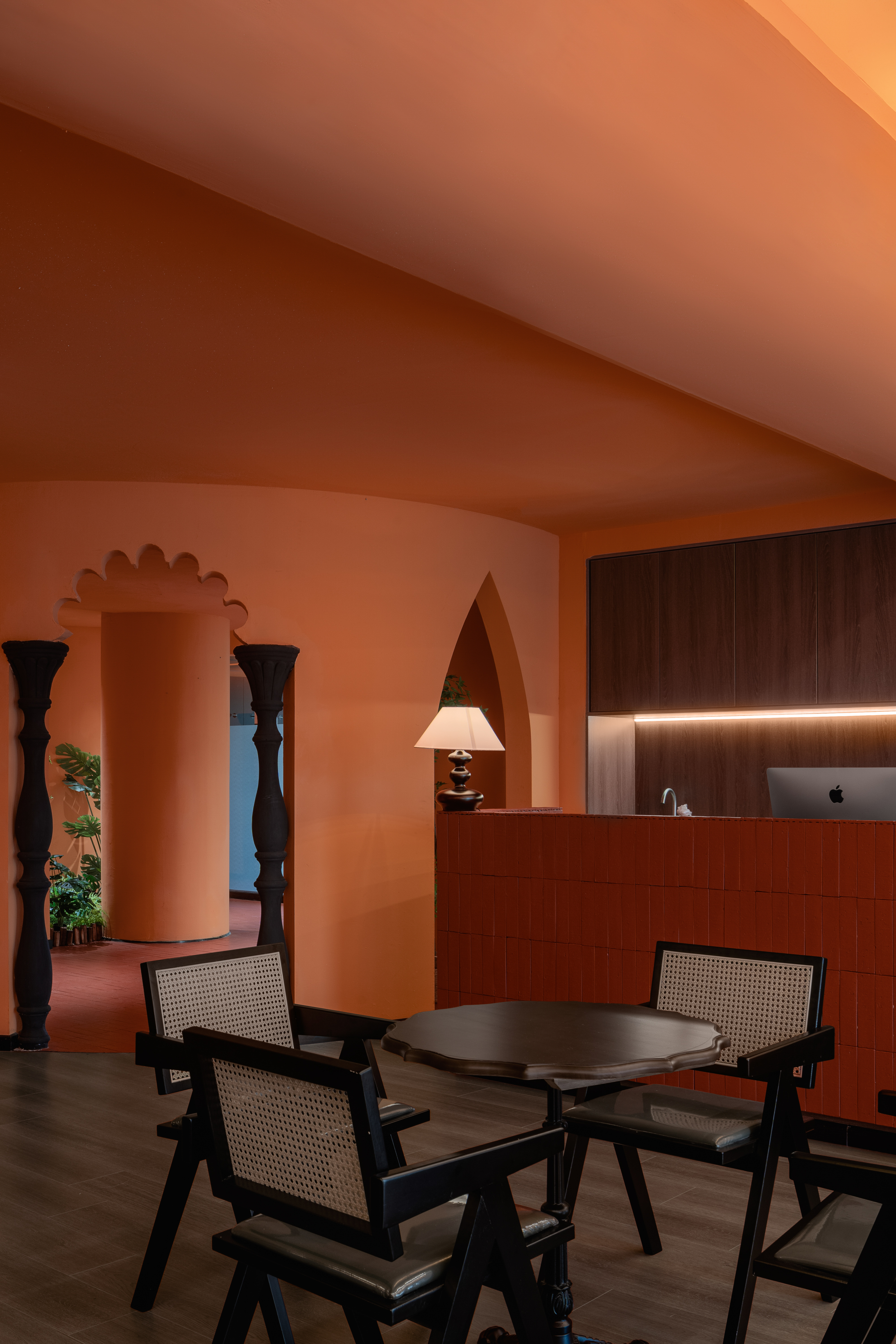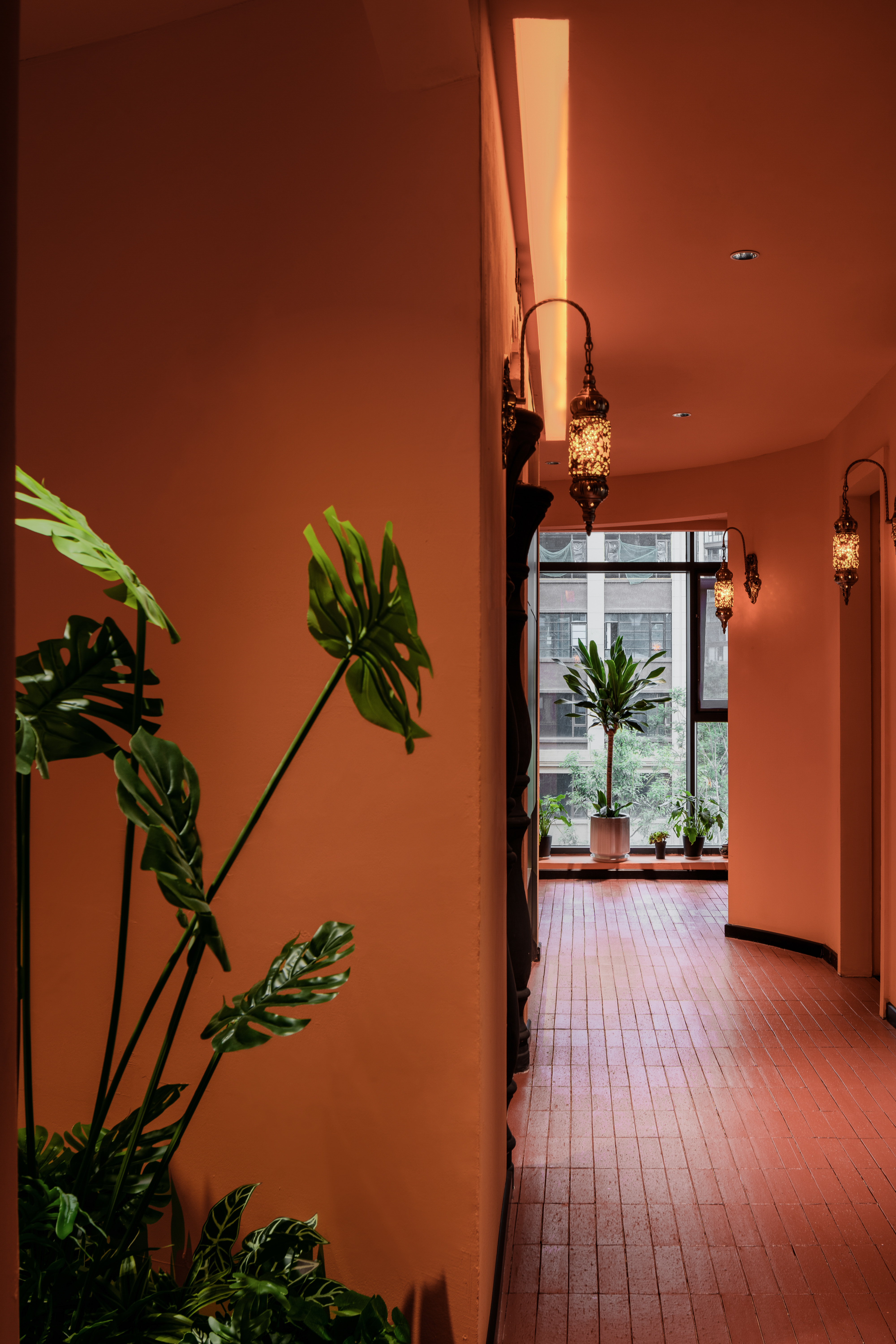 复古橘由门头开始延伸,拱门洞与一侧壁龛相呼应,纵向照明突出入口位置;茶桌与前台相互穿插,木纹与橘色艺术漆的组合,空间层次呼应。
