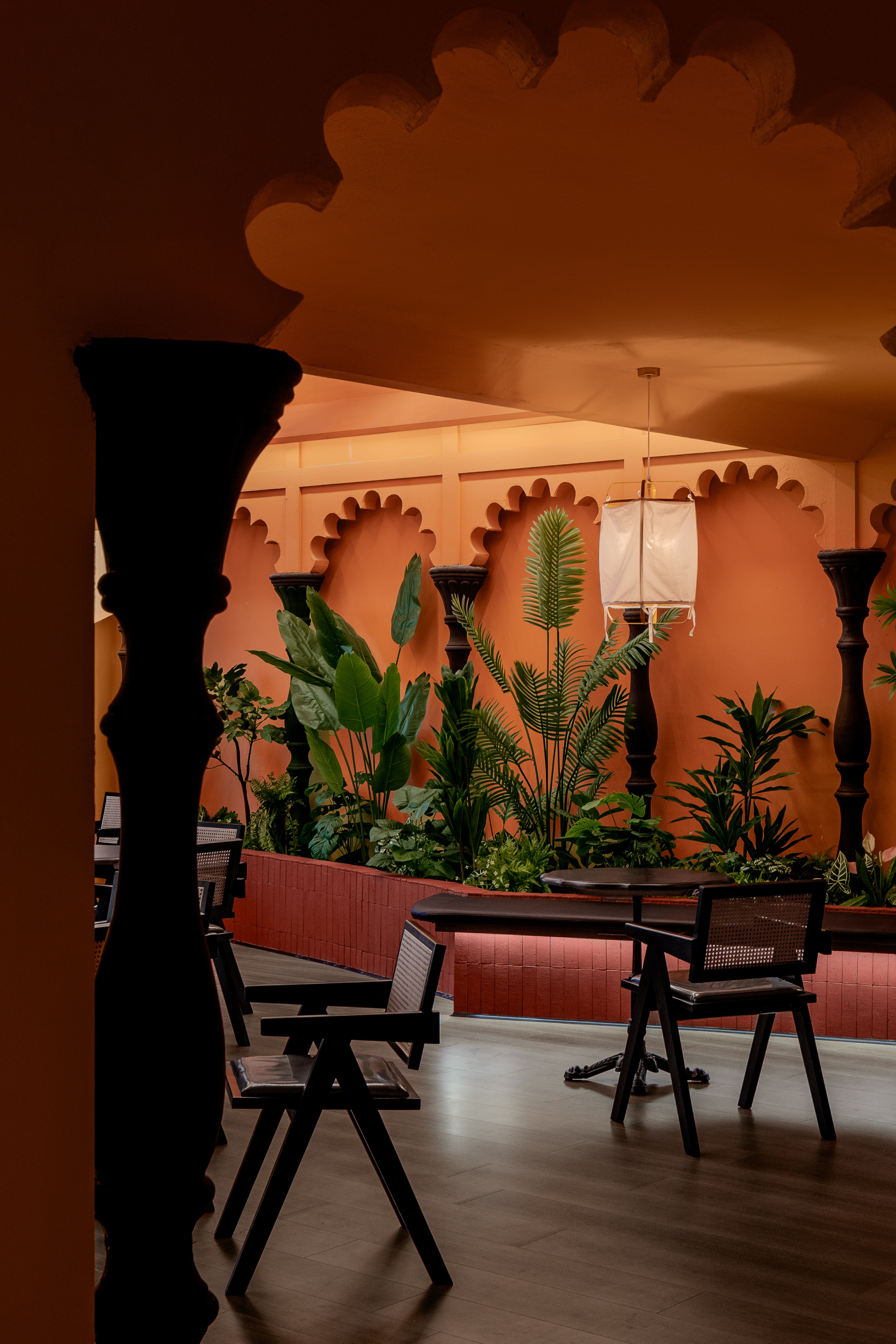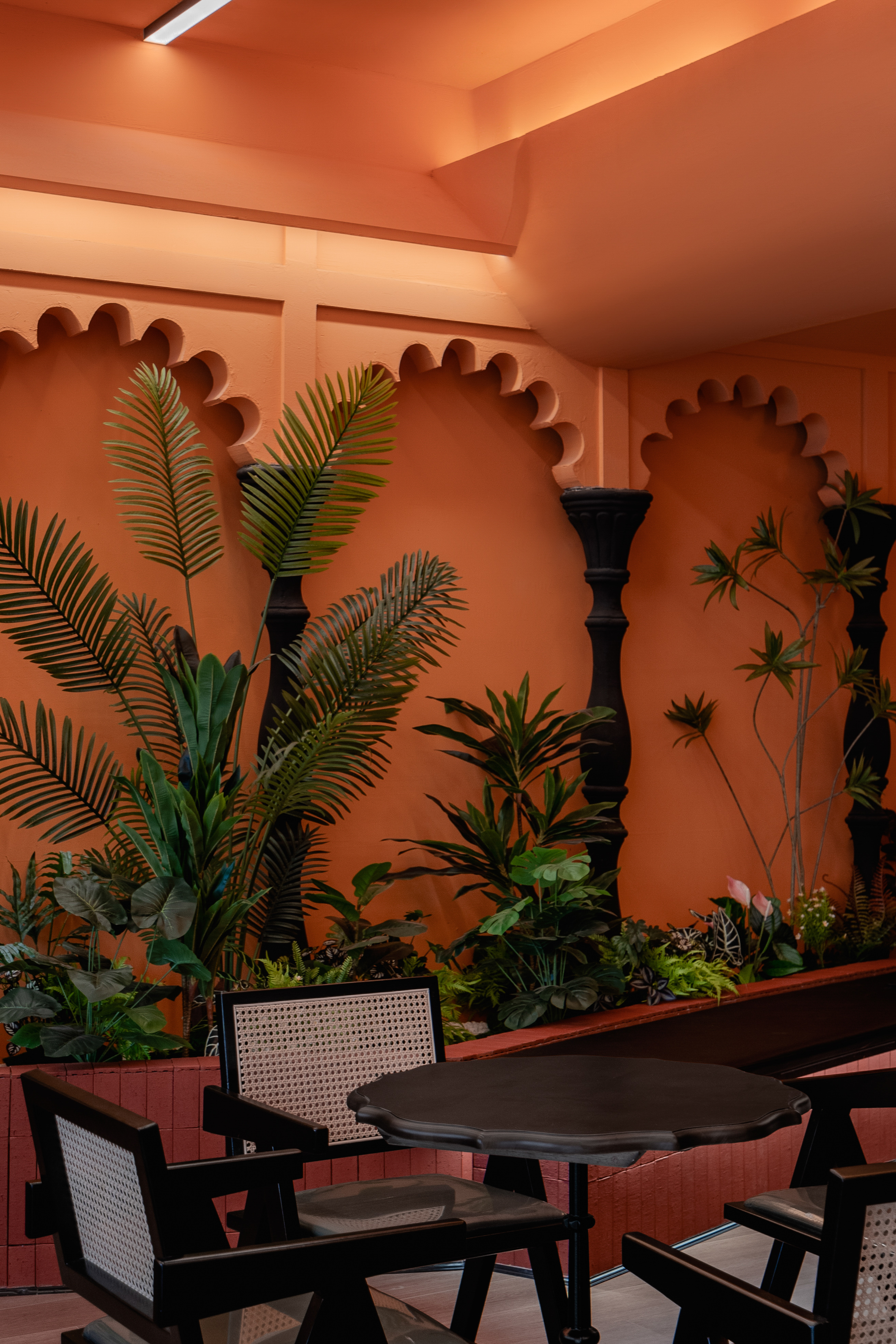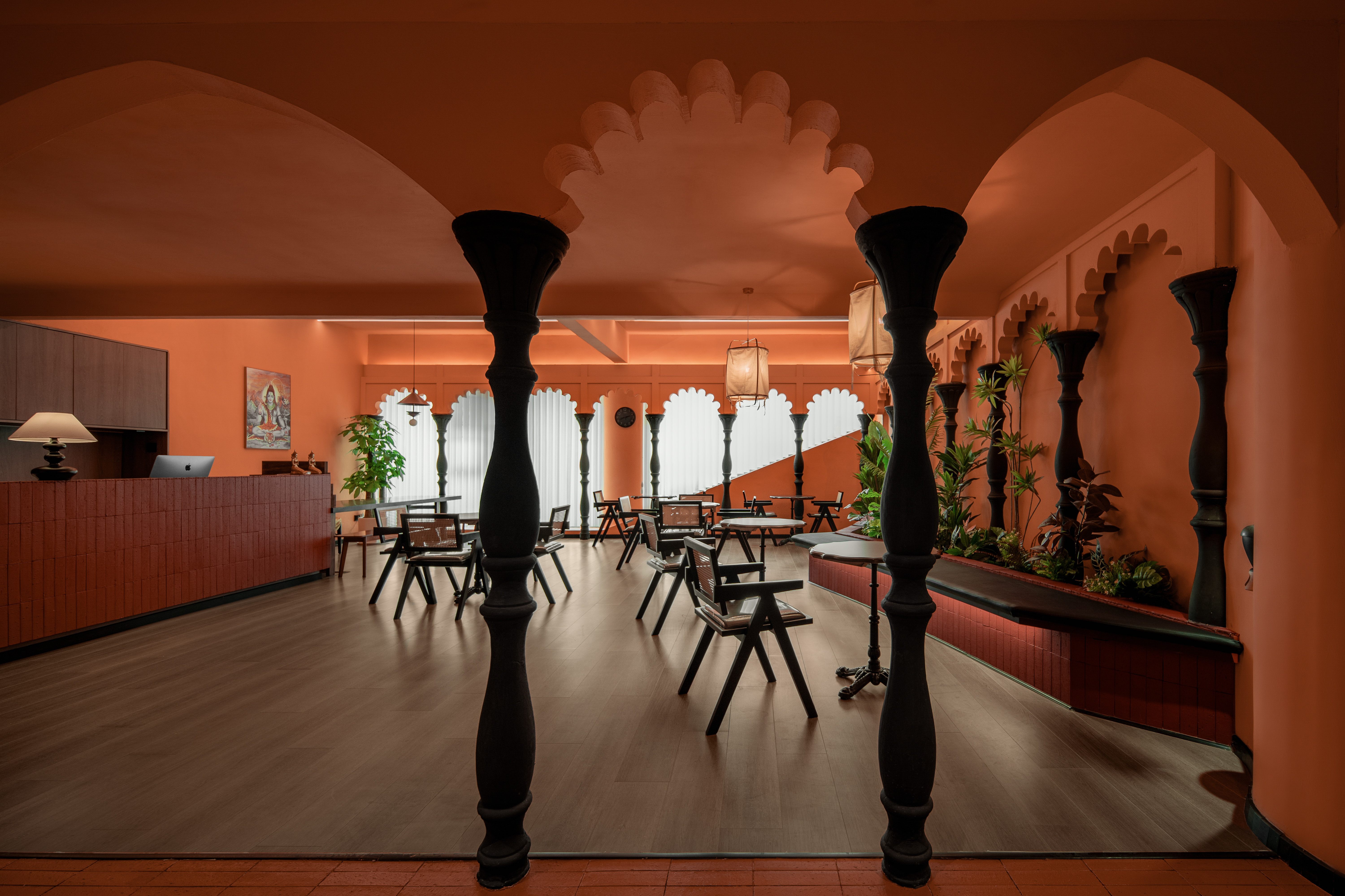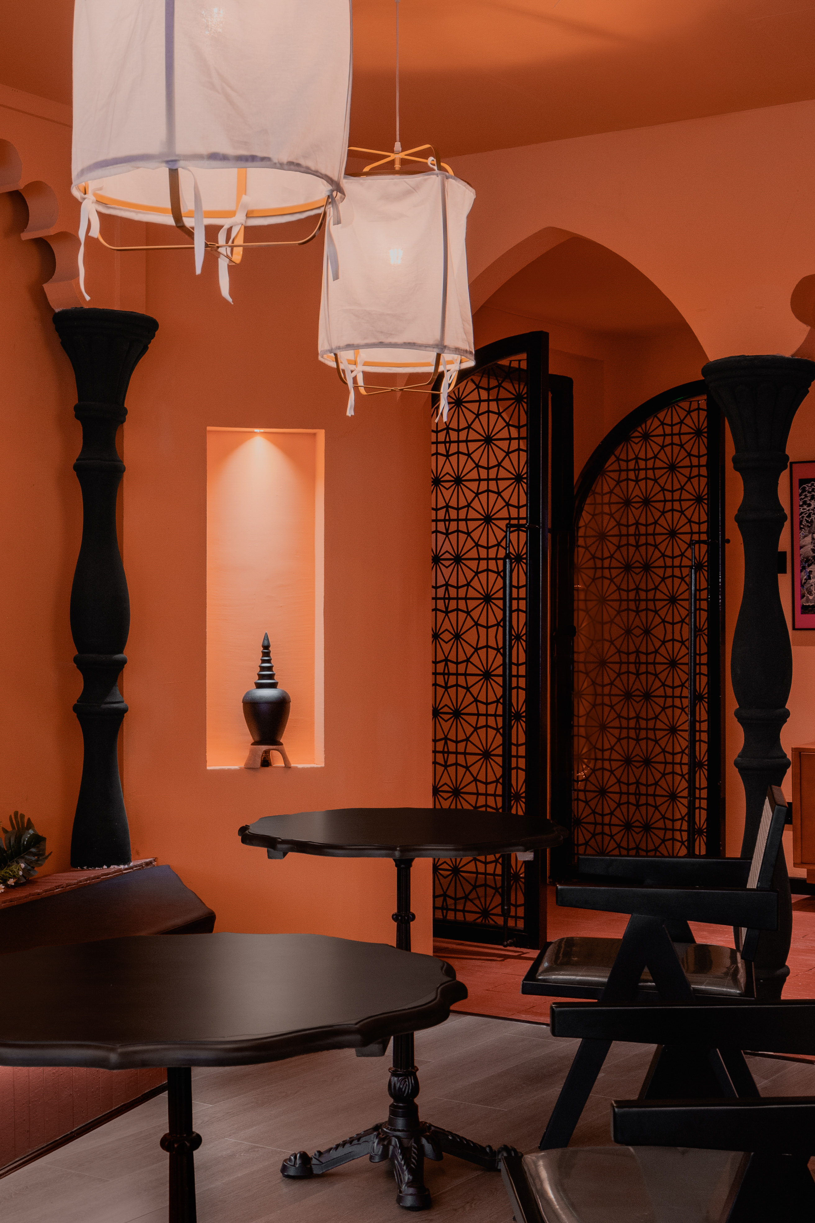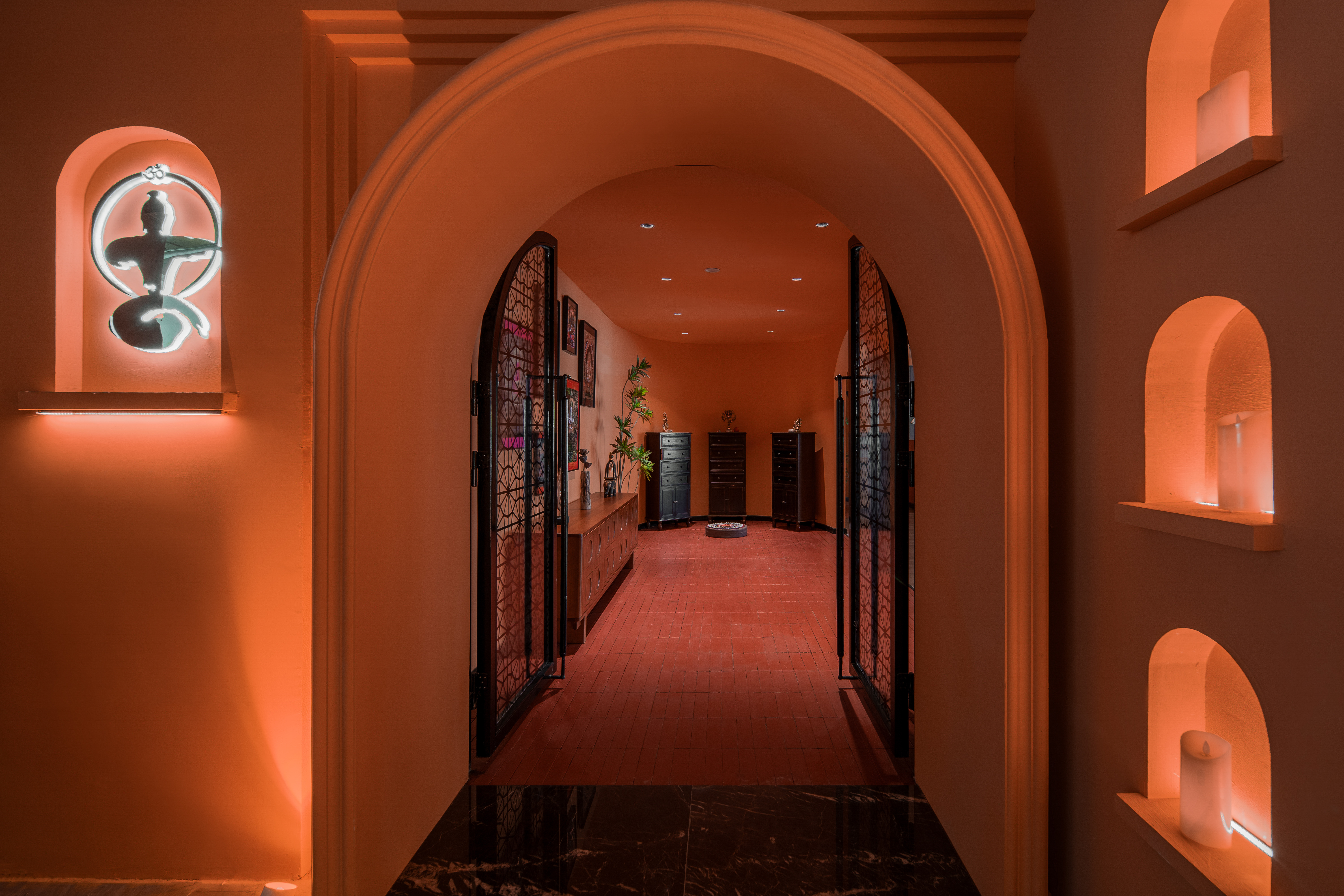 复古橘由门头开始延伸,拱门洞与一侧壁龛相呼应,纵向照明突出入口位置;茶桌与前台相互穿插,木纹与橘色艺术漆的组合,空间层次呼应。