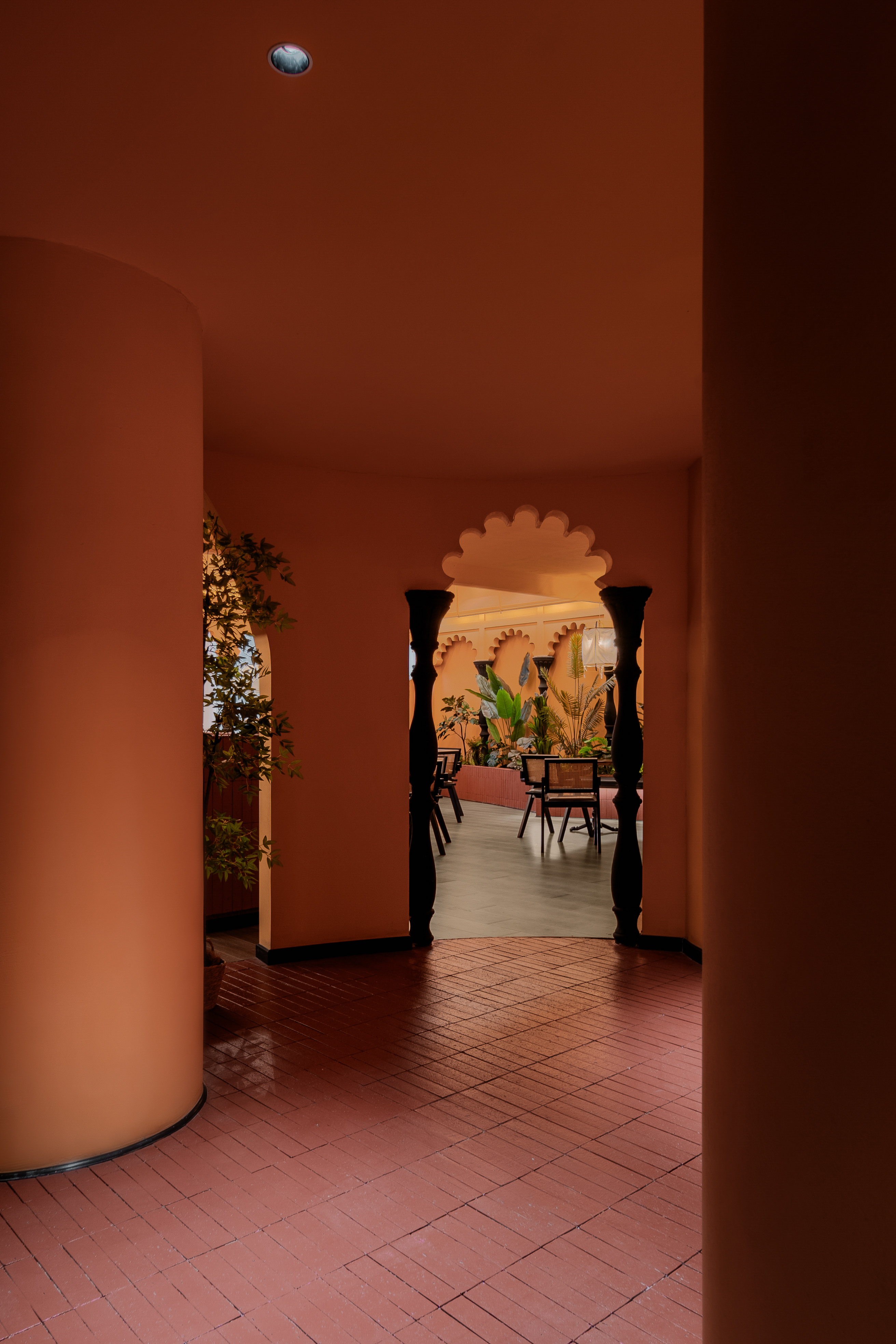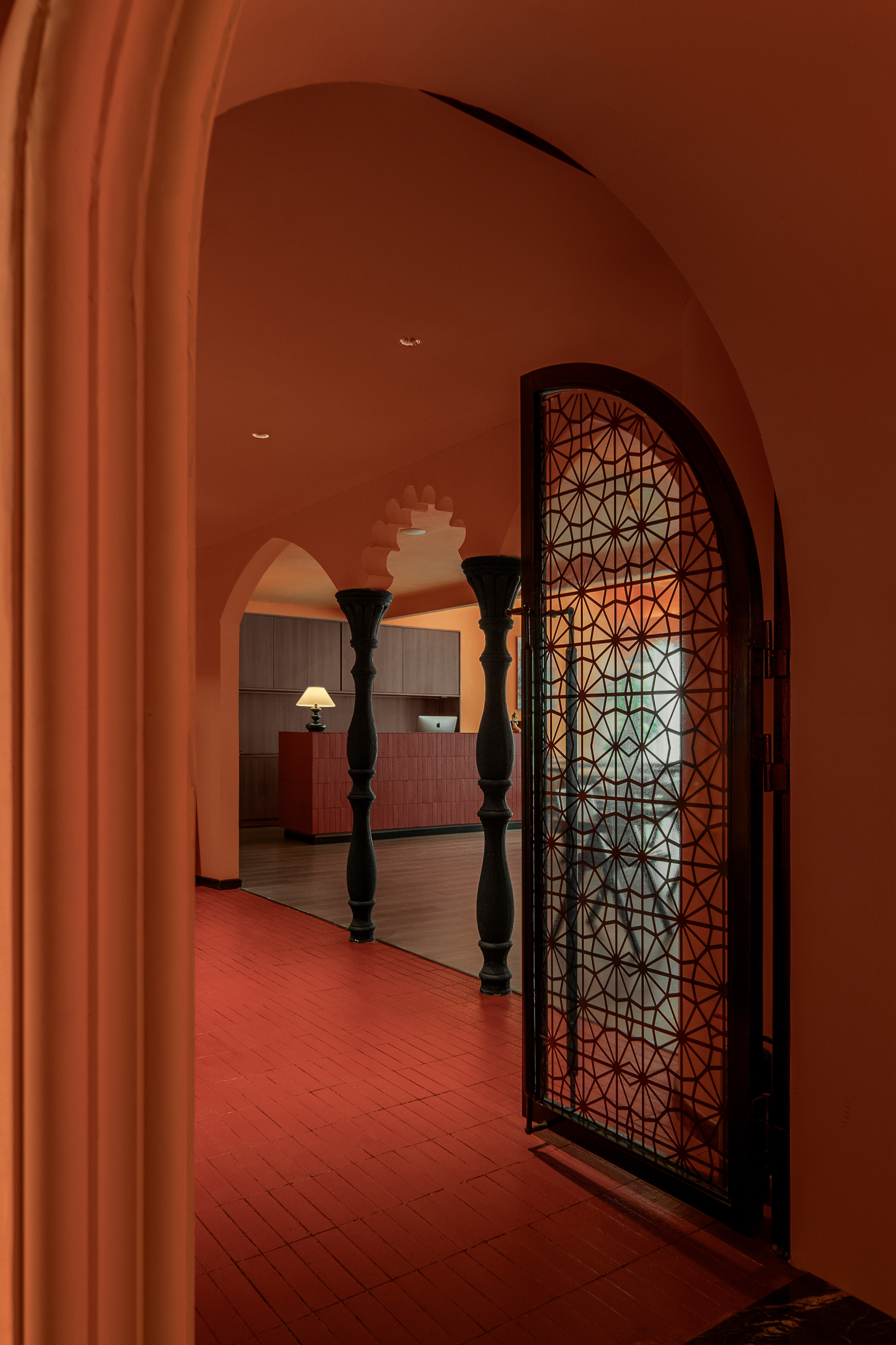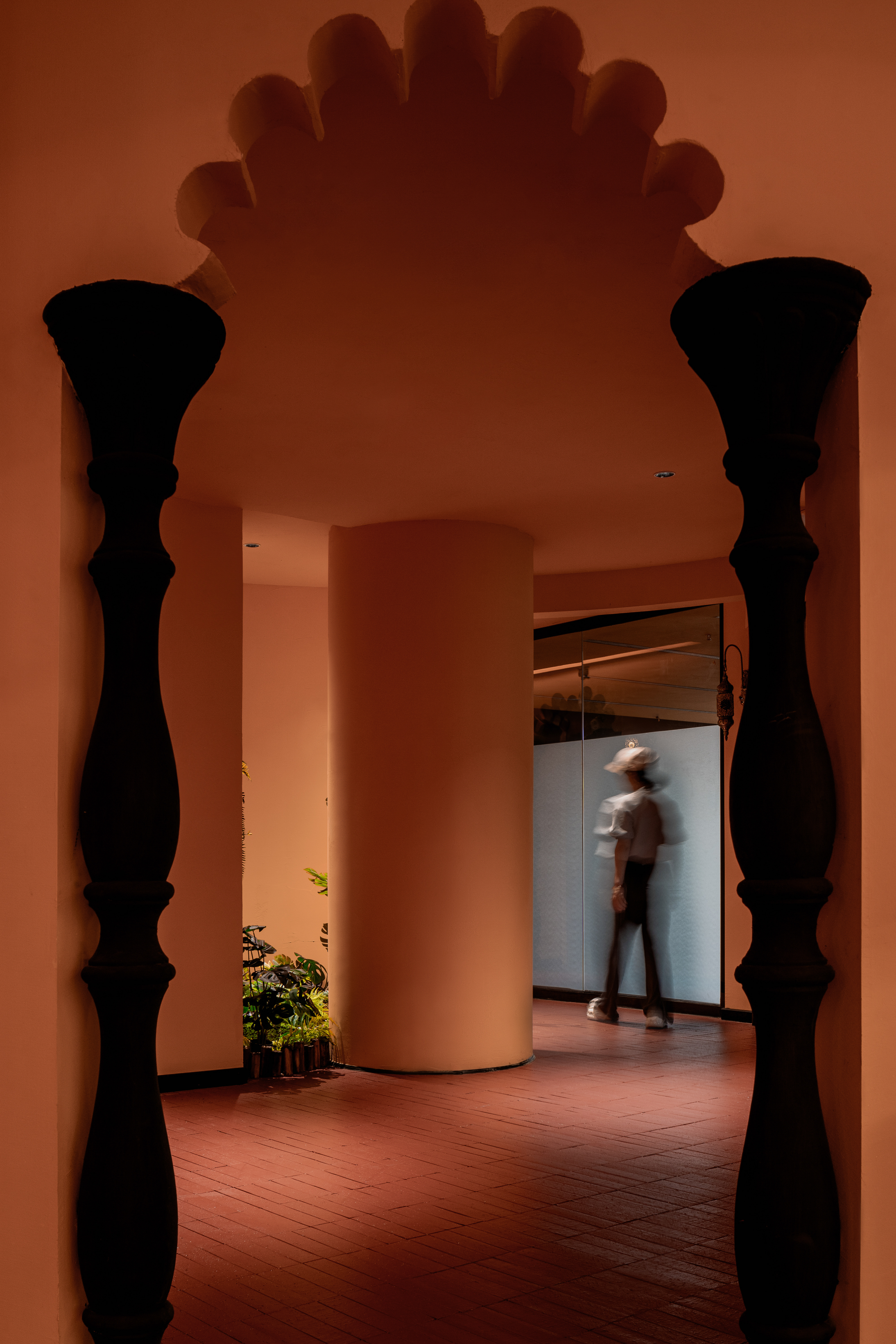 拱门洞与柱体元素循序渐进的引入,门厅与回廊的由此统一;建筑柱式的排列形式纳入空间内部,莲花拱洞元素与原始墙的融合。