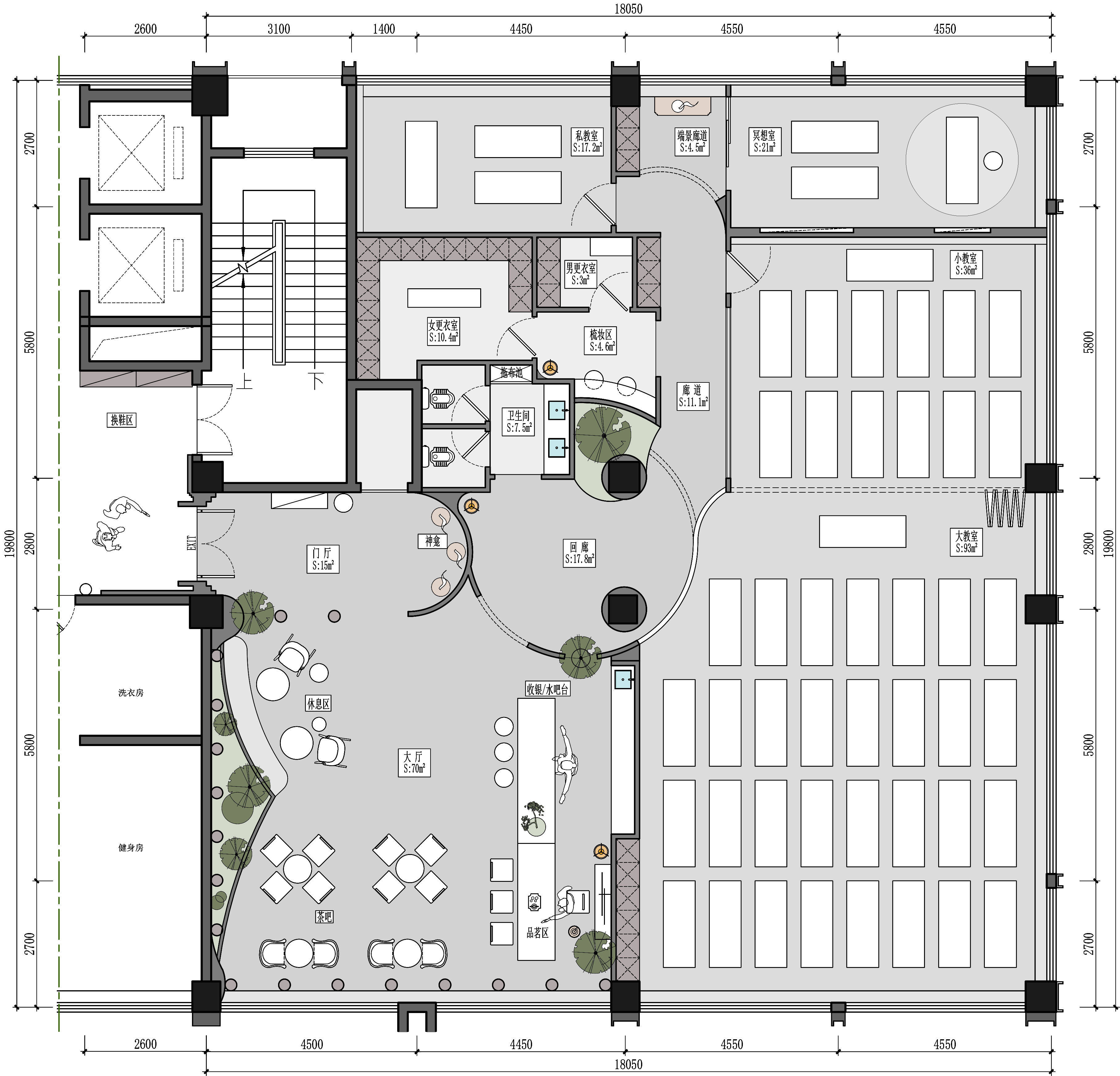 休息区多元化的座位布置人性化满足实际需求,弧形植物组团层层递进,古朴吊灯与座椅边几使空间更具亲和力。
