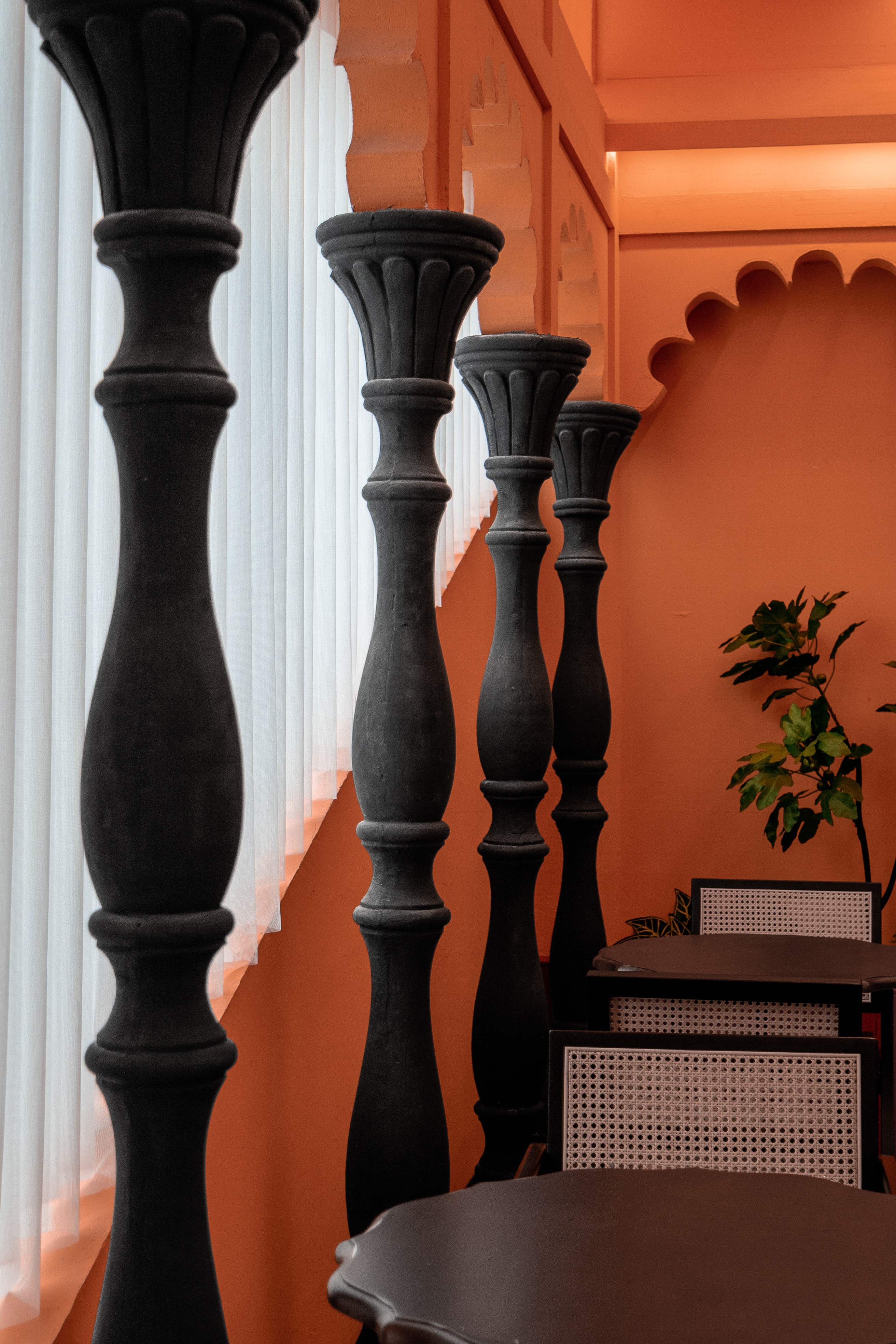 建筑柱式的排列形式纳入空间内部,莲花拱洞元素与原始斜墙的组合,呈现独特的艺术效果。