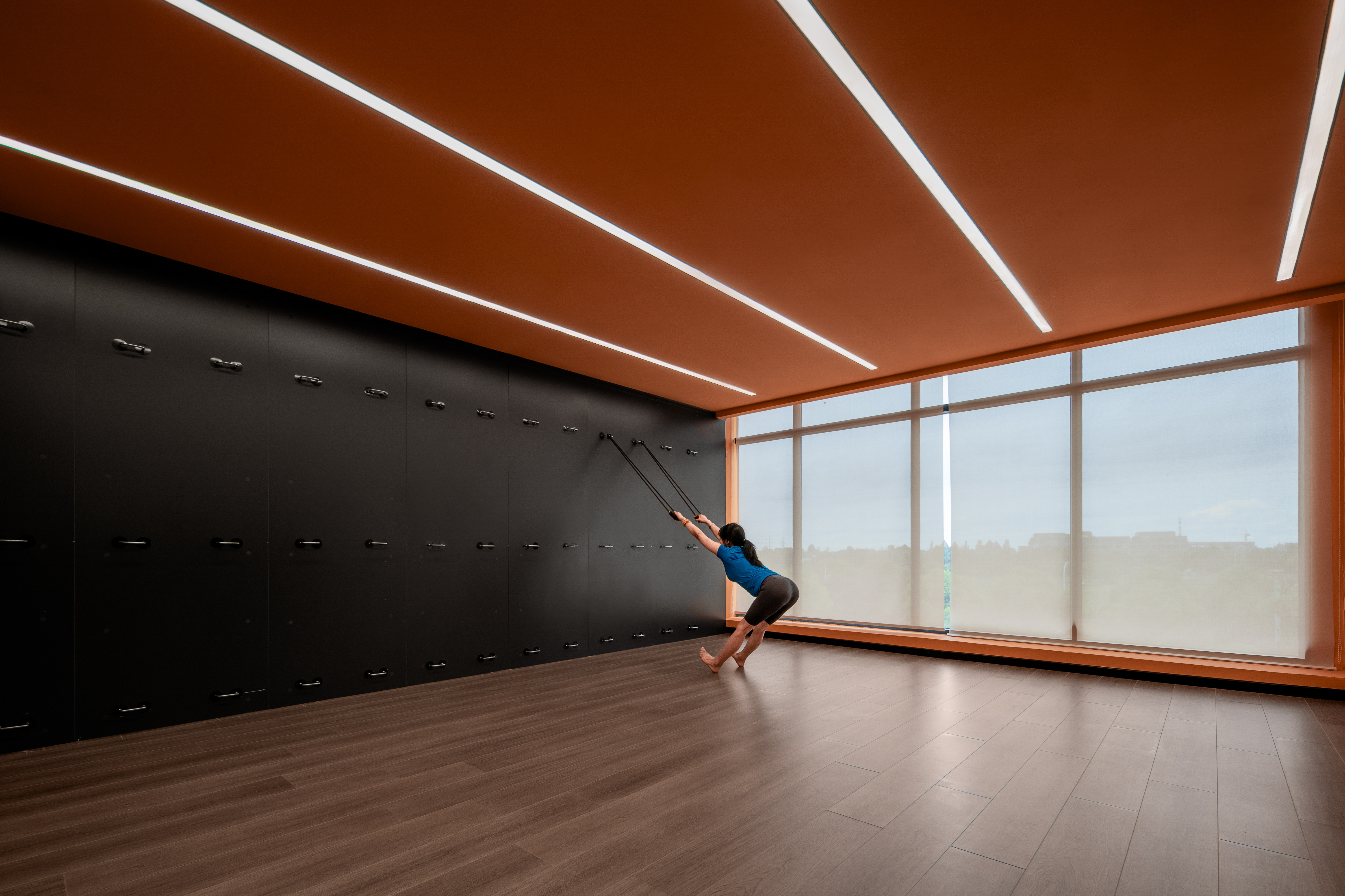 教室区域增加部分储物柜,温润的木地板健康环保,训练的过程环保舒适,明亮开阔。