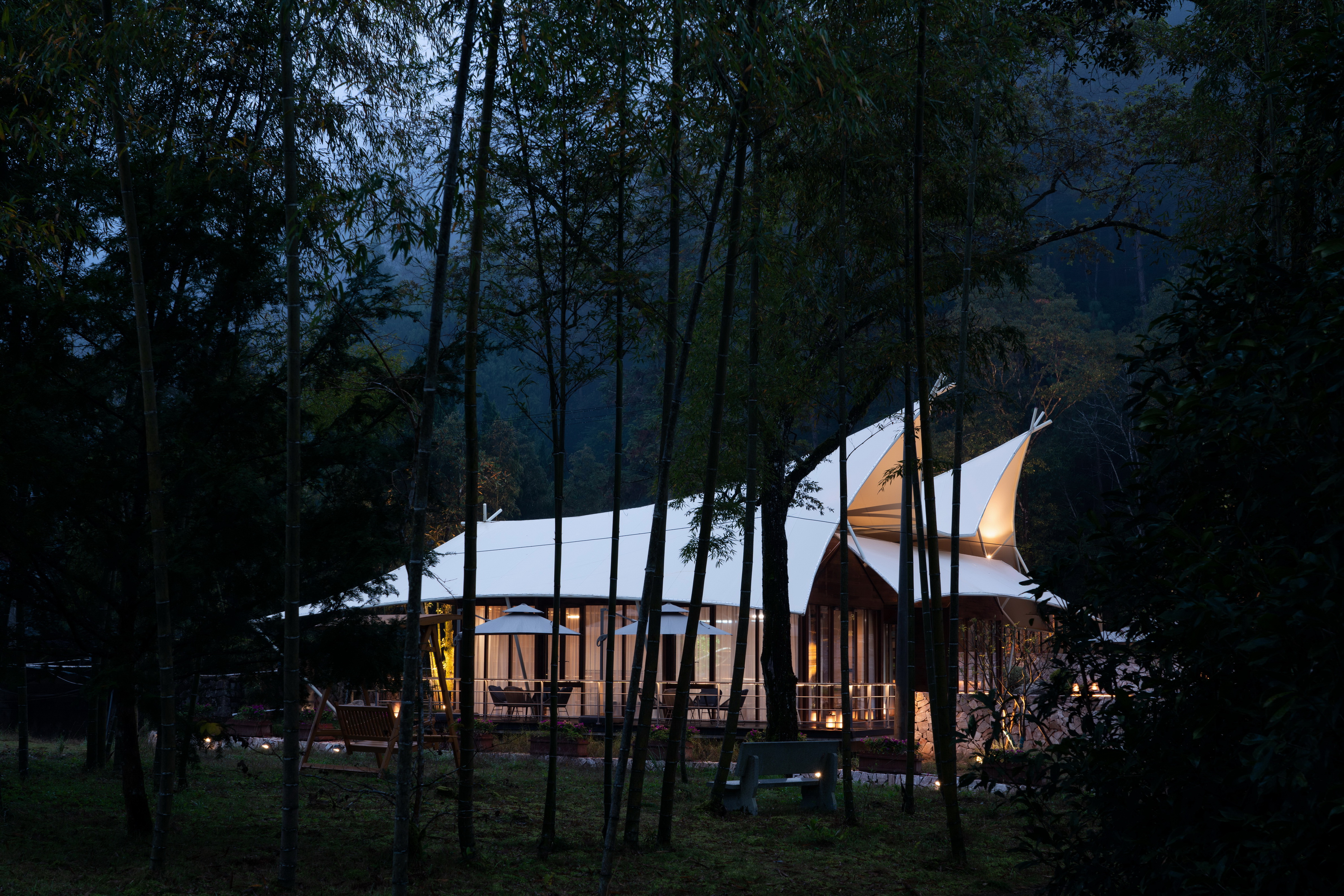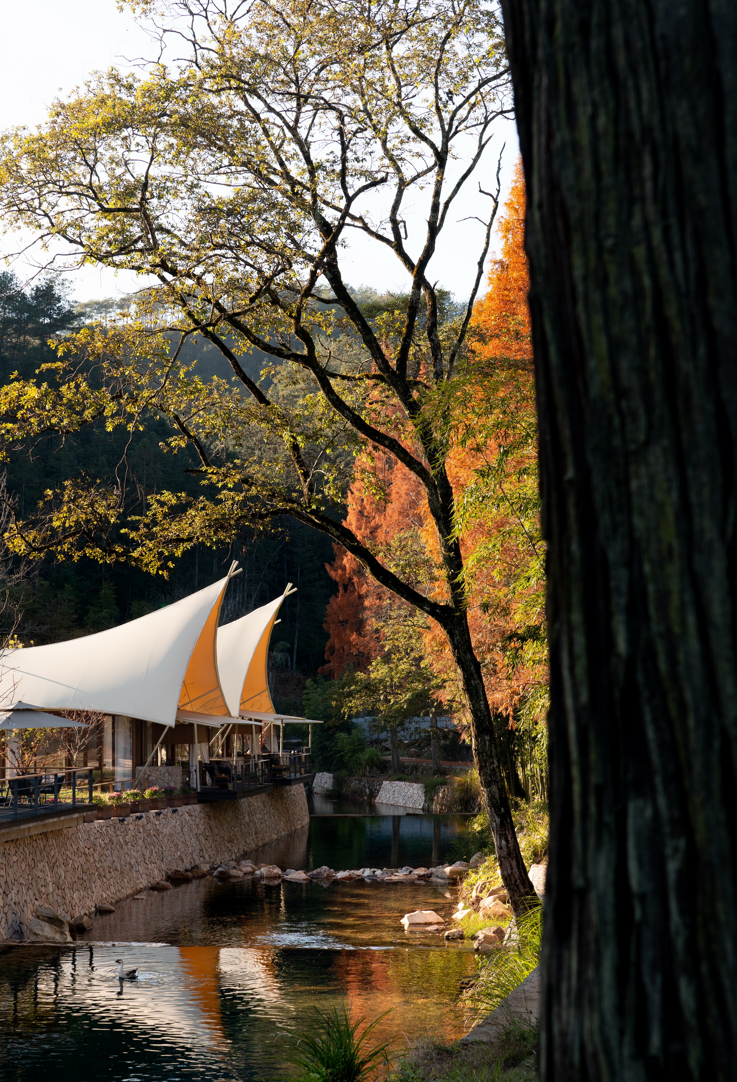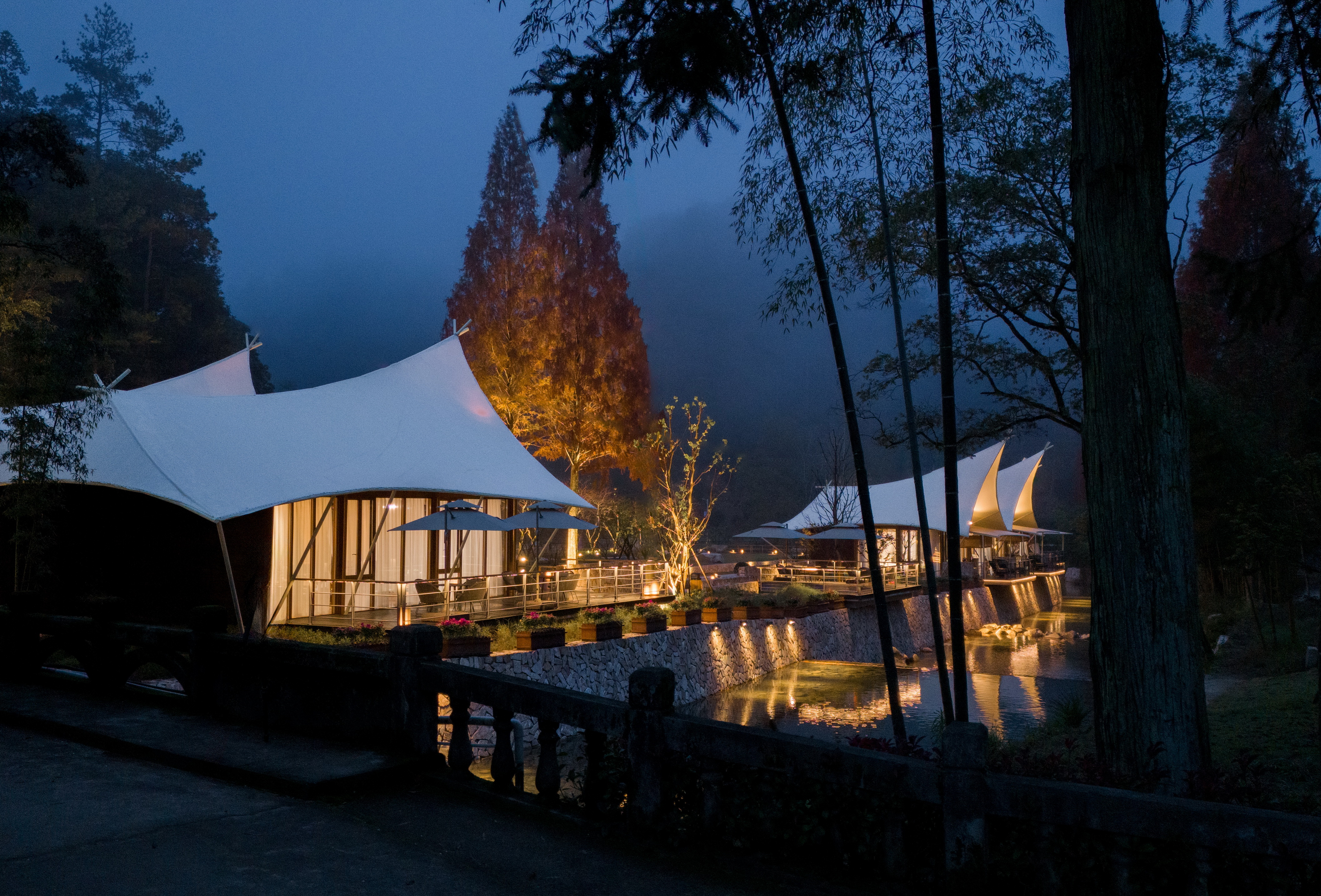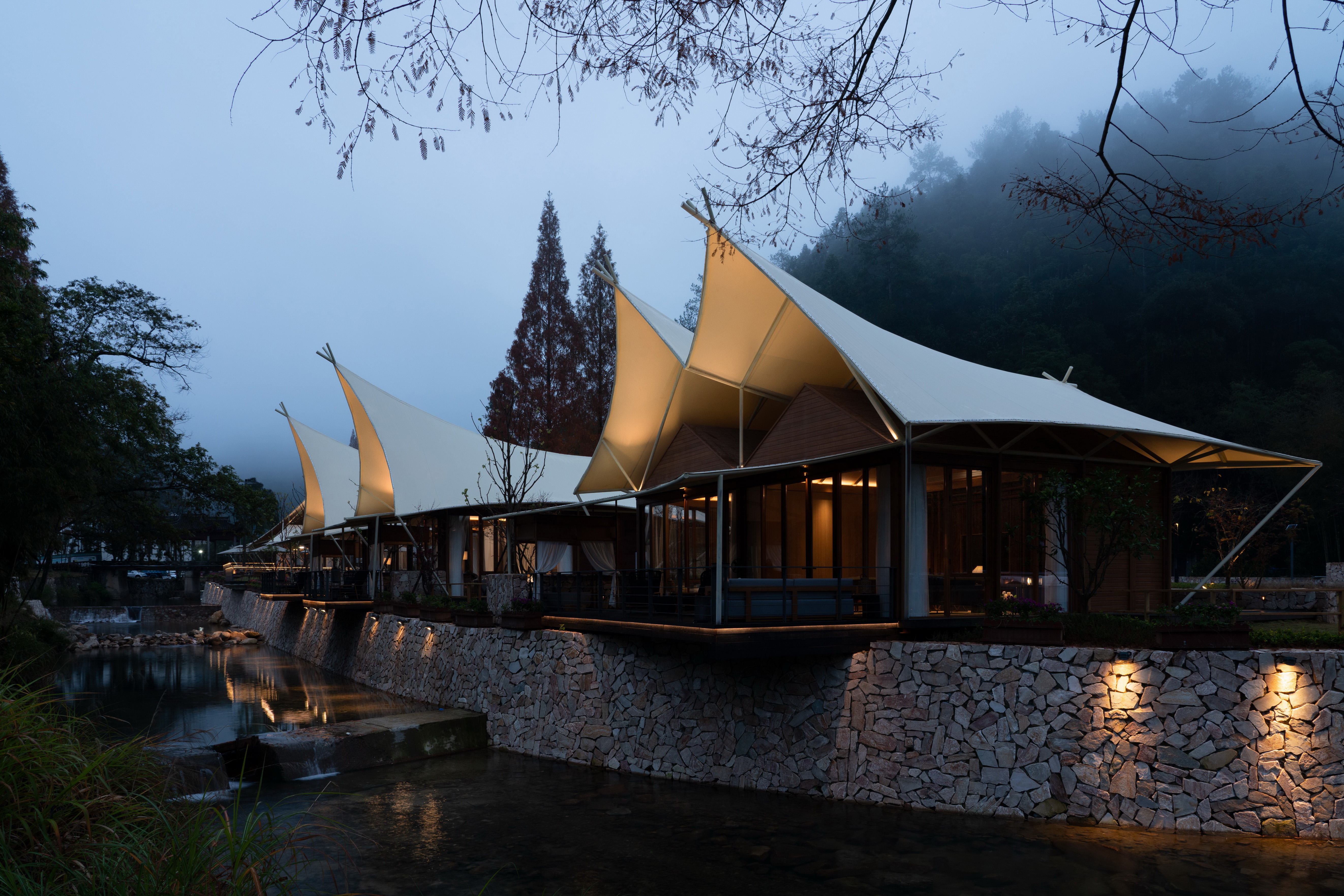 野奢度假养生:三面环山,一条溪流从山上潺潺流过,经过帐篷酒店后,汇入山谷之中。水为山之经,亦为人之脉。我们借助水的蜿蜒,营造出一个帐篷内部向山体延伸的松弛空间,错落有致的建筑形态串联起不同的区域,并与山林融合。大堂吧从入口之处,几经回转后映入眼帘,隐于山谷之间,名为“谷隐”。客房以灵动的空间布局方式,依水而建。我们将它打造为一个顺应自然、拥有旺盛生命力和坚定文化内核的静心之所。客房区域整体串联,又彼此独立,人们可在其中自由漫步,听着风声、水声、流水声和蝉鸣声,又能独享私密空间,获得疗愈养生的度假体验。每一间客房都配备了温泉泡池,一眼望出,四季之景,让人更好地亲近自然,感受光线和时间的流转与生命的真切。