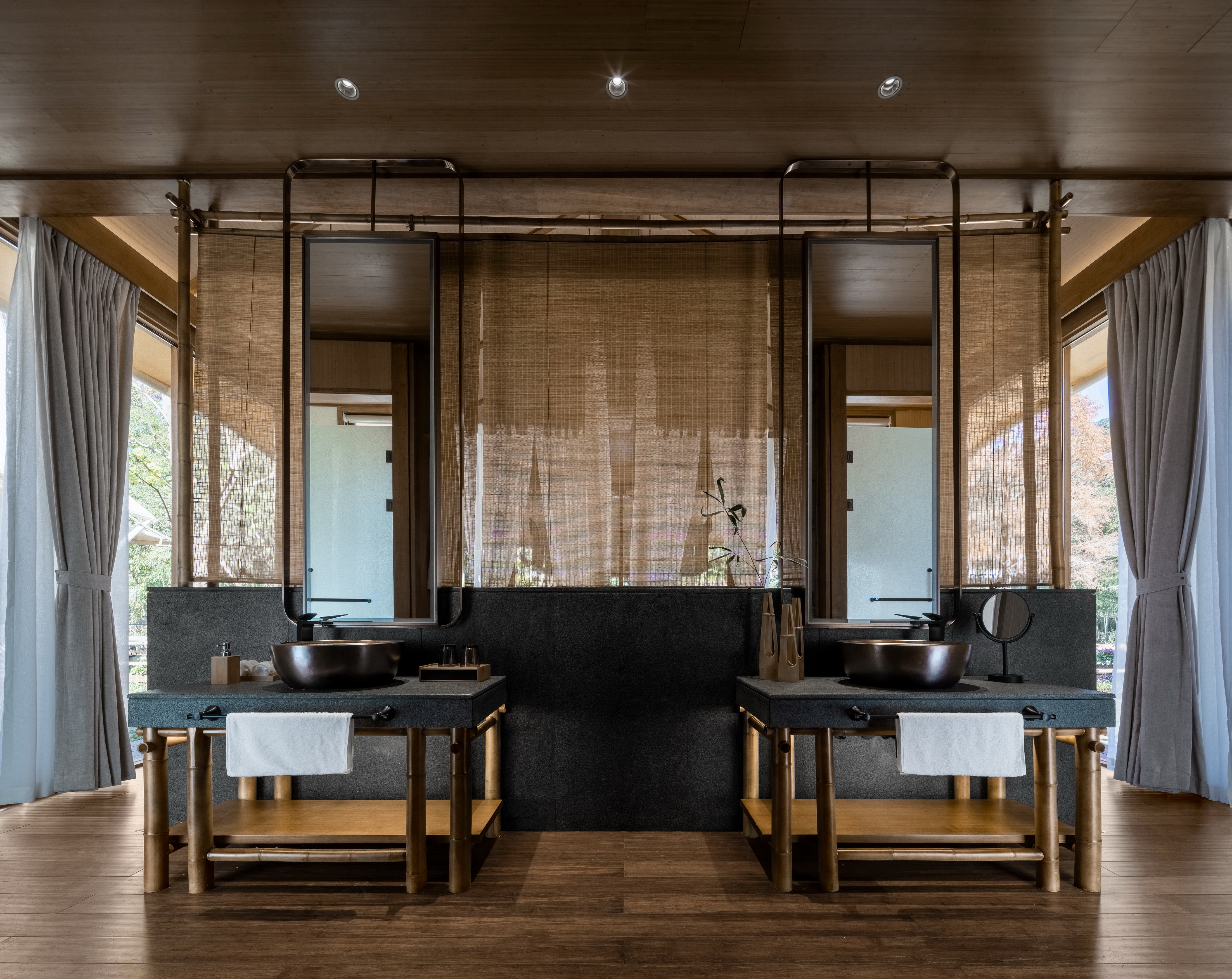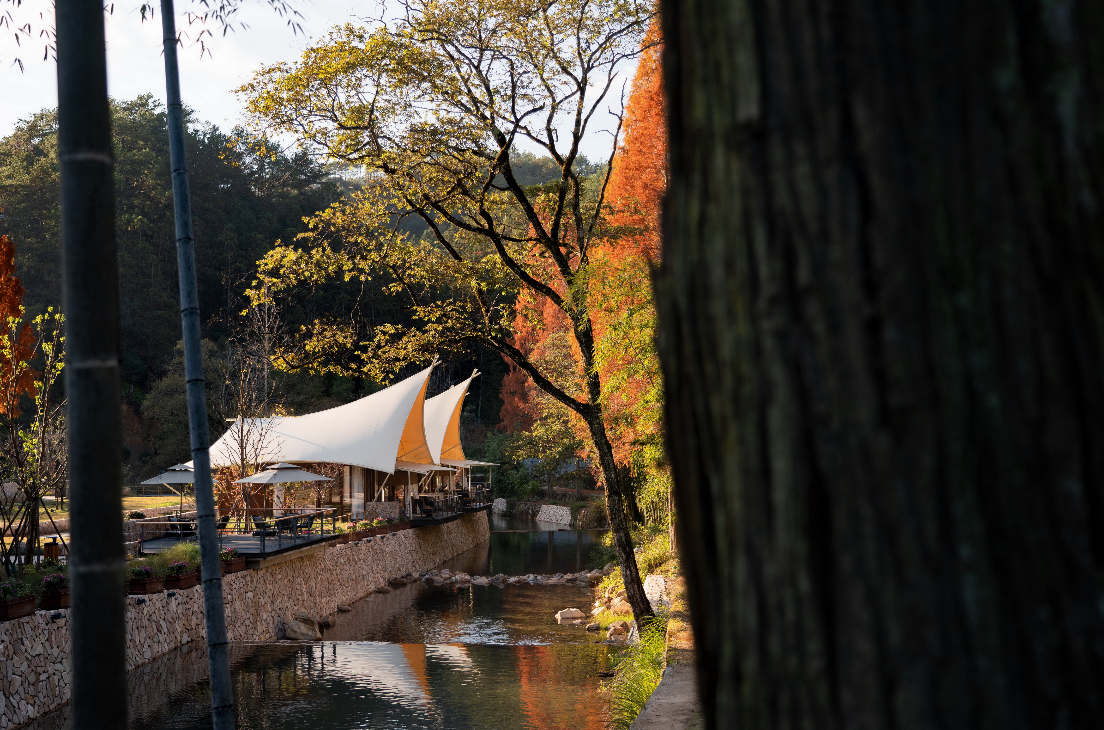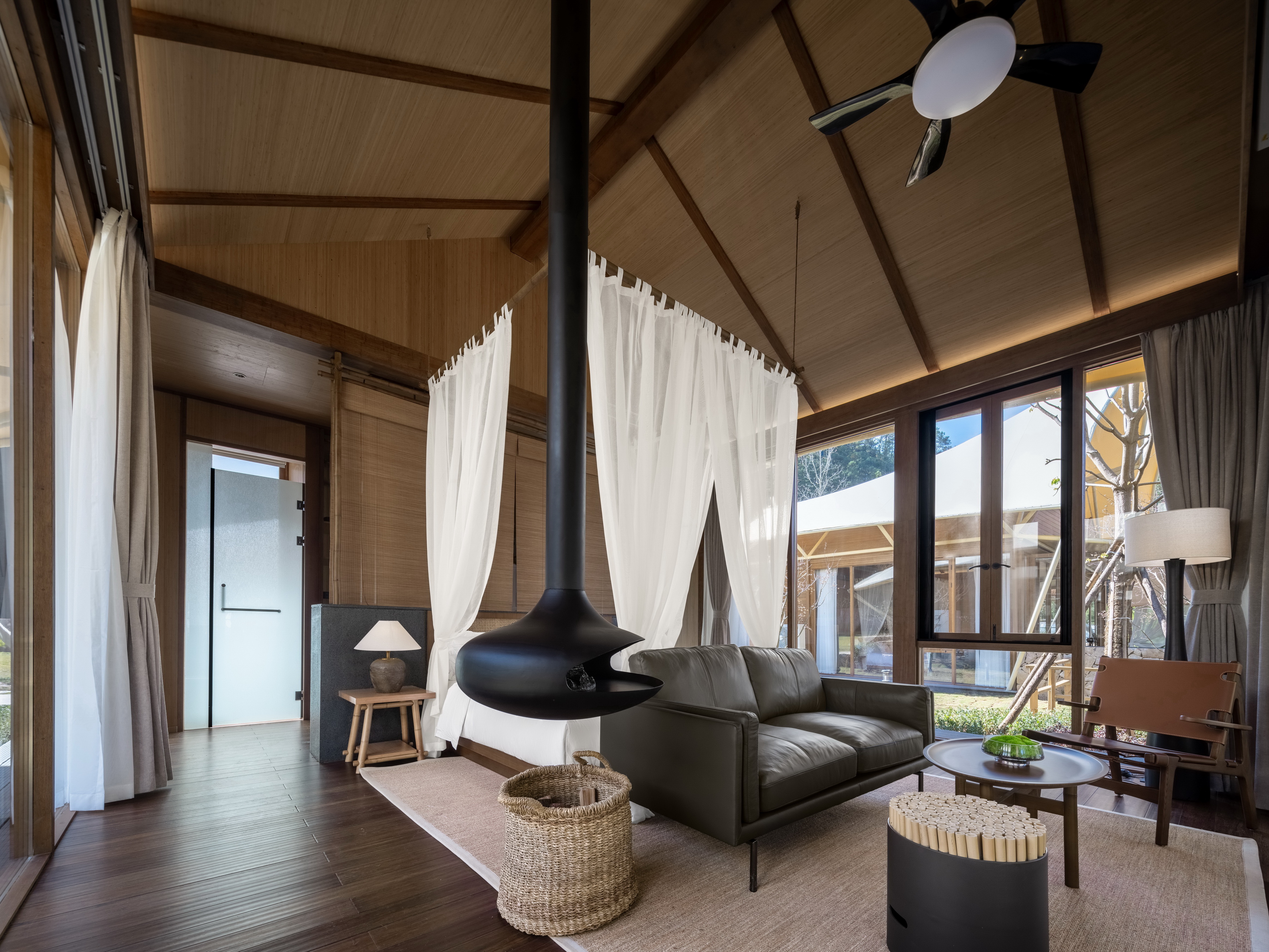 野奢度假养生:三面环山,一条溪流从山上潺潺流过,经过帐篷酒店后,汇入山谷之中。水为山之经,亦为人之脉。我们借助水的蜿蜒,营造出一个帐篷内部向山体延伸的松弛空间,错落有致的建筑形态串联起不同的区域,并与山林融合。大堂吧从入口之处,几经回转后映入眼帘,隐于山谷之间,名为“谷隐”。客房以灵动的空间布局方式,依水而建。我们将它打造为一个顺应自然、拥有旺盛生命力和坚定文化内核的静心之所。客房区域整体串联,又彼此独立,人们可在其中自由漫步,听着风声、水声、流水声和蝉鸣声,又能独享私密空间,获得疗愈养生的度假体验。每一间客房都配备了温泉泡池,一眼望出,四季之景,让人更好地亲近自然,感受光线和时间的流转与生命的真切。