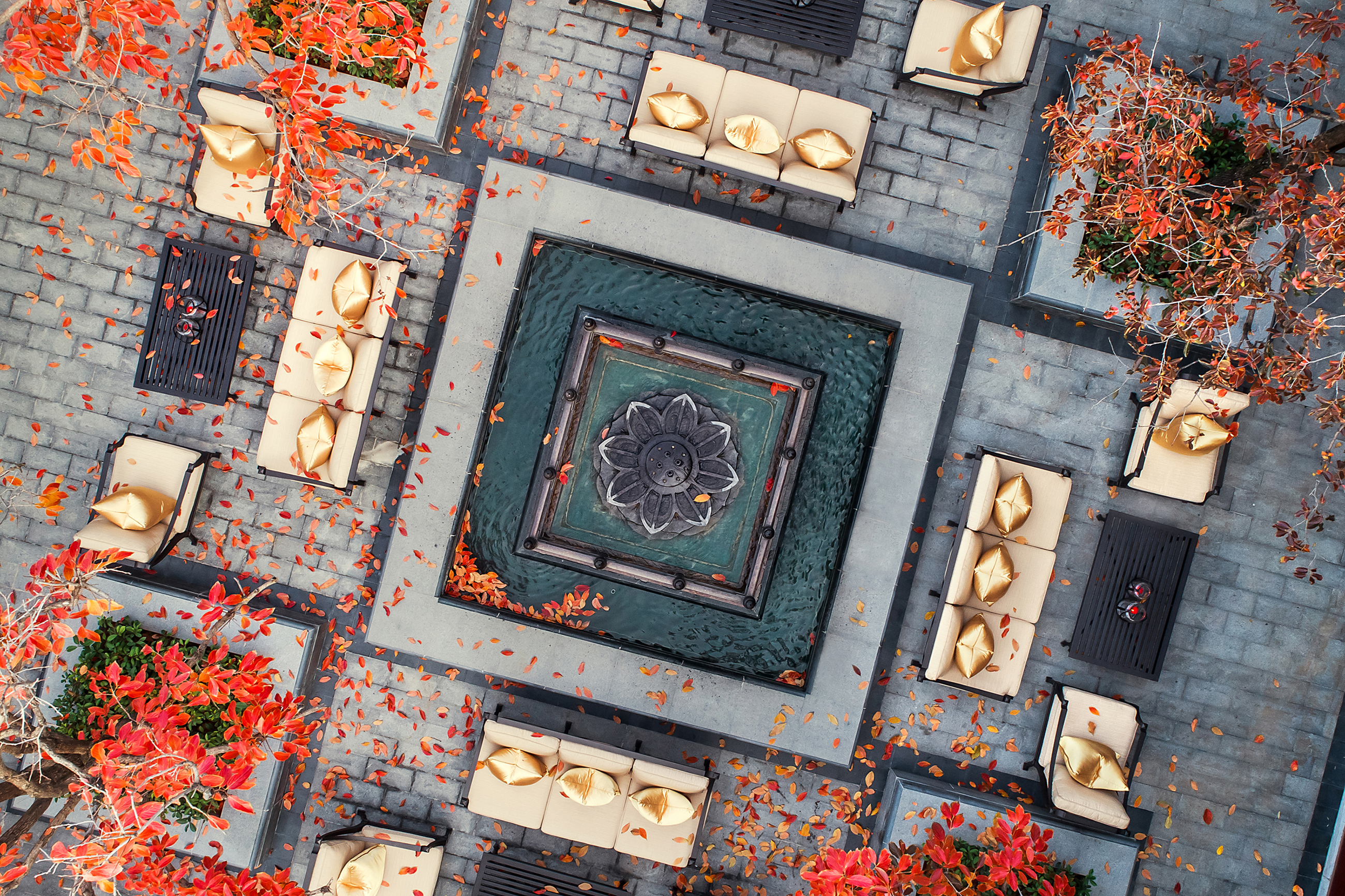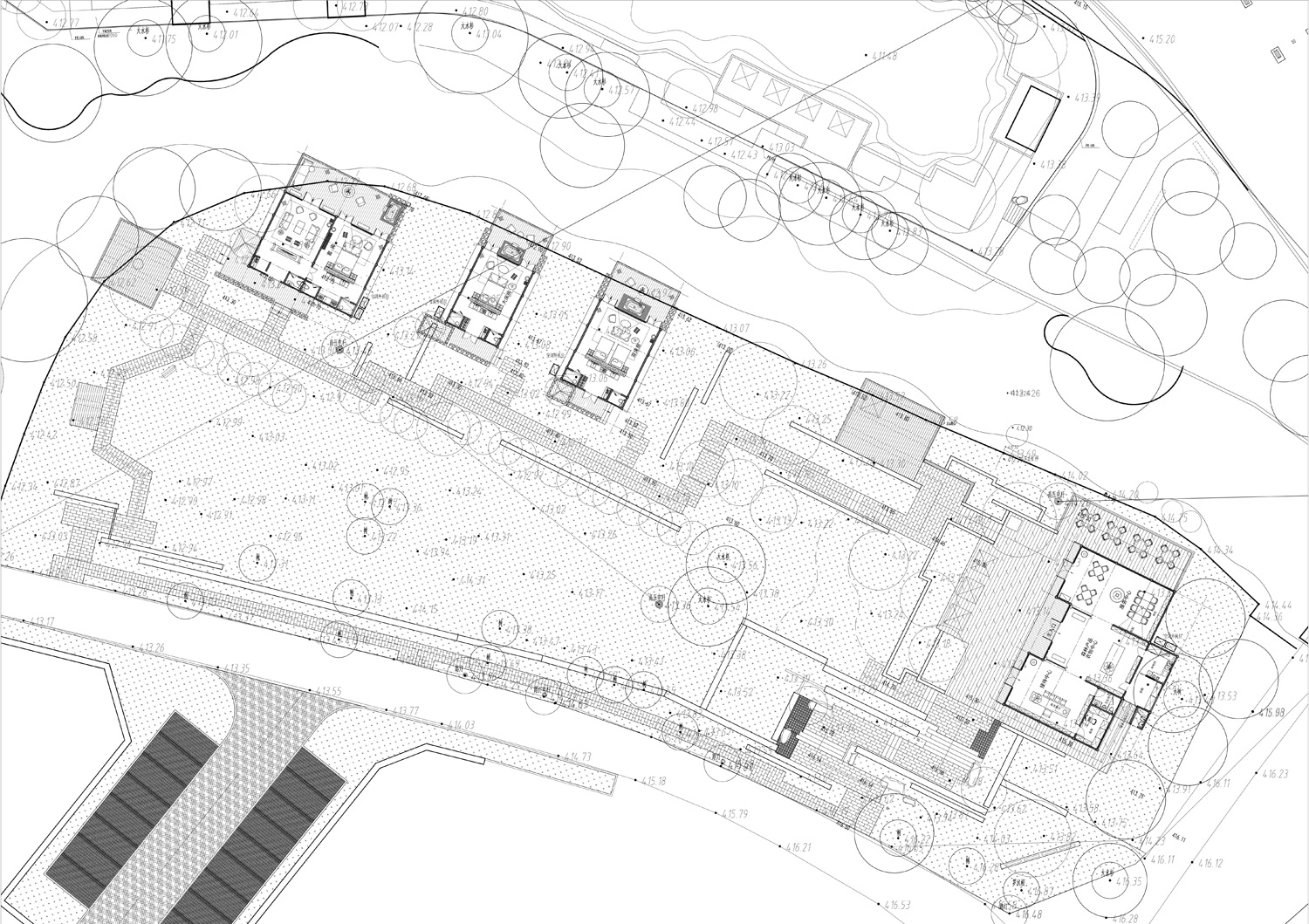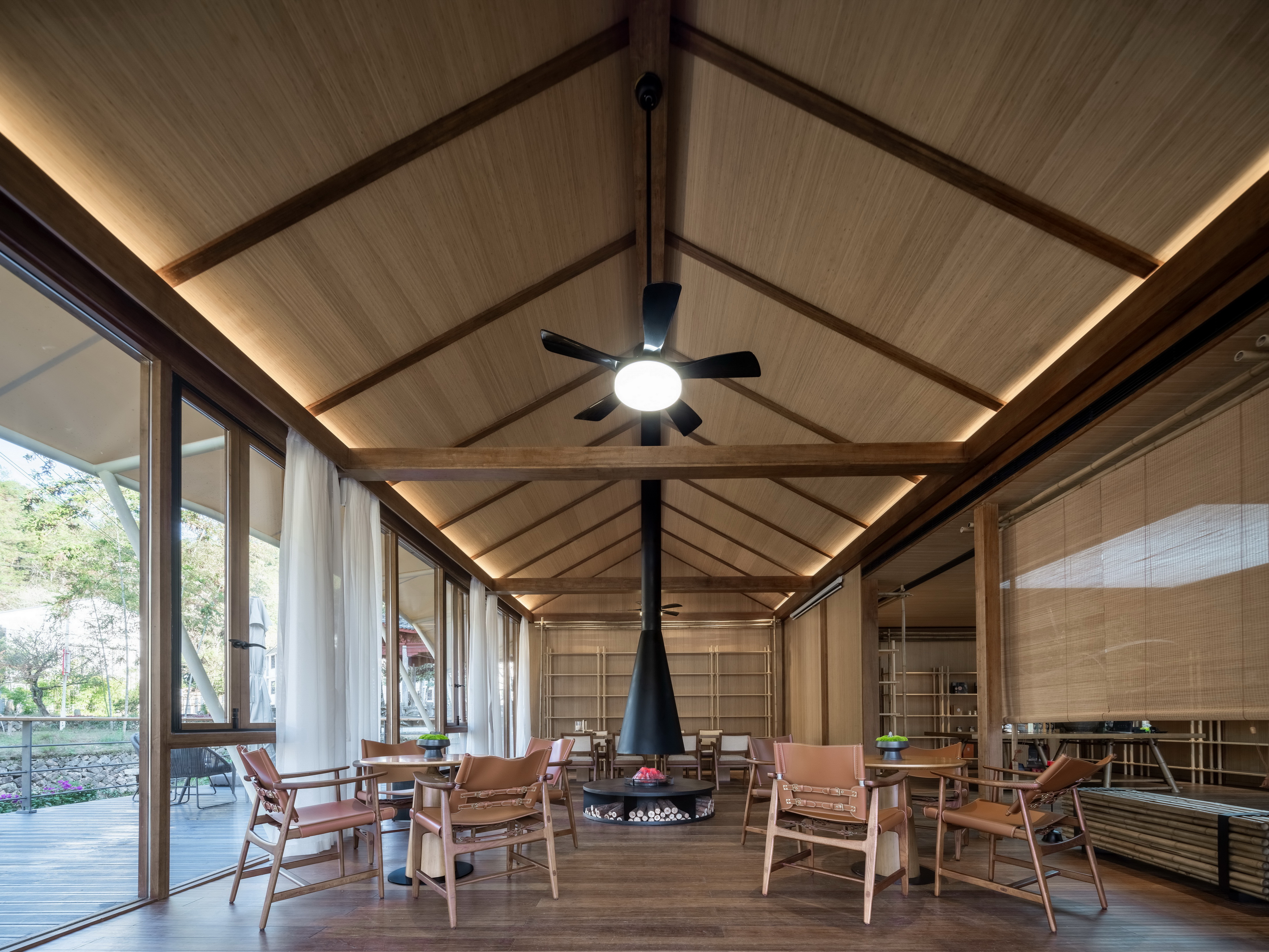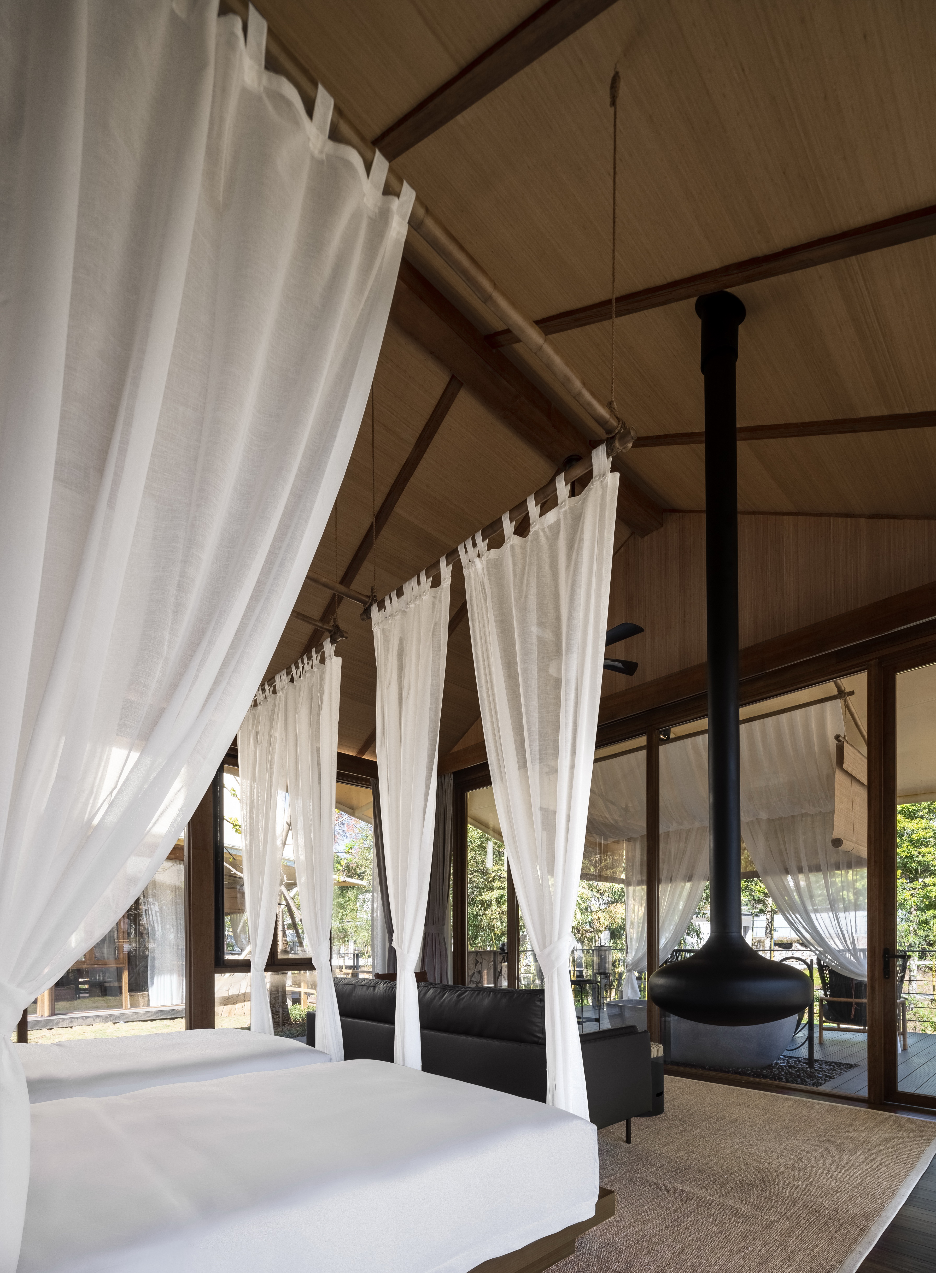 野奢度假养生:三面环山,一条溪流从山上潺潺流过,经过帐篷酒店后,汇入山谷之中。水为山之经,亦为人之脉。我们借助水的蜿蜒,营造出一个帐篷内部向山体延伸的松弛空间,错落有致的建筑形态串联起不同的区域,并与山林融合。大堂吧从入口之处,几经回转后映入眼帘,隐于山谷之间,名为“谷隐”。客房以灵动的空间布局方式,依水而建。我们将它打造为一个顺应自然、拥有旺盛生命力和坚定文化内核的静心之所。客房区域整体串联,又彼此独立,人们可在其中自由漫步,听着风声、水声、流水声和蝉鸣声,又能独享私密空间,获得疗愈养生的度假体验。每一间客房都配备了温泉泡池,一眼望出,四季之景,让人更好地亲近自然,感受光线和时间的流转与生命的真切。
