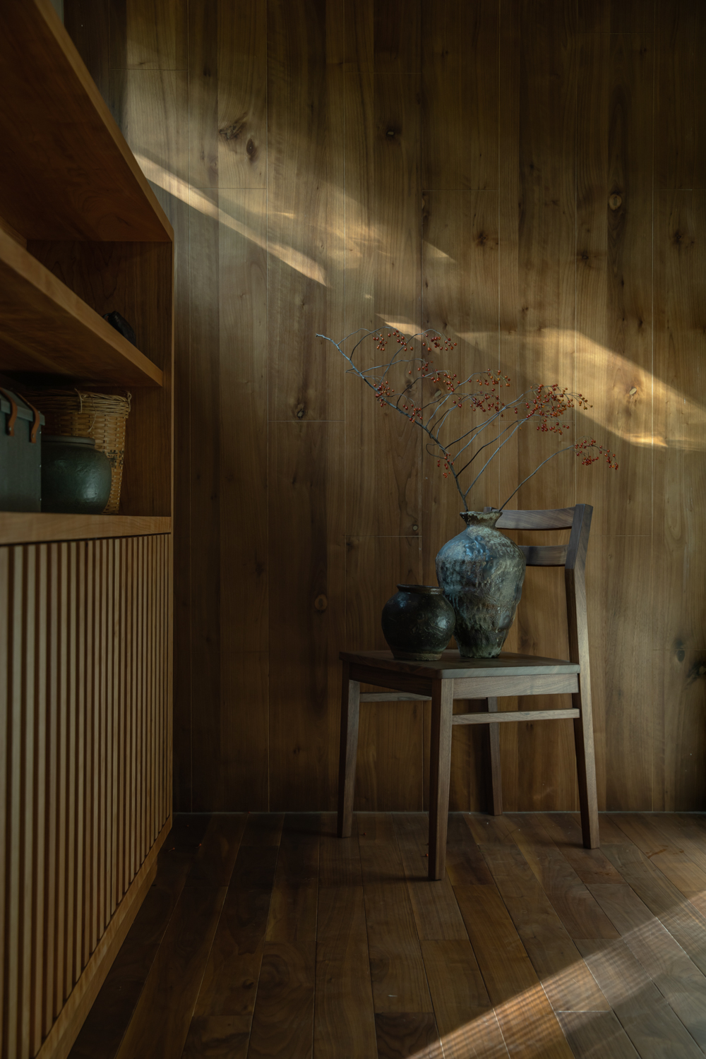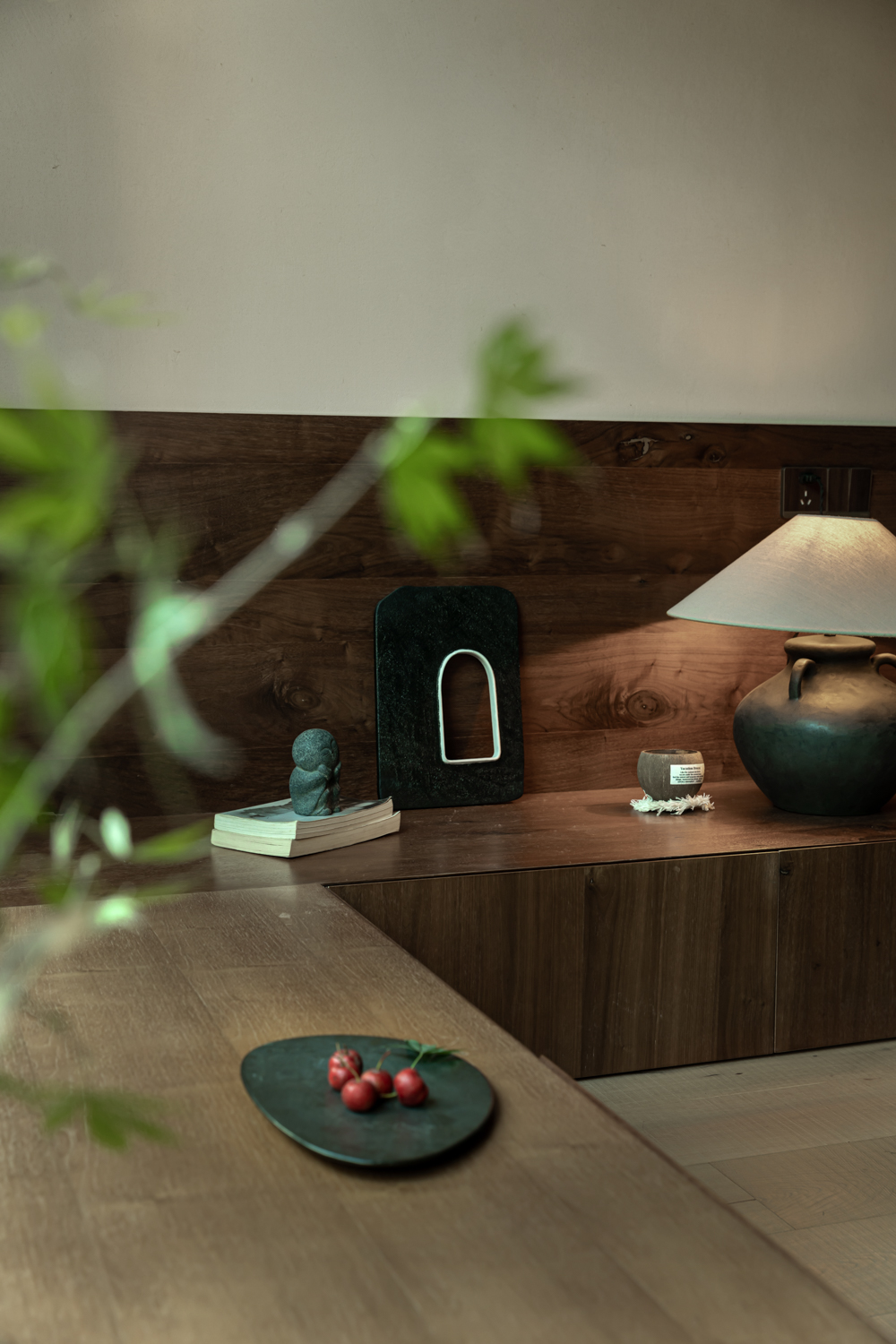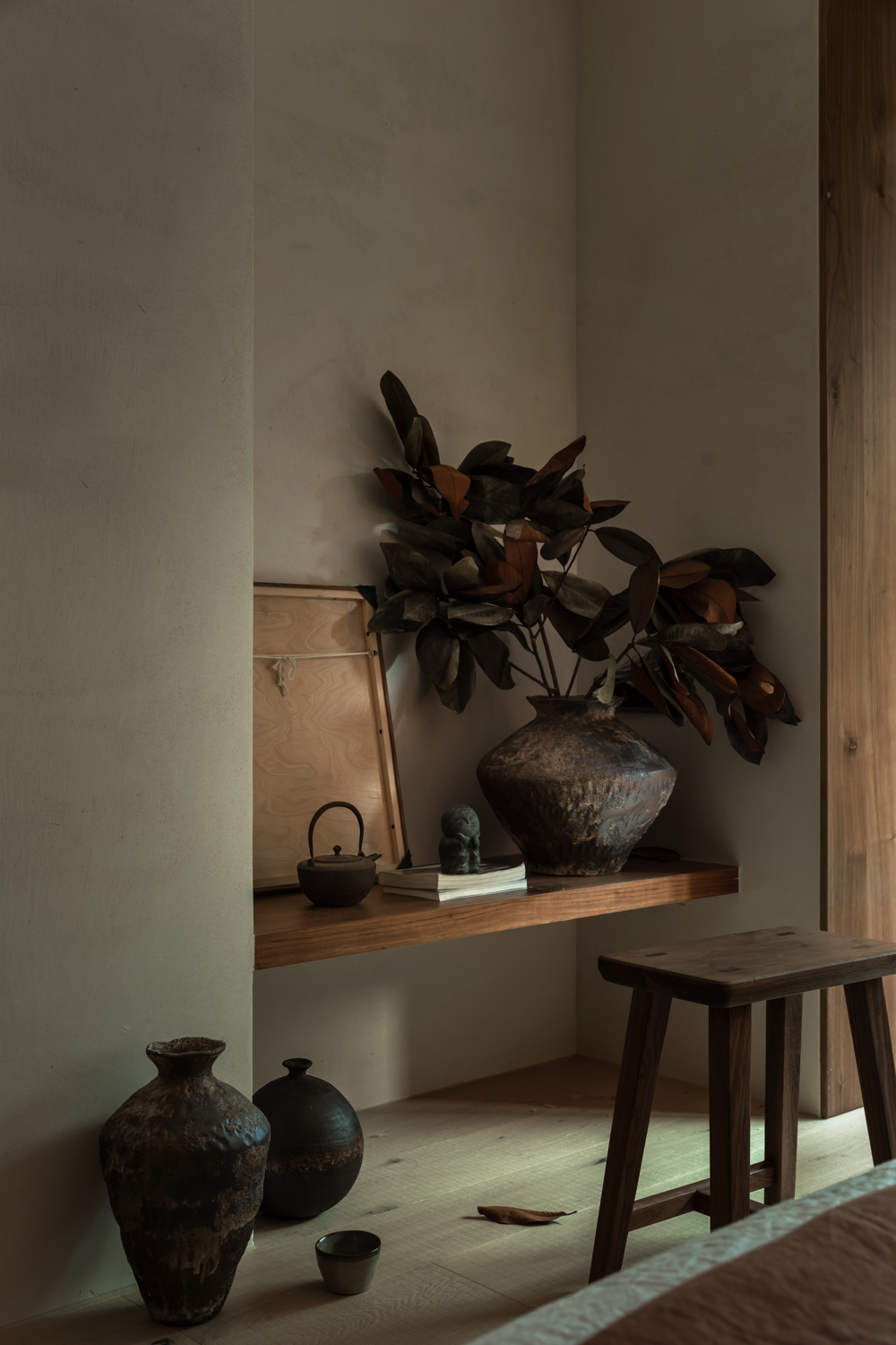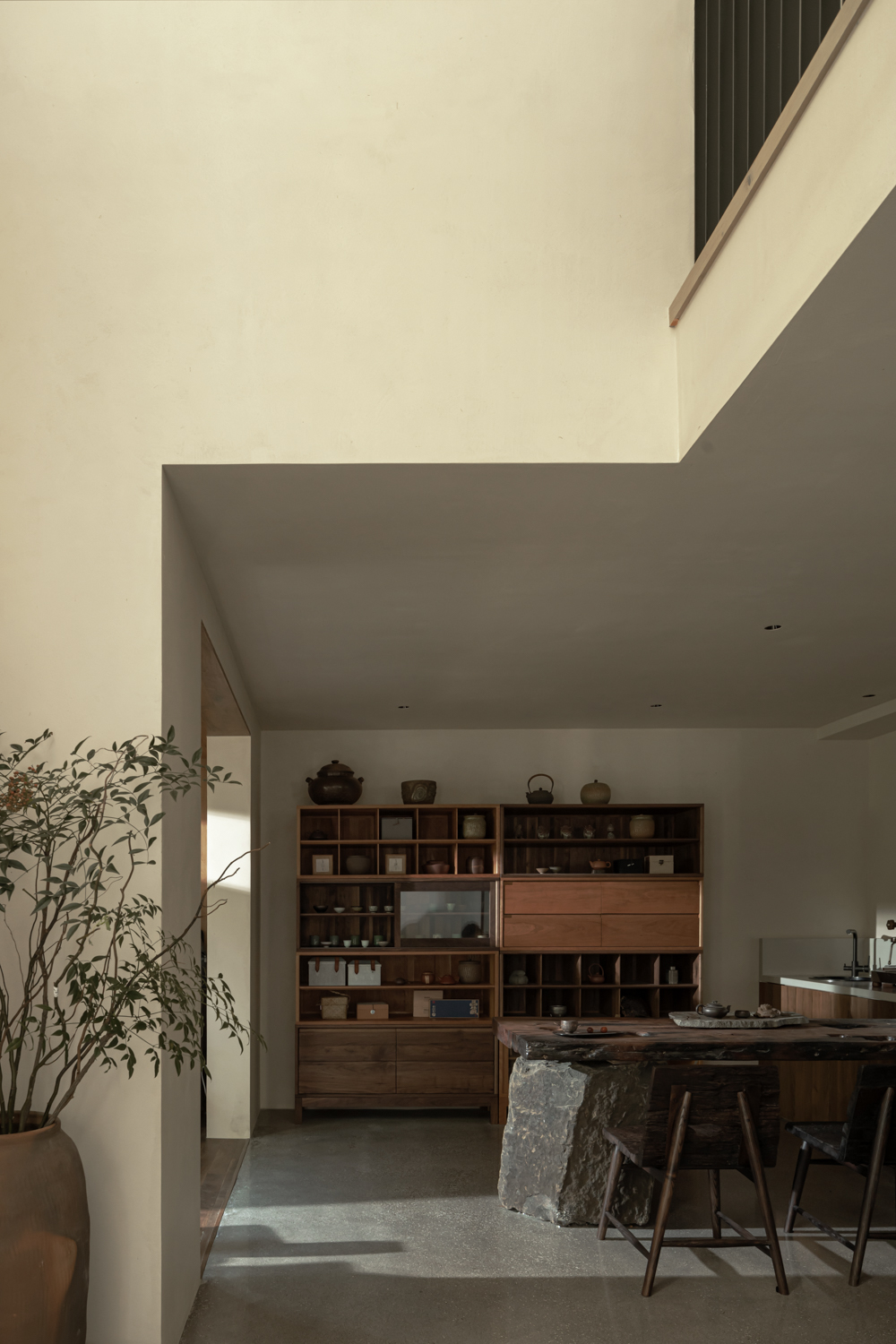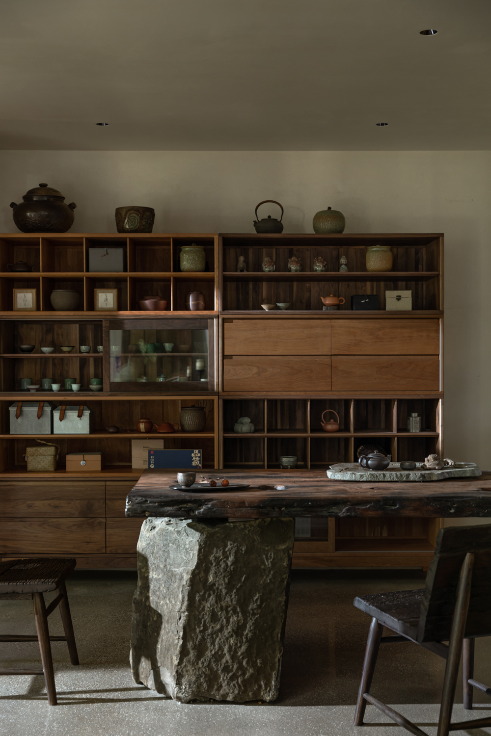 设计选材:从温州楠溪江边斑驳的苔藓中淘选的老石,成为了茶桌的支撑,相对较大的体量也在空间中落下浓墨重彩的笔触。桌面则选用老船木,流水的侵蚀与暴晒让木头呈现着粗犷的形状,但触手又极其温润,两者拼合,形成质朴而天然的意趣。茶桌旁的木椅则是业主自己动手制作的成果,新与旧的器物在同一个场景中呈现,天然的气质与手工的雕琢相辅相成,别有意趣。空间以木质代表温润,再由石块与粗陶带来自由旷然的洒脱之感,不拘于风格的定式,材质的混搭形成跳跃有趣的感官印象,丰盈着整体空间的层次与内涵