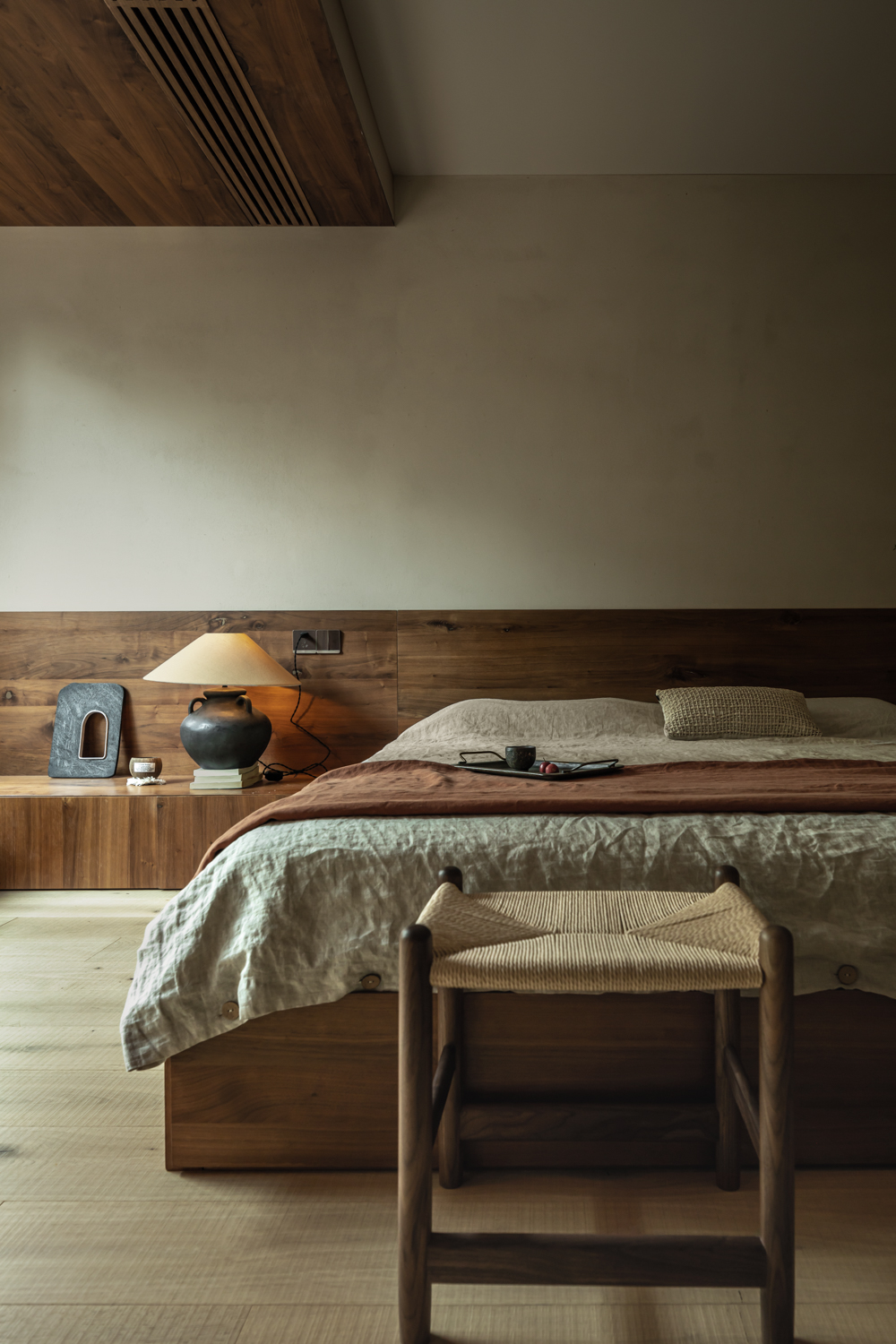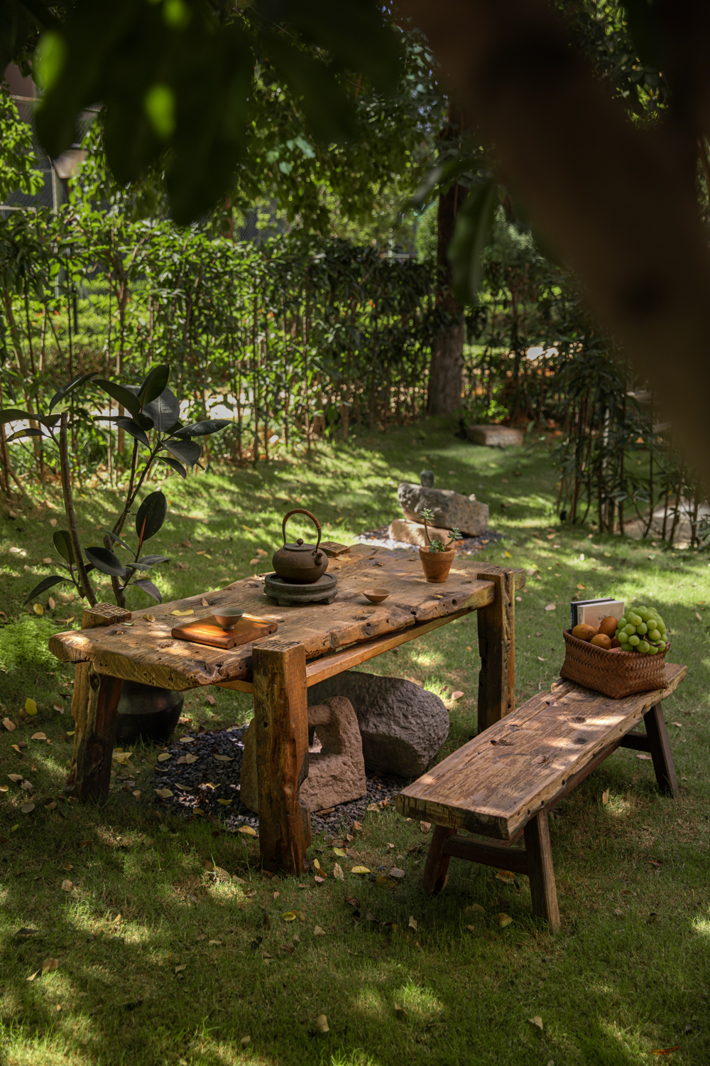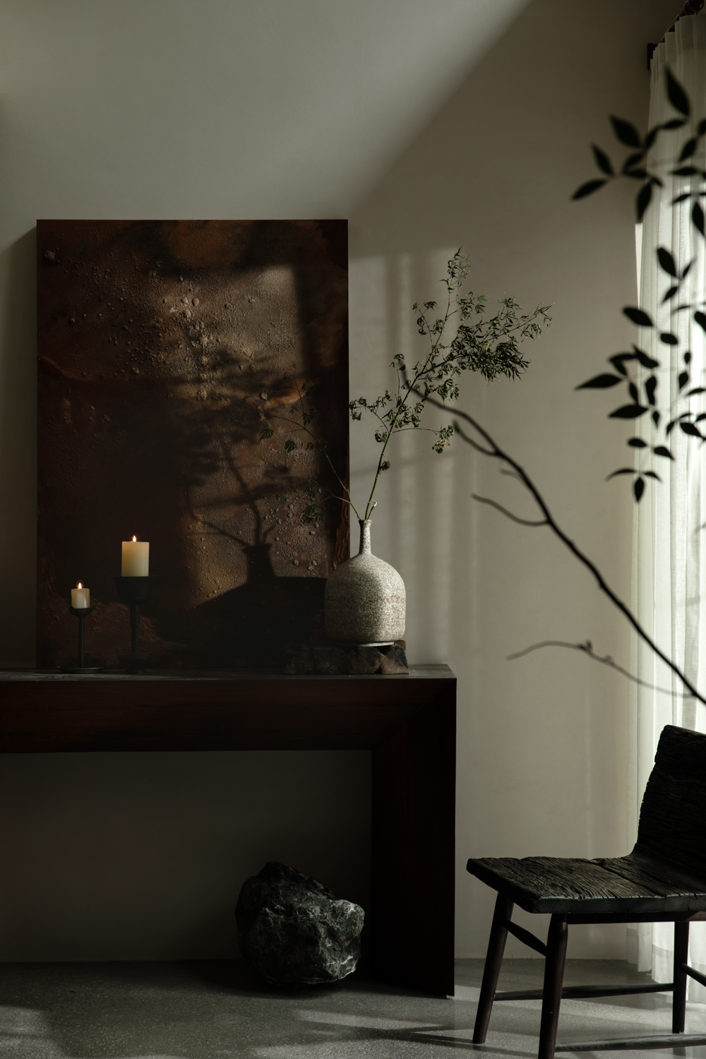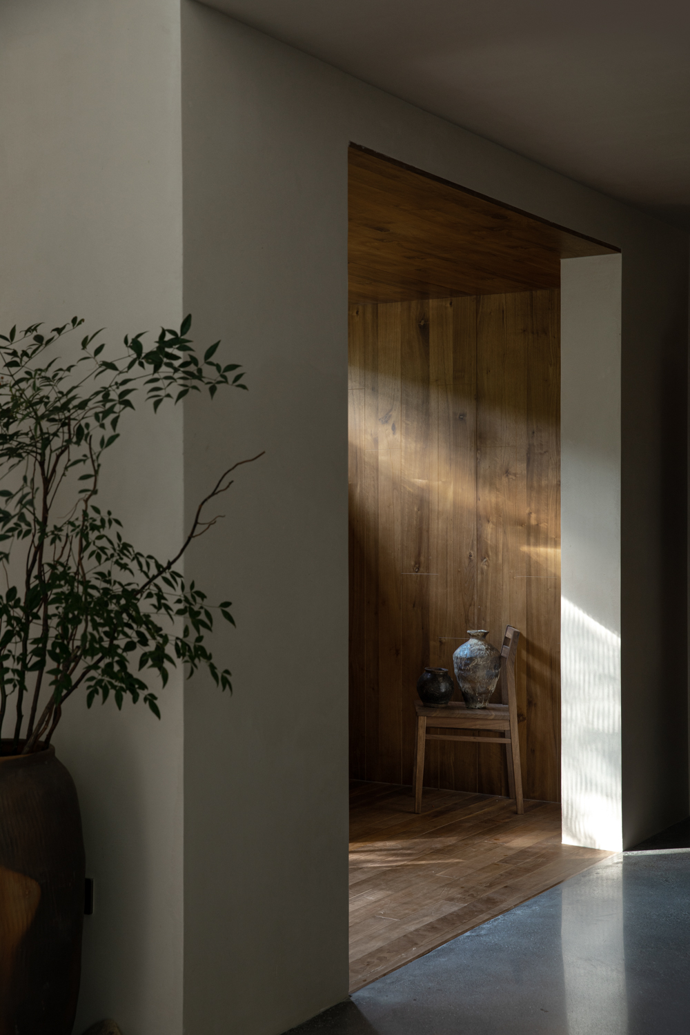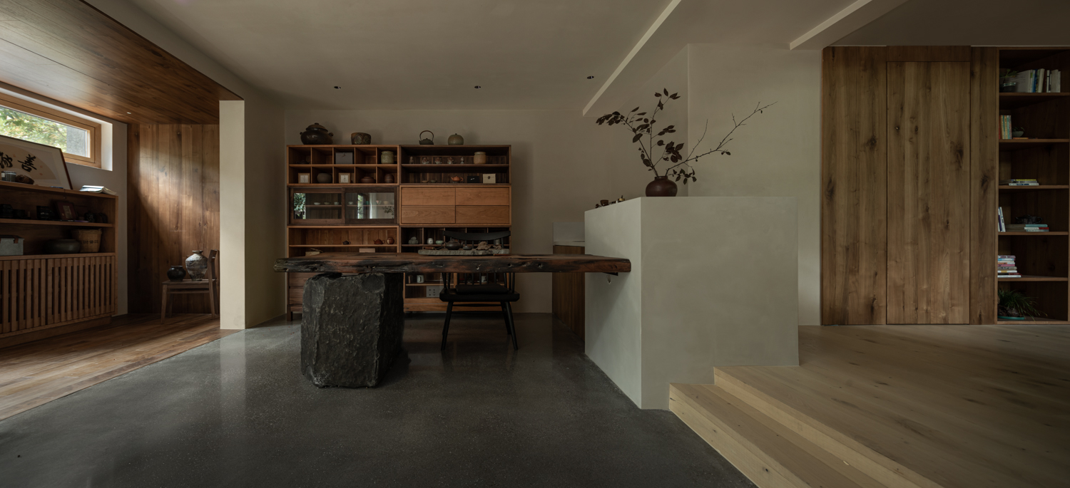 设计选材:从温州楠溪江边斑驳的苔藓中淘选的老石,成为了茶桌的支撑,相对较大的体量也在空间中落下浓墨重彩的笔触。桌面则选用老船木,流水的侵蚀与暴晒让木头呈现着粗犷的形状,但触手又极其温润,两者拼合,形成质朴而天然的意趣。茶桌旁的木椅则是业主自己动手制作的成果,新与旧的器物在同一个场景中呈现,天然的气质与手工的雕琢相辅相成,别有意趣。空间以木质代表温润,再由石块与粗陶带来自由旷然的洒脱之感,不拘于风格的定式,材质的混搭形成跳跃有趣的感官印象,丰盈着整体空间的层次与内涵