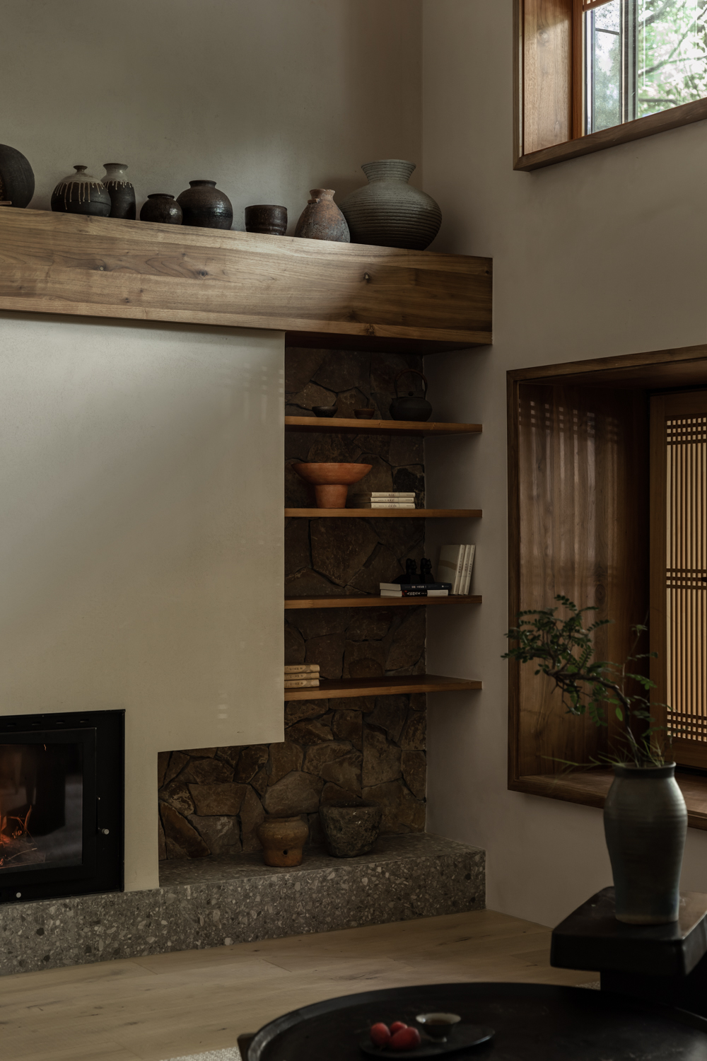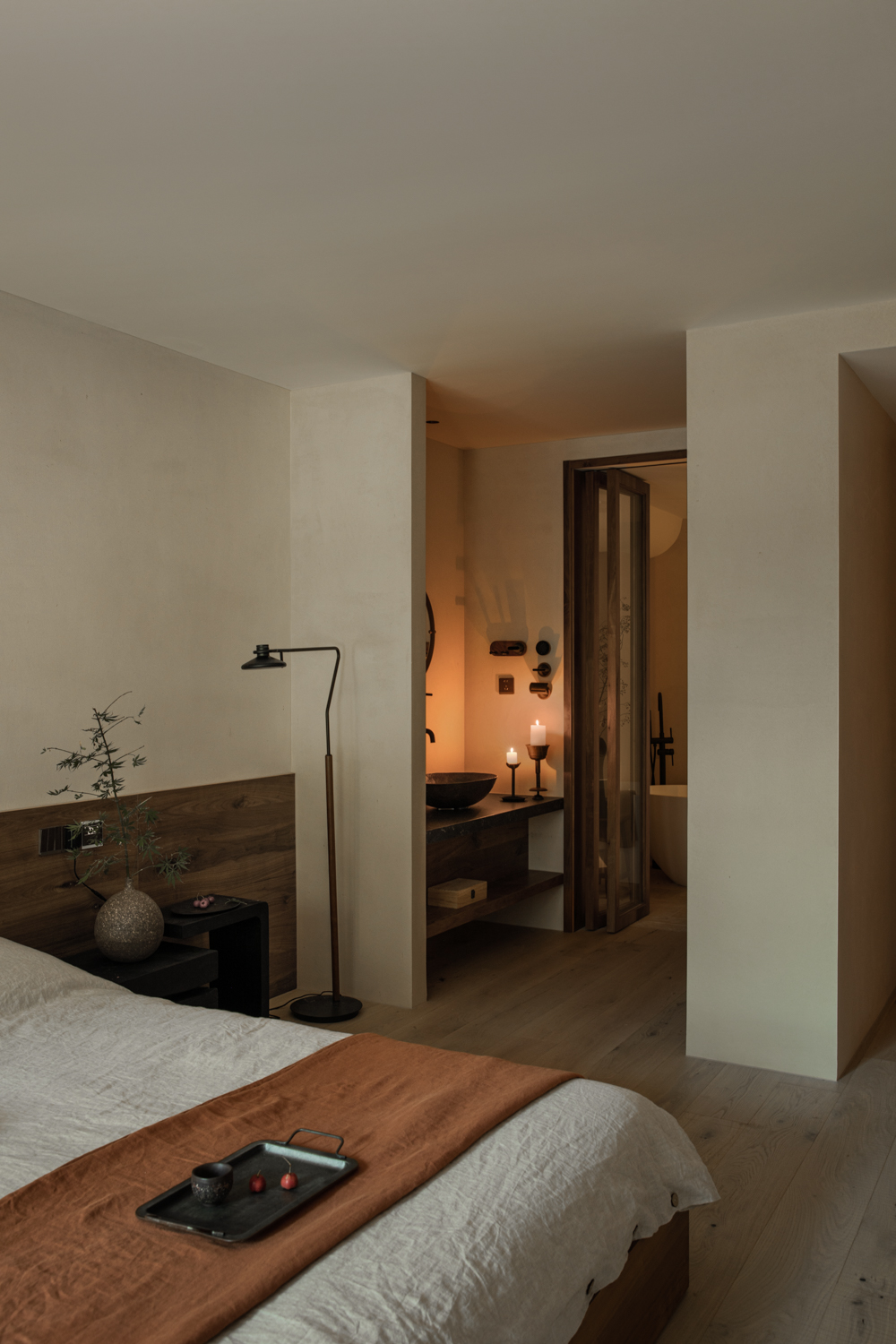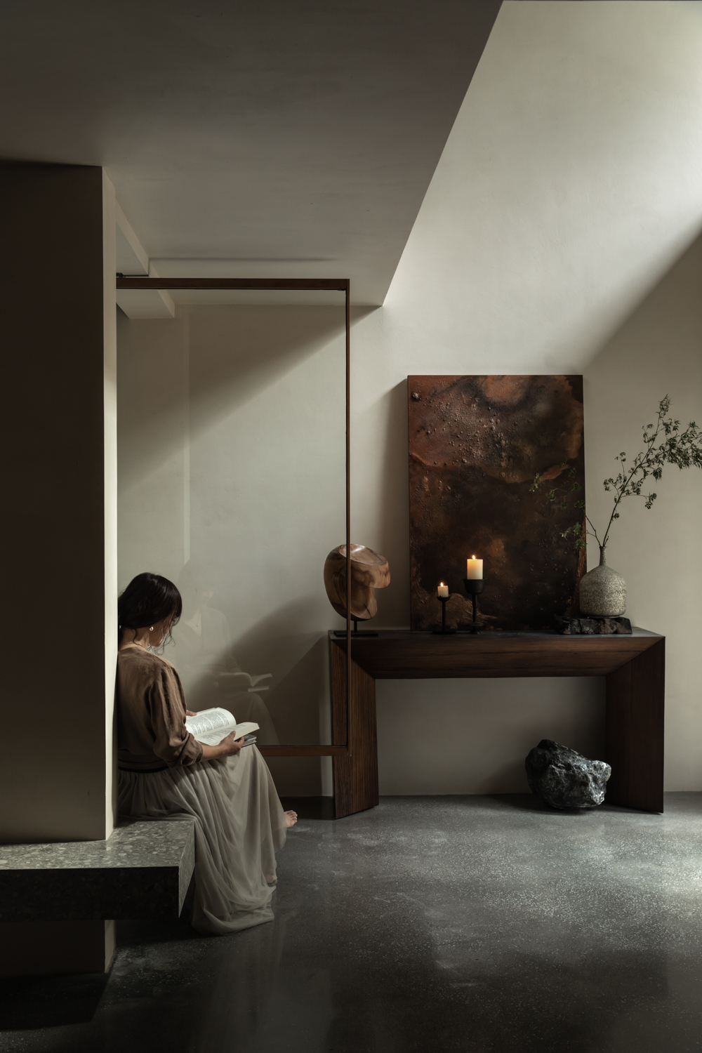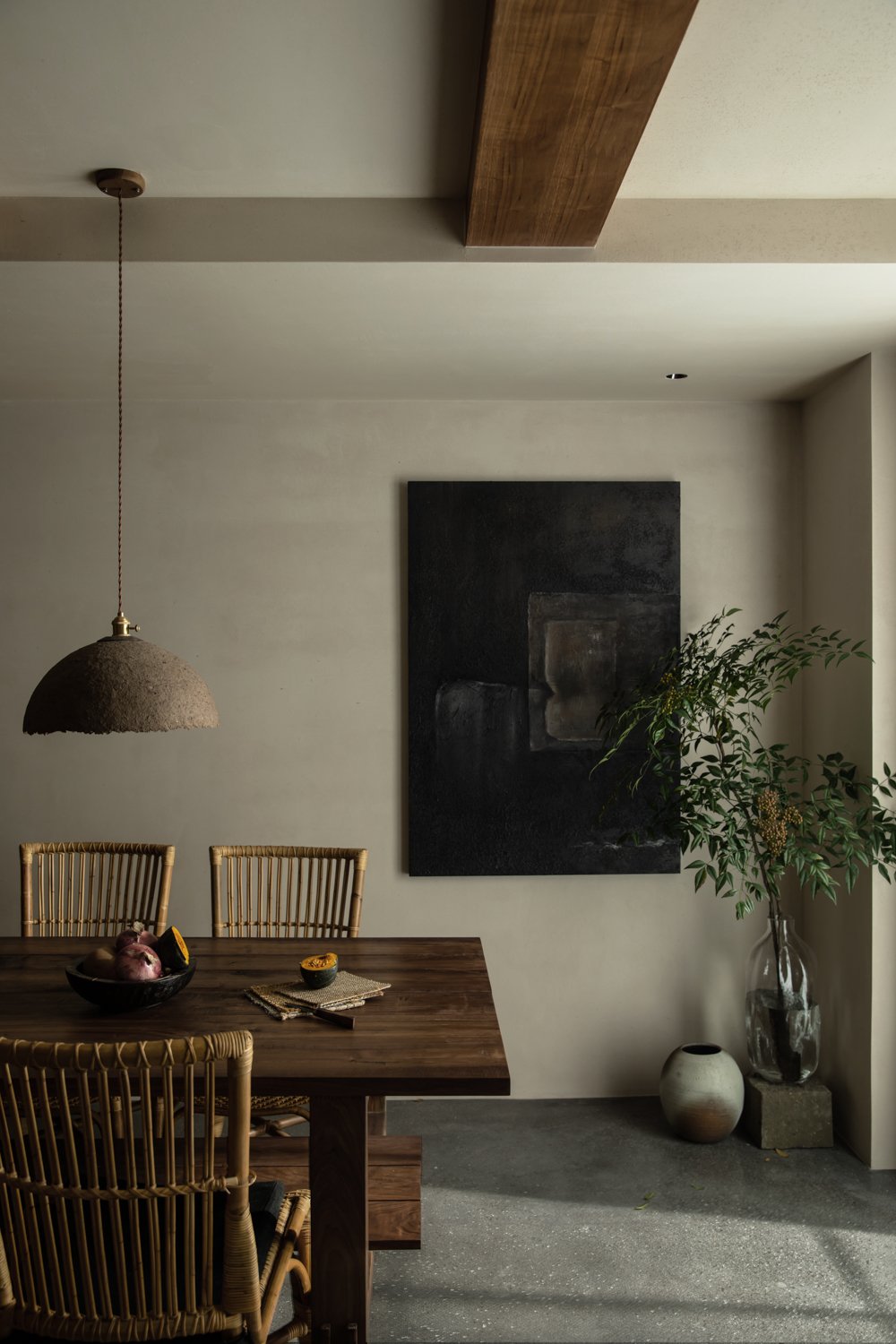 设计选材:从温州楠溪江边斑驳的苔藓中淘选的老石,成为了茶桌的支撑,相对较大的体量也在空间中落下浓墨重彩的笔触。桌面则选用老船木,流水的侵蚀与暴晒让木头呈现着粗犷的形状,但触手又极其温润,两者拼合,形成质朴而天然的意趣。茶桌旁的木椅则是业主自己动手制作的成果,新与旧的器物在同一个场景中呈现,天然的气质与手工的雕琢相辅相成,别有意趣。空间以木质代表温润,再由石块与粗陶带来自由旷然的洒脱之感,不拘于风格的定式,材质的混搭形成跳跃有趣的感官印象,丰盈着整体空间的层次与内涵