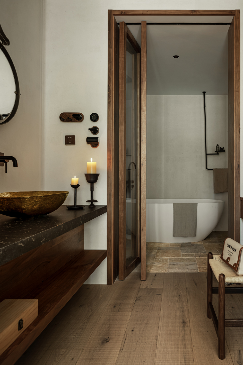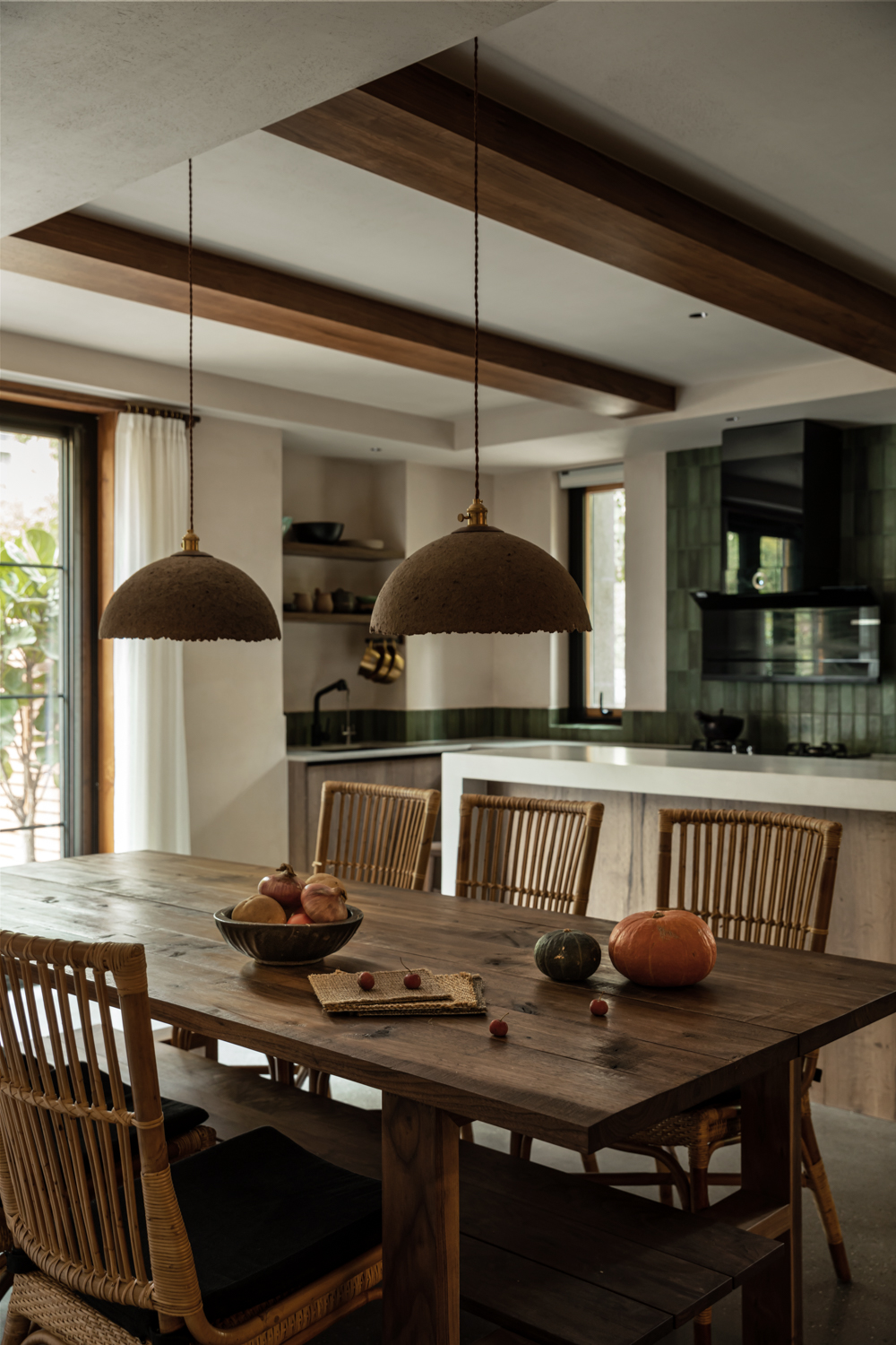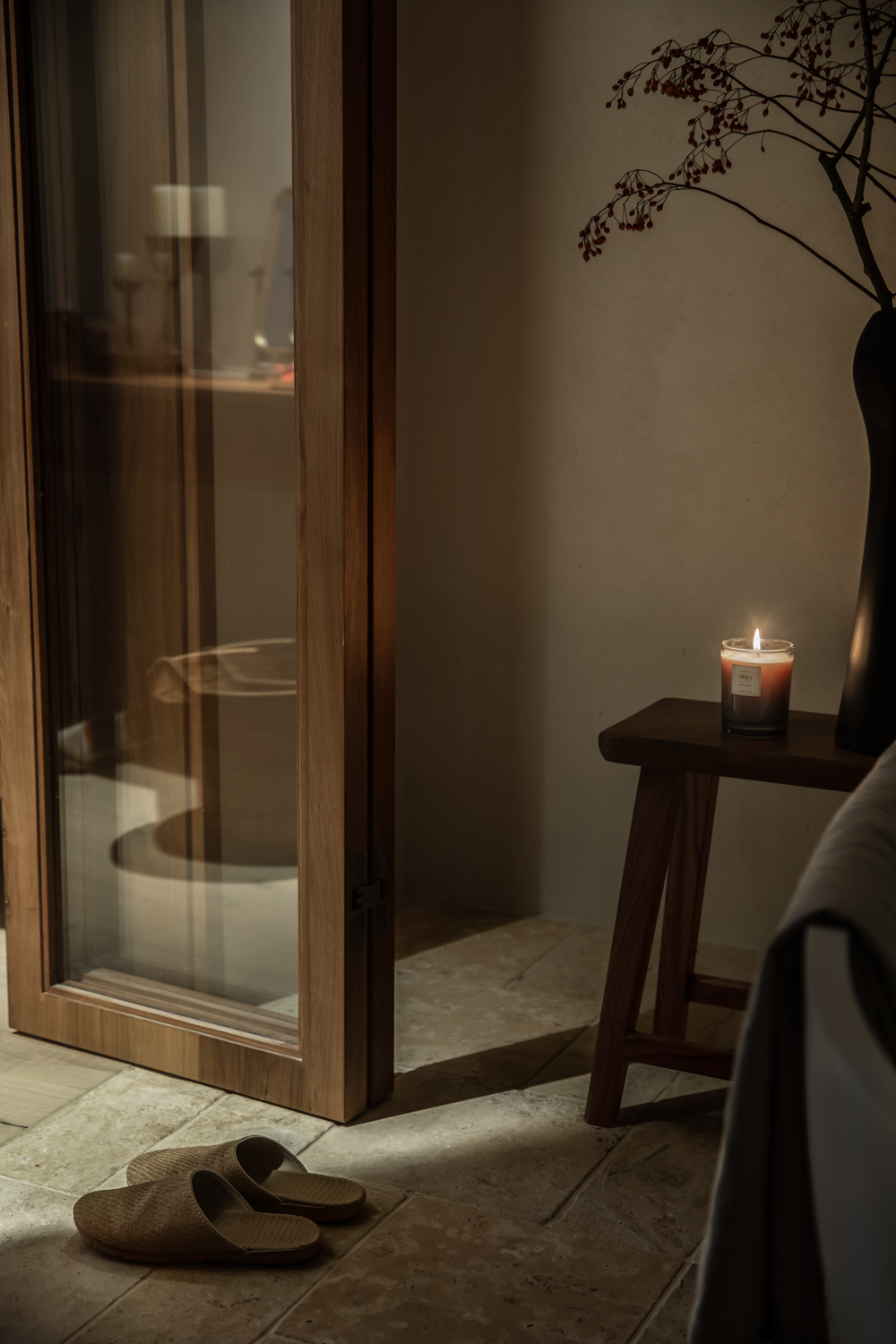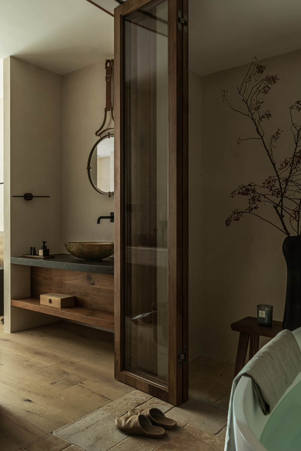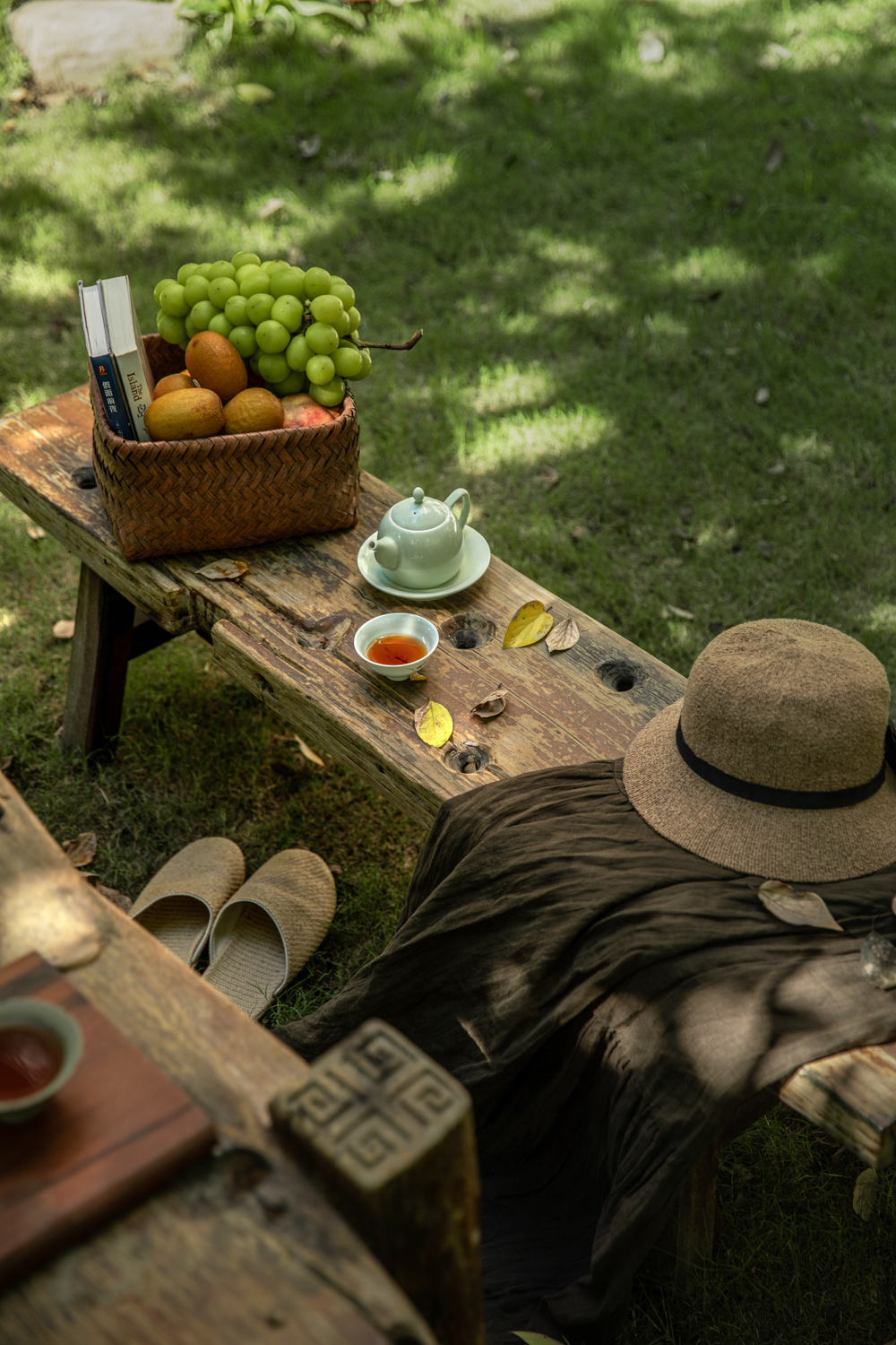 设计选材:从温州楠溪江边斑驳的苔藓中淘选的老石,成为了茶桌的支撑,相对较大的体量也在空间中落下浓墨重彩的笔触。桌面则选用老船木,流水的侵蚀与暴晒让木头呈现着粗犷的形状,但触手又极其温润,两者拼合,形成质朴而天然的意趣。茶桌旁的木椅则是业主自己动手制作的成果,新与旧的器物在同一个场景中呈现,天然的气质与手工的雕琢相辅相成,别有意趣。空间以木质代表温润,再由石块与粗陶带来自由旷然的洒脱之感,不拘于风格的定式,材质的混搭形成跳跃有趣的感官印象,丰盈着整体空间的层次与内涵