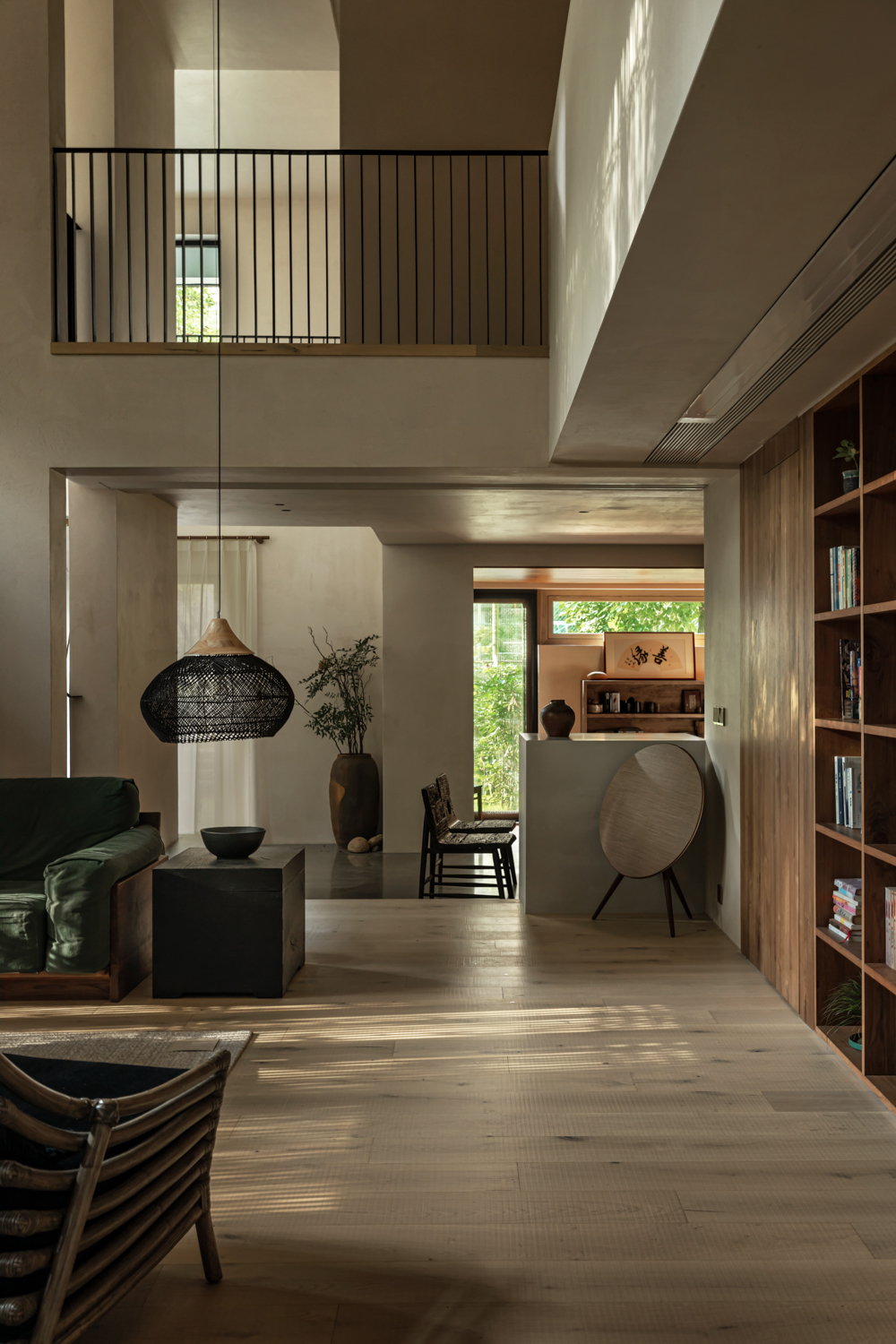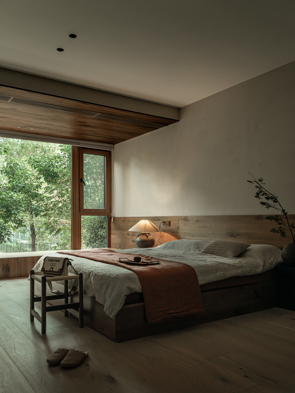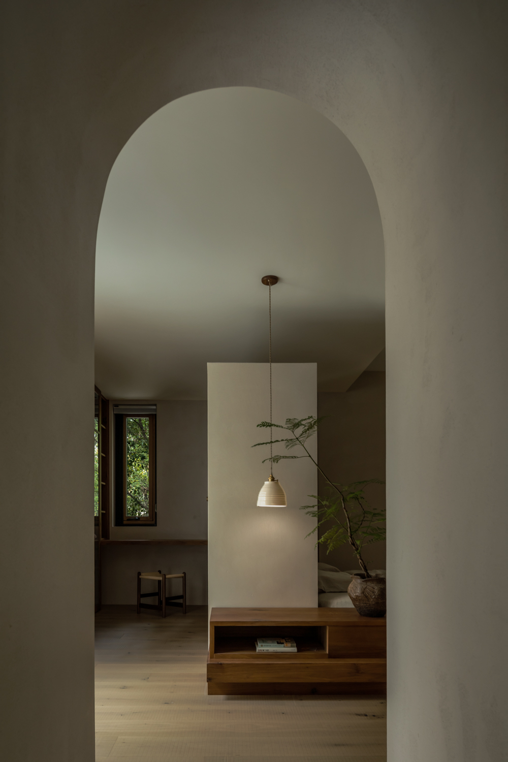 空间布局:客厅作为一层的中心场域,向西侧延展为餐厨空间,向东而行则为入户与品茗区域,设计将品茗区设置于入户与客厅之间,意在通过茶所带来的感官印象,将外界的喧嚣屏蔽,从而代表踏入静谧之处的开端。餐厅作为继客厅外的第二待客区域,同样注重打造光在空间中的流动性,通过窗景引入室外葱茏的绿意,形成场域内外的相互延伸。不同的场域楼层之间,相互连贯相接,立面适当的打断使得行走的过程中,如游园般移步易景,家庭成员的视线在空间中自由交汇,促成互动对话.二层以寝居空间为主,以窗为中心设境,通铺木地板与一层区分。抬高飘窗形成落座,窗外的枝叶繁茂如画般映入,空间整体较深,这使得光线浸入的过程层次分明,由明及暗带来丰富的视觉体验感,亦代表着向外交流与向内自我的过渡。通过弧形拱门引入女儿房空间,以柔和的圆弧代表小女生浪漫想象力的开端。将阳台区域纳入,形成双面环窗的游园式格局,床置于场景中心,成为当之无愧的重点,功能区域围绕其呈现,收放得宜地串联起成长空间的生活脉络。