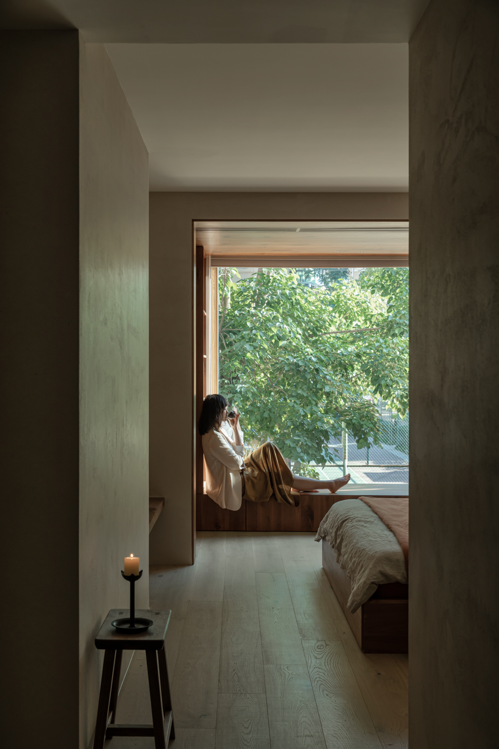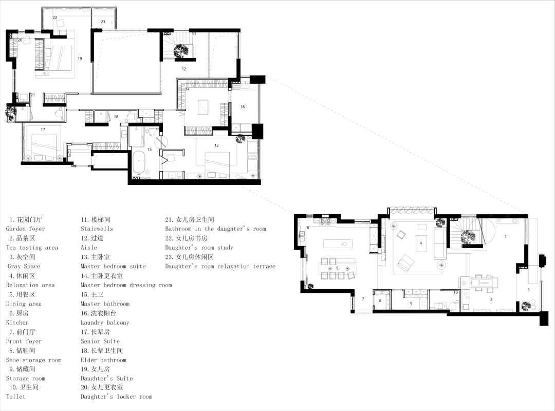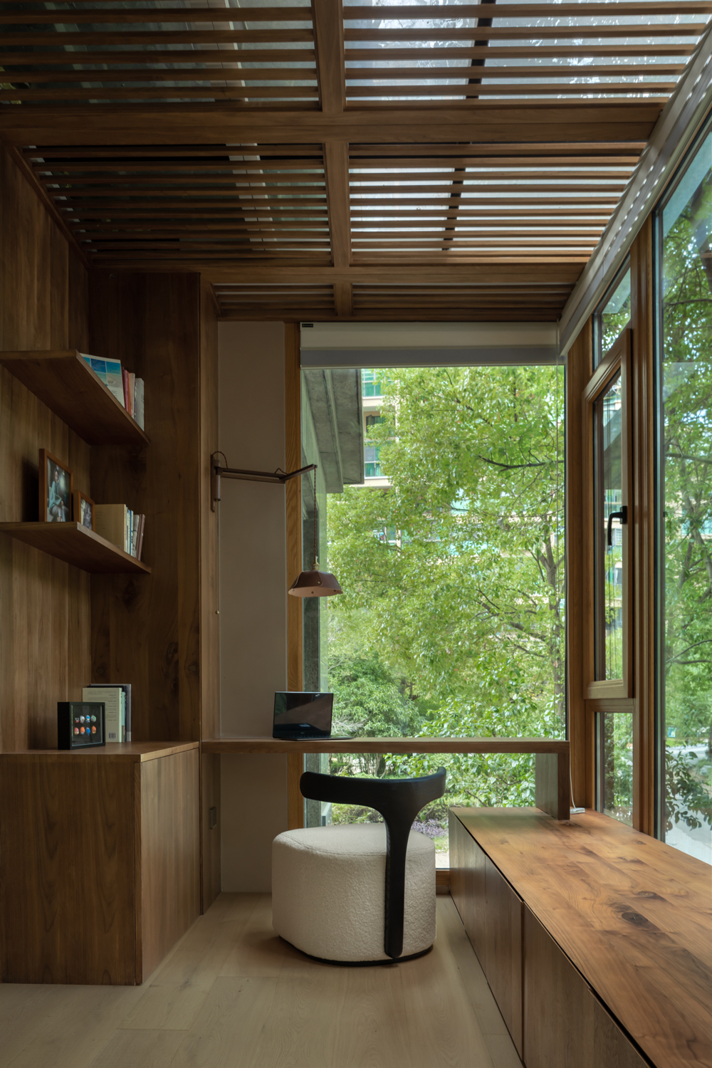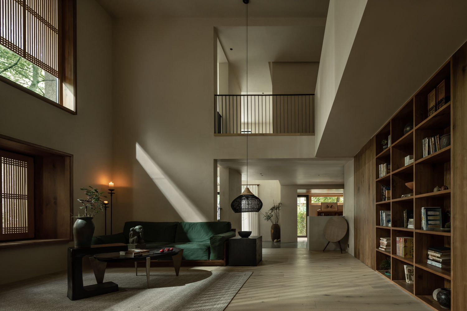 空间布局:客厅作为一层的中心场域,向西侧延展为餐厨空间,向东而行则为入户与品茗区域,设计将品茗区设置于入户与客厅之间,意在通过茶所带来的感官印象,将外界的喧嚣屏蔽,从而代表踏入静谧之处的开端。餐厅作为继客厅外的第二待客区域,同样注重打造光在空间中的流动性,通过窗景引入室外葱茏的绿意,形成场域内外的相互延伸。不同的场域楼层之间,相互连贯相接,立面适当的打断使得行走的过程中,如游园般移步易景,家庭成员的视线在空间中自由交汇,促成互动对话.二层以寝居空间为主,以窗为中心设境,通铺木地板与一层区分。抬高飘窗形成落座,窗外的枝叶繁茂如画般映入,空间整体较深,这使得光线浸入的过程层次分明,由明及暗带来丰富的视觉体验感,亦代表着向外交流与向内自我的过渡。通过弧形拱门引入女儿房空间,以柔和的圆弧代表小女生浪漫想象力的开端。将阳台区域纳入,形成双面环窗的游园式格局,床置于场景中心,成为当之无愧的重点,功能区域围绕其呈现,收放得宜地串联起成长空间的生活脉络。
