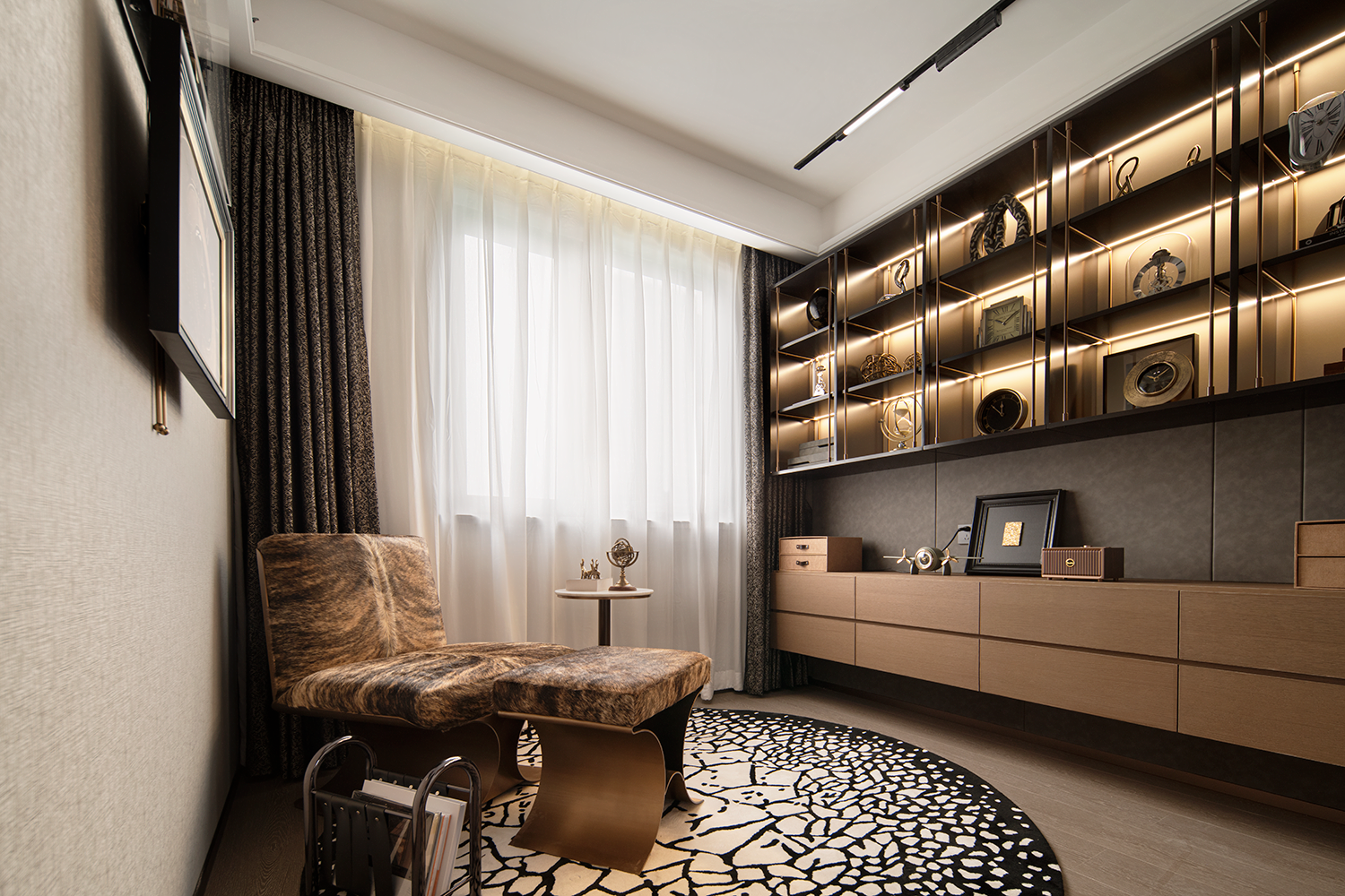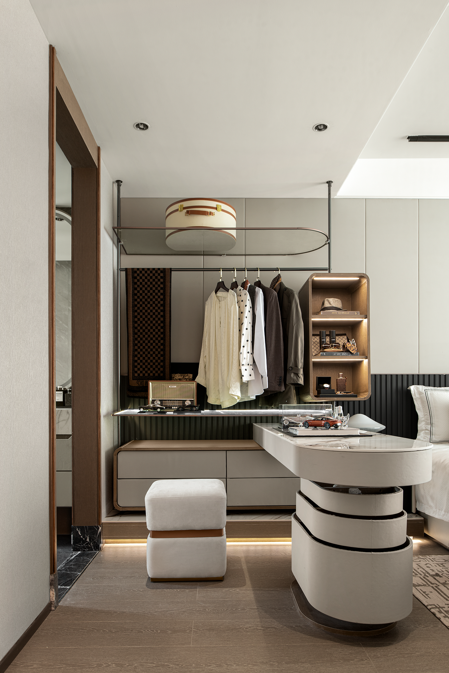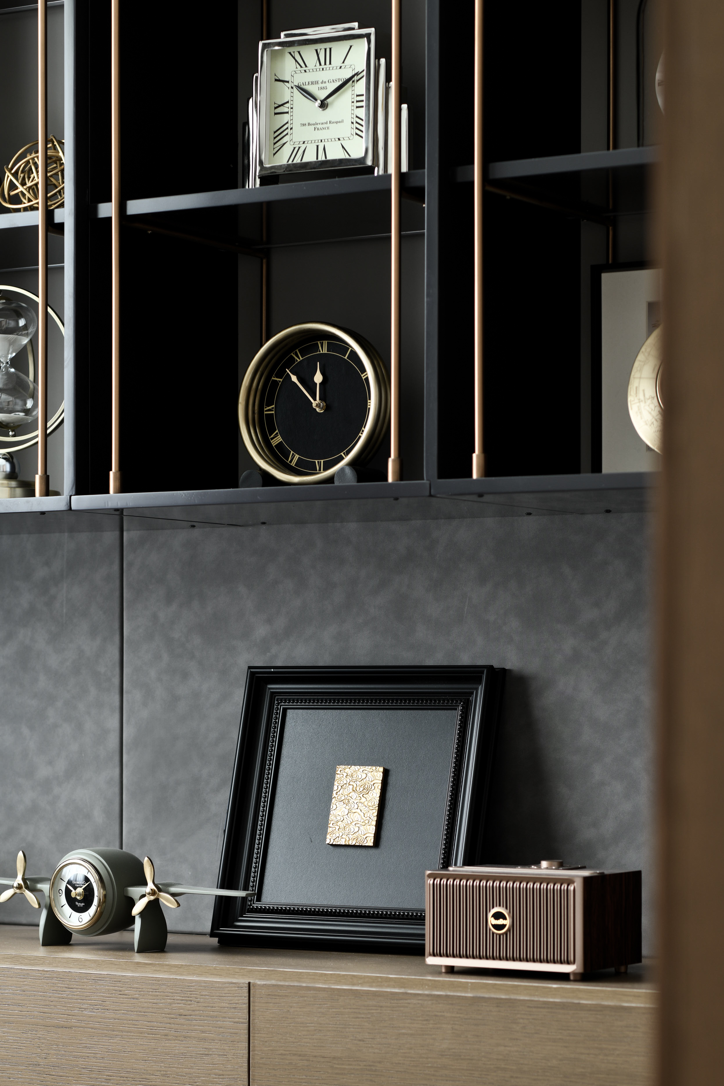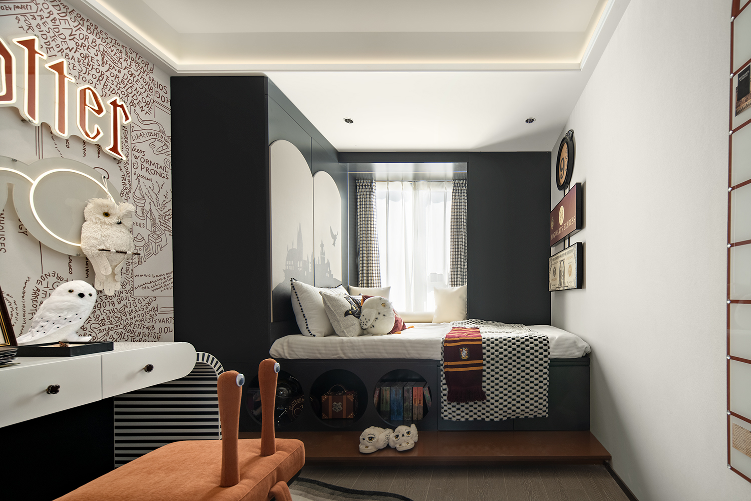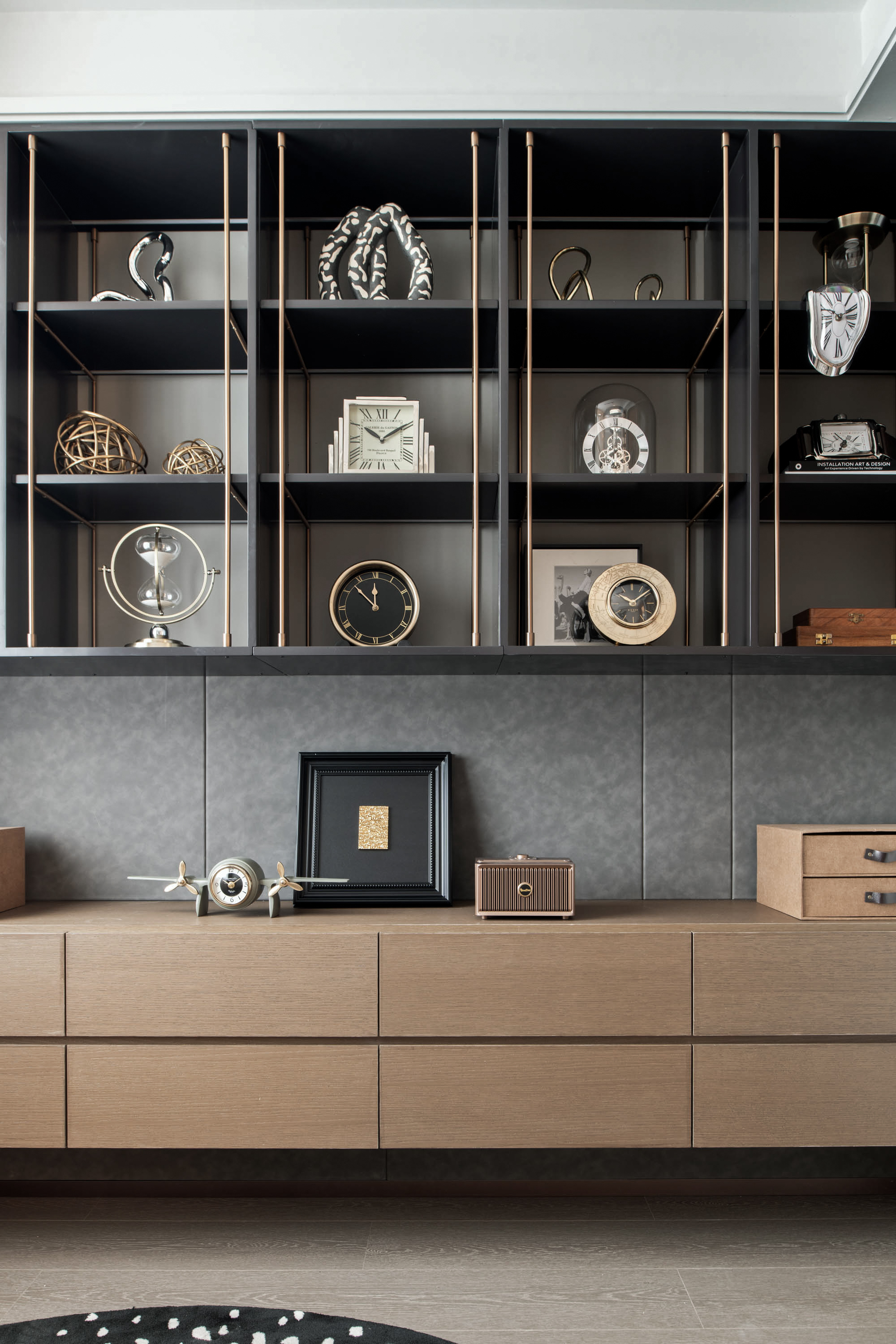 打破常规客厅布局模式,通过家具的强收纳功能满足客户真正的生活储物需求。大胆的把儿童房去除间隔墙体,作为展示柜体进行隔断设计,既时尚,又通透,也体现家庭关系的融洽和谐,温馨。