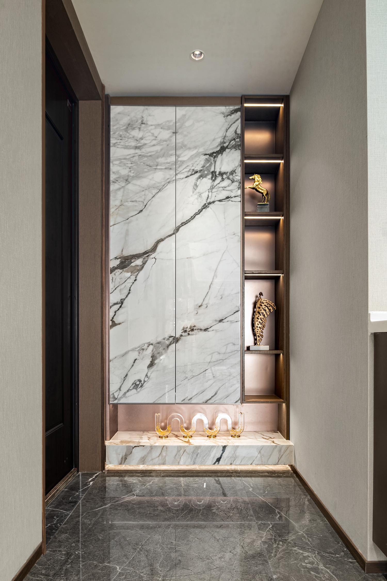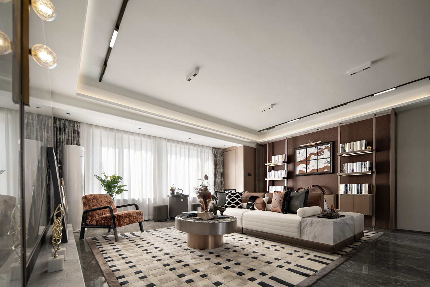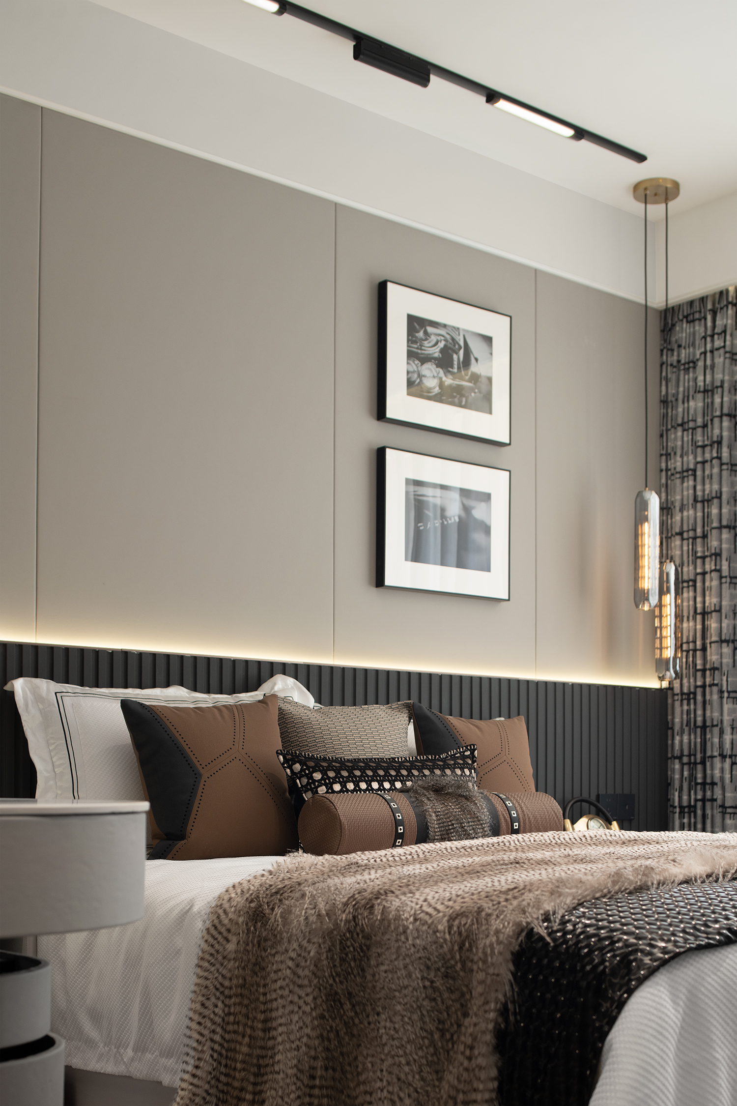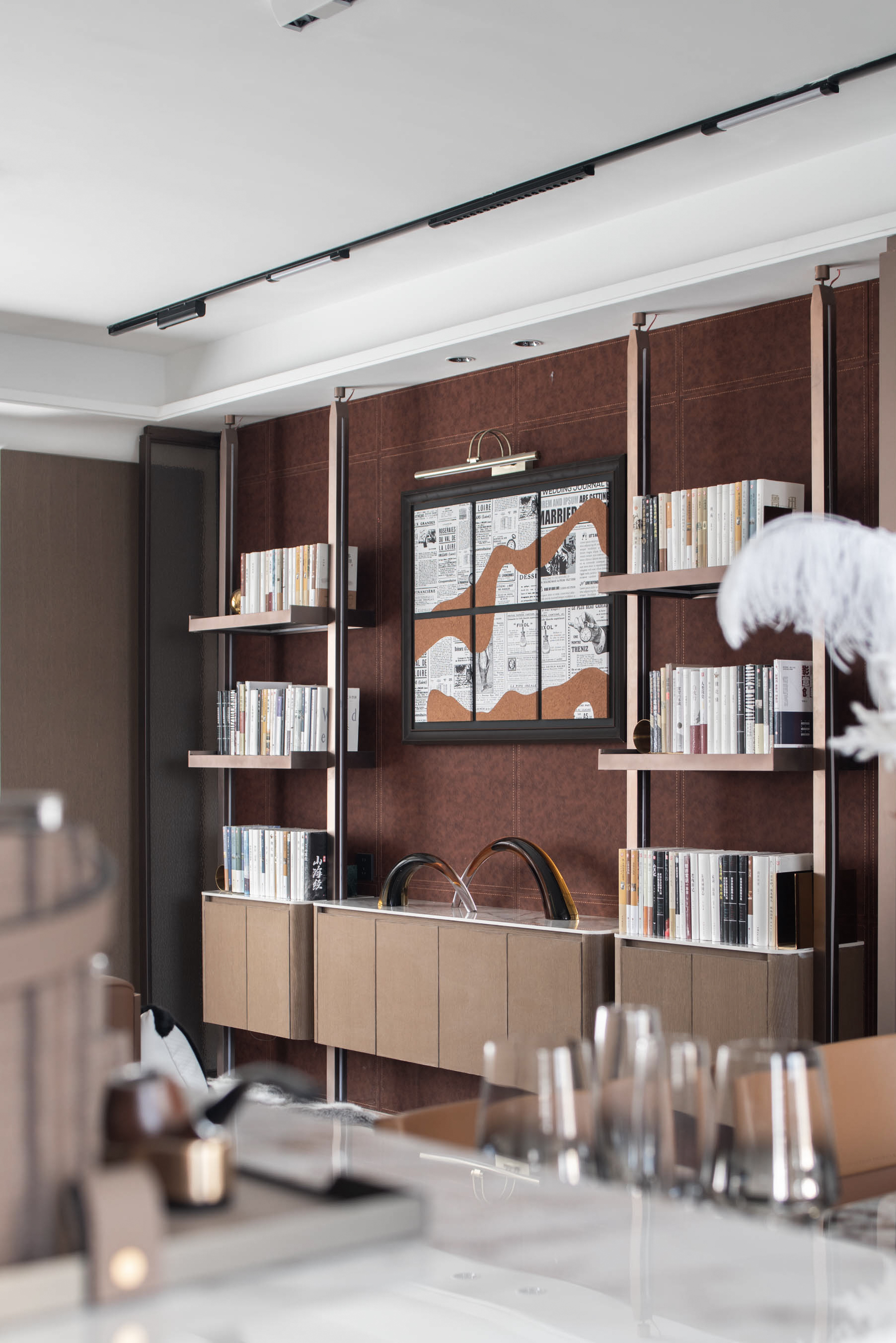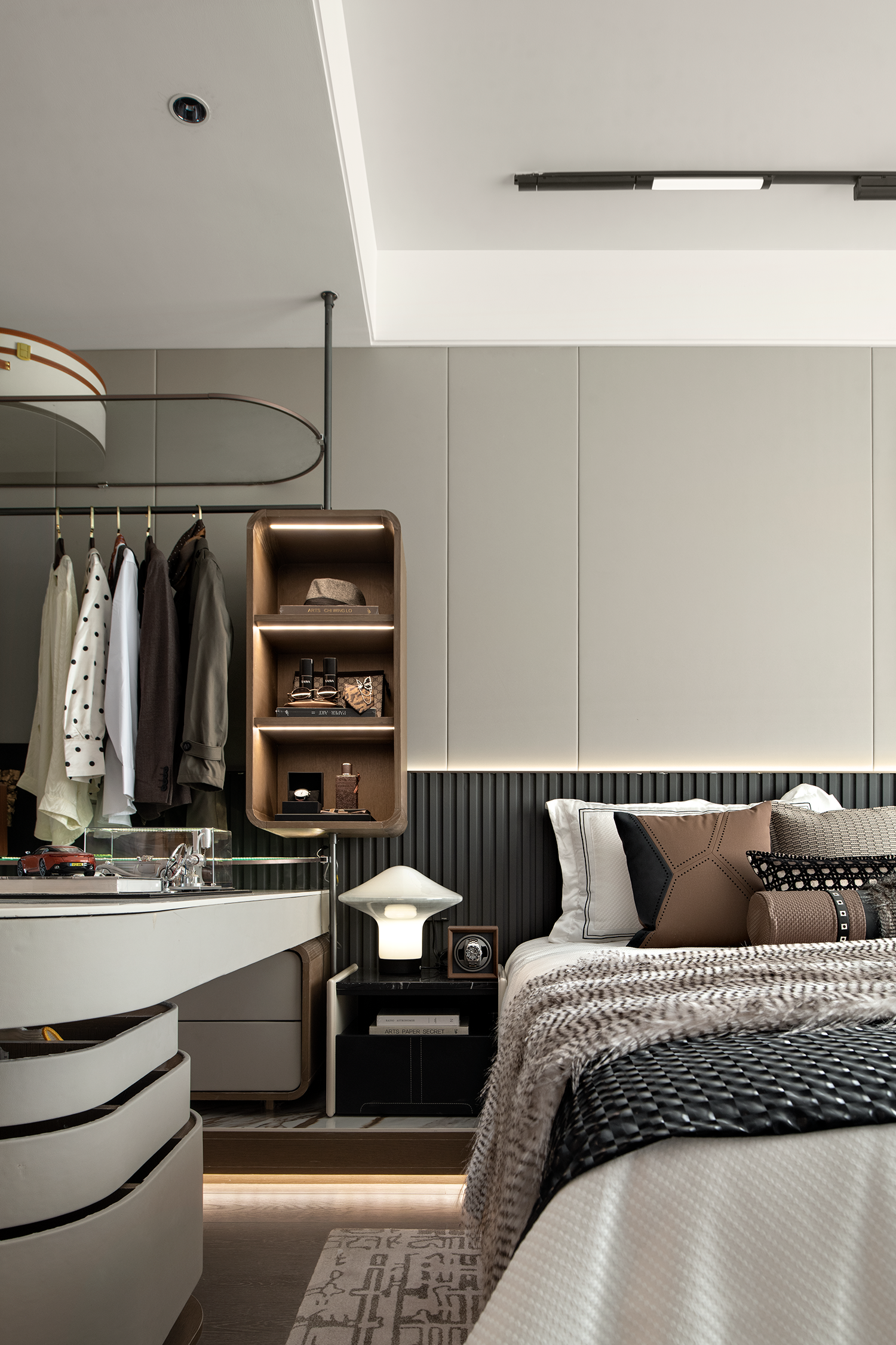 打破常规客厅布局模式,通过家具的强收纳功能满足客户真正的生活储物需求。大胆的把儿童房去除间隔墙体,作为展示柜体进行隔断设计,既时尚,又通透,也体现家庭关系的融洽和谐,温馨。