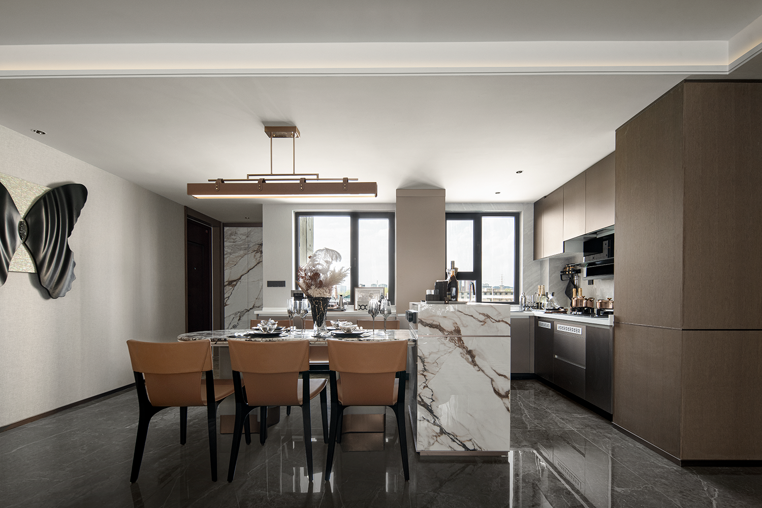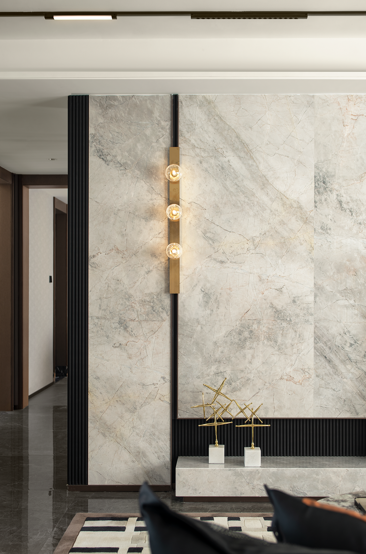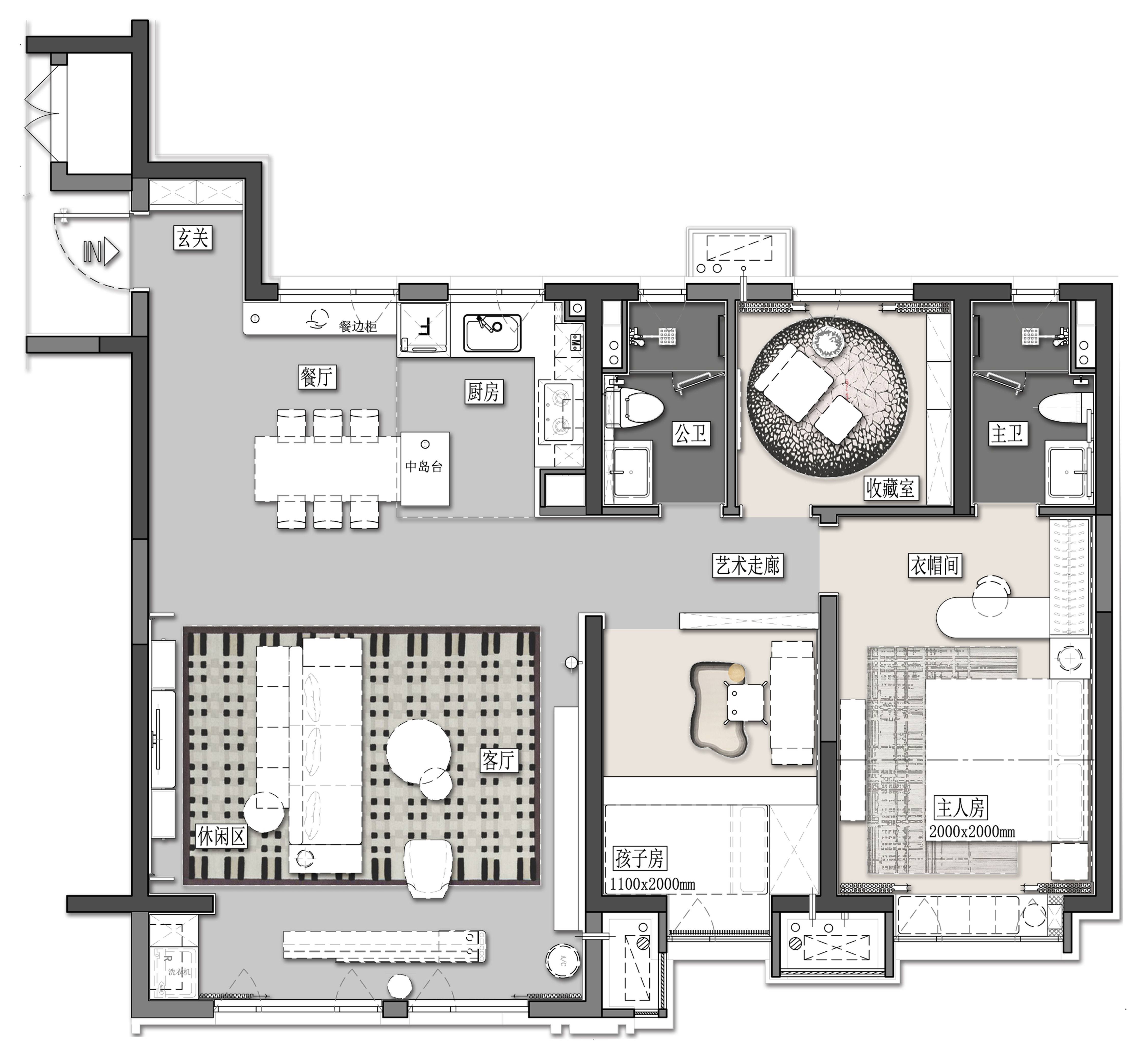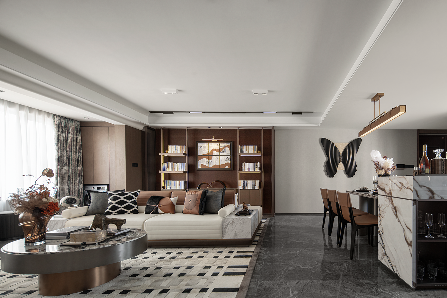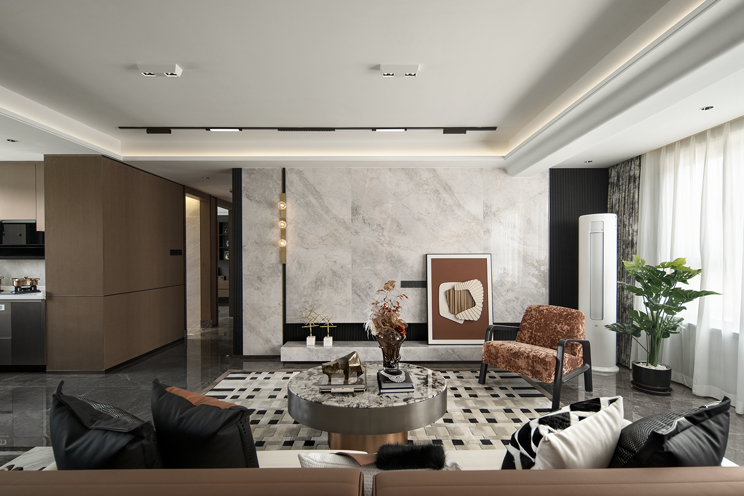 打破常规客厅布局模式,通过家具的强收纳功能满足客户真正的生活储物需求。大胆的把儿童房去除间隔墙体,作为展示柜体进行隔断设计,既时尚,又通透,也体现家庭关系的融洽和谐,温馨。