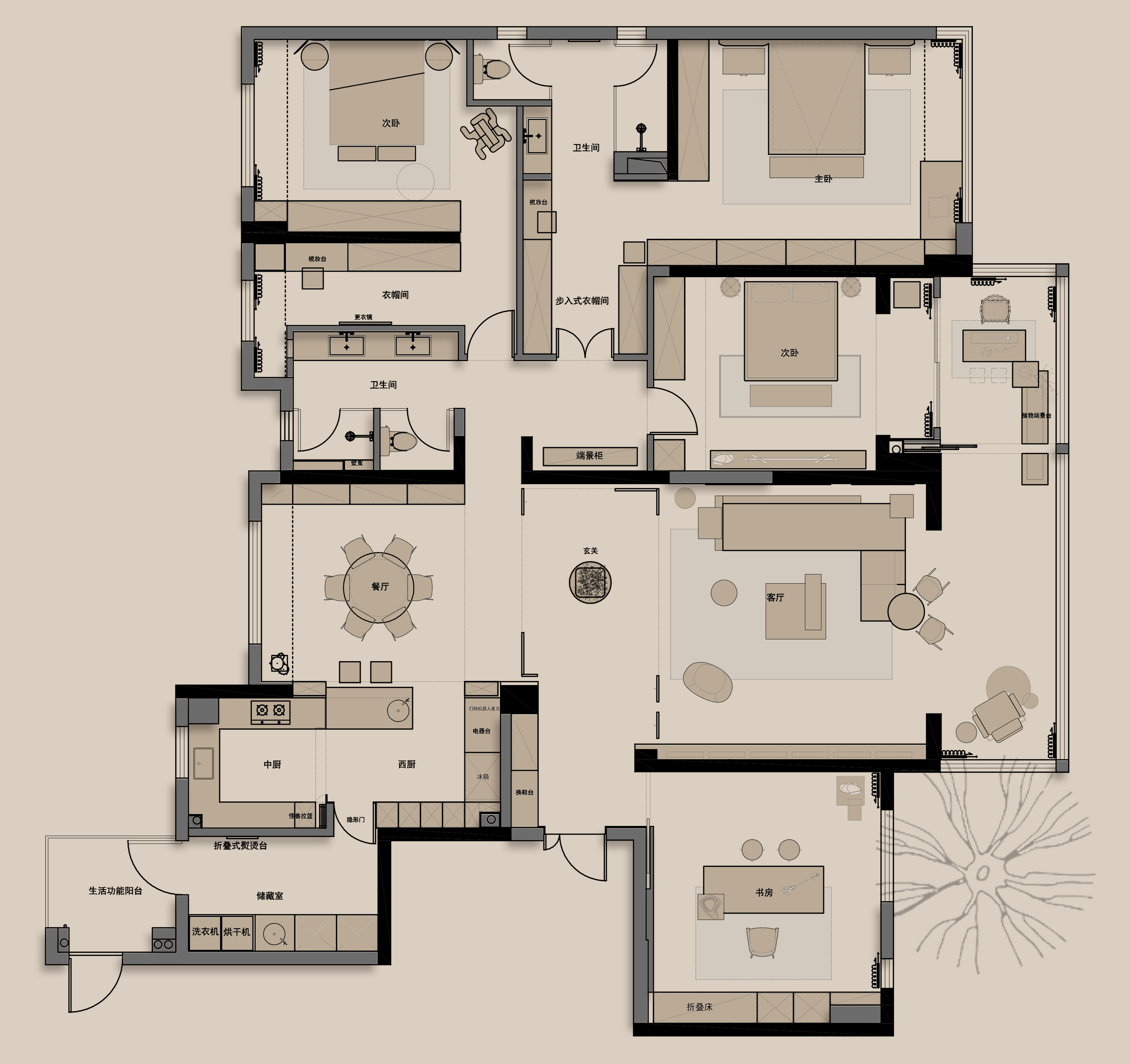 一入门就是衣帽间与梳妆相结合,精简的线条与沉稳的色彩,在灯光的加入下增加了空间层次感。