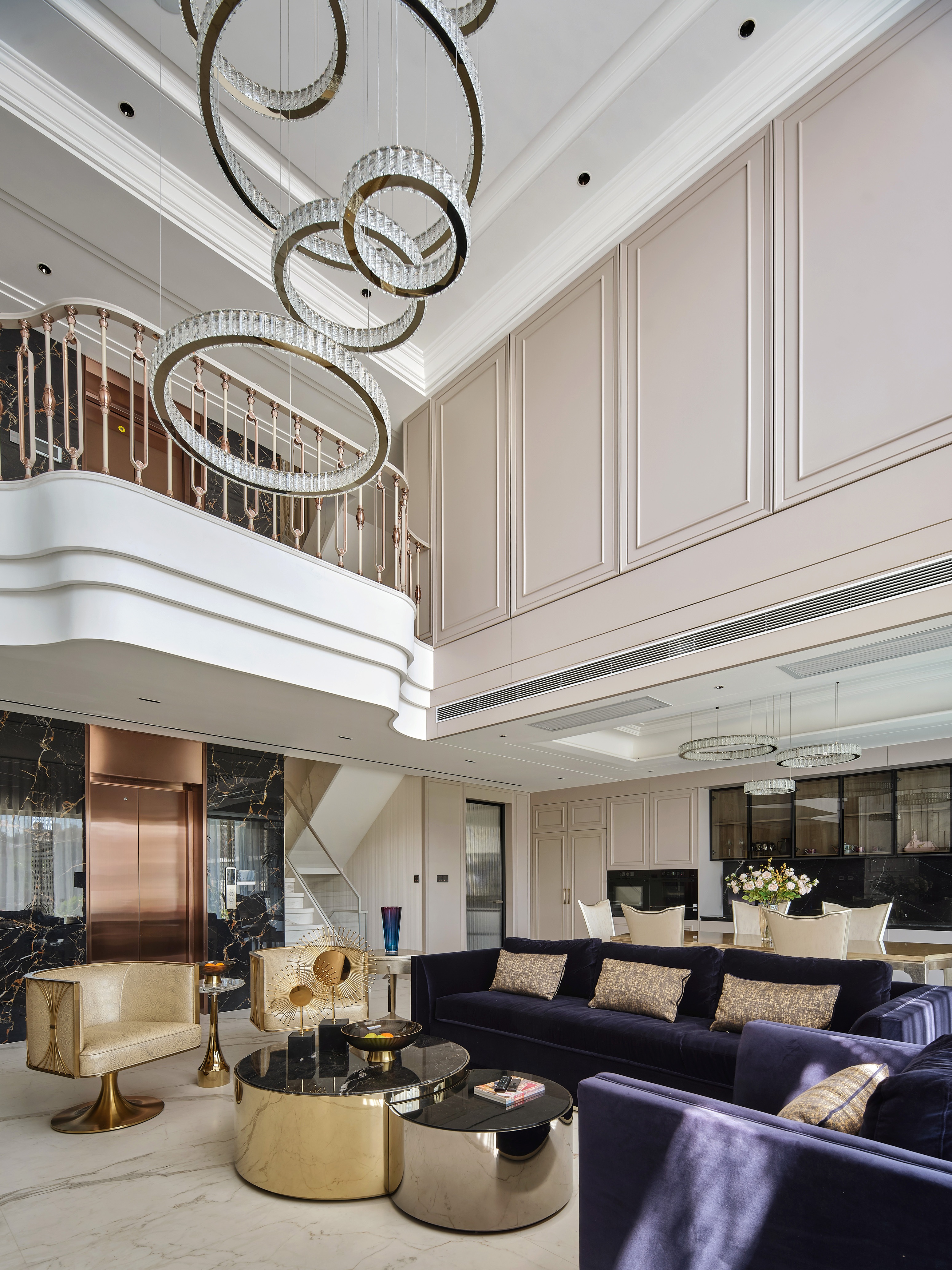 空间布局:采用开放式布局,使空间更加通透。沙发、餐桌等家具,营造出舒适的休闲氛围。一层的挑空结构同二层的公共区域提供了更多的交流空间,华丽的同时不失去温馨。地下空间,完美了利用了天井的采光区域,打造出华丽轻松的休闲娱乐区。