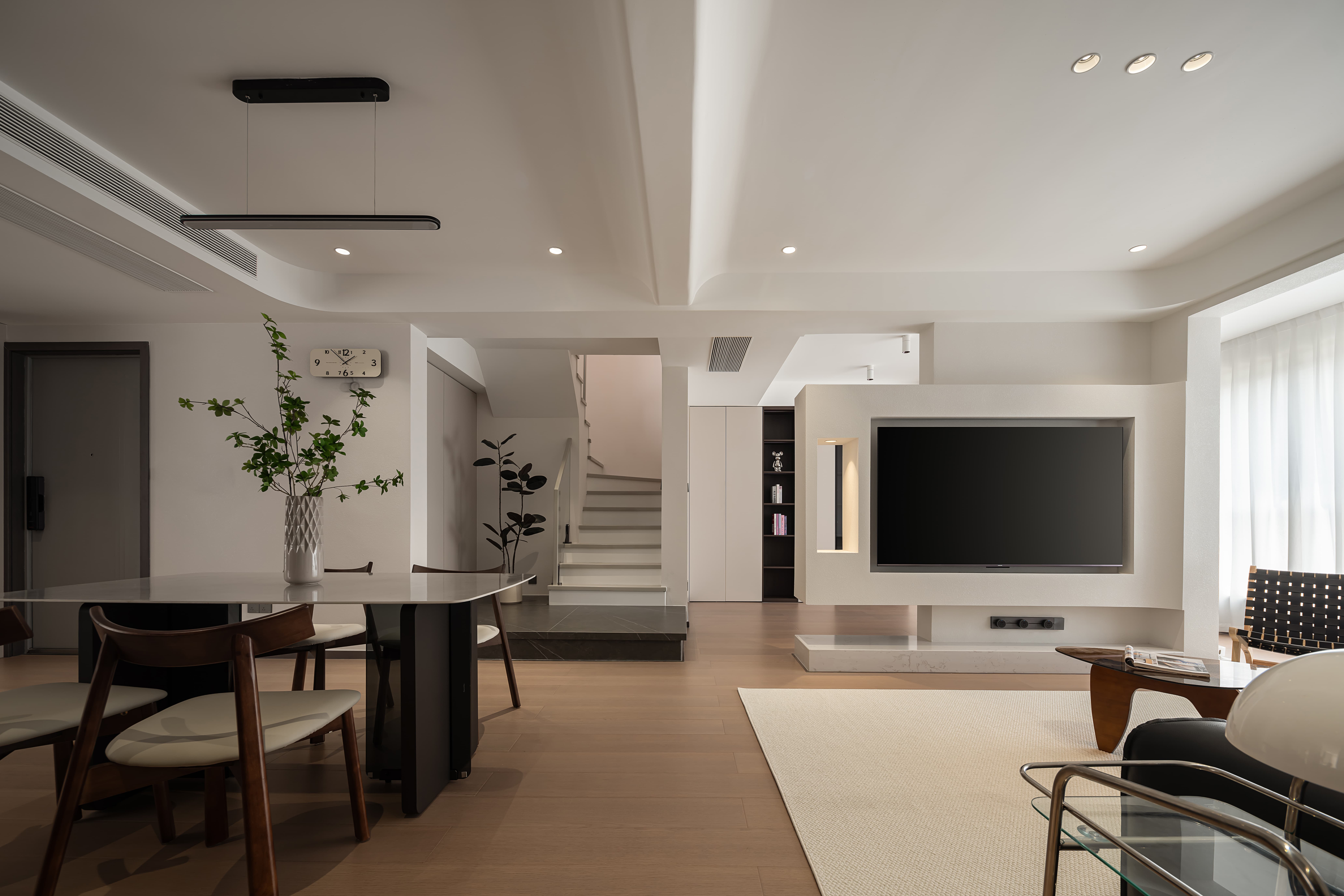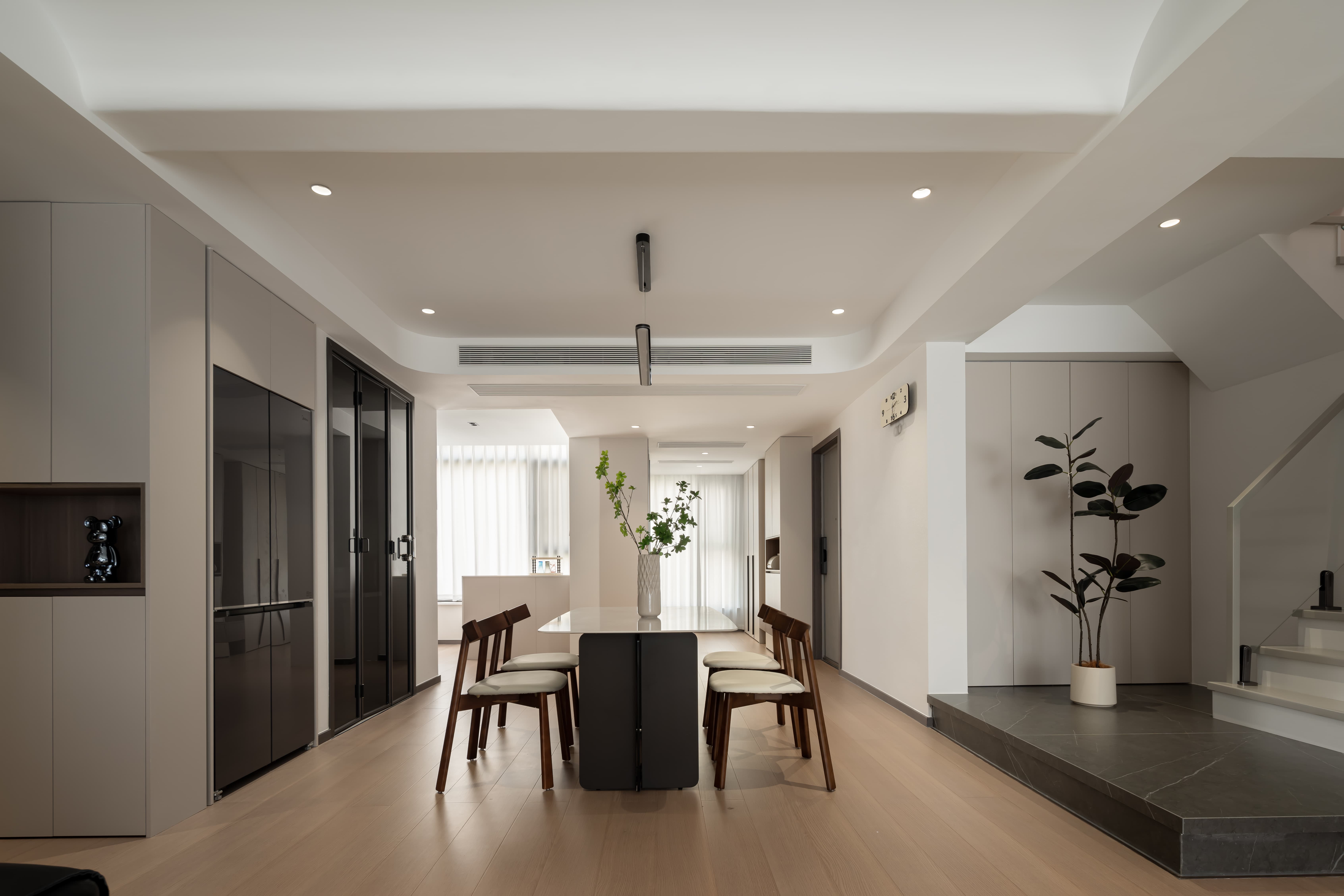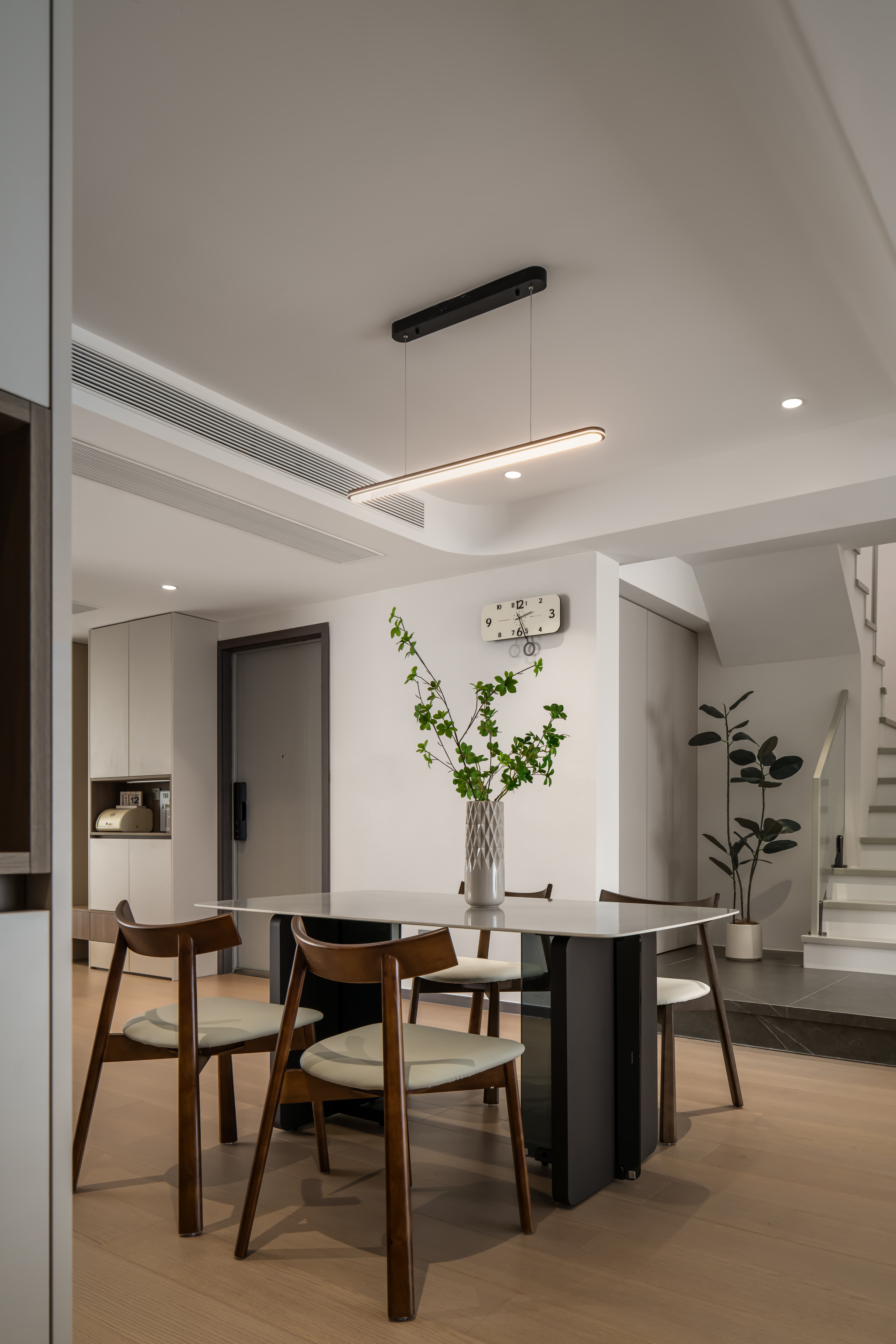 在空间规划上,设计师精心梳理动线,更多的是将公共空间尽可能的进行开放和拓宽,确保书房、客厅与餐厨区域彼此相通,形成高开放度的公共区域。在这里,空间的界限变得模糊,各个区域相互交融,共同构成一个温馨而和谐的生活场景。