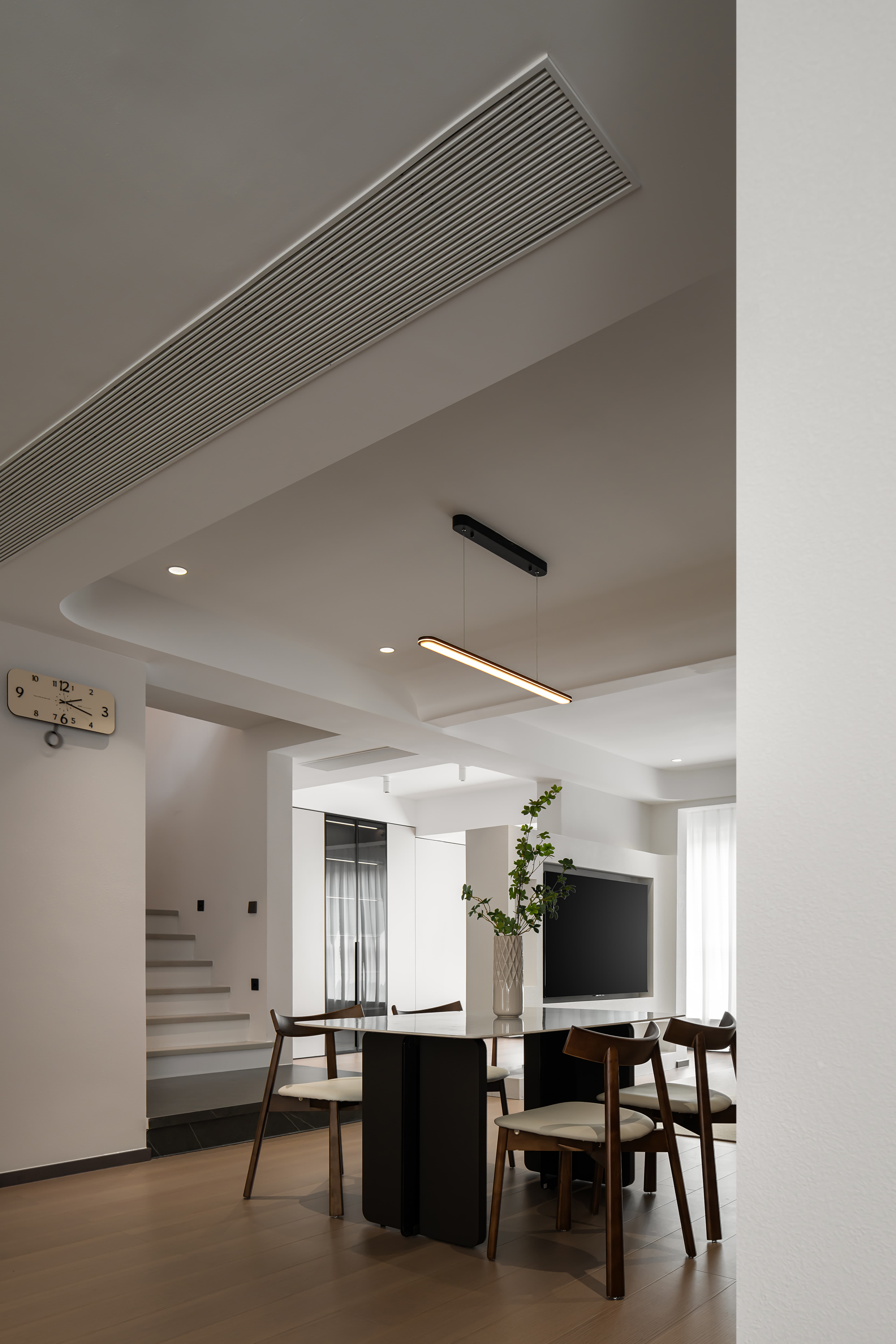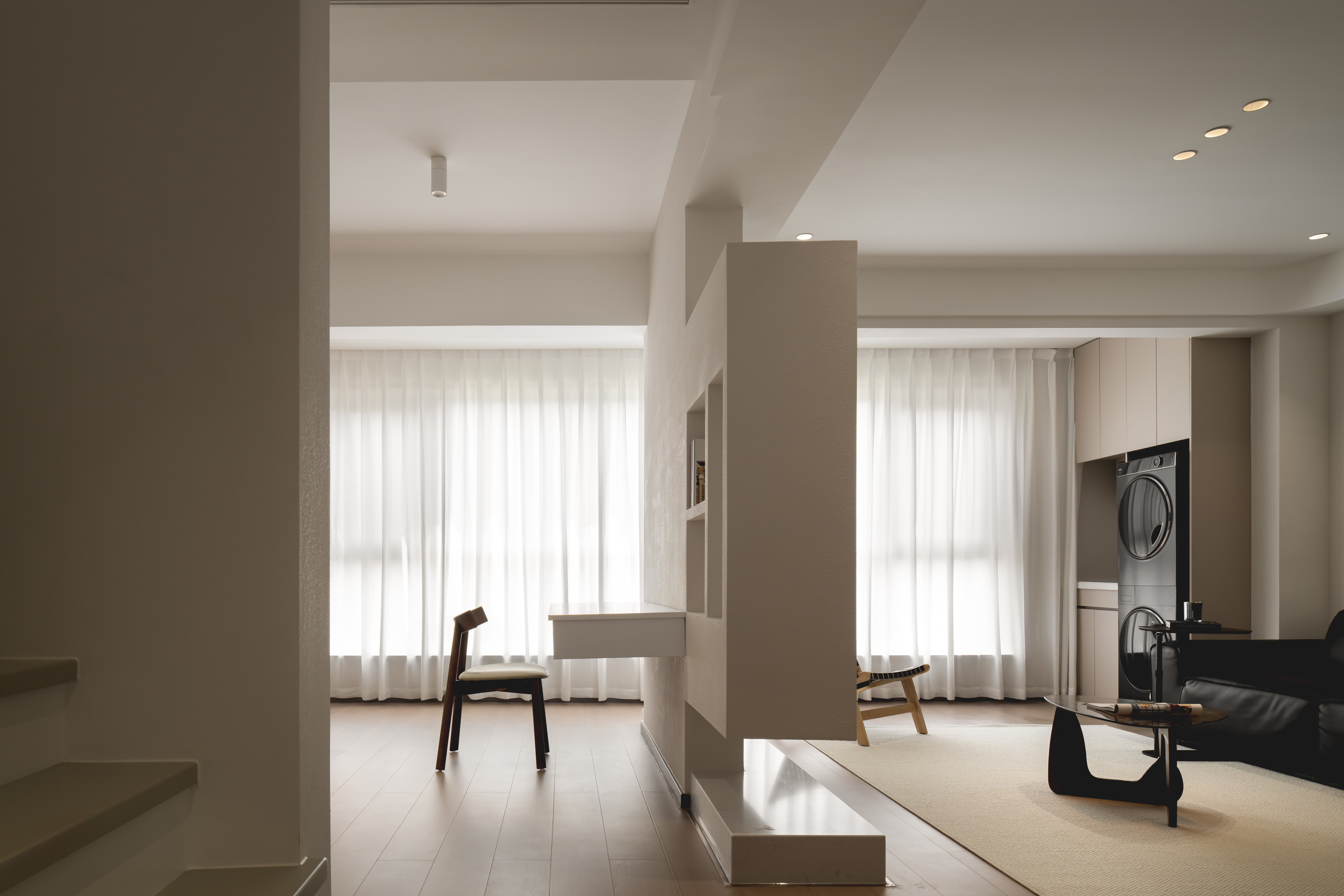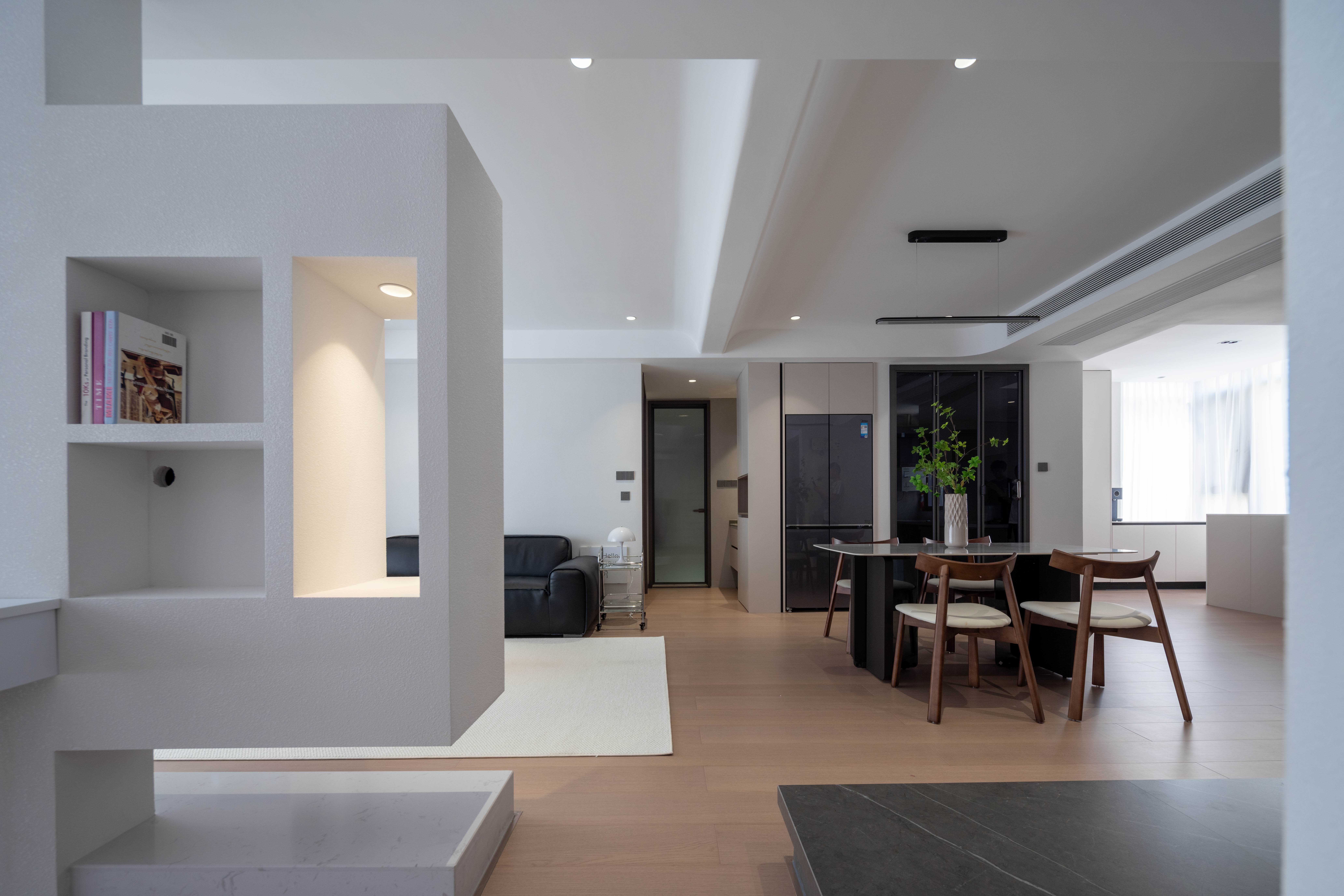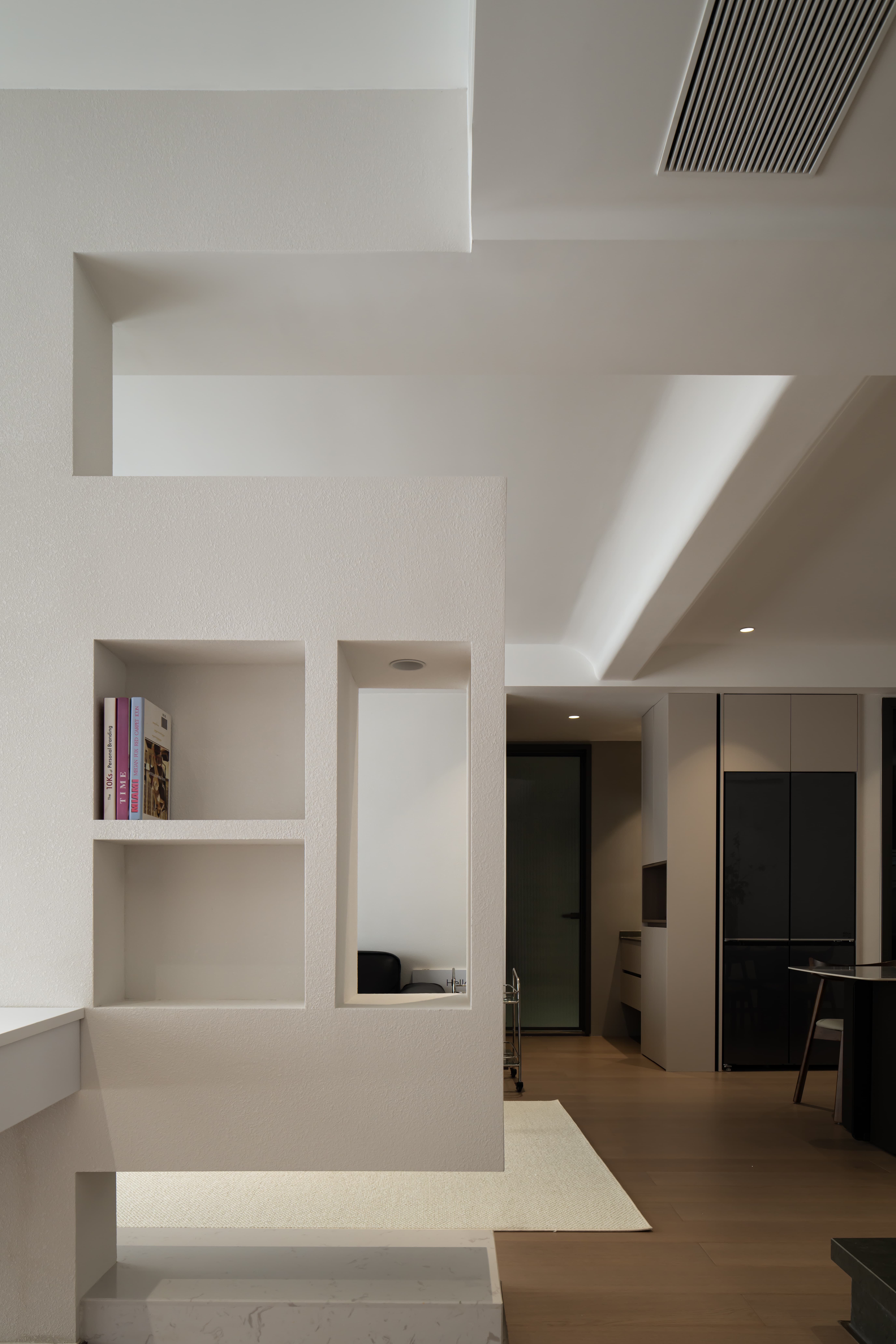 整个空间去繁从简,保留大量的空白,巧妙运用几何图形和线条去构建整个画面。设计后整个空间看似简约随性,却每一寸空间都凝聚着设计师的心血,不仅巧妙地保留了空间的通透与开阔,同时又融入了人性化的设计理念,使得每一处细节都显得那么贴心而富有创意。