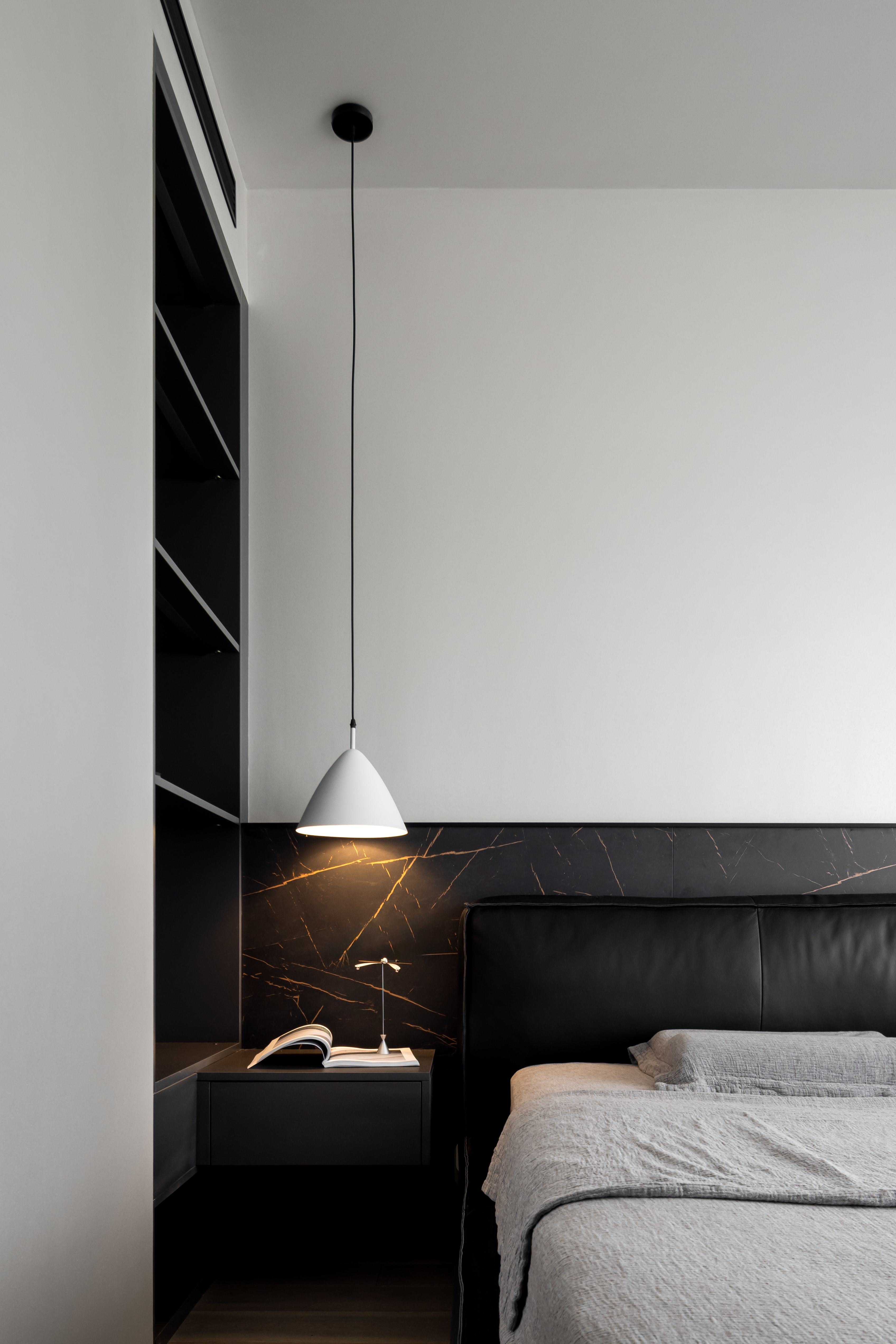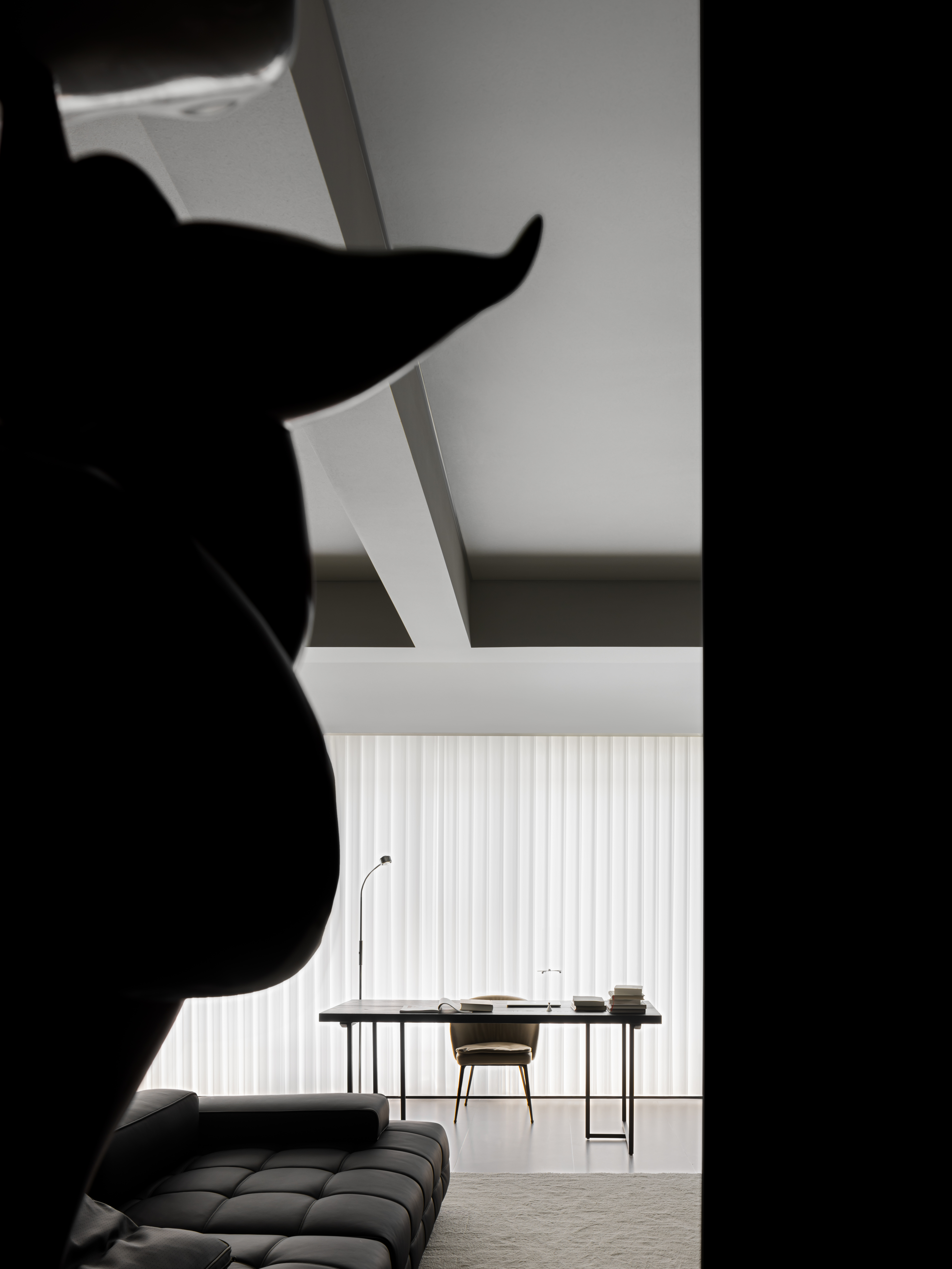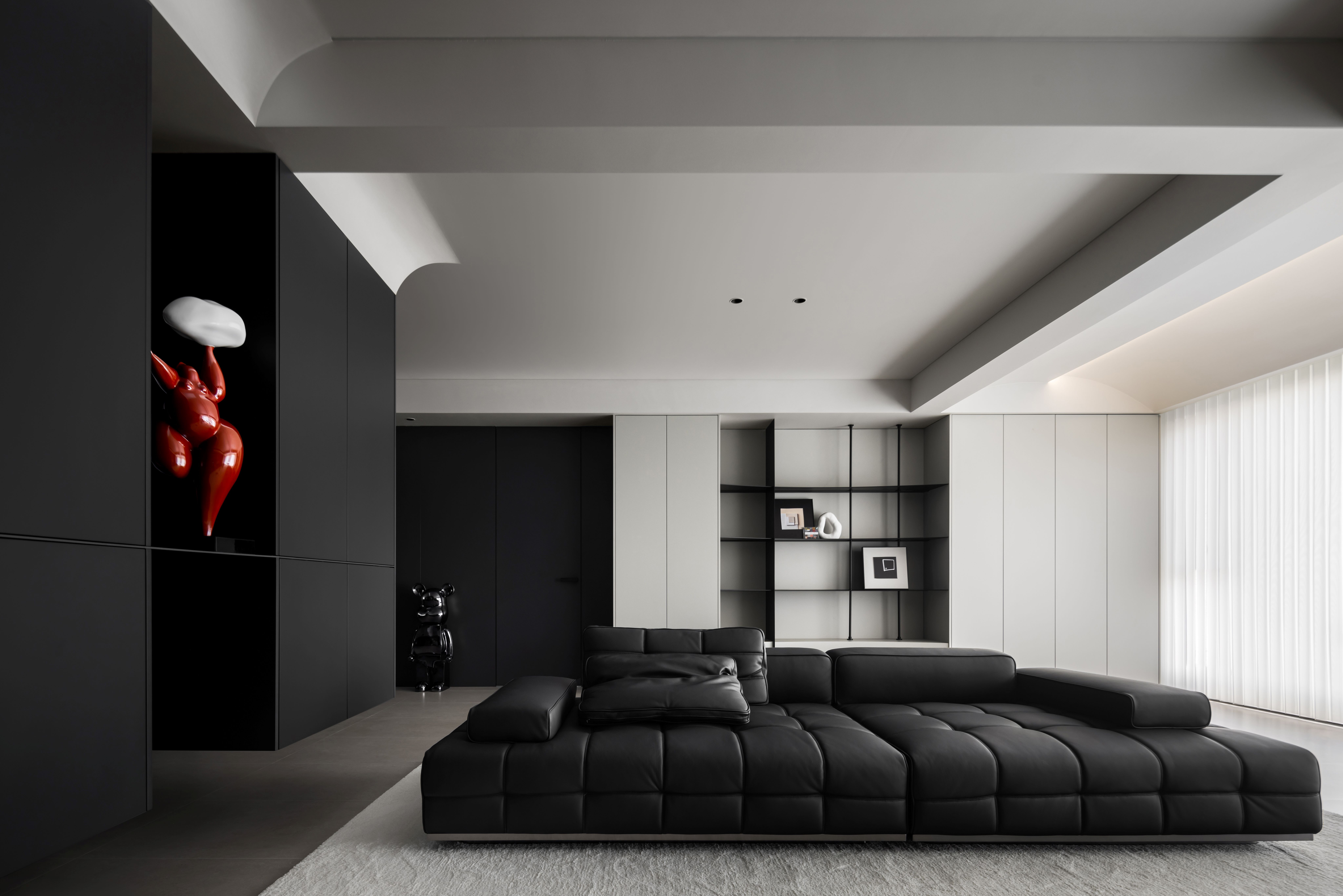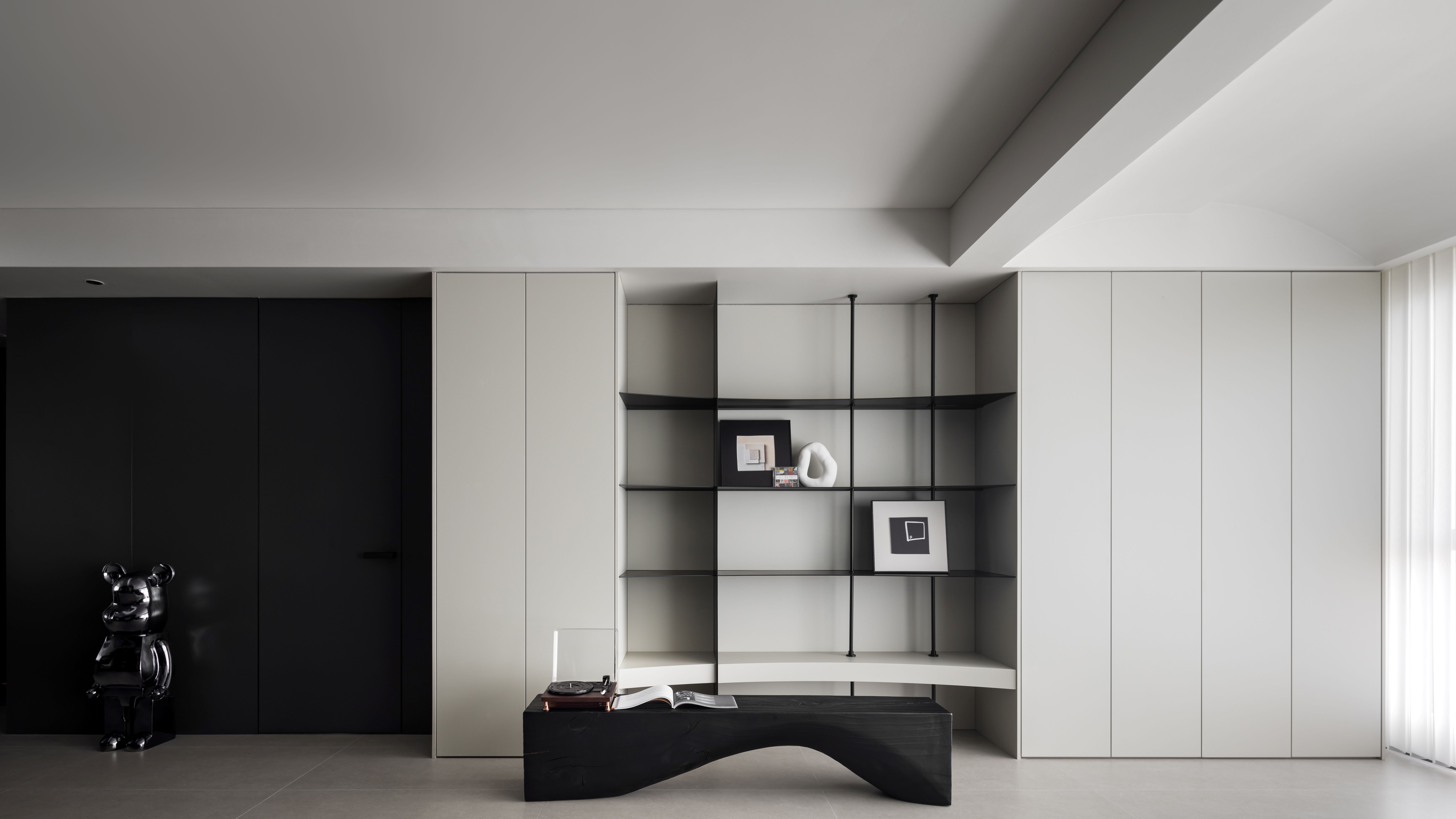 空间意境:主要以黑白灰来表现。自然随性的松弛感为开放的会客厅提供了多种生活场景整个客厅、阳台、书房一体化布局空间完全敞开、不受拘束并且把业主喜爱的元素与家居融为一体,蔓延成屋主独属的个人气质。仪式感是空间的艺术独白"家居之美,在于细节与格调"入户过道,以钢结构置入设计师借由轻盈的悬浮造型掀起入户的第一惊喜,视觉转向玄关端景玄关柜中间做了镂空设计巧妙处理了收纳与对景的关系在艺术摆件的引导下将入户的仪式感做到最佳。全屋极简纯粹、布局通透自由这样简单澄净的家自愈、自洽、自由、自然、自在设计师以空间五感官为居住者带来了细腻的情感体验。