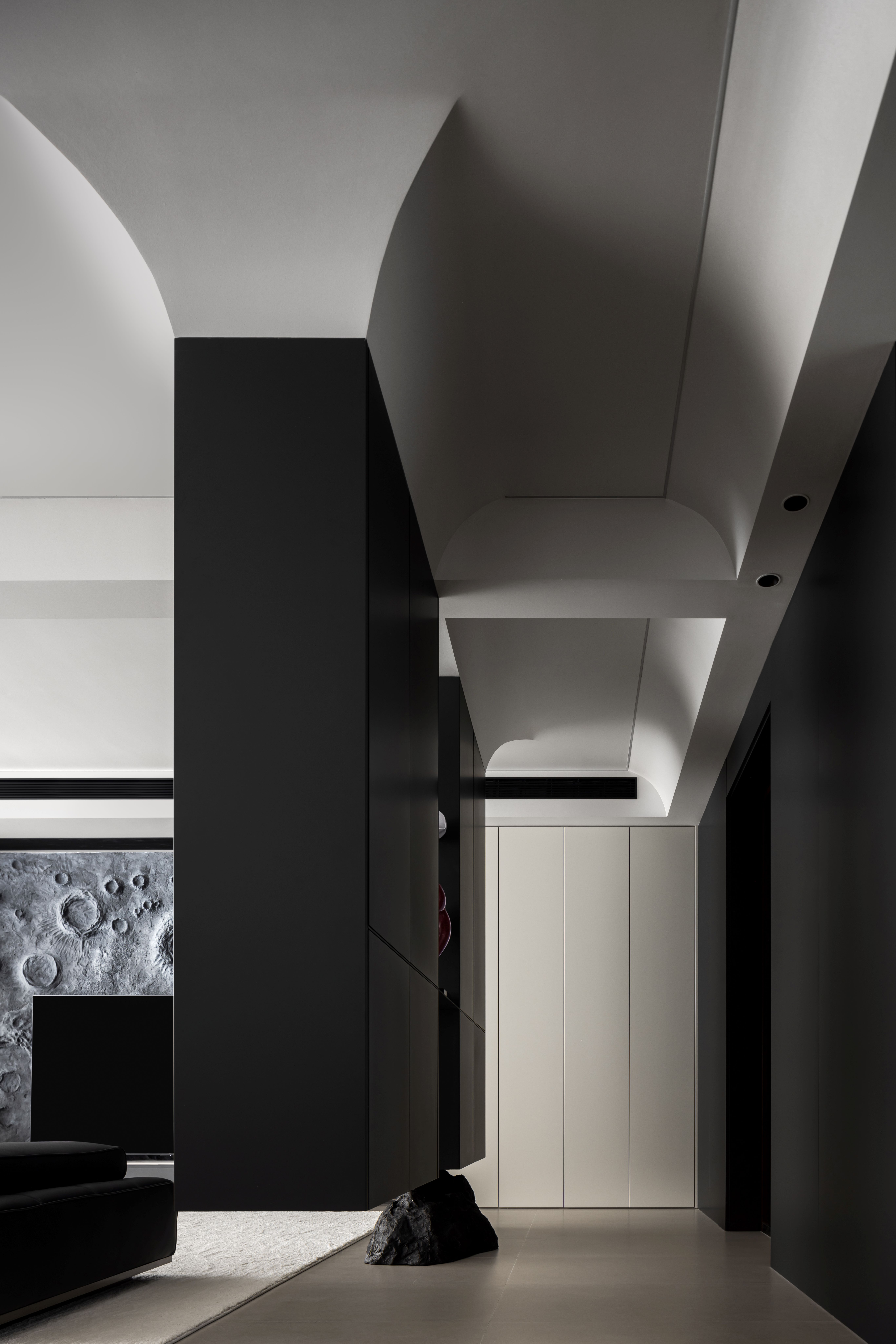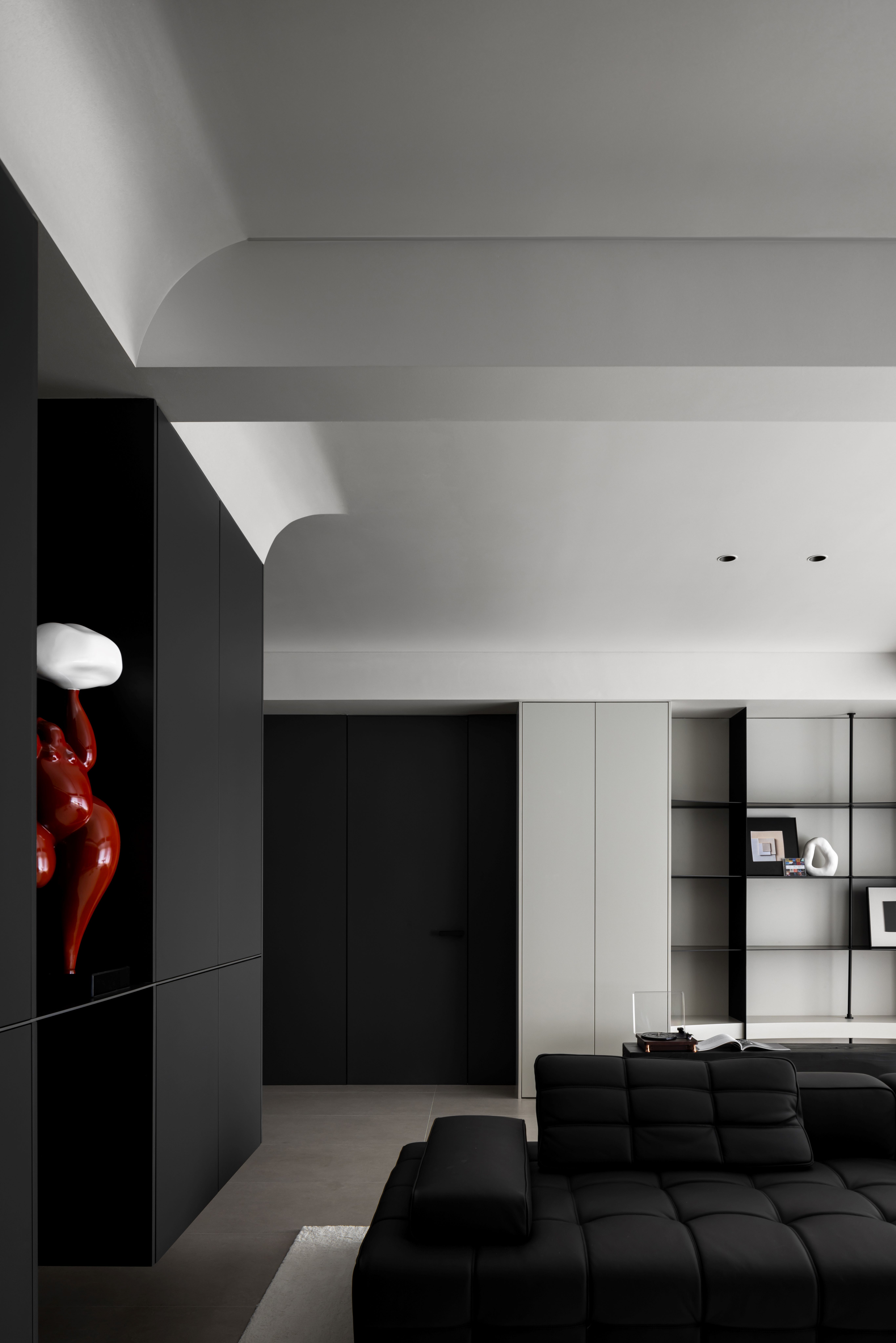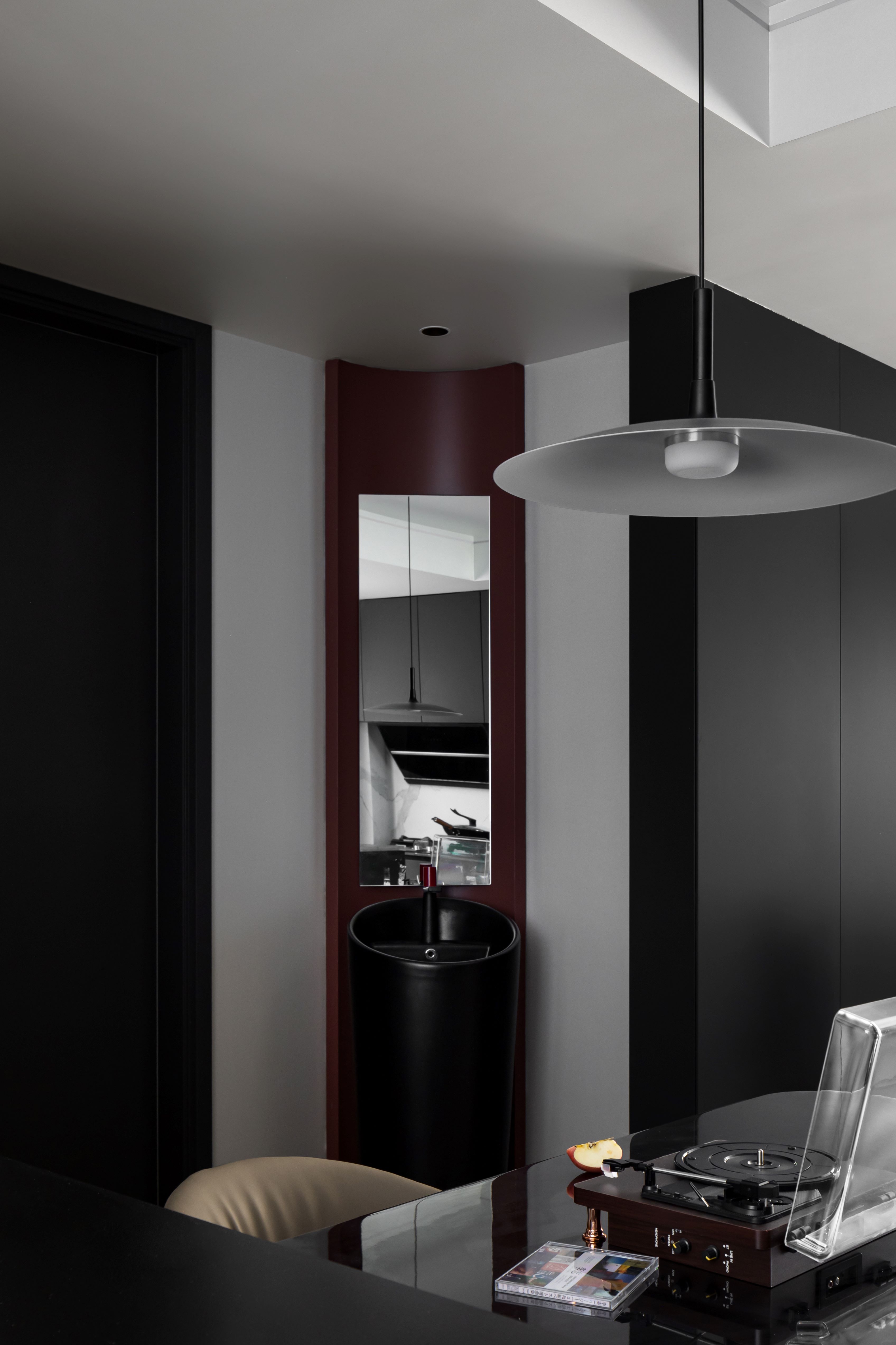 空间布局:开放的会客厅提供了空间更多的可能性,我们需要室内空间的艺术性和建筑性去强化我们的自我认知.通过定制化的设计去讲述传递和放映属于居住者们自身的故事,我们要提供令人愉悦的空间形态围,去给予住宅延展的可能性,通过空间状态的呈现变化,让住宅真正成为记录居住者画像的真实场所。空间动线-玄关通过暗藏系统柜体-揭示了不同空间的动线关系,因此避免了传统的走廊,每个房间适于居住,玄关-过道钢结构置入,给摆件和收藏安个艺术质感的家。客卫借用相邻空间将台盆外移至墙角调整为干湿分离,圆柱型台盆精致小巧配合凹面的深红色背景成为空间中独具特色的一抹装饰。