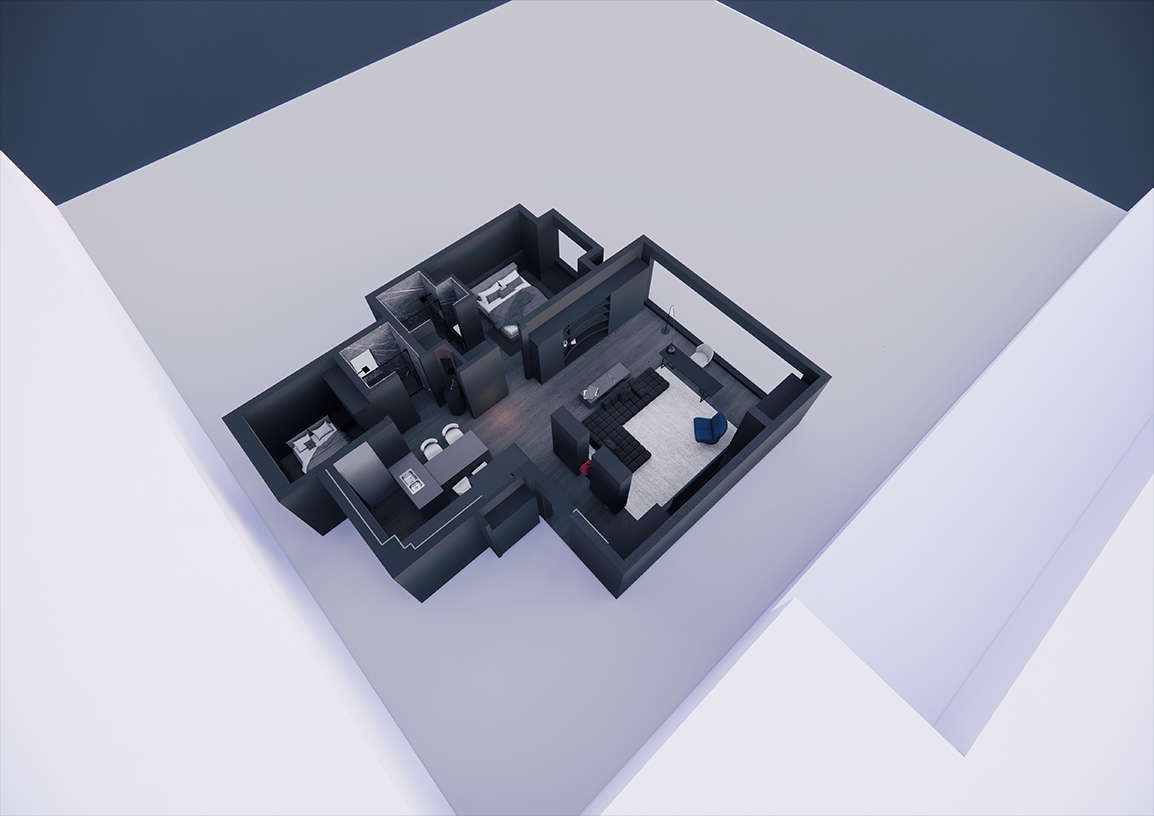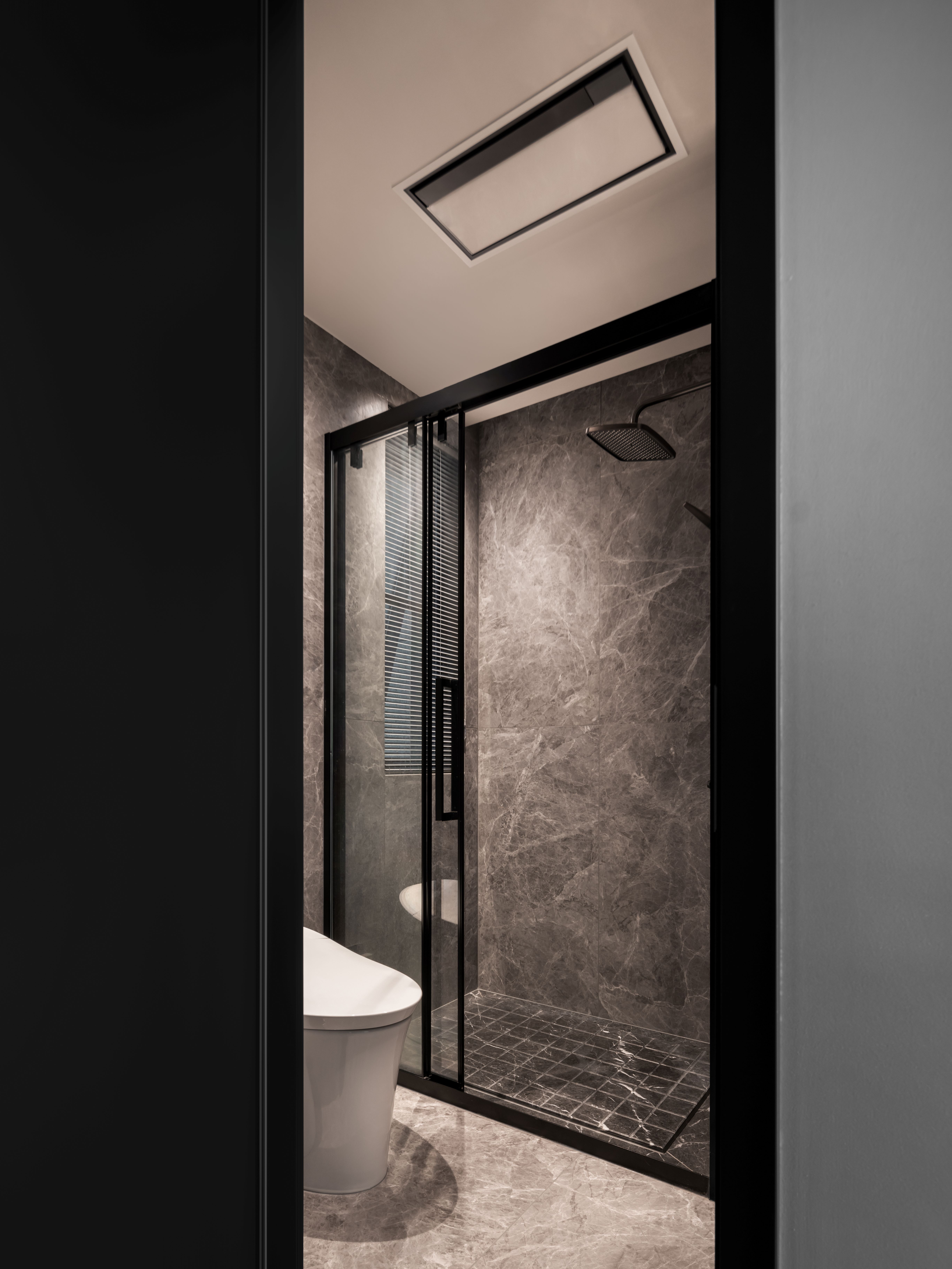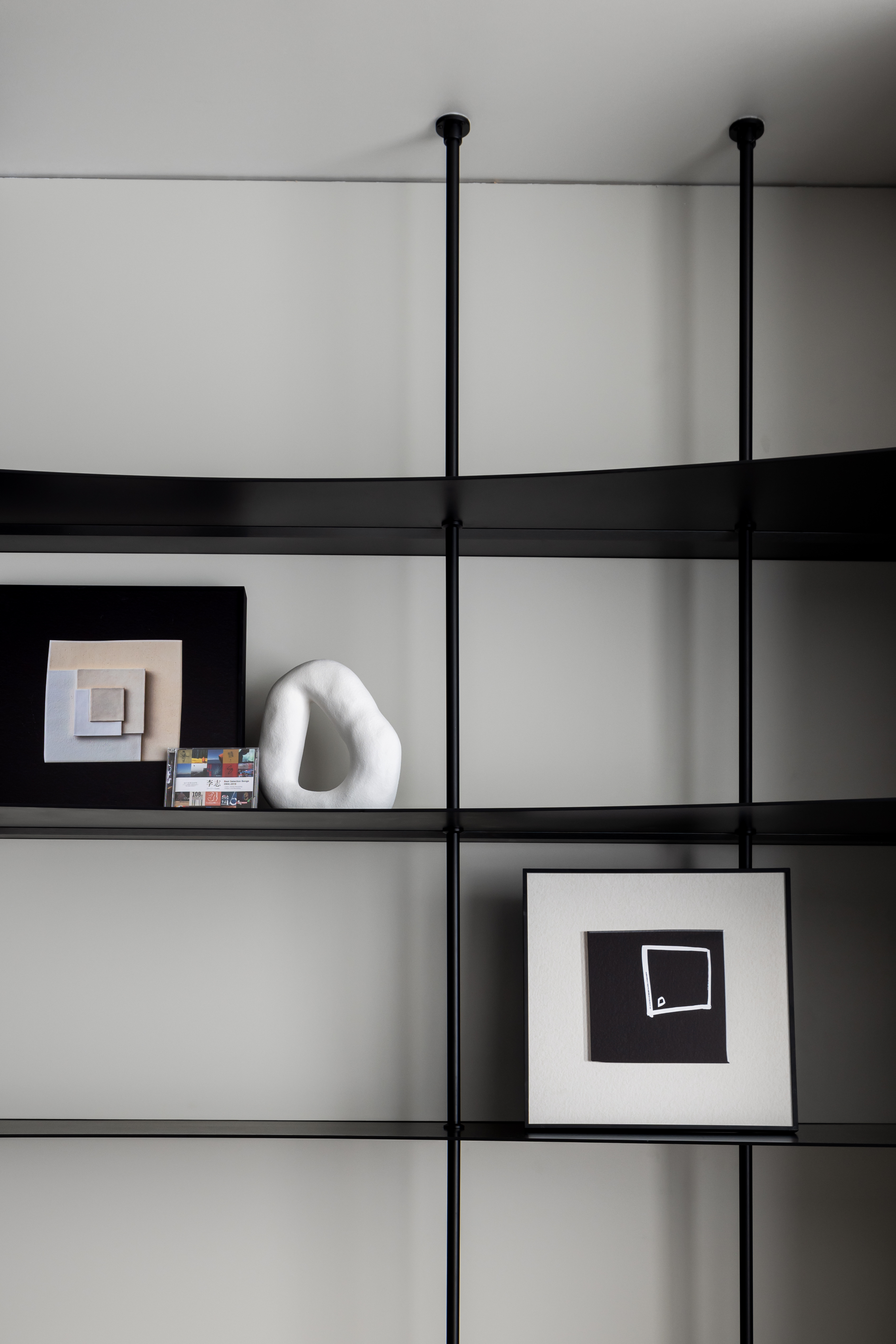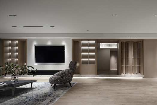 空间布局:开放的会客厅提供了空间更多的可能性,我们需要室内空间的艺术性和建筑性去强化我们的自我认知.通过定制化的设计去讲述传递和放映属于居住者们自身的故事,我们要提供令人愉悦的空间形态围,去给予住宅延展的可能性,通过空间状态的呈现变化,让住宅真正成为记录居住者画像的真实场所。空间动线-玄关通过暗藏系统柜体-揭示了不同空间的动线关系,因此避免了传统的走廊,每个房间适于居住,玄关-过道钢结构置入,给摆件和收藏安个艺术质感的家。客卫借用相邻空间将台盆外移至墙角调整为干湿分离,圆柱型台盆精致小巧配合凹面的深红色背景成为空间中独具特色的一抹装饰。