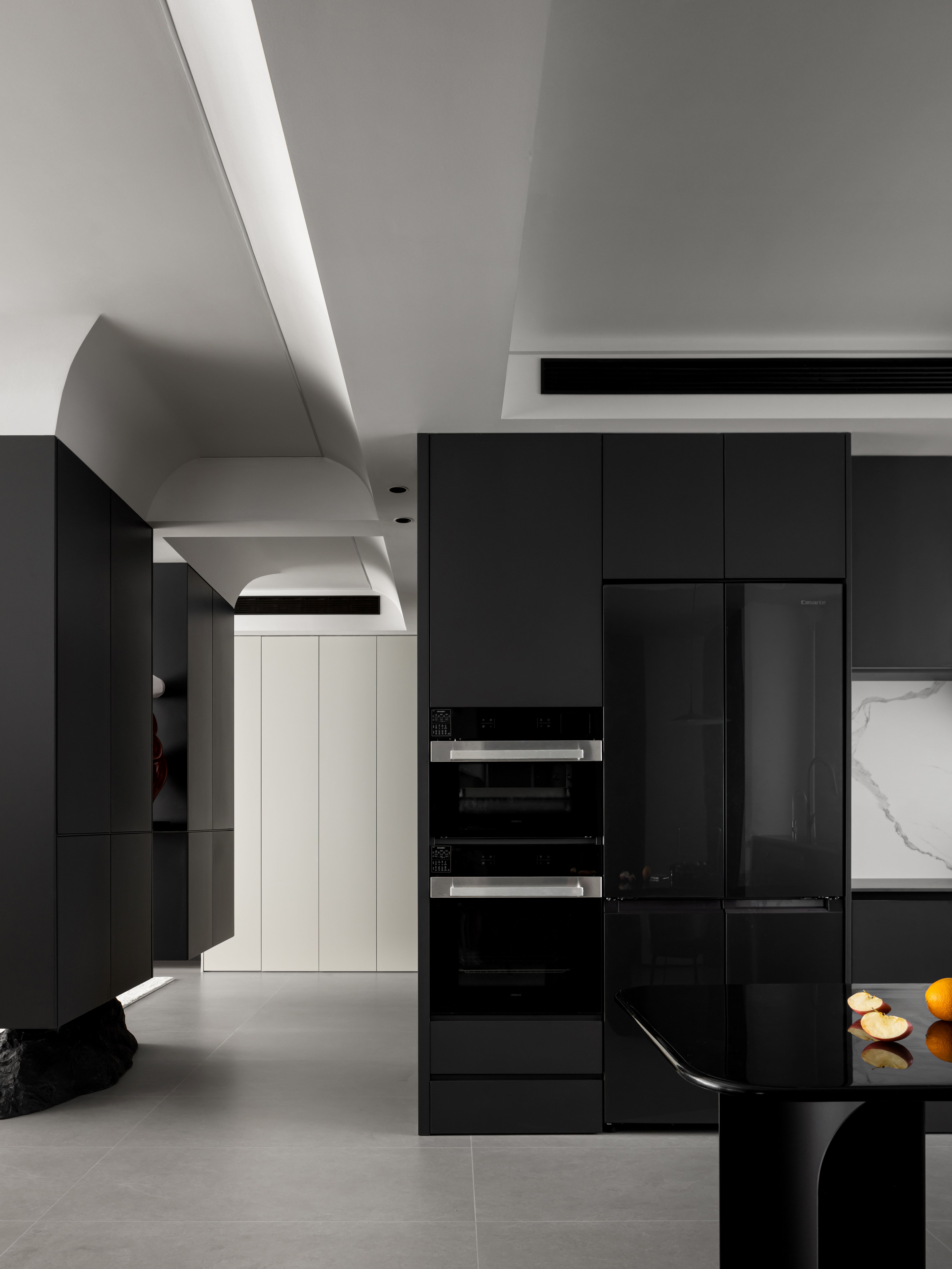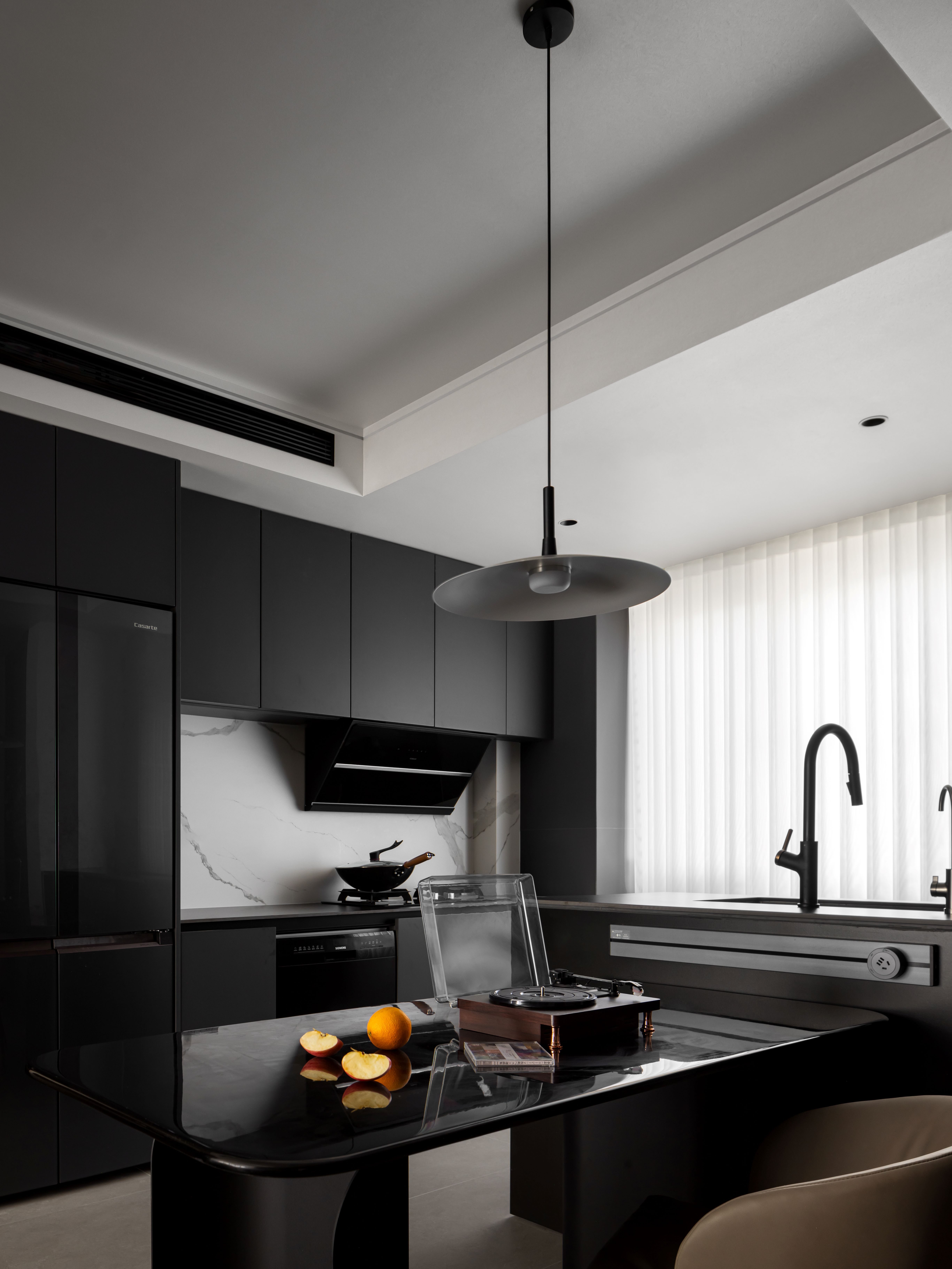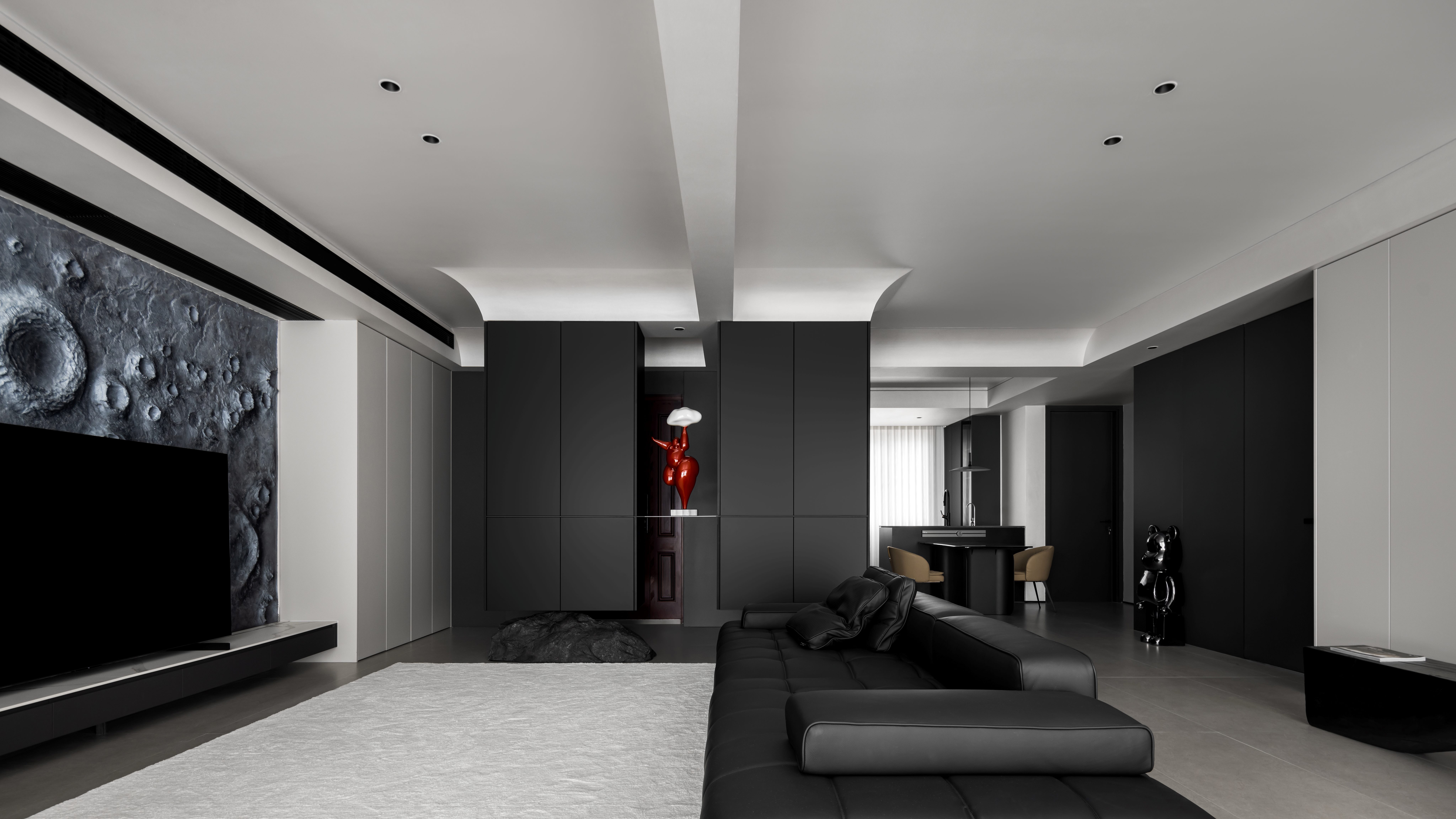 设计选材:电视背景选用了仿真度很高的pu石材做装饰表面逼真的岩石肌理将自然的狂野、粗狂带入了室内空间极富自然之美。餐厅遵循同色彩语言大面积覆盖深色墙板厨房为了配合电器质感选用深灰色门板延续空间艺术白色岩板置入中间又为空间保留了一份克制。项目主材|PU石、艺术漆、木饰面、混油柜体...遵循同样的色彩语言,覆盖深色的墙板,延续了面向光明和黑暗的理念.深色的餐桌犹如置身艺术馆,.厨房为了配合电器的质感,选用深色岩板深灰色质感的门板,深灰色带来科技感和未来感,吊柜与地柜的白色岩板也是将浅色置入深色之中.与大空间不违和。