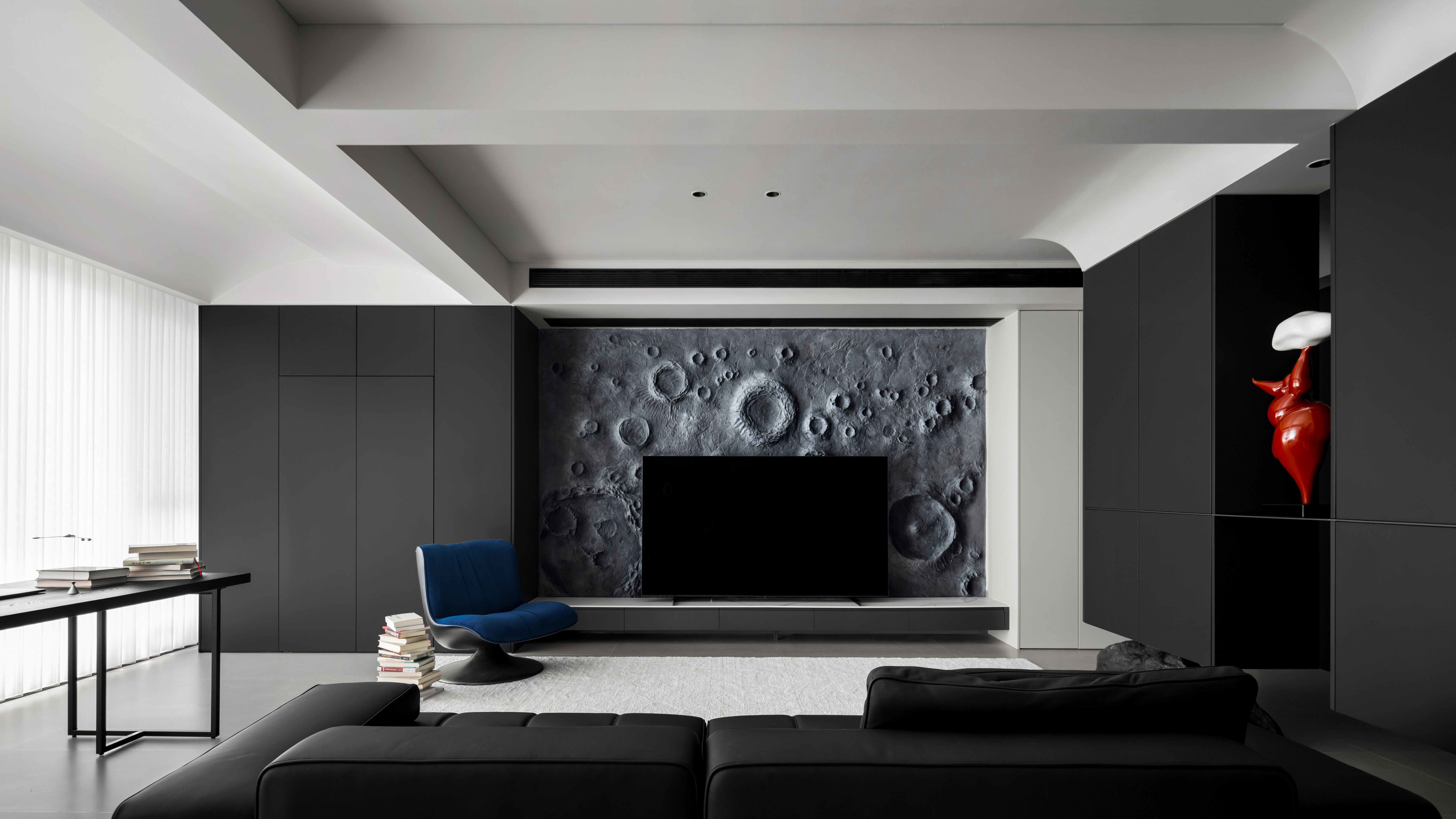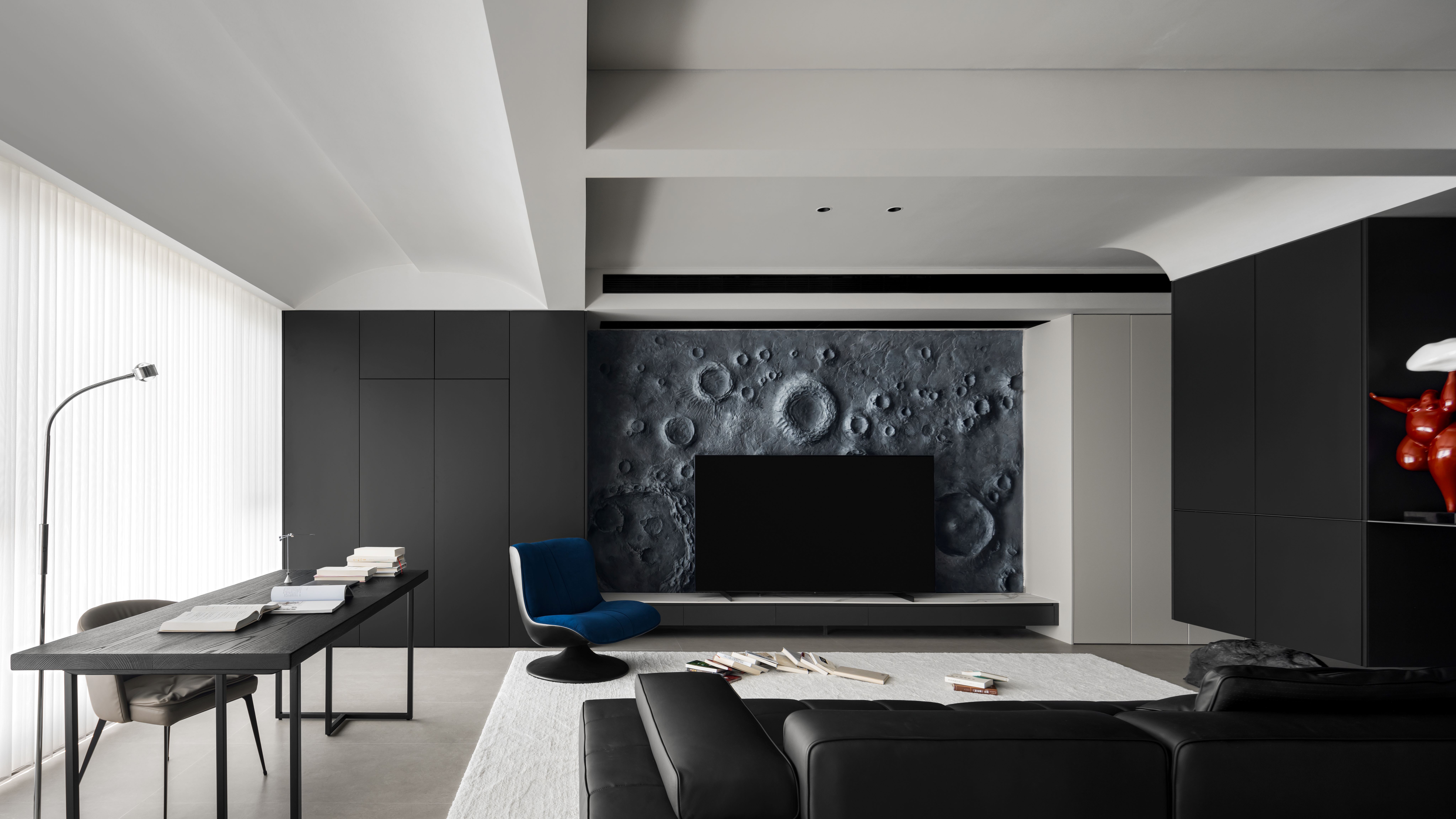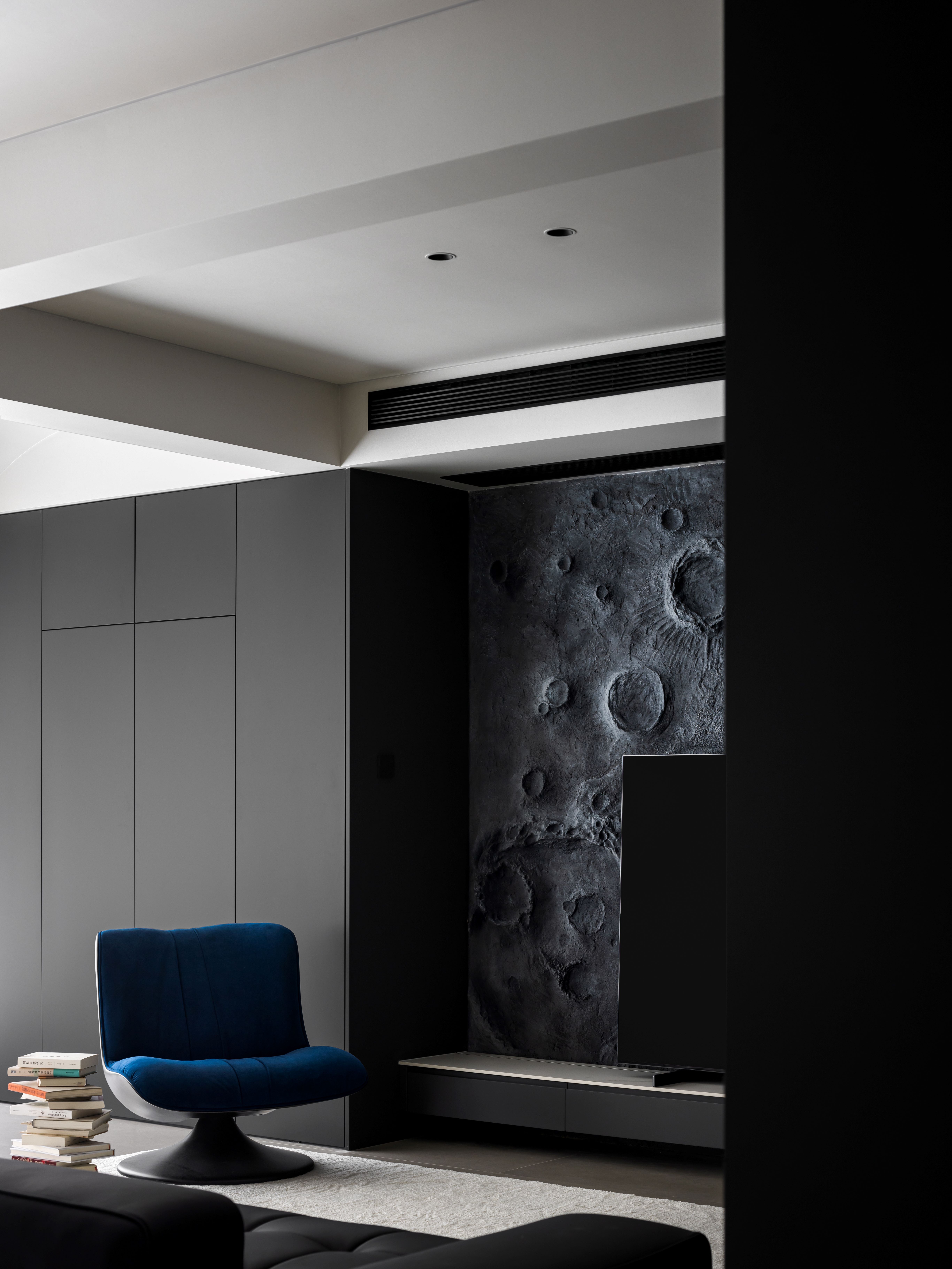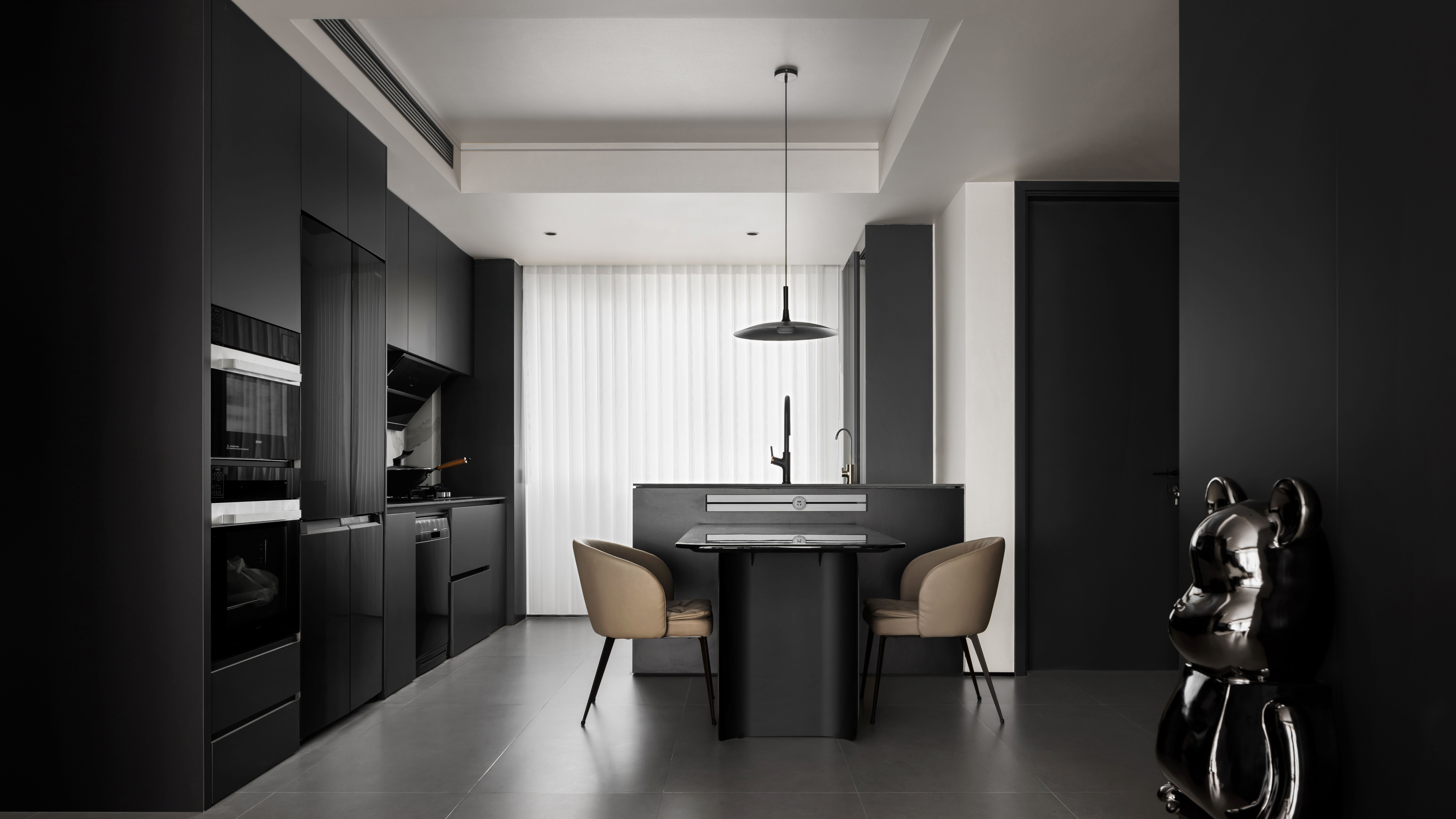 设计选材:电视背景选用了仿真度很高的pu石材做装饰表面逼真的岩石肌理将自然的狂野、粗狂带入了室内空间极富自然之美。餐厅遵循同色彩语言大面积覆盖深色墙板厨房为了配合电器质感选用深灰色门板延续空间艺术白色岩板置入中间又为空间保留了一份克制。项目主材|PU石、艺术漆、木饰面、混油柜体...遵循同样的色彩语言,覆盖深色的墙板,延续了面向光明和黑暗的理念.深色的餐桌犹如置身艺术馆,.厨房为了配合电器的质感,选用深色岩板深灰色质感的门板,深灰色带来科技感和未来感,吊柜与地柜的白色岩板也是将浅色置入深色之中.与大空间不违和。