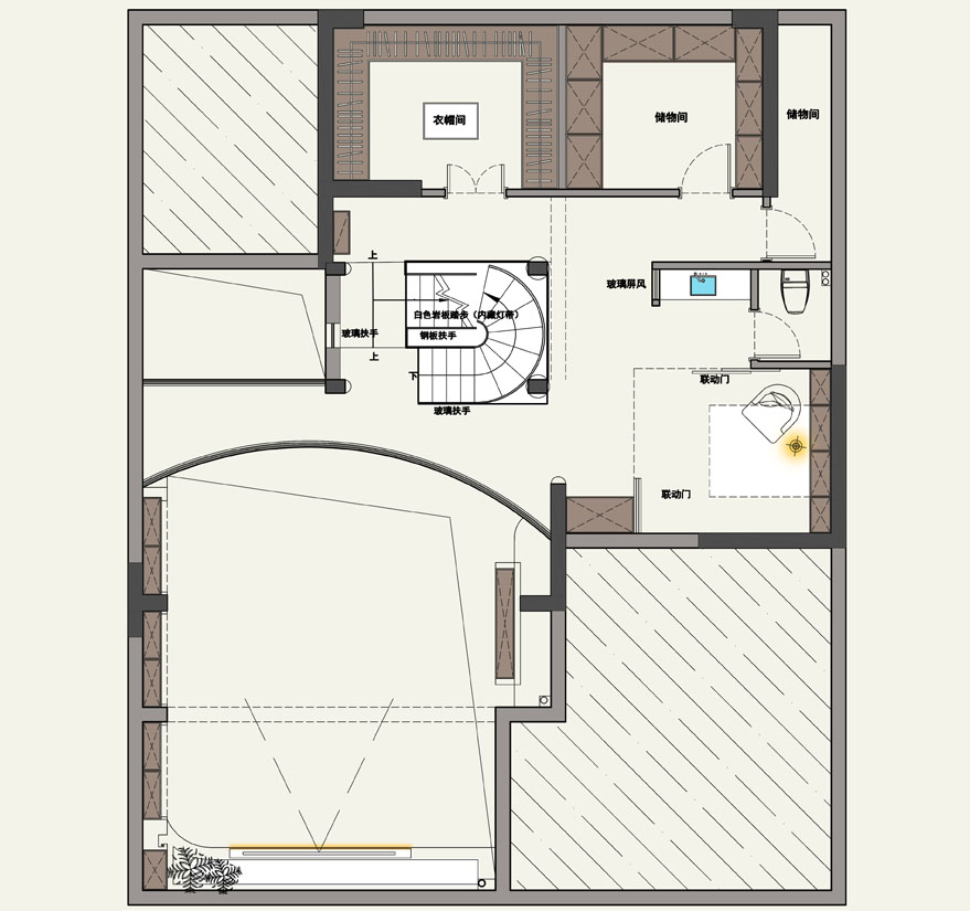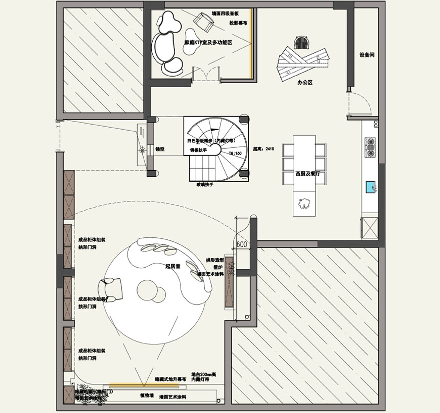 负二楼装修平面图 1.考虑到屋主出行的习惯和小区的环境,打通了小区车库与地下室的进出通道,同时结合屋主的生活习惯将地下室的区域设计成了动静分区,其中负二楼设计成了集休闲、图书馆、西厨、办公、聚会、观影为一体的社交交互区,负二楼打造成了储藏间、衣帽间、多功能间等生活功能区。 2.考虑到地下室的采光,将地下室与天井打通,采用开放式+挑高的布局,尽可能将自然光引入地下室每个区域,实现了建筑空间与阳光的温暖重构。 3.考虑到地下室的空间尺寸和层高,楼梯设计成了旋转楼梯+透明玻璃扶手,从视觉上拉伸了地下室的空间感和颜值。