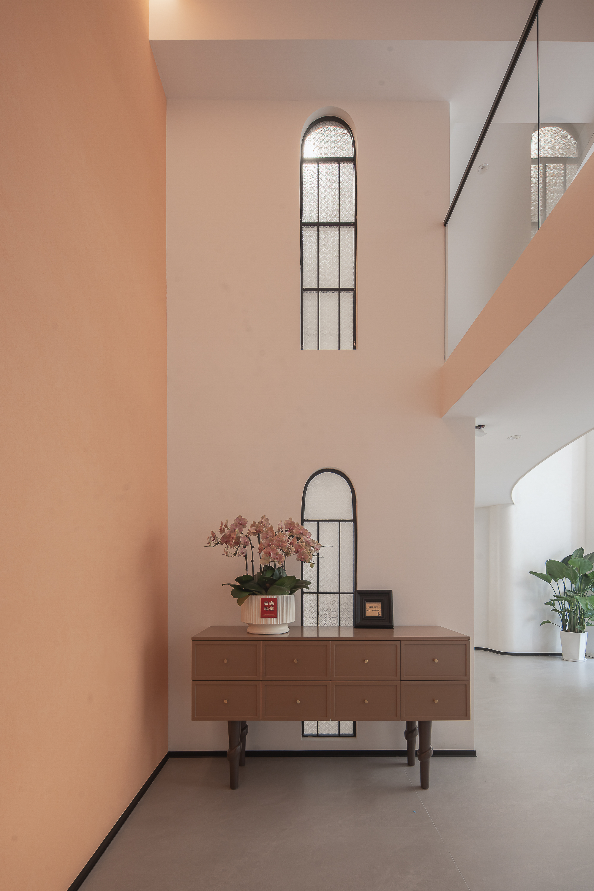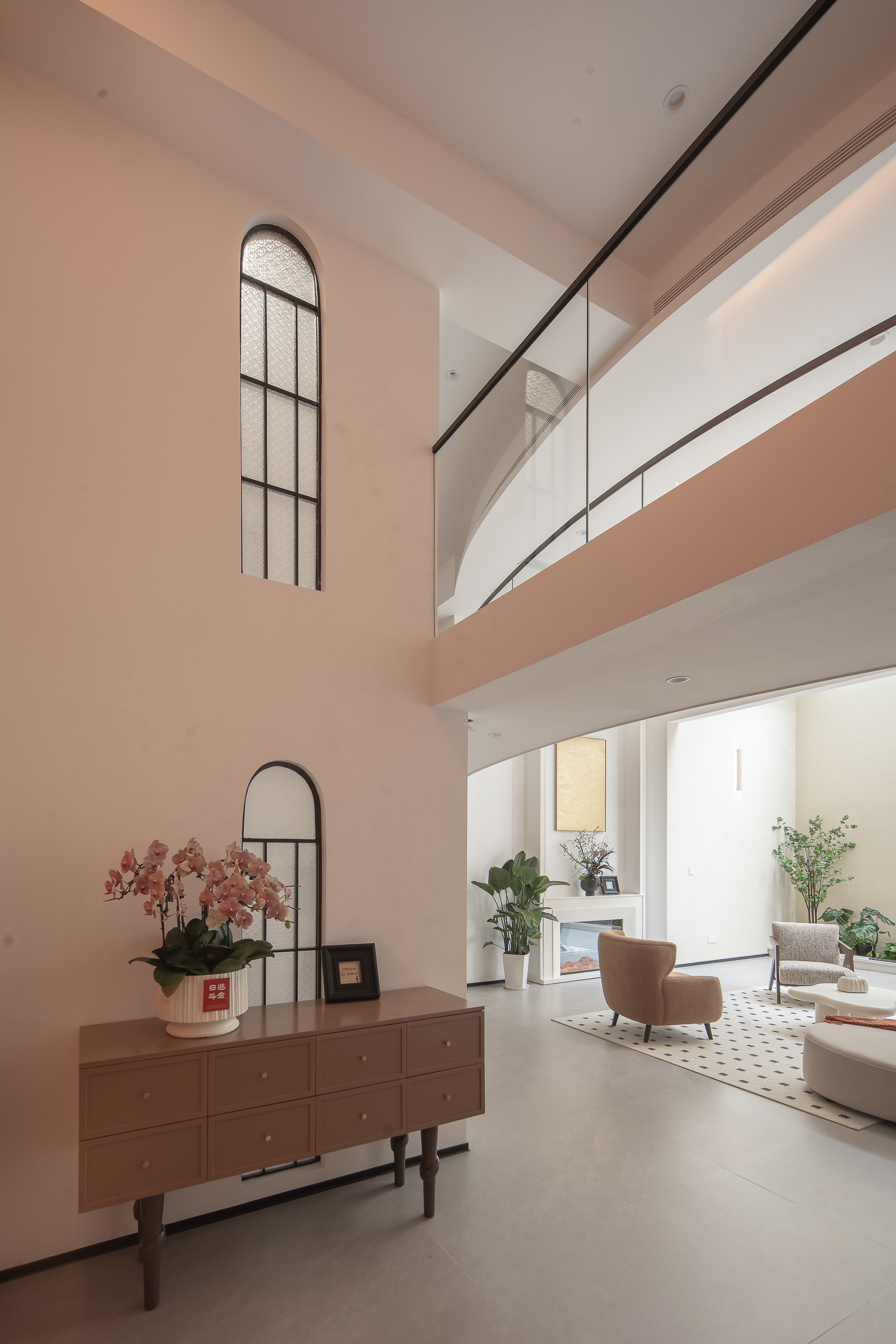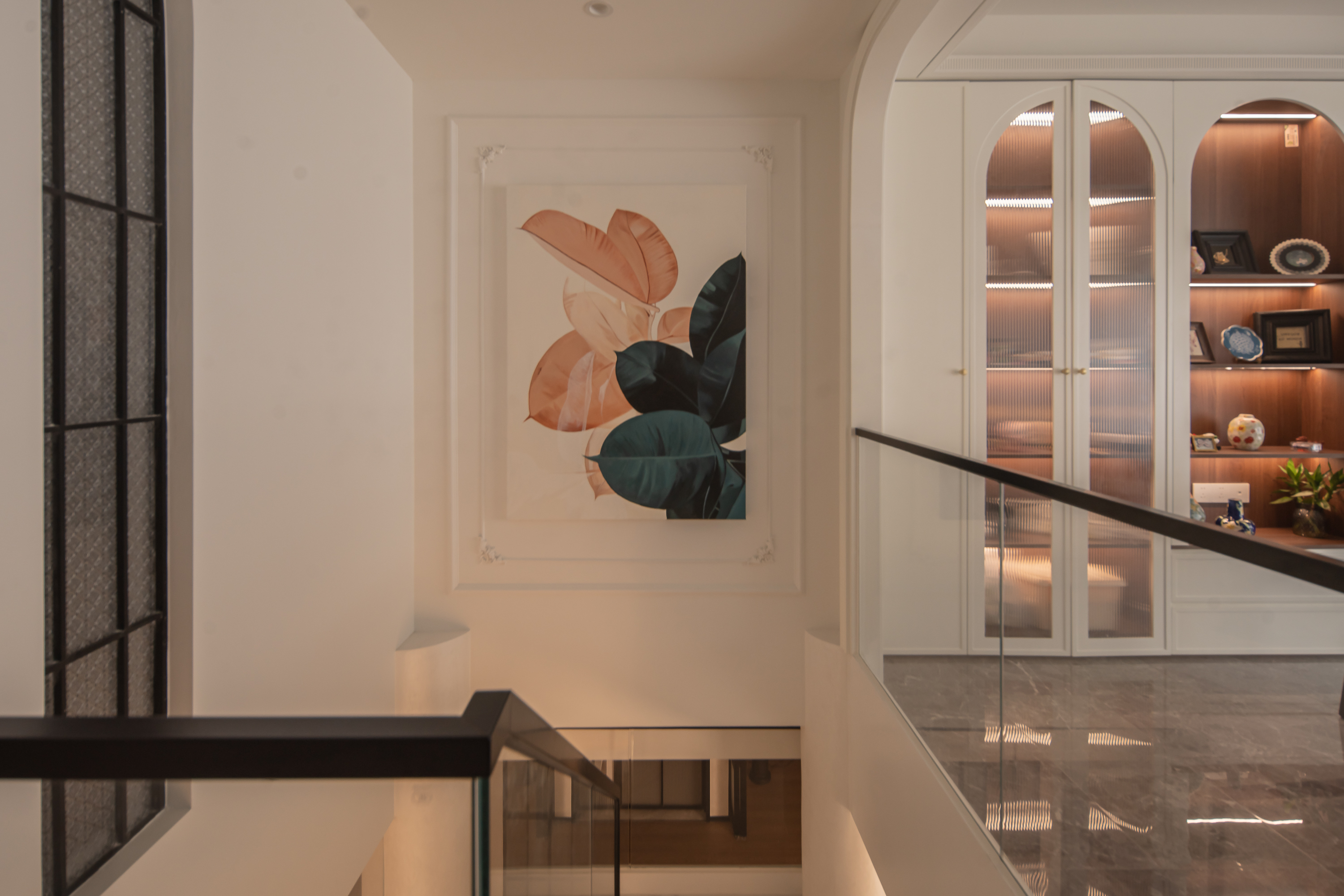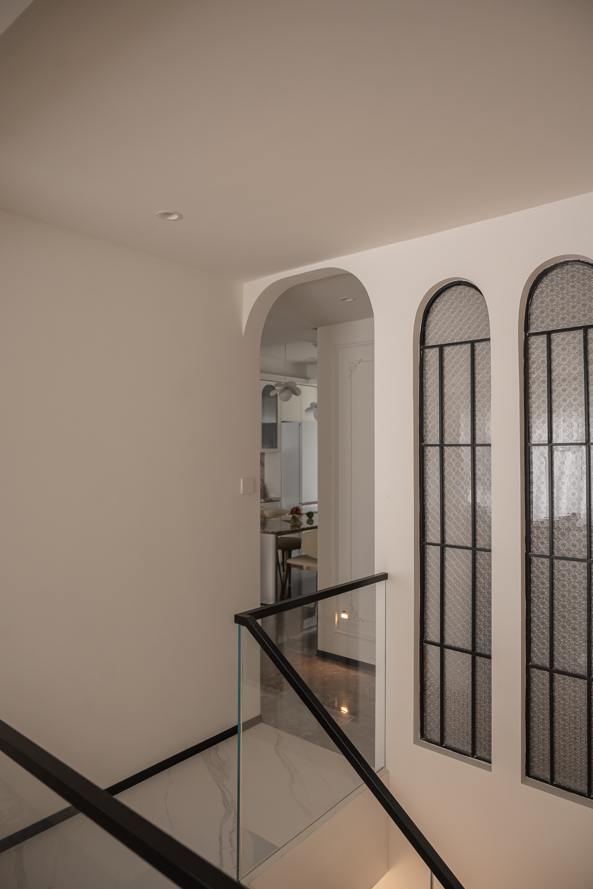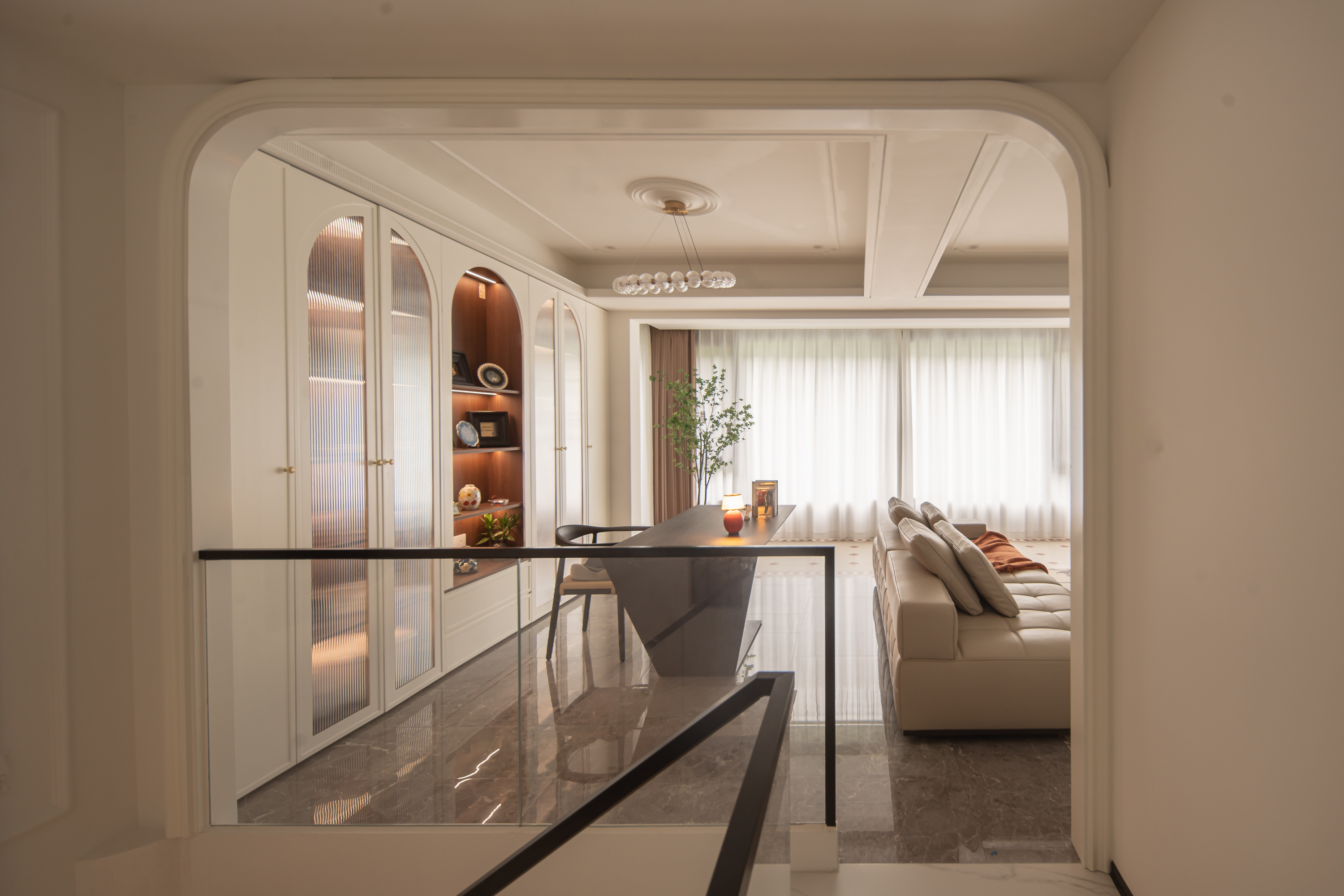 玄关 考虑到屋主出行的习惯和小区的环境,打通小区车库与地下室的进出通道打造出入户玄关。考虑到入户的私密性和采光,玄关区域设计挑高并打造了造型墙隔断。玄关处融合了精致的柜体与优雅的拱形玻璃窗,不仅巧妙地满足了入户收纳的需求,同时提升了楼梯区域的采光。踏入玄关,整个空间弥漫着一种既经典又不失现代感的魅力,生活场景如画卷一般优雅地铺陈开来。