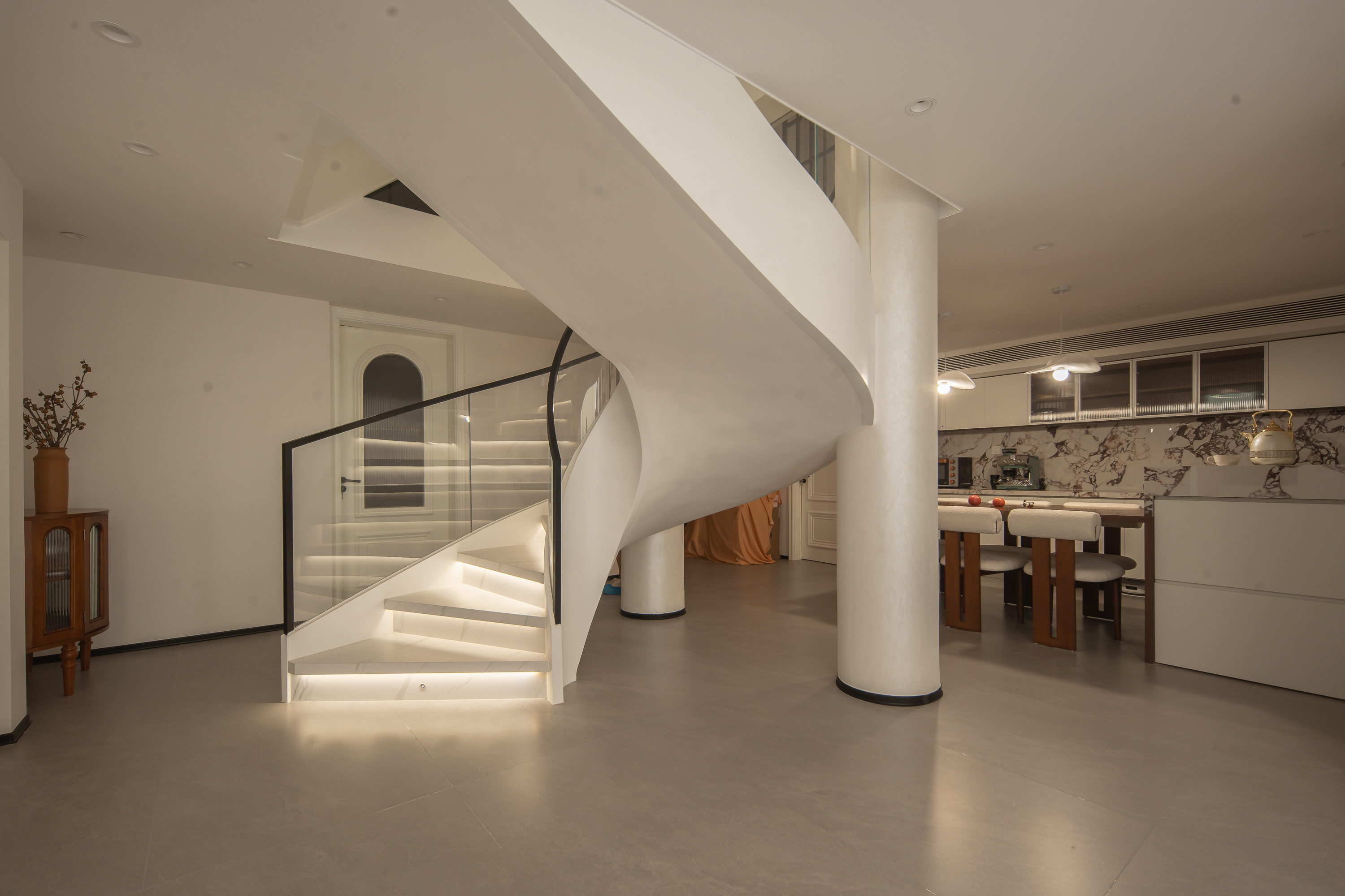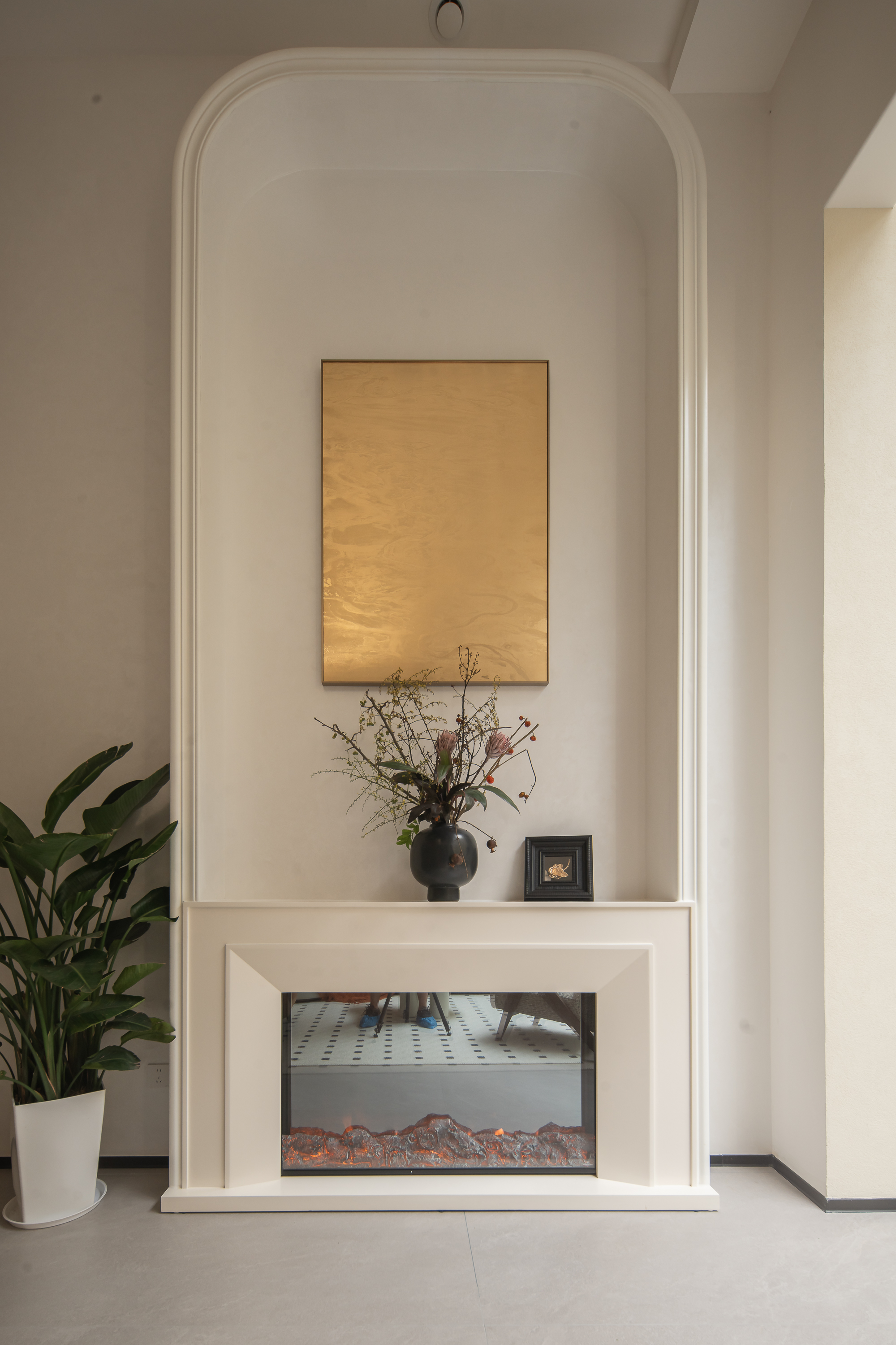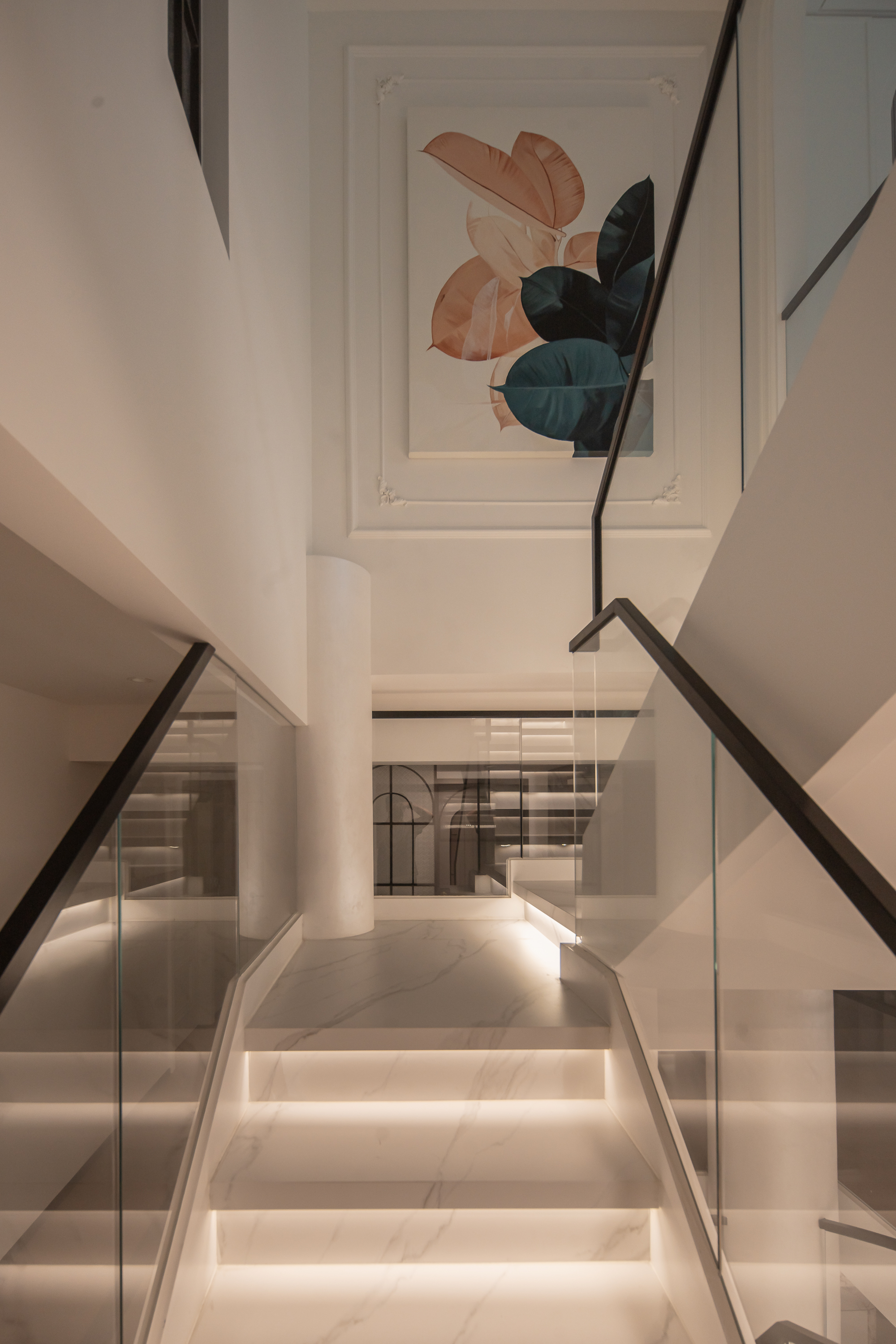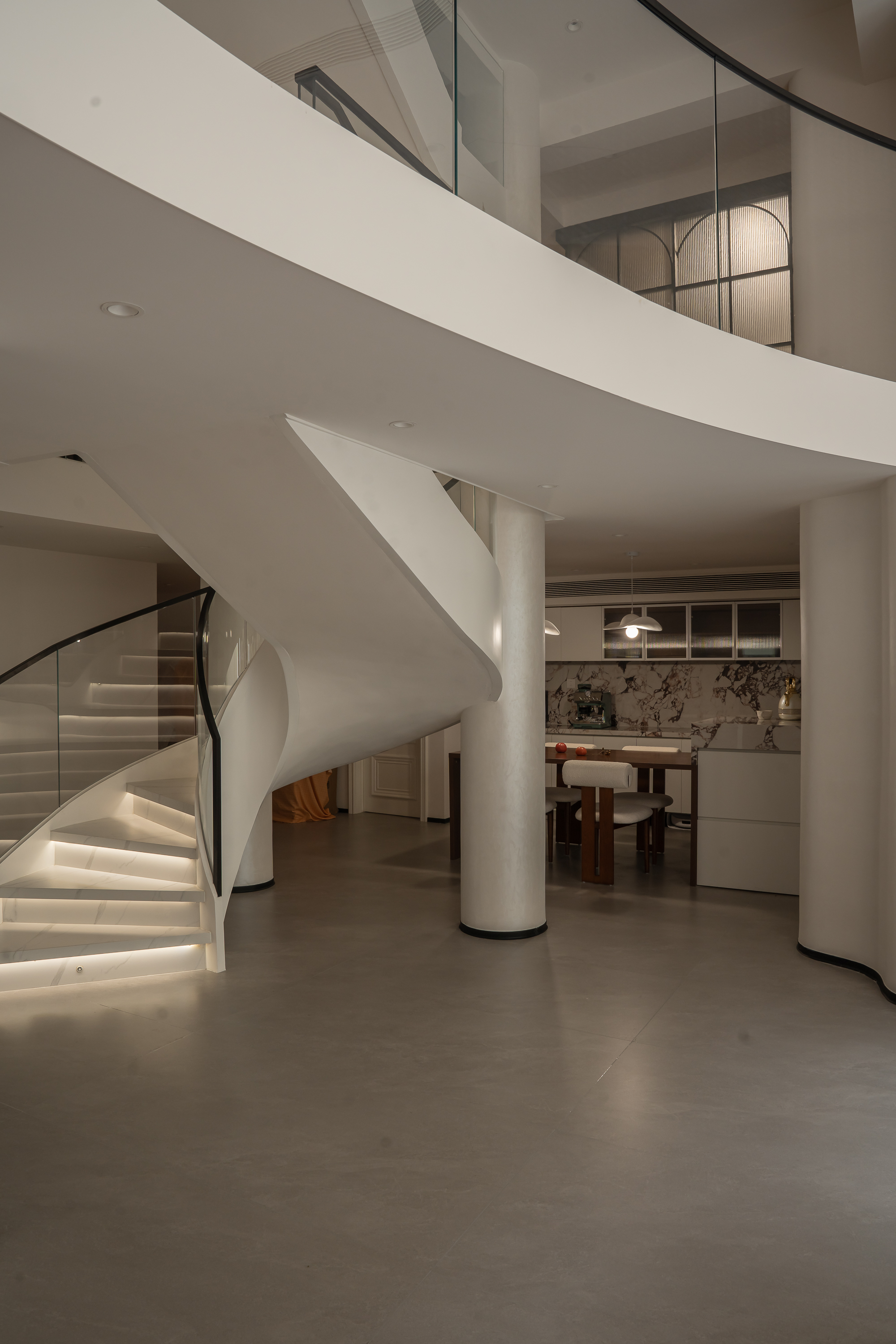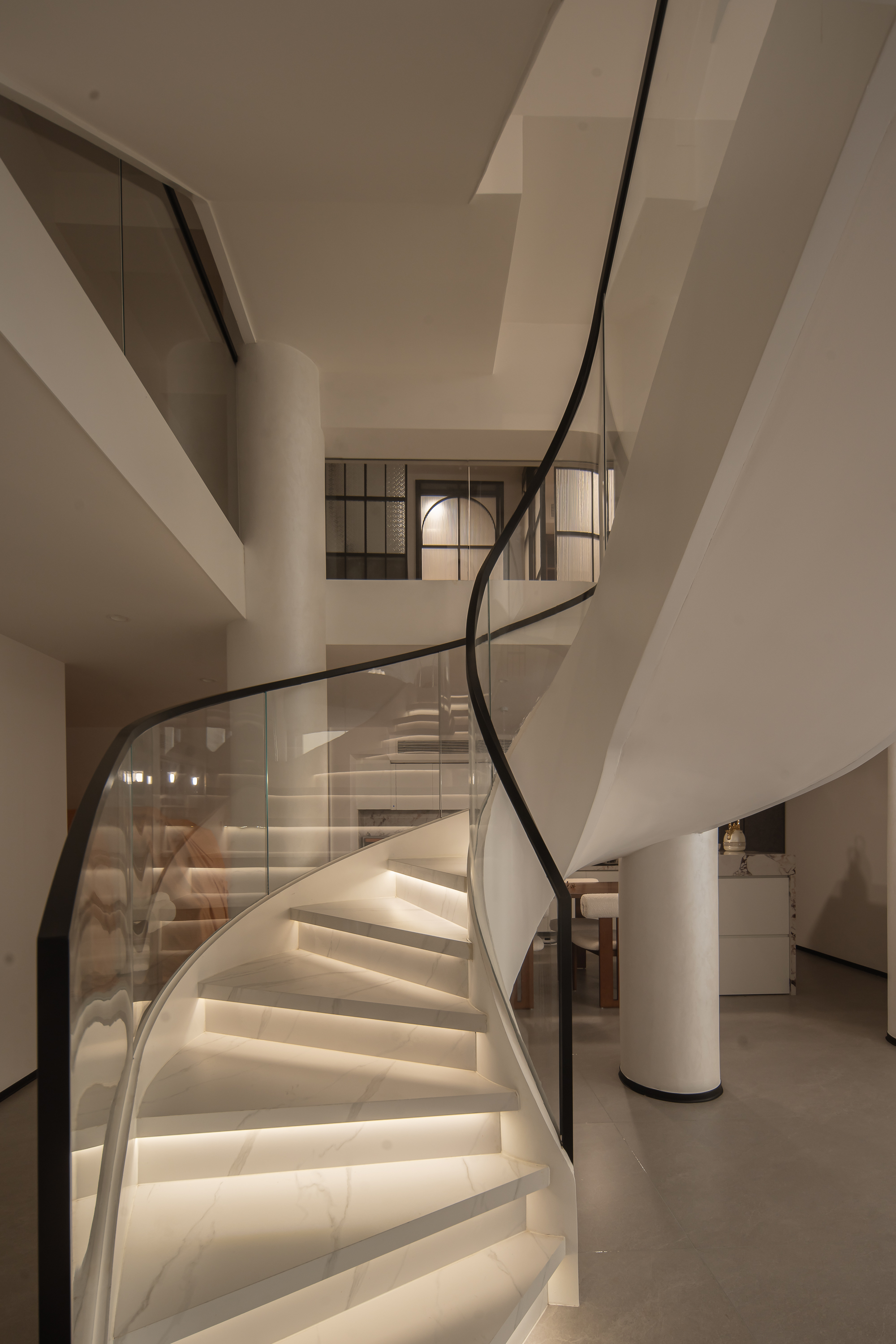 玄关 考虑到屋主出行的习惯和小区的环境,打通小区车库与地下室的进出通道打造出入户玄关。考虑到入户的私密性和采光,玄关区域设计挑高并打造了造型墙隔断。玄关处融合了精致的柜体与优雅的拱形玻璃窗,不仅巧妙地满足了入户收纳的需求,同时提升了楼梯区域的采光。踏入玄关,整个空间弥漫着一种既经典又不失现代感的魅力,生活场景如画卷一般优雅地铺陈开来。