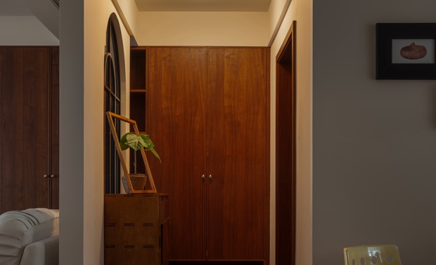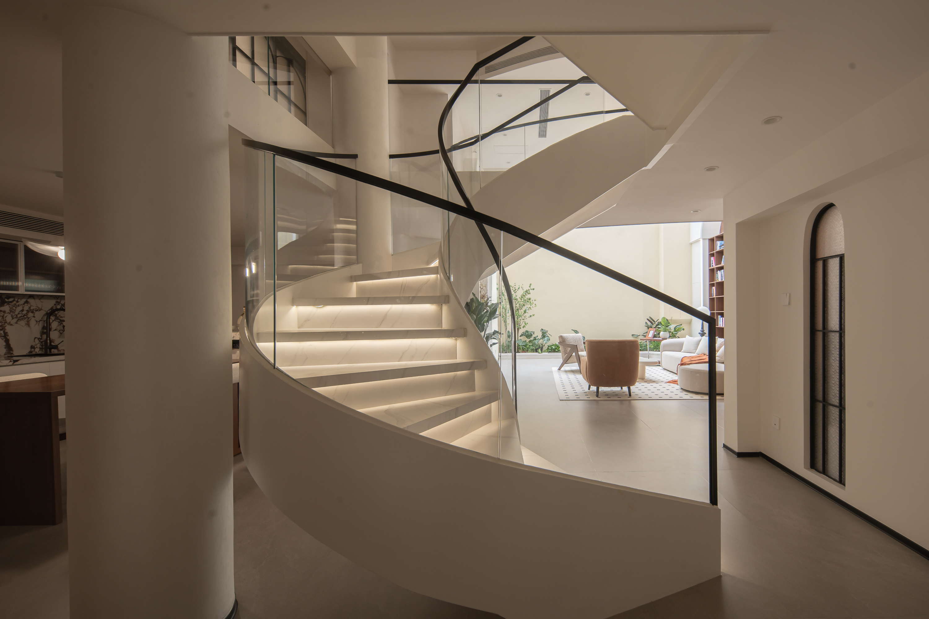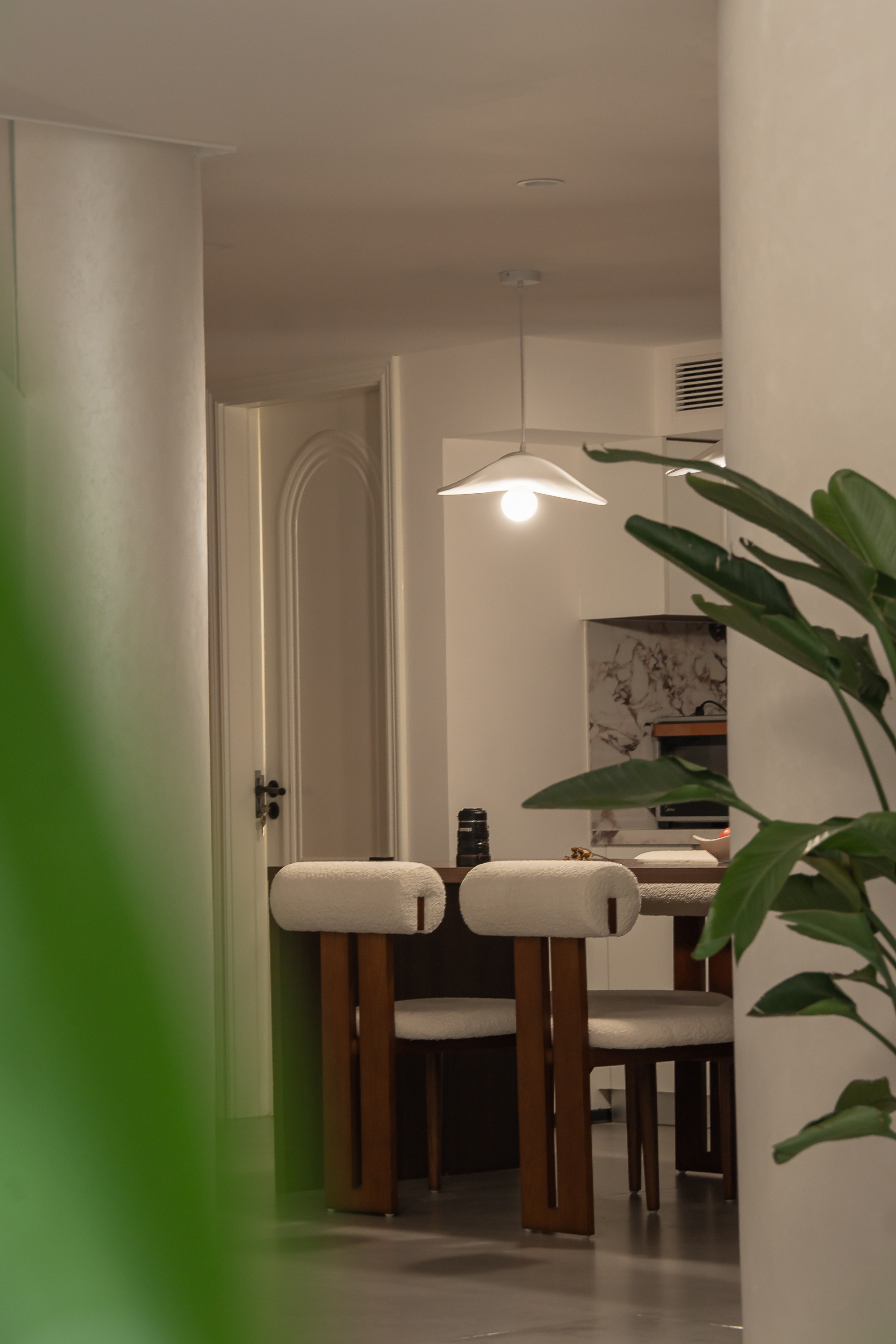 原楼梯和客厅之间的墙体将客厅与全屋其他空间的动线完全被且切割,且楼梯的采光比较差,设计后将楼梯与客厅之间的墙体拆除,打造成拱形门洞,既解决了楼梯的采光,也客厅与全屋其他空间形成了洄游动线,客厅与其他区域的互动非常通畅、舒适。楼梯以及其他空间迂回的动线突显了空间的克制之美,松弛有度的生活就此展开。空间和人居似乎被此处空间描绘得淋漓尽致,理想的归隐秘境随着生活继续,而更加惬意了。