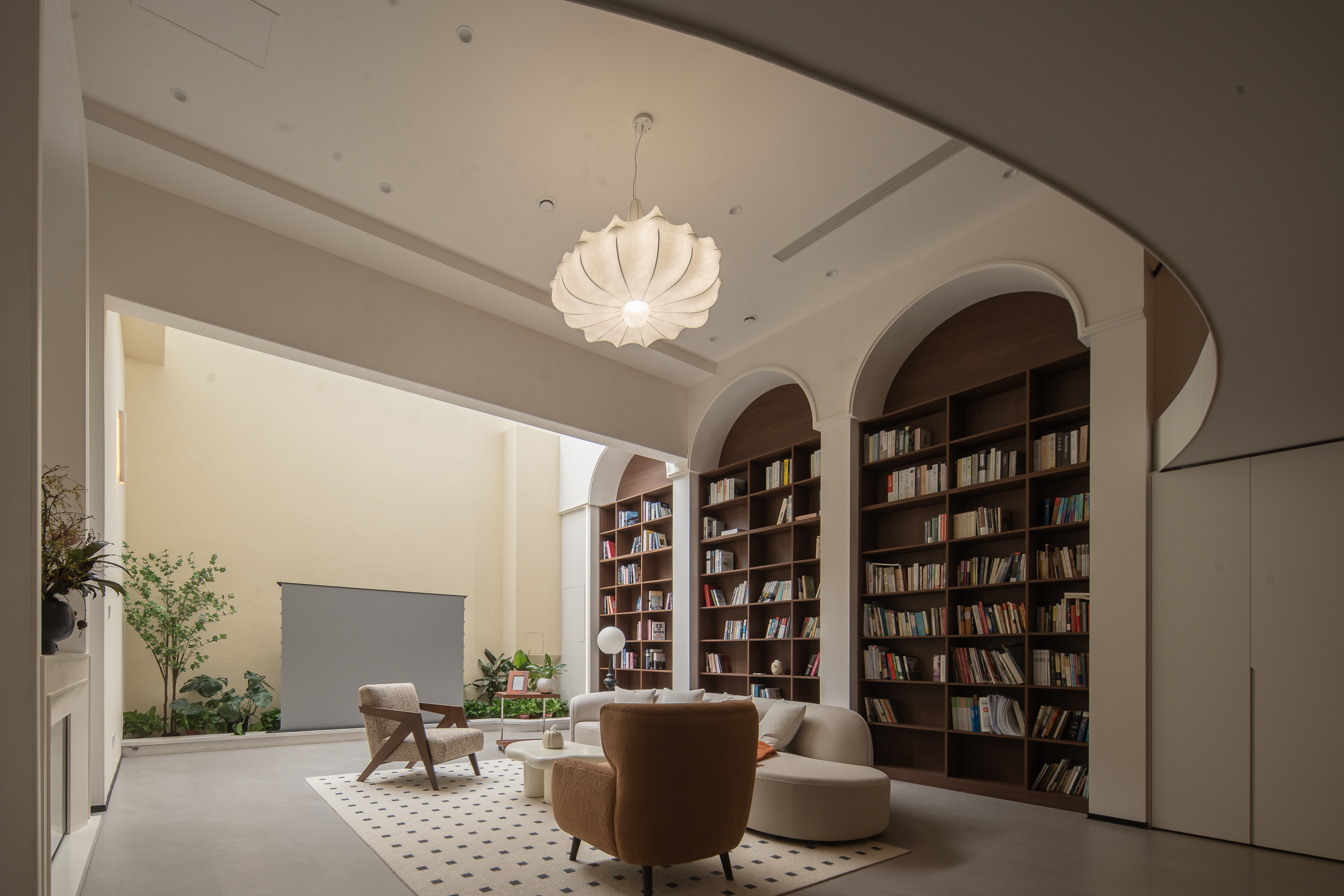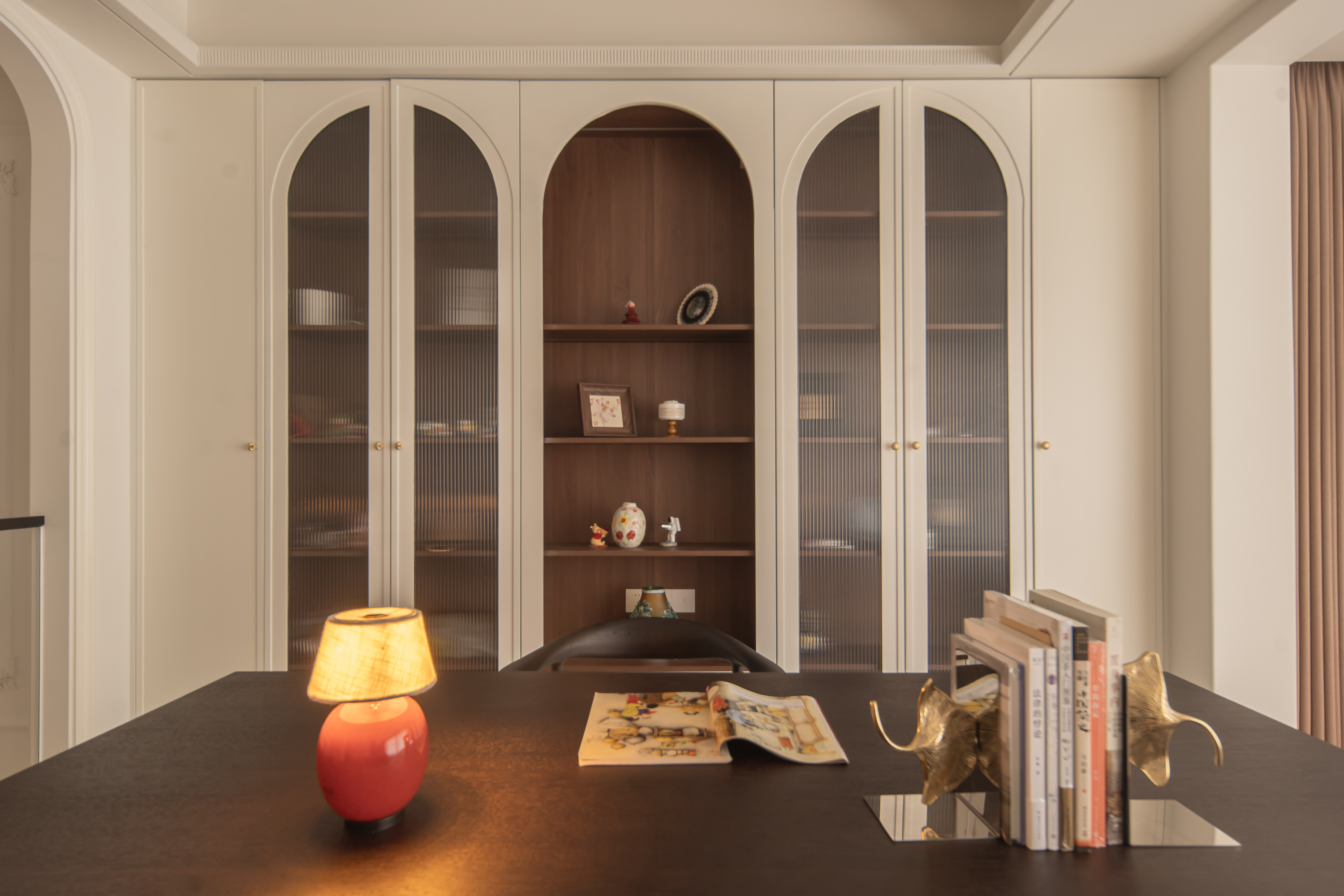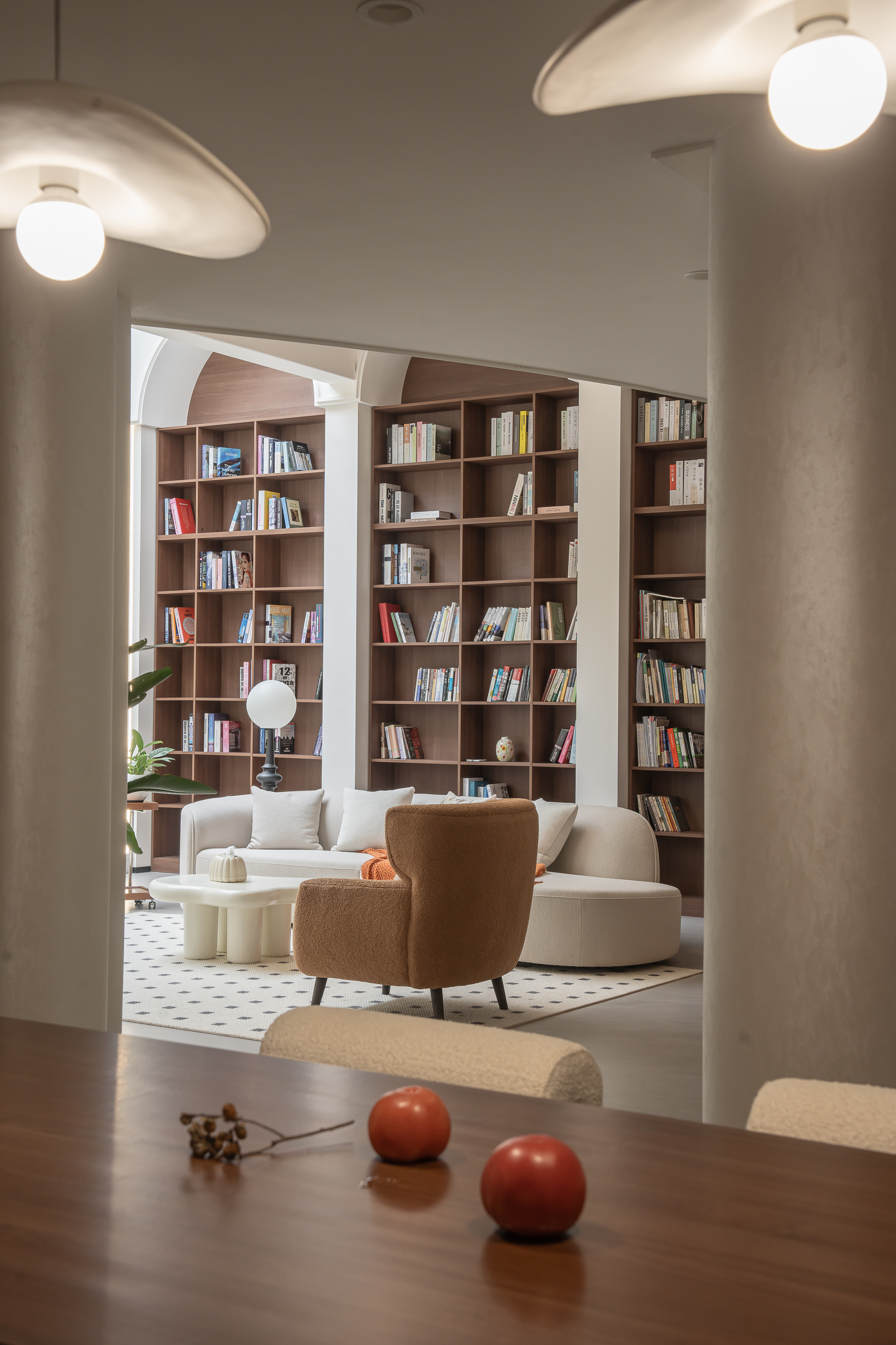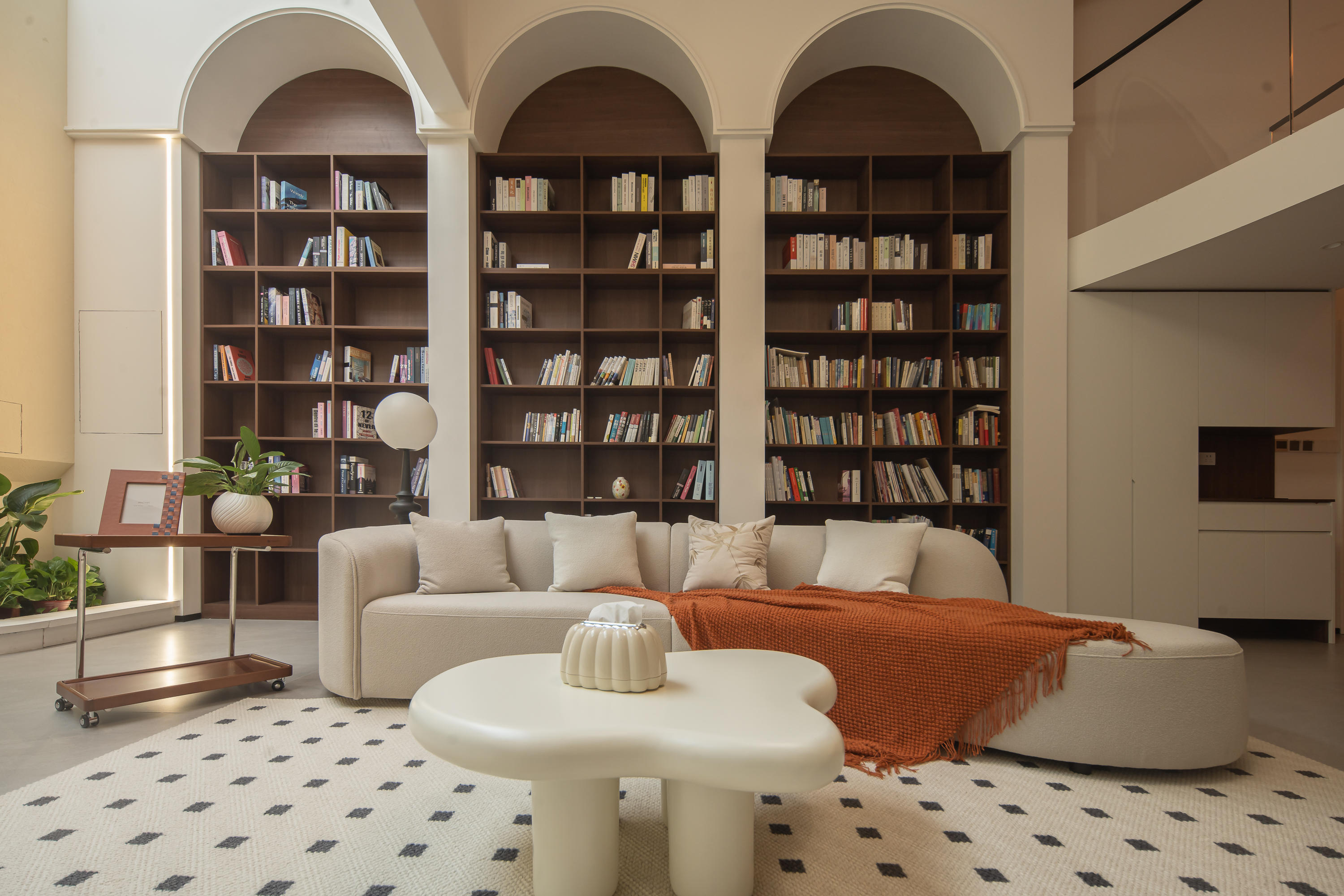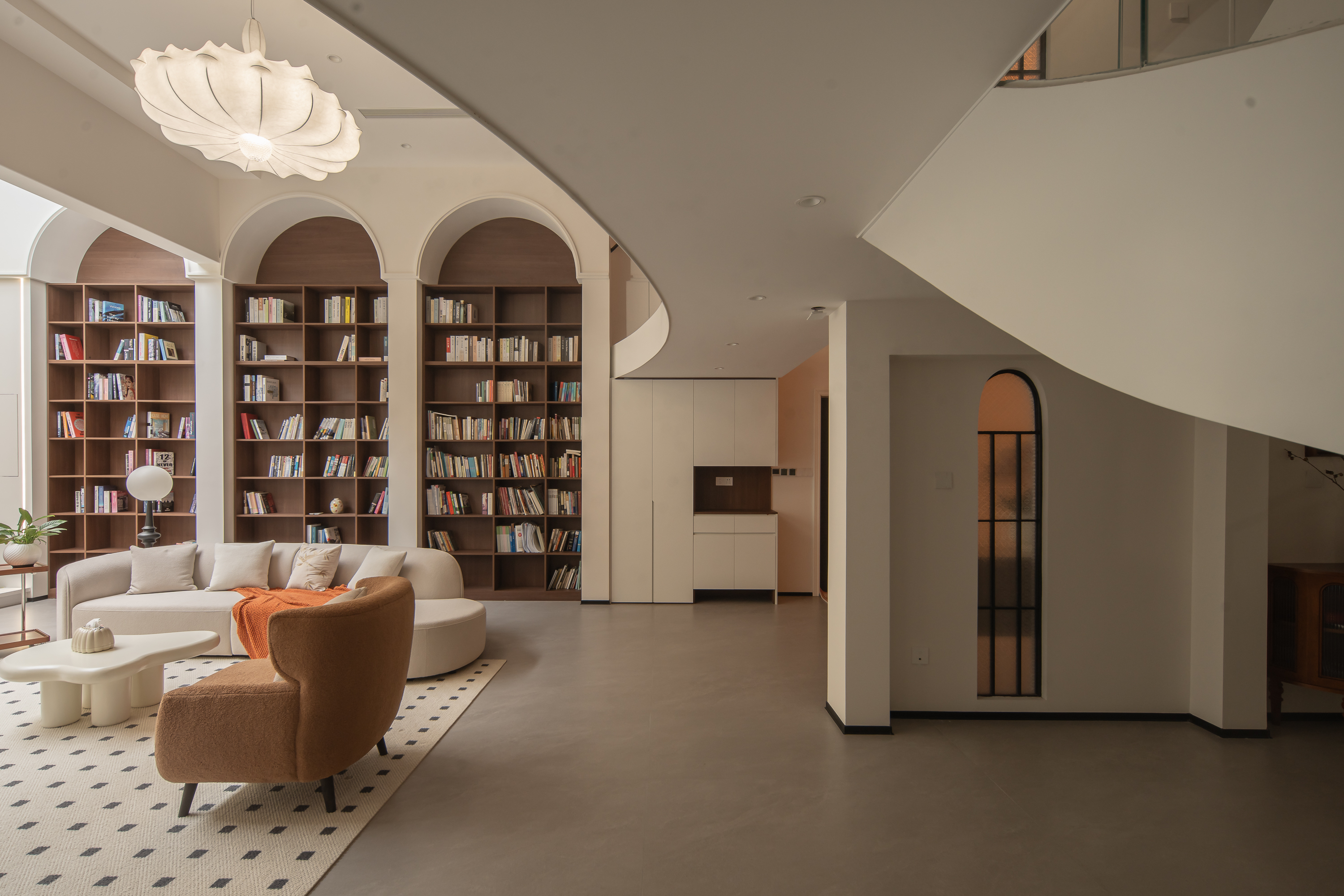 地下室 因为屋主是老师,家里藏书比较多,地下室一侧打造成书柜墙,整个区域演变成了一个家用图书馆。书架靠墙而设,开放式的内凹拱形书架散发着复古的魅力也让书香气息更加浓郁。整个书房的氛围宁静而深远,让人在这里能够轻松沉浸于阅读的世界。考虑到地下室的采光,整个空间以暖白色为主色调并融入了胡桃木和艺术漆,提升整个空间的质感。