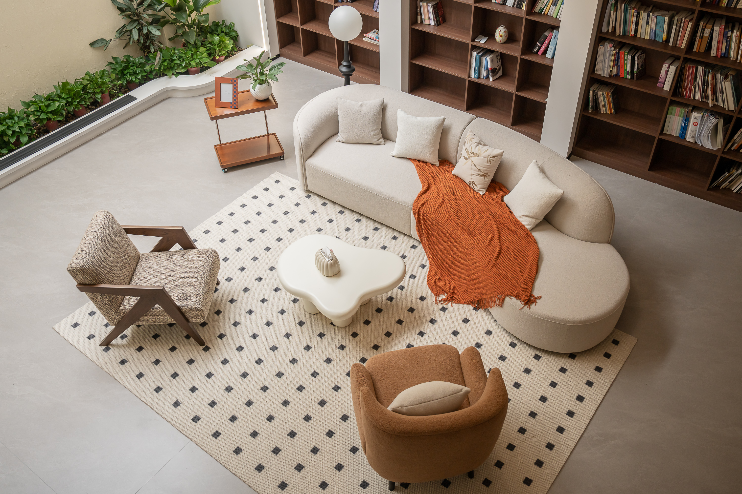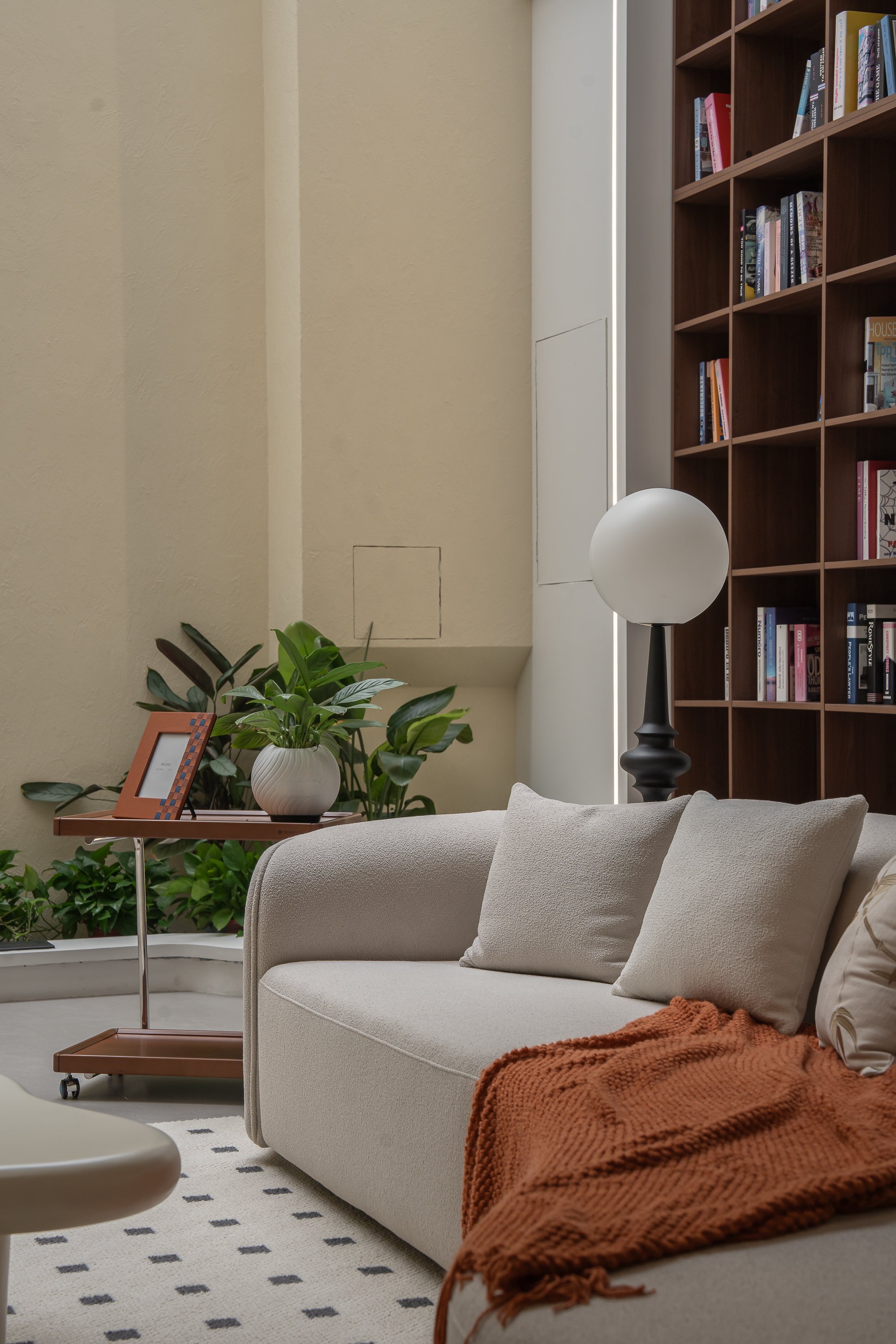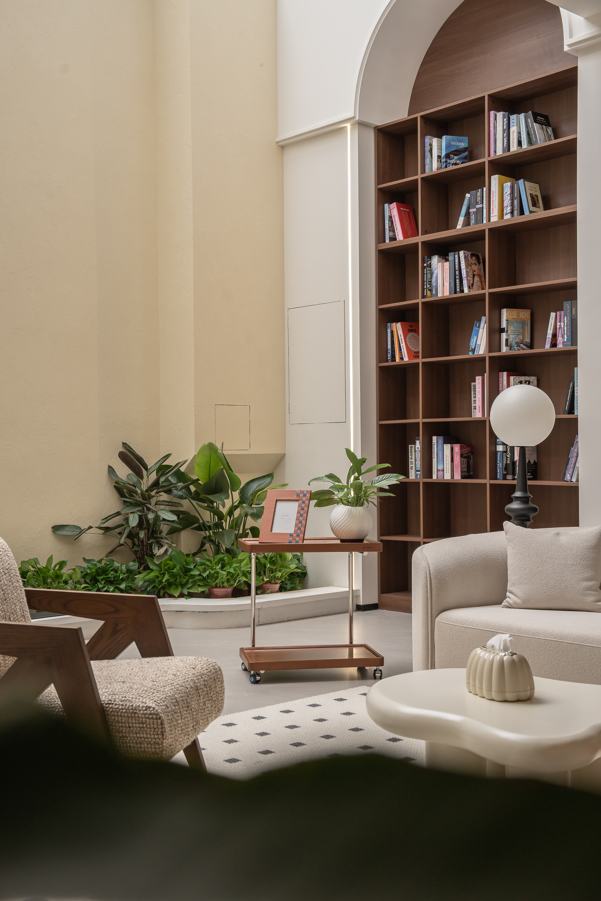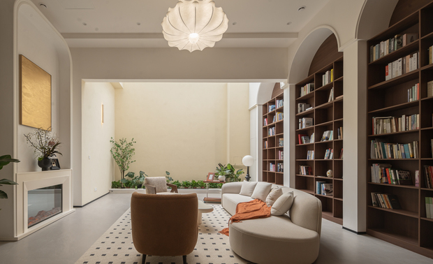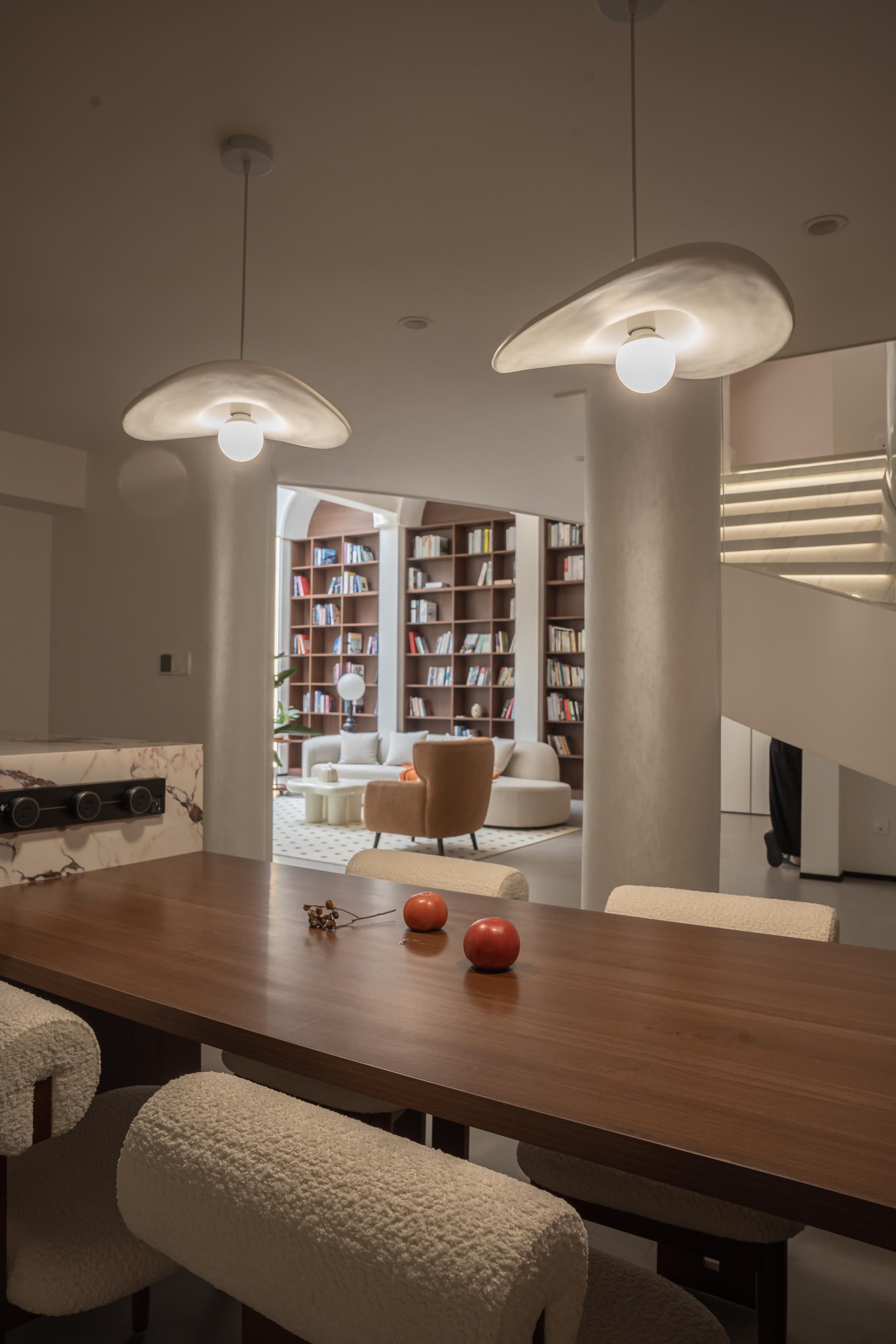 地下室 因为屋主是老师,家里藏书比较多,地下室一侧打造成书柜墙,整个区域演变成了一个家用图书馆。书架靠墙而设,开放式的内凹拱形书架散发着复古的魅力也让书香气息更加浓郁。整个书房的氛围宁静而深远,让人在这里能够轻松沉浸于阅读的世界。考虑到地下室的采光,整个空间以暖白色为主色调并融入了胡桃木和艺术漆,提升整个空间的质感。