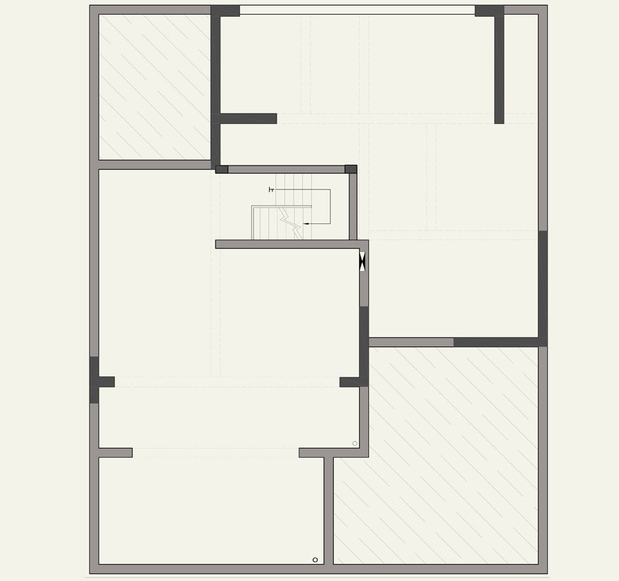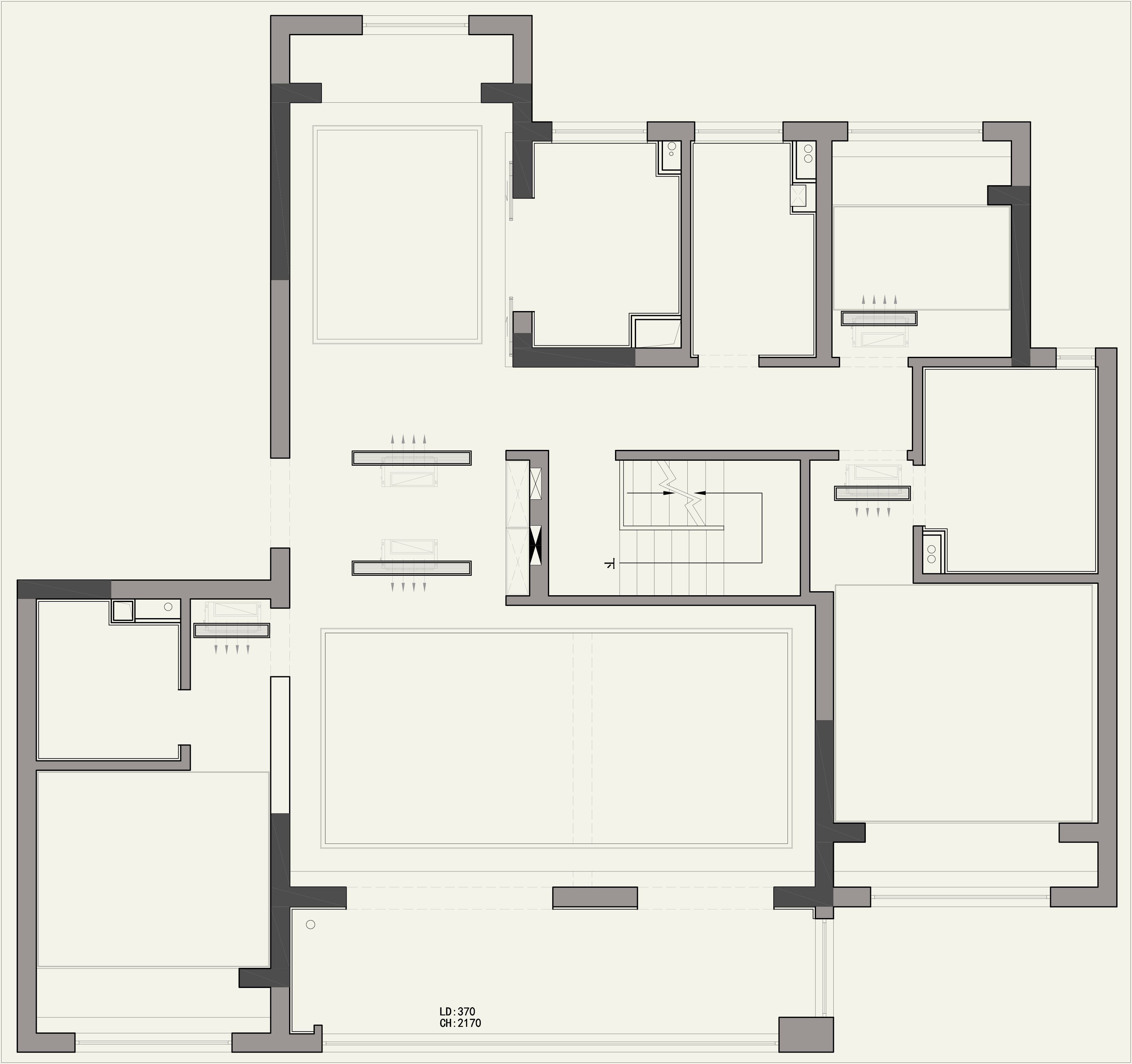 地下室户型图 1.楼梯空间封闭、采光差。楼梯将客厅与其他的区域切割开,生活动线非常不便利; 2.地下室层高4.8米,空间采光比较差,原空间只有50平,常规不太好布局;