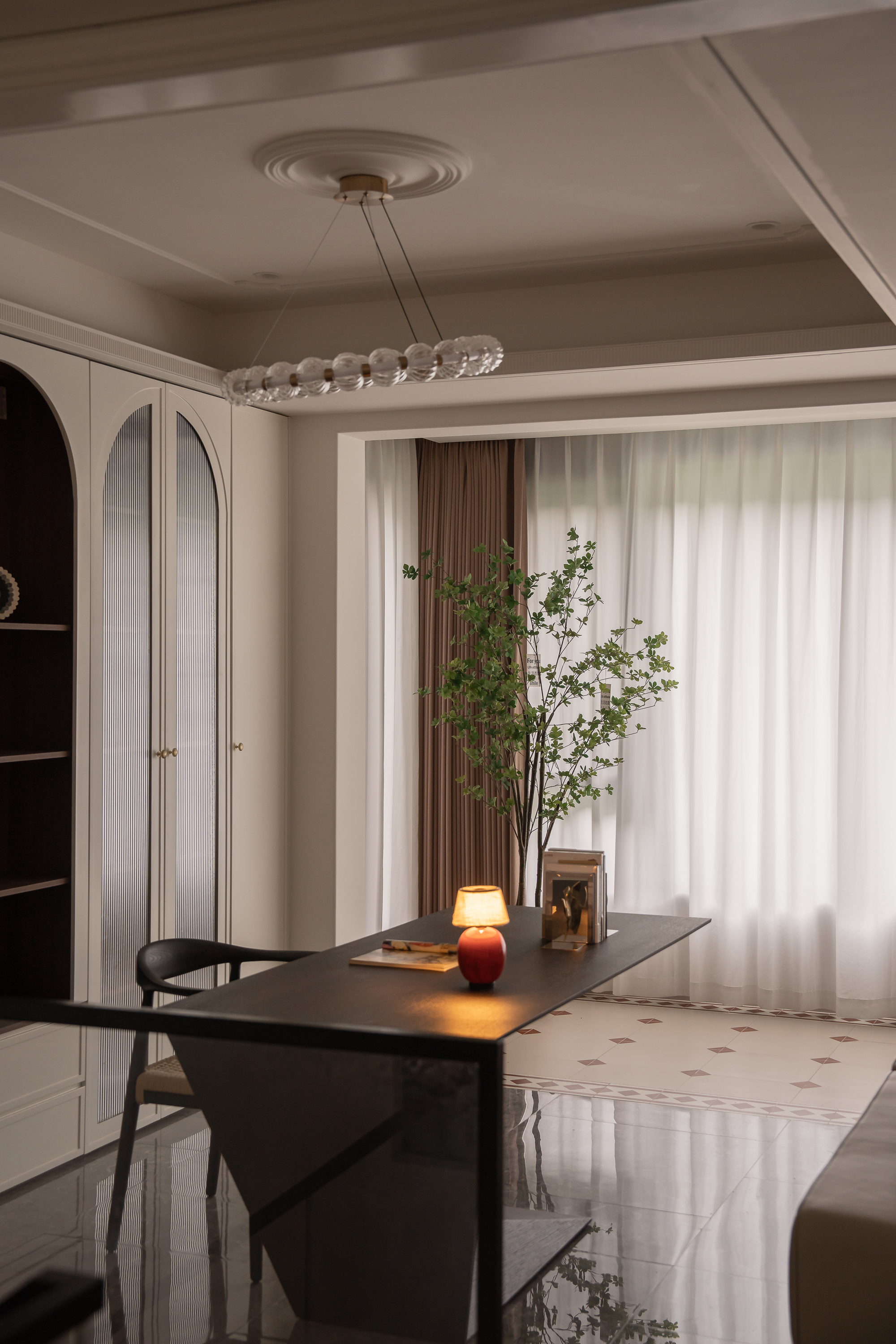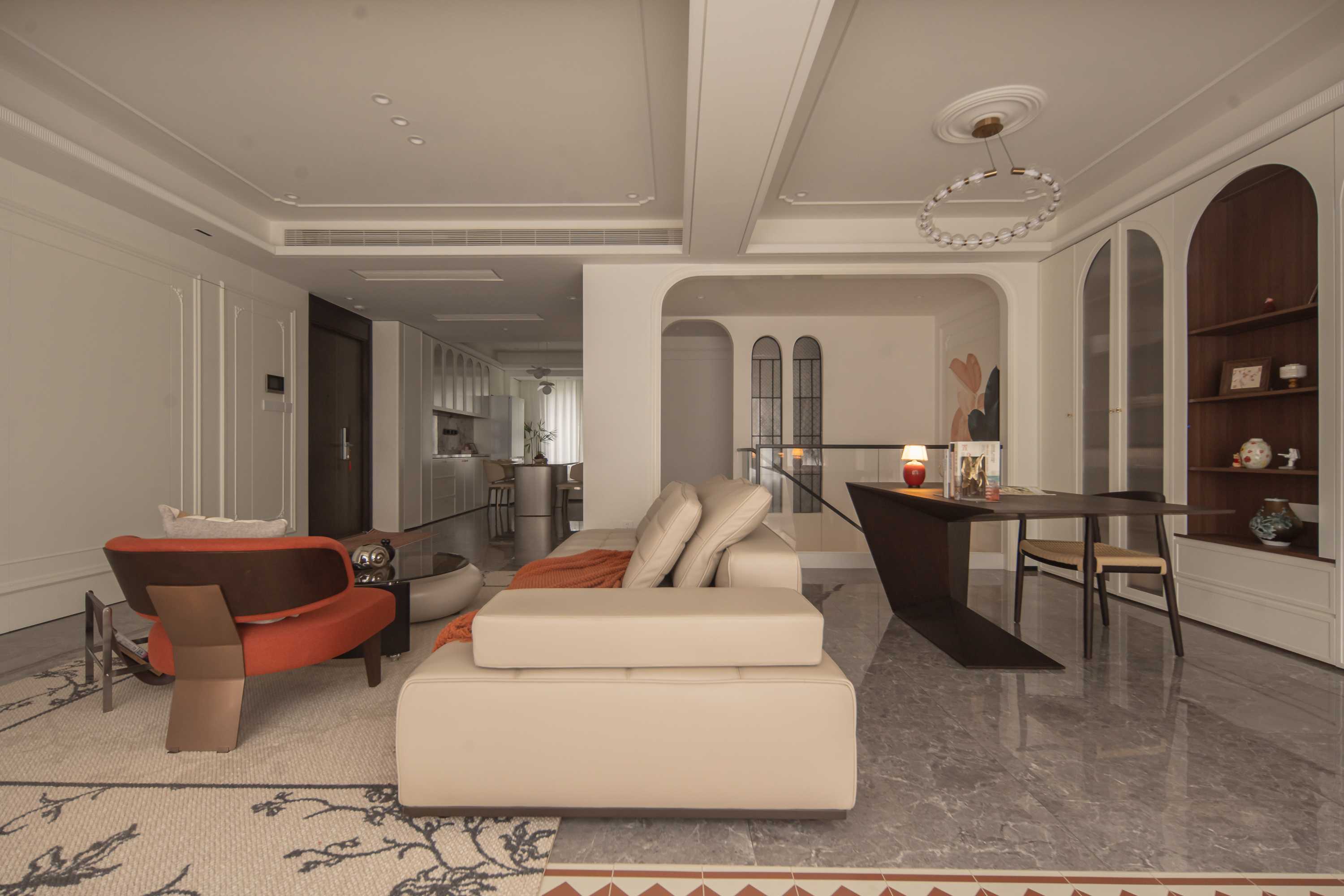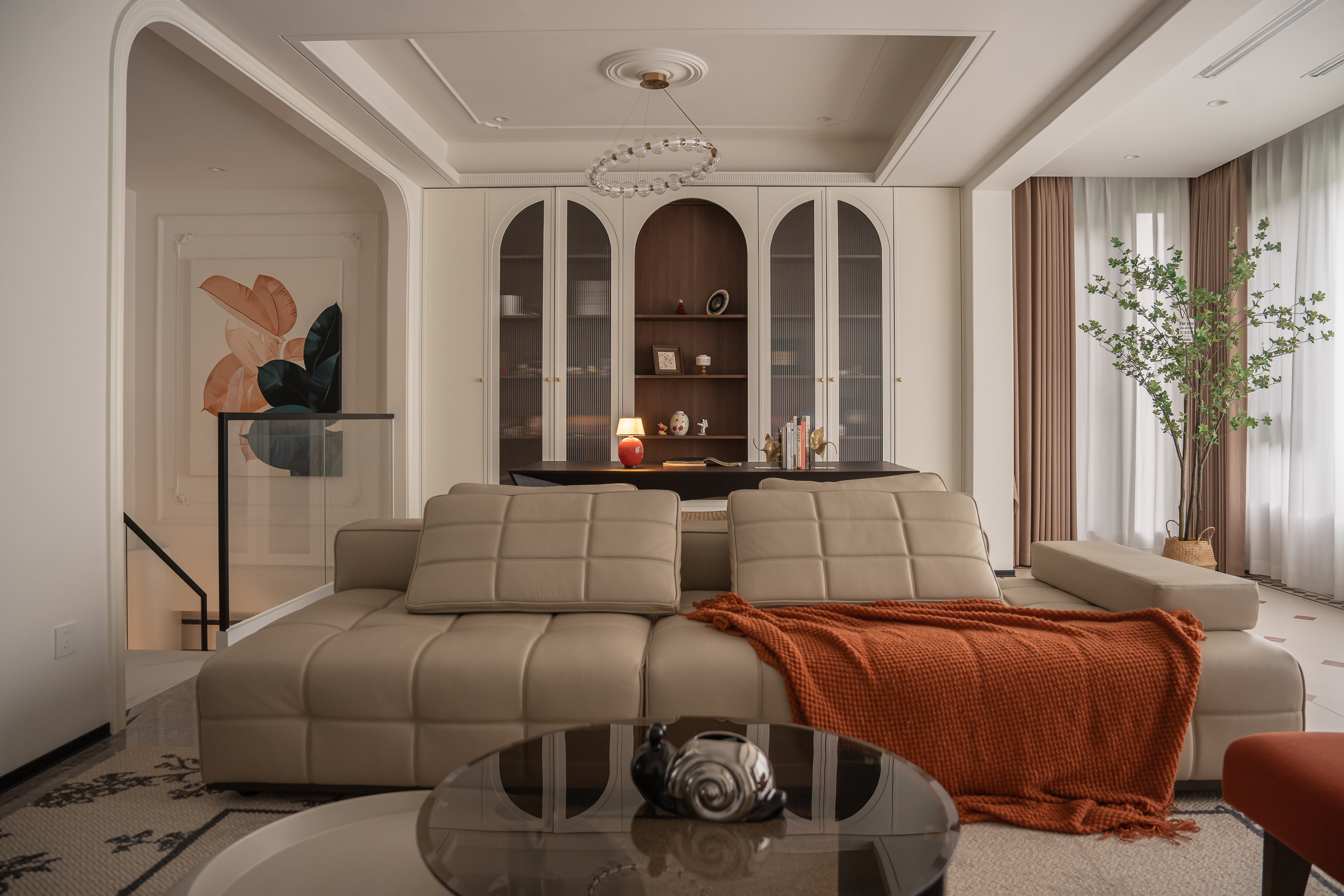 客厅 考虑到客厅狭长,宽度比较窄,设计后将客厅与阳台打通,将客厅的功能延申到阳台。结合屋主工作和生活的需求,客厅的布局采用了客厅书房一体并摒弃了传统的电视背景墙,采用石膏线与隐形门相融合打造出一片纯净又不失艺术性的背景墙,避免了因为客厅多处拱形造型带来的繁琐感。空间家具的摆放采用松散式布局兼具了家一般的洒脱和随性,循序渐进的彰显着空间的松缓和释然。