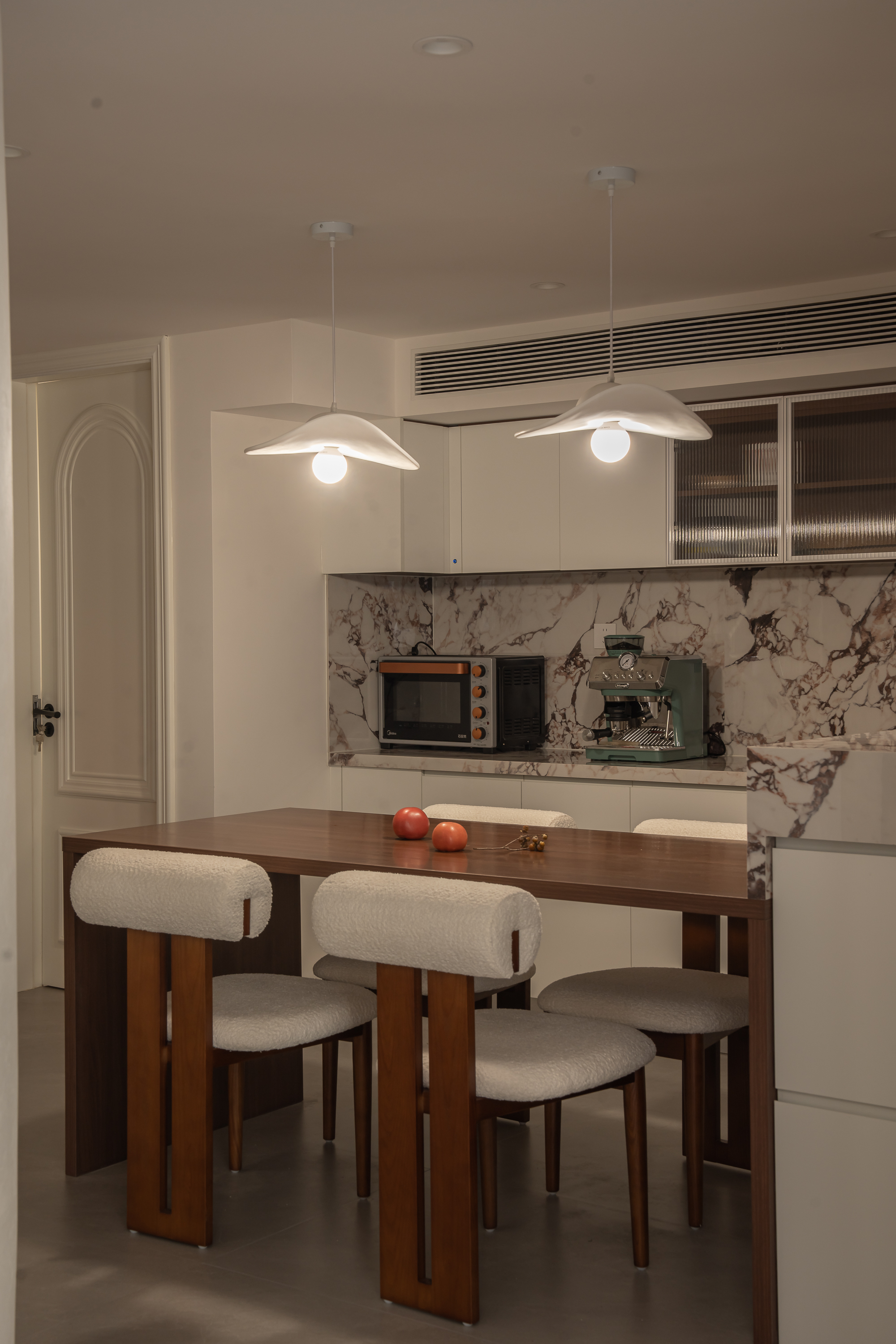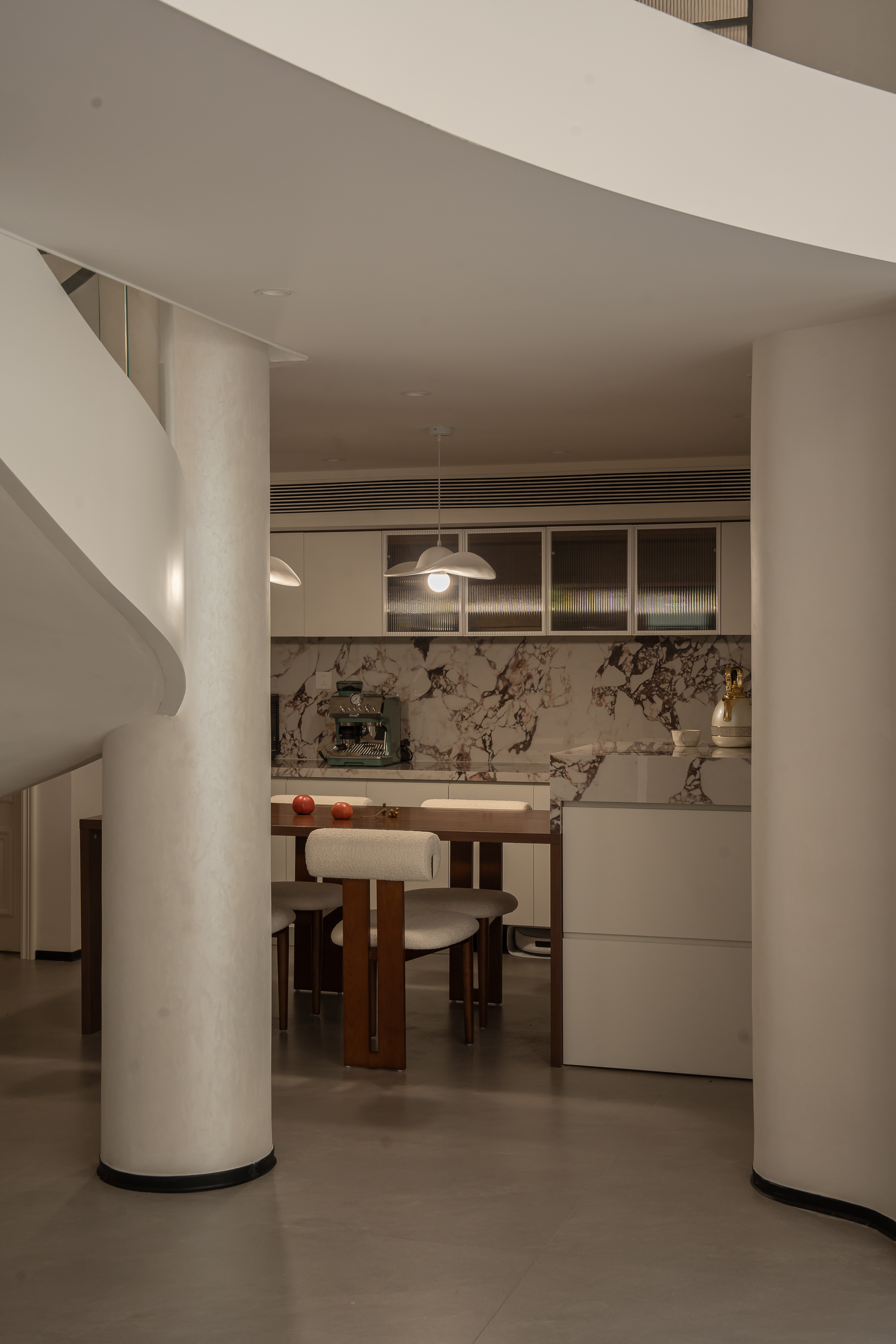 餐厅 考虑到日常在地下室看书、聚会时的生活便利性,纵横交错的梁体和柱体之间隐藏着空间的惊喜,西厨空间隐藏其中。吧台餐桌一体化布局,无论是屋主平时喝茶、喝咖啡,还是节假日朋友聚会都非常便利。大理石吧台搭配胡桃木餐桌,大理石带来质朴自然的感觉,胡桃木在白色中更显温馨优雅,在这样的精致环境中,用餐变成了一种享受,充满了无限的乐趣。