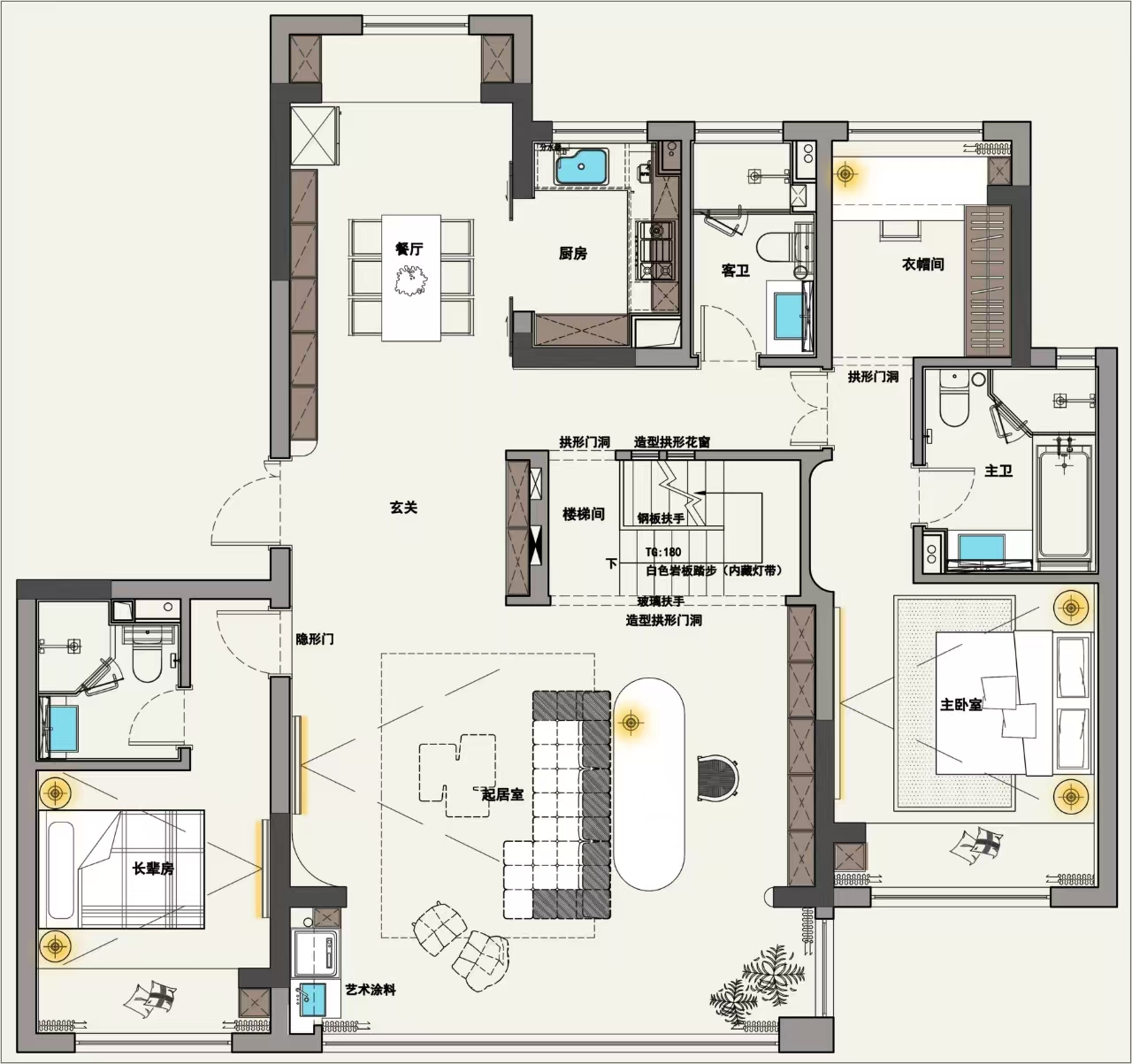 一楼装修平面图 1.考虑到楼梯空间的采光和客厅与其他区域的动线,将楼梯与客厅之间的墙体拆除,打造成拱形门洞,既解决了楼梯的采光,也让客厅与其他区域之间实现了洄游动线,各空间之间的互动通畅、简便。 2.考虑到走廊区域的光线,设计师通过墙上借光的方式,既提升了空间的艺术感,也让走廊区域更加通透。 3.考虑到客户空间狭长,将客厅与阳台打通,阳台内扩后将客厅打造成了客厅、书房一体,实现了屋主夫妻多样化的需求。 3.考虑到主卧和北卧室的空间比较小,结合屋主的需求,打造成了卧室+衣帽间一体的套房,提升了主卧的舒适性,也让生活动线更加舒适。 4.6.在空间色调,结合屋主的需求和喜好,将原灰色的墙体调整了暖白色并融入法式线条和几何美学艺术,让整个空间更具灵动性。