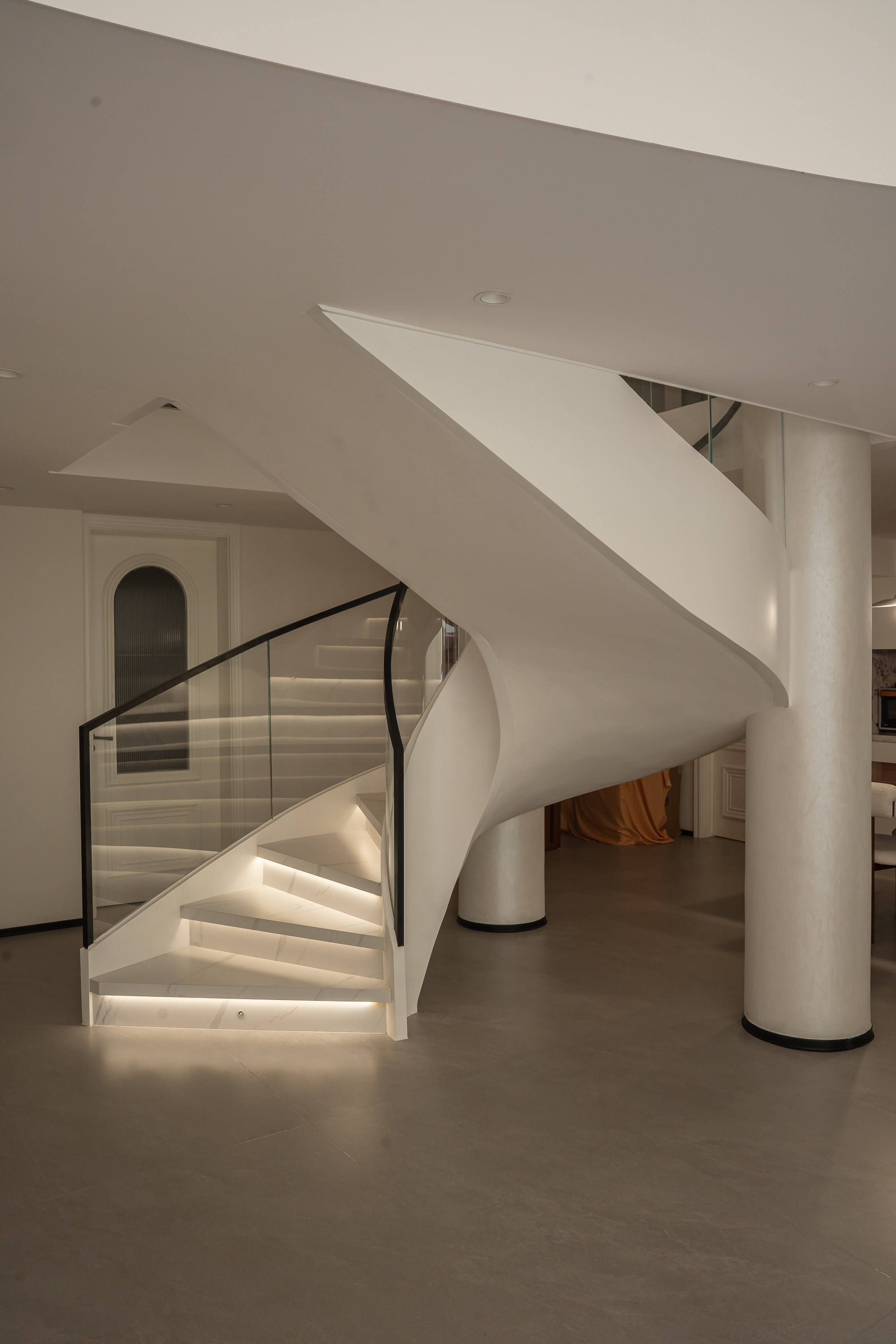 楼梯 考虑到地下室的空间尺寸、层高以及采光,楼梯设计成了旋转楼梯+透明玻璃扶手,整个空间通透、敞亮,楼梯成了整个地下室空间的亮点,各个区域之间的互动非常便利。黑色与白色的巧妙融合,辅以几何图形的美学设计,创造出强烈的视觉冲击力。