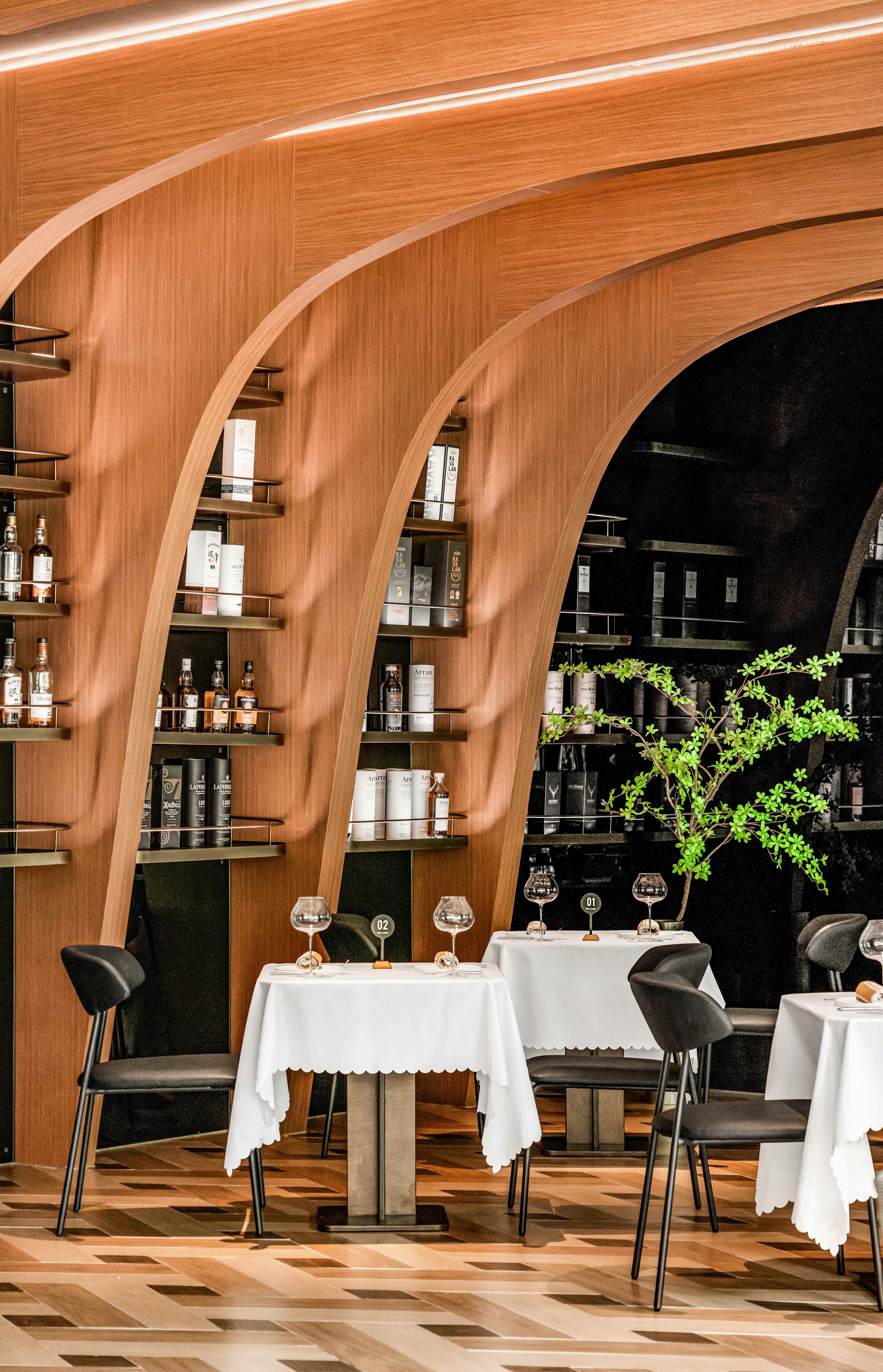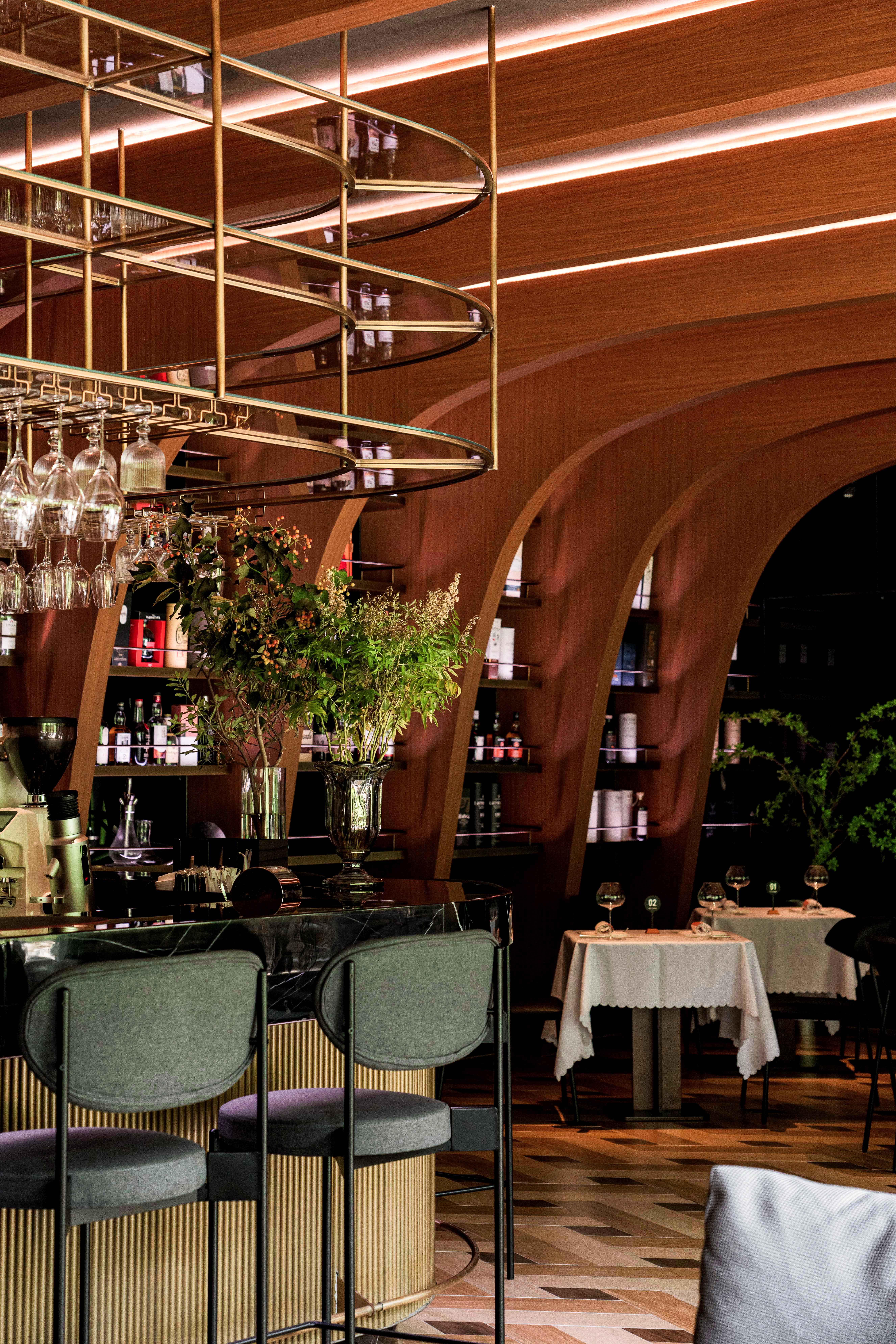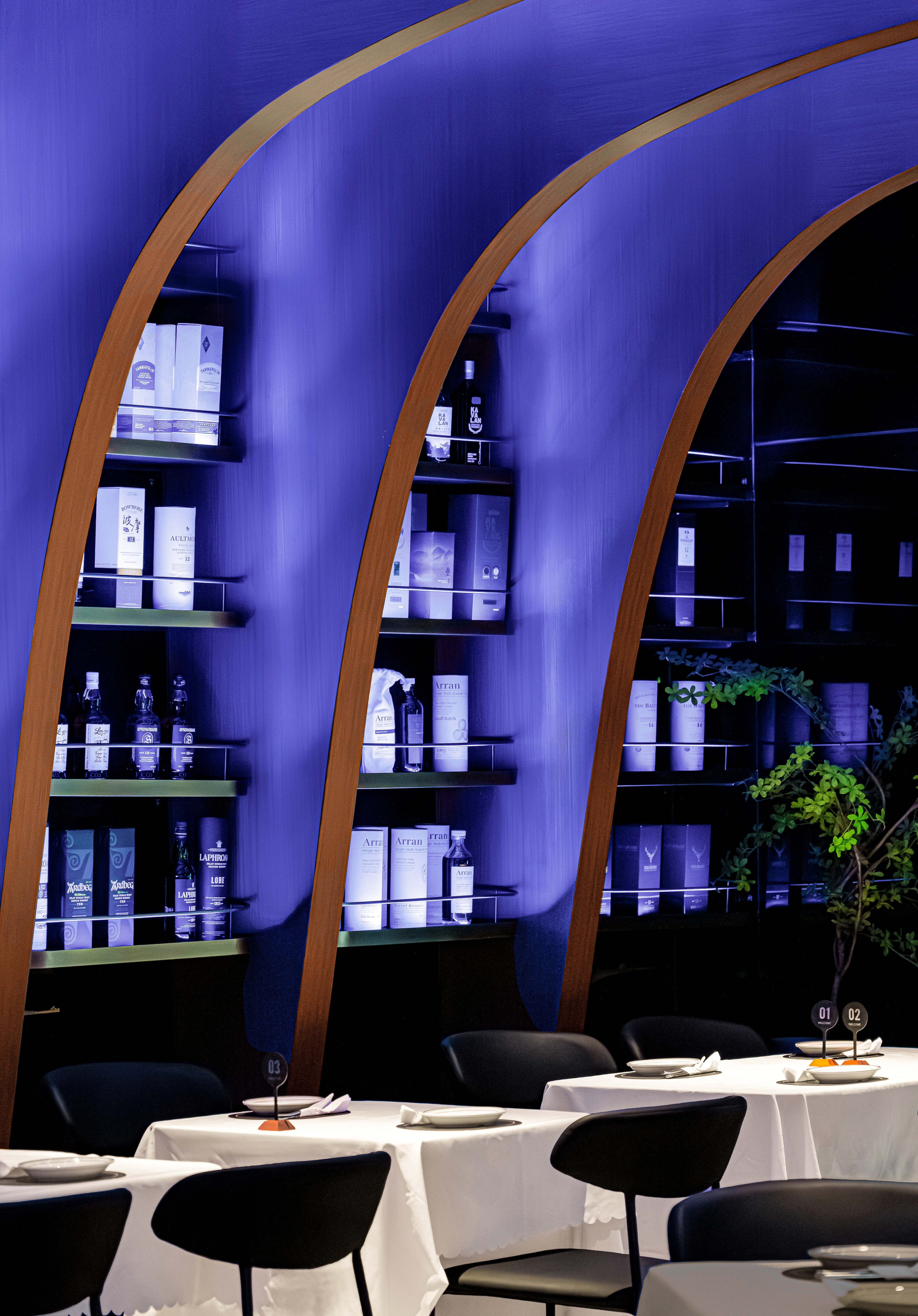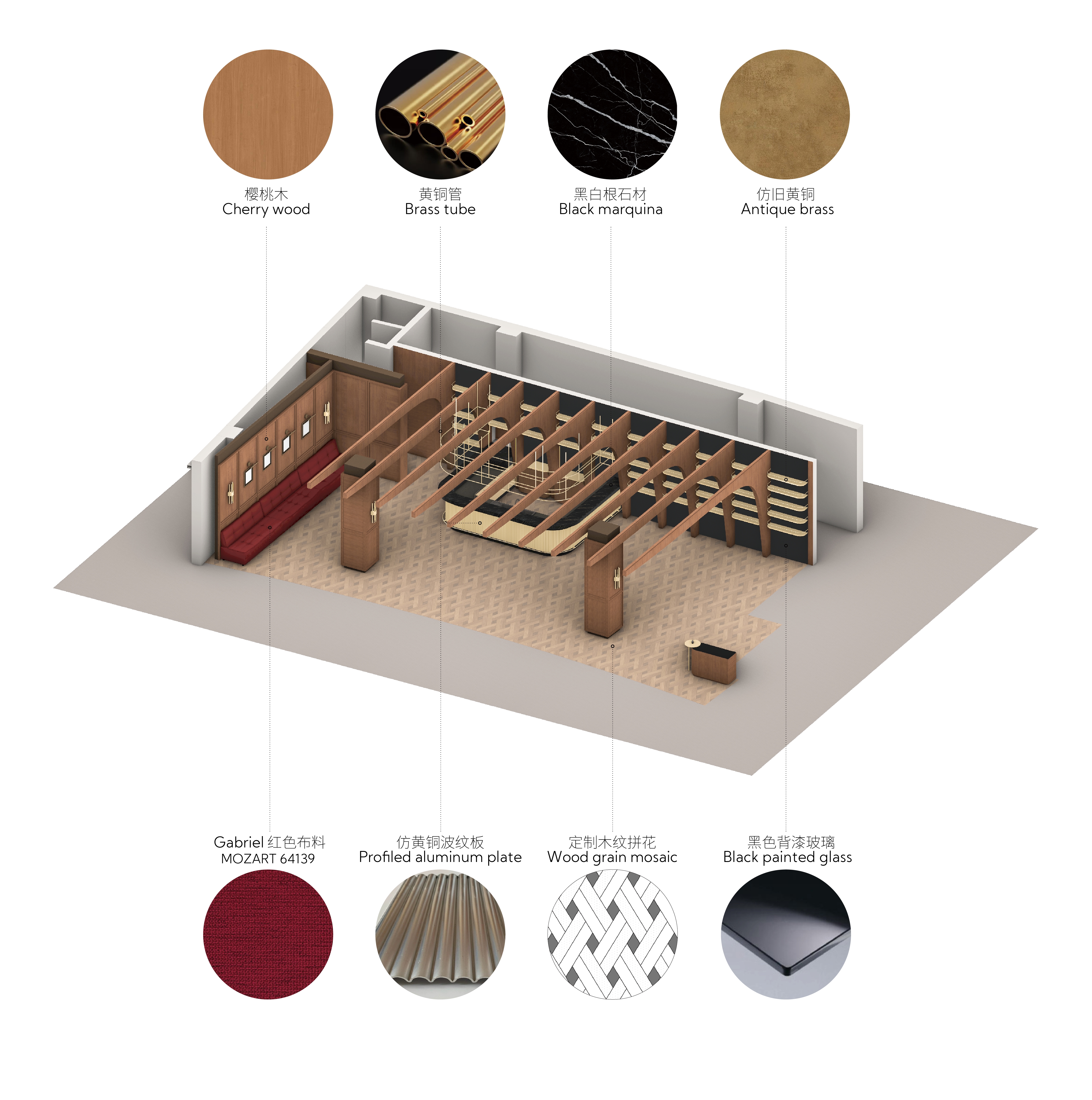 设计选材:我们在场地中央置入了一个融合装置与功能双重属性的吧台。吧台背靠墙面,朝向室外,台面由整块的镜面黑色石材打造,立面为氧化做旧的黄铜波纹板,结合与之呼应的黄铜吊架,好似一艘即将离港远航的游轮。而在夜色降临后来访的每位饮客,都好像登船远行的船客。站在中心位置的调酒师精准地晃动手中制作的威士忌,像一位表演者,更像一位掌舵的船长,在旖旎的灯光中,在美妙的音乐中,与船客一同精神远航。