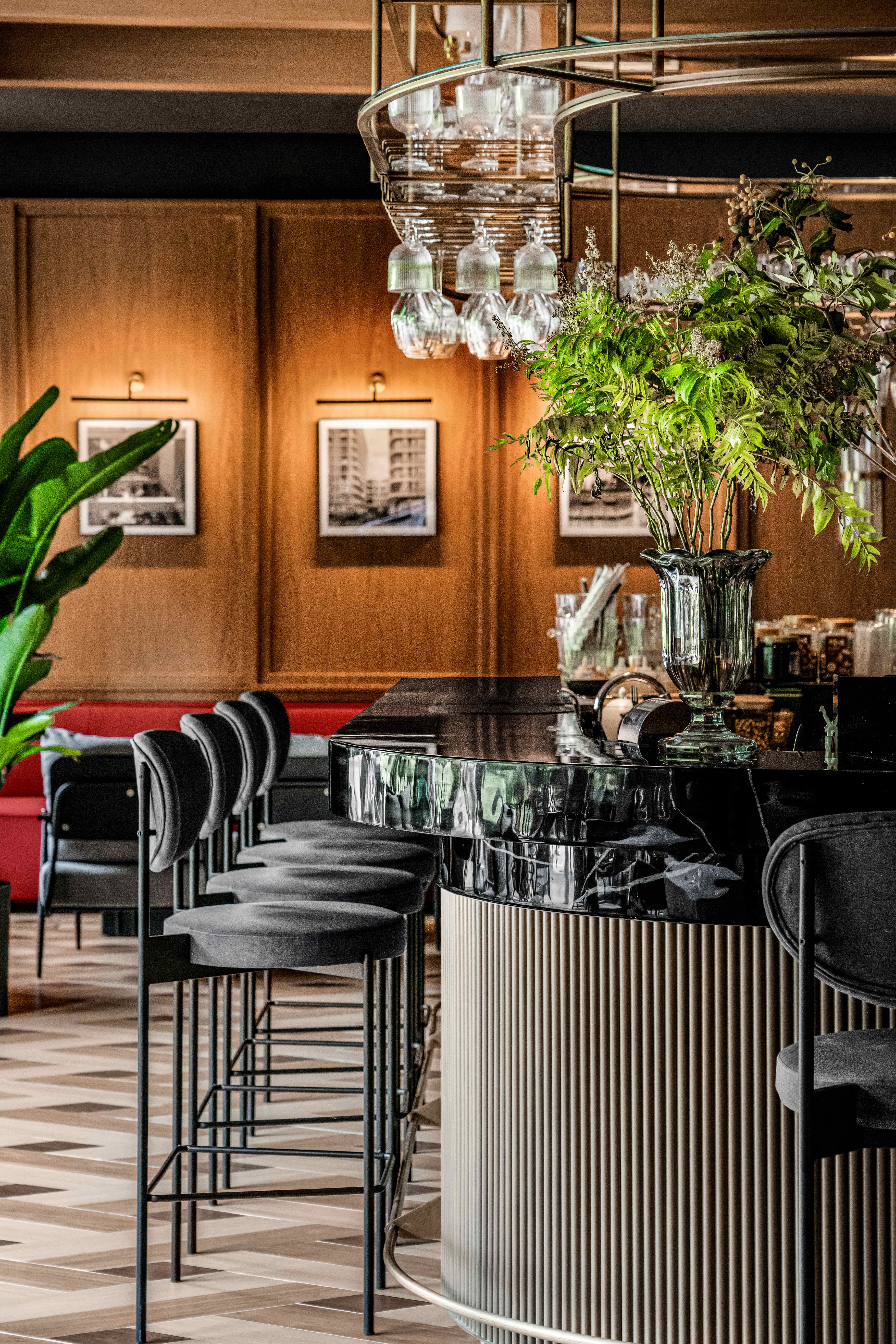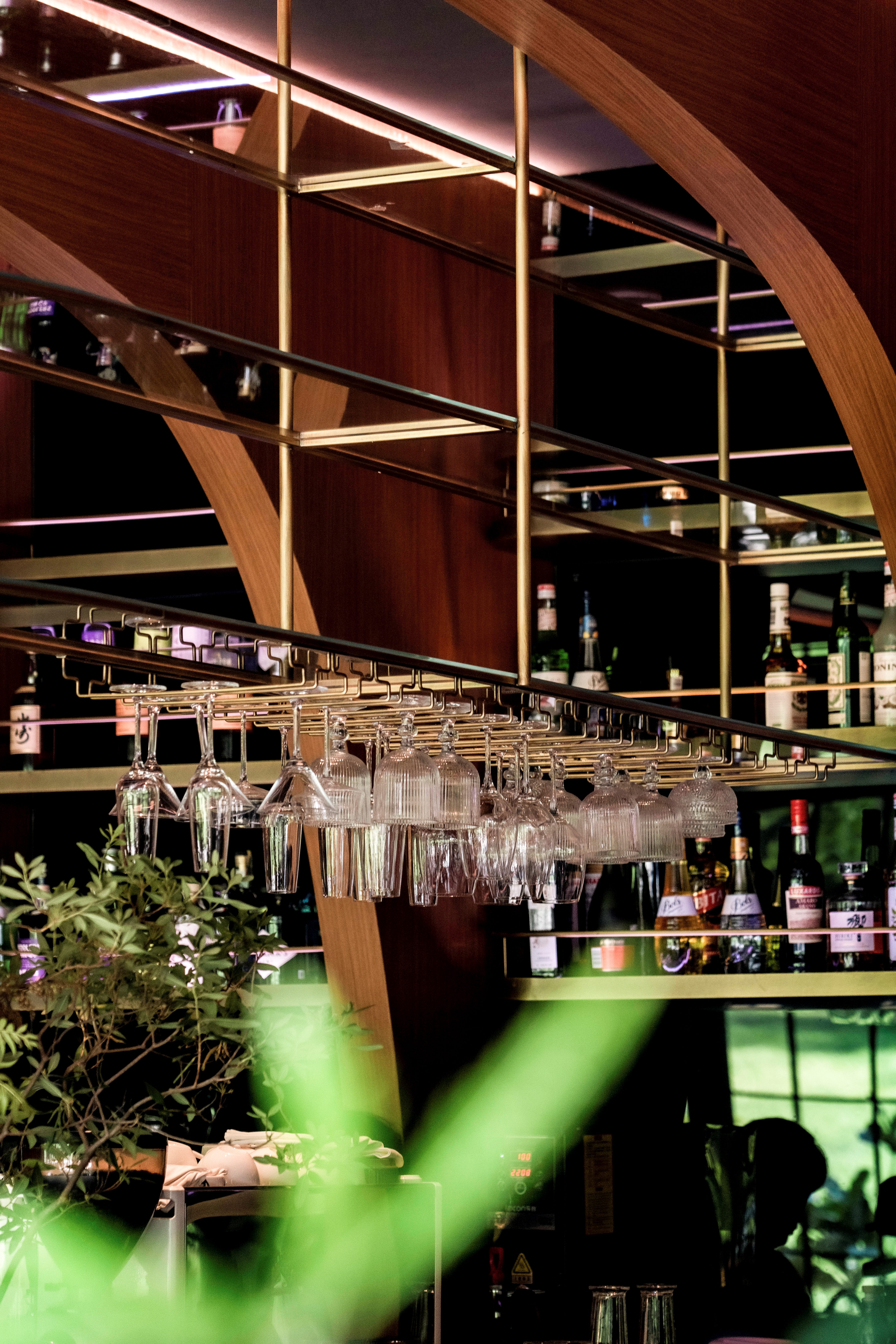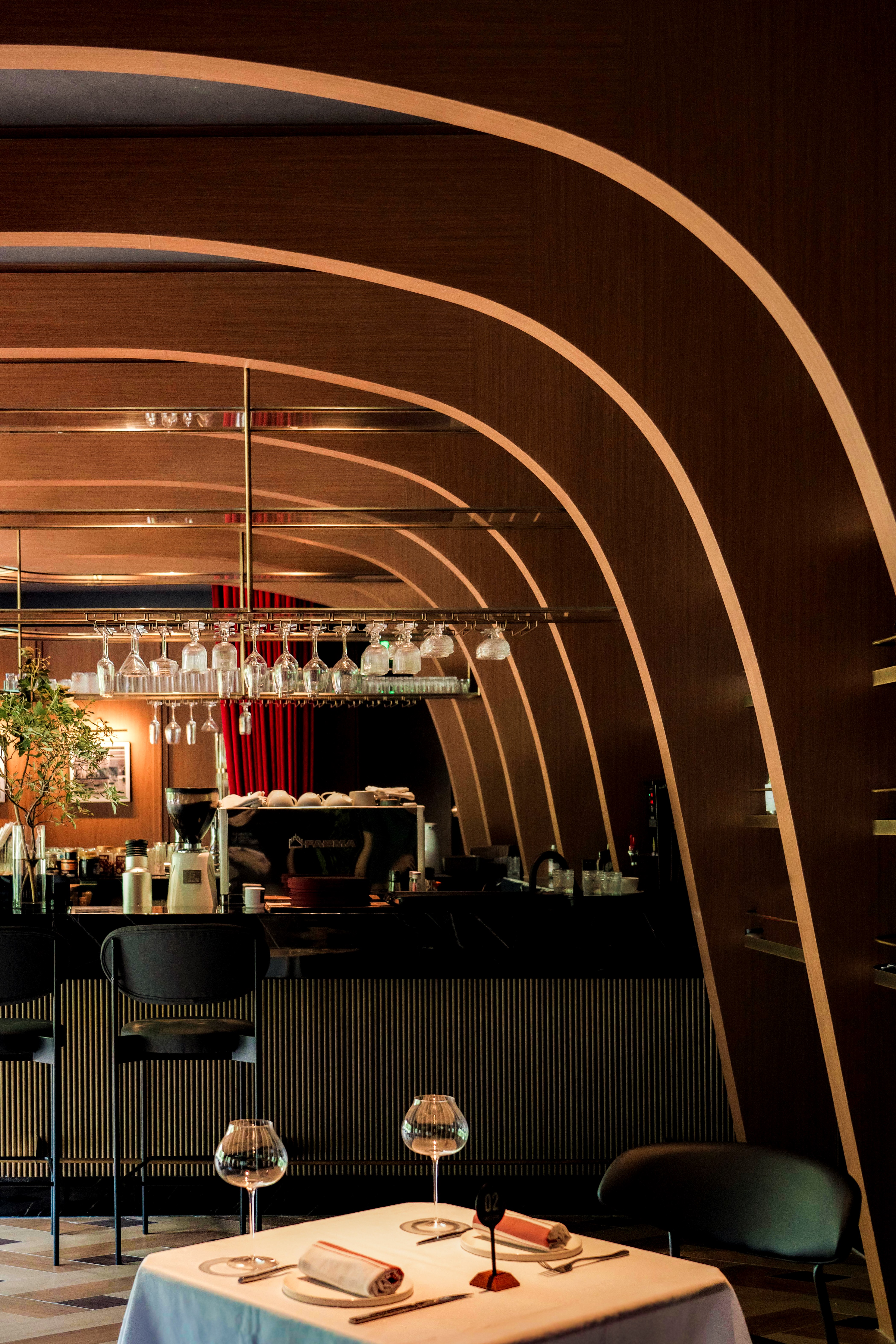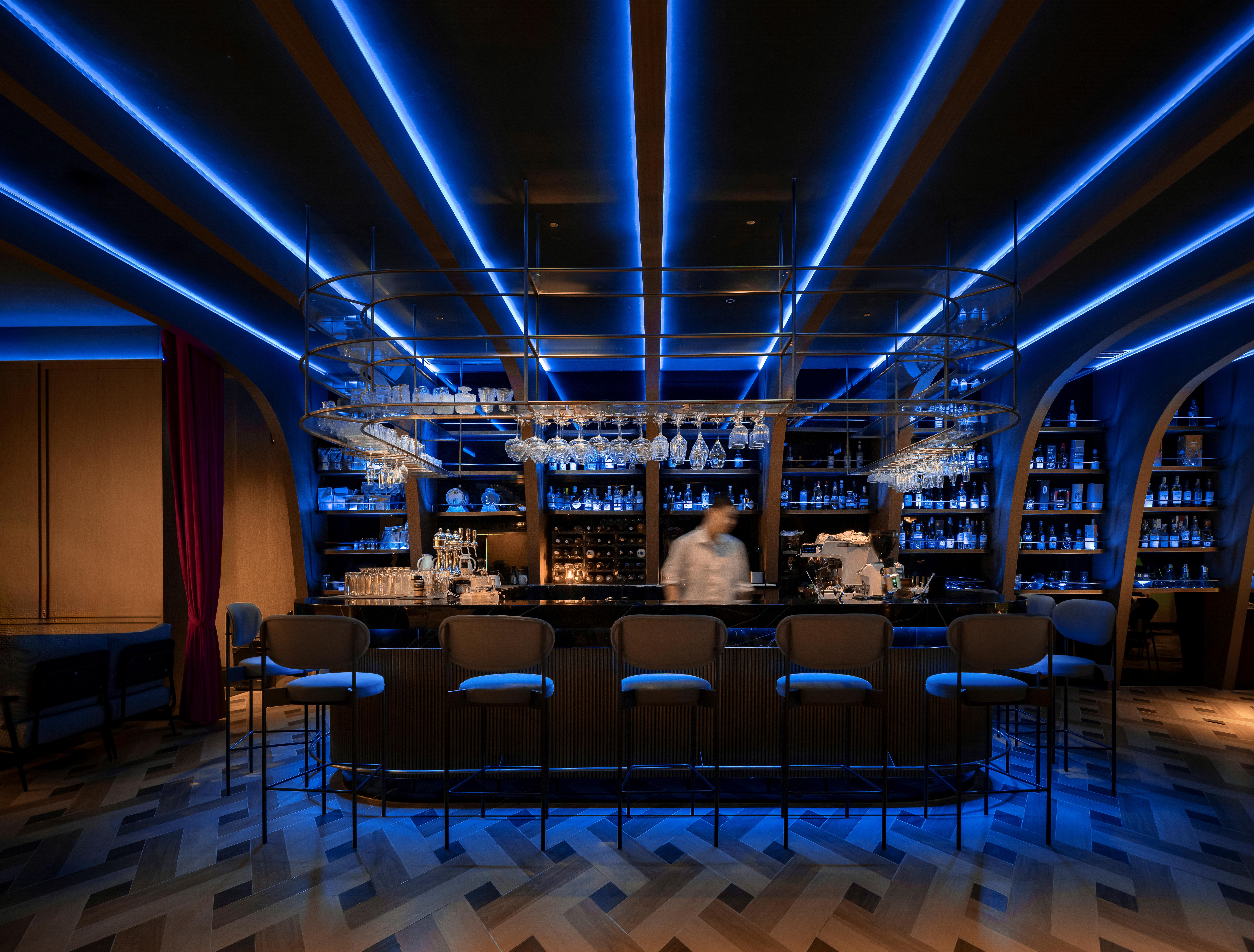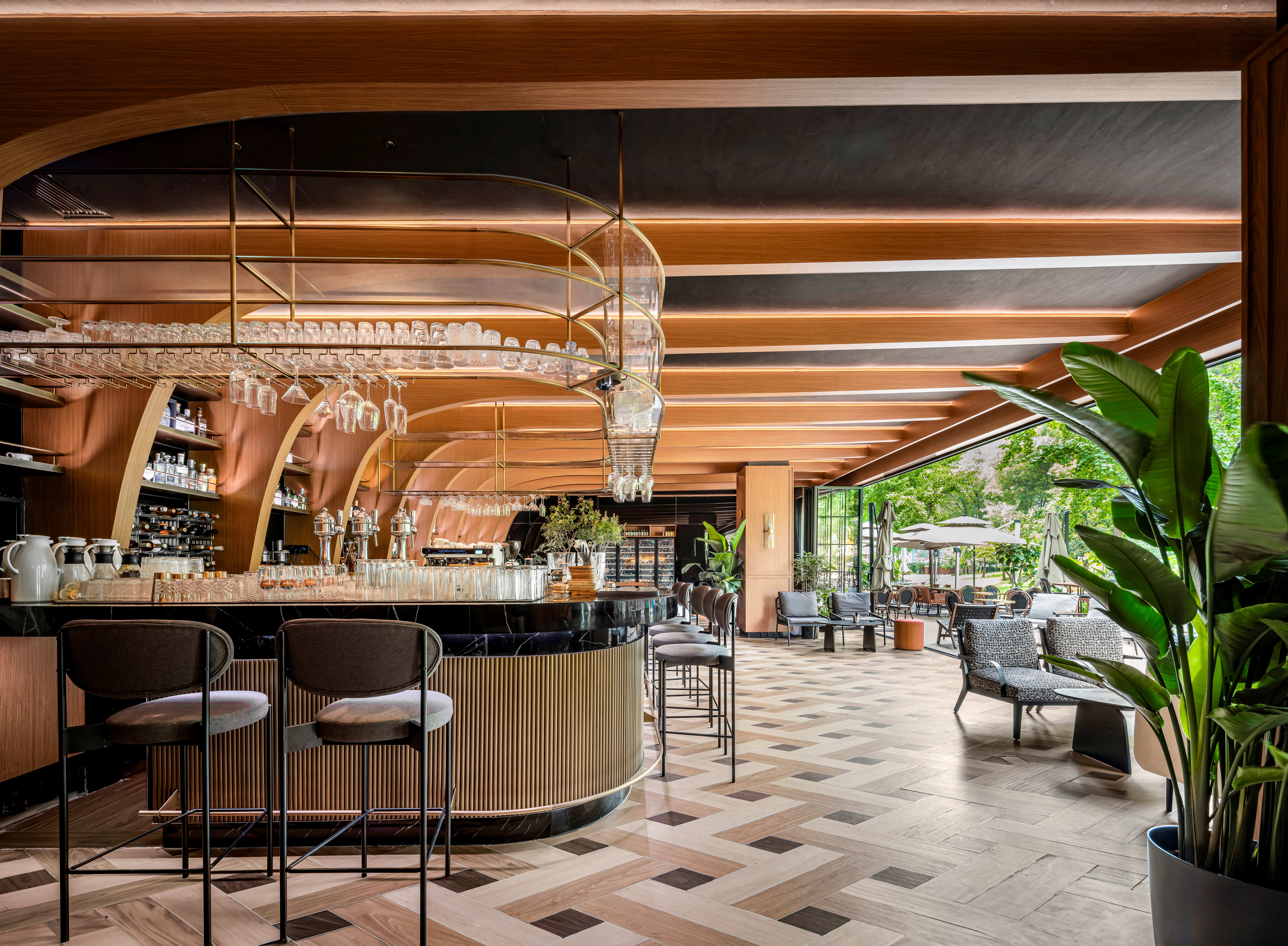 设计选材:我们在场地中央置入了一个融合装置与功能双重属性的吧台。吧台背靠墙面,朝向室外,台面由整块的镜面黑色石材打造,立面为氧化做旧的黄铜波纹板,结合与之呼应的黄铜吊架,好似一艘即将离港远航的游轮。而在夜色降临后来访的每位饮客,都好像登船远行的船客。站在中心位置的调酒师精准地晃动手中制作的威士忌,像一位表演者,更像一位掌舵的船长,在旖旎的灯光中,在美妙的音乐中,与船客一同精神远航。