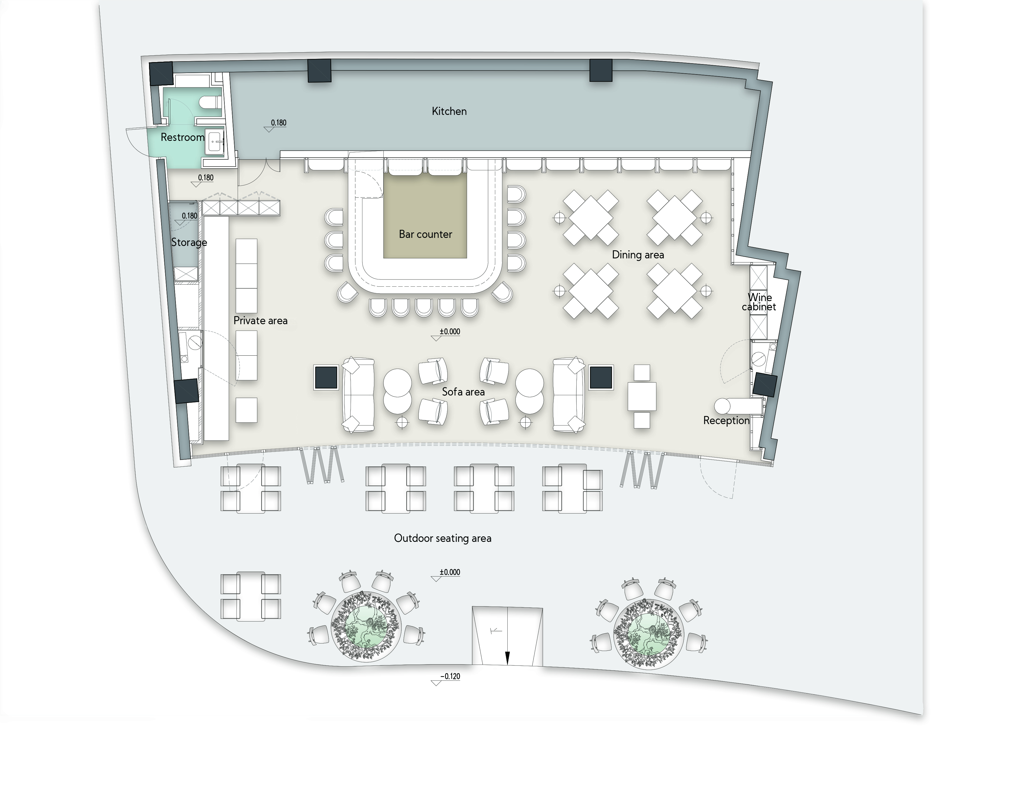 项目定位:The Place位于北京CBD核心地段的开放式国际社区中,品牌主理人希望重新改造空间设计,以此全面树立品牌形象。我们为其提出打造一个“新社交地标”的全新品牌理念,一个“自由的客厅化餐饮空间”,我们希望它成为一个“agora”般的存在(古希腊城邦公共生活与社交活动的中心),为社群公共生活增加开放性及便利性生活配套设施,用自由和松弛感链接归属感。