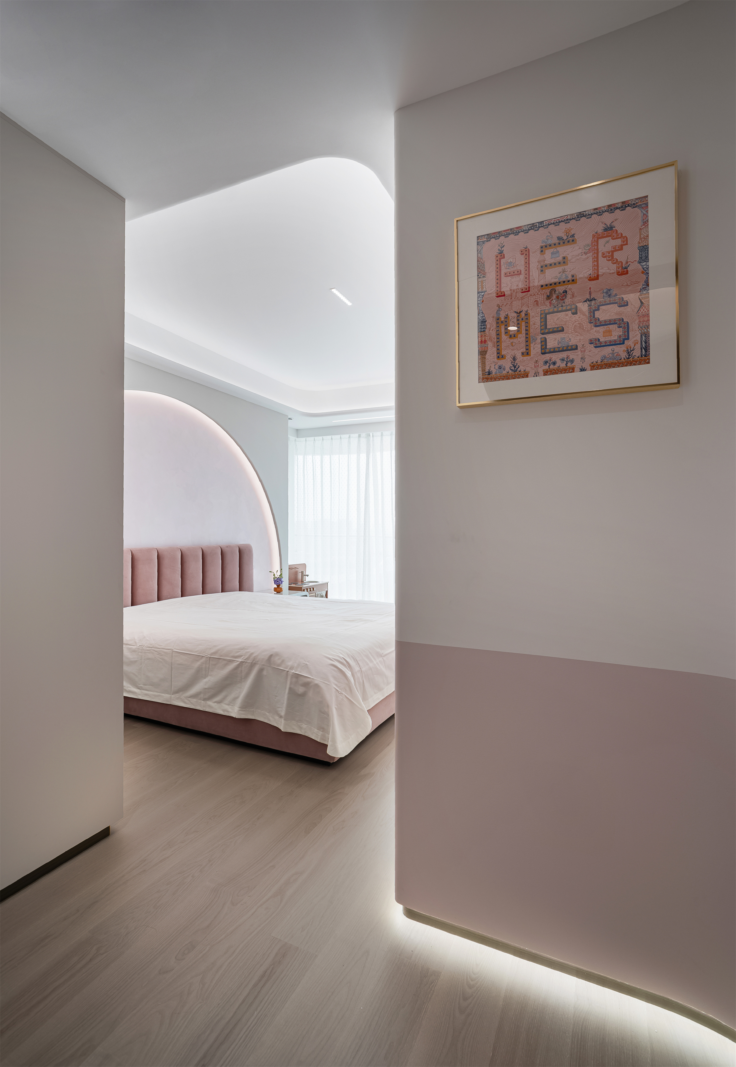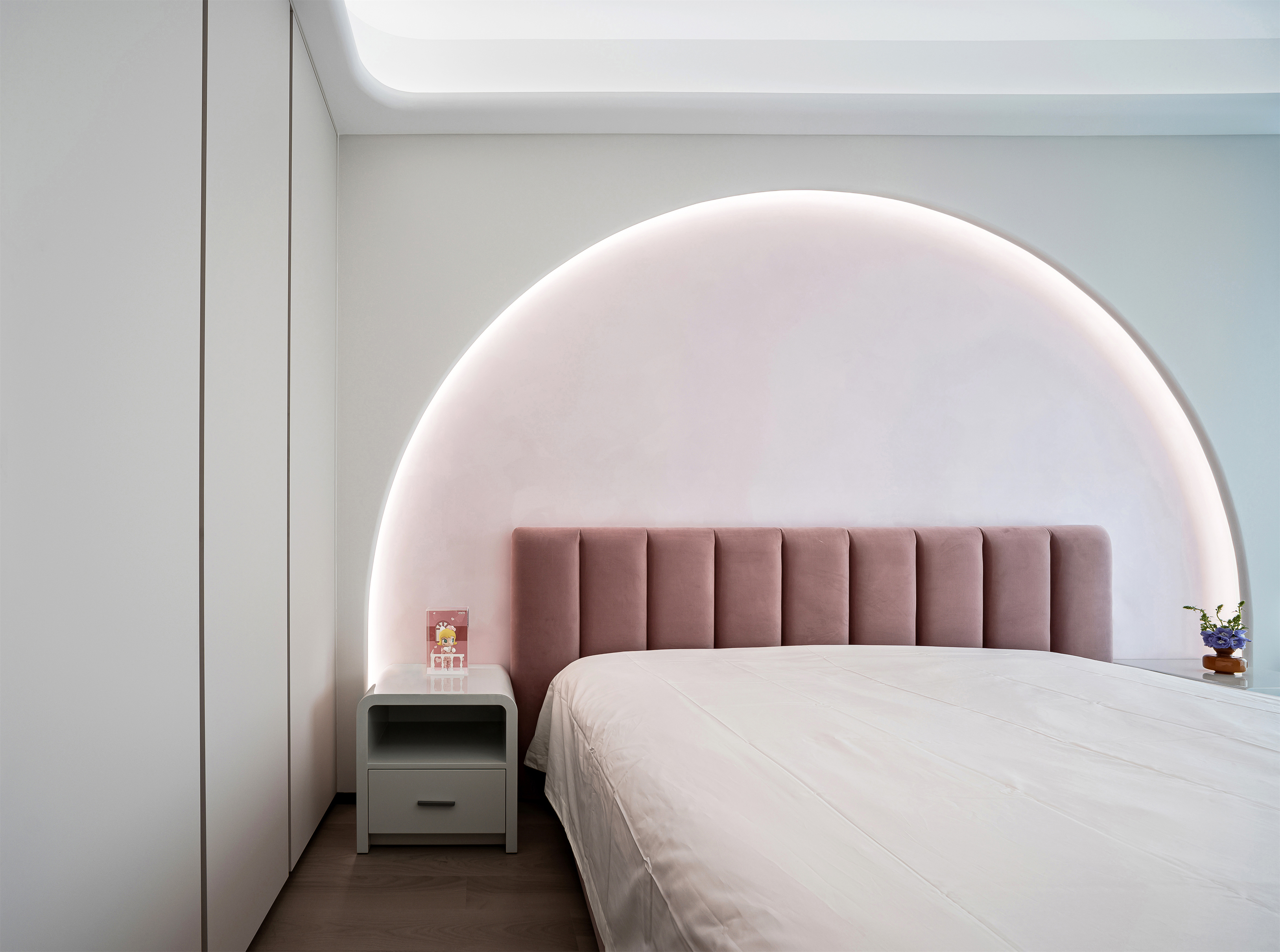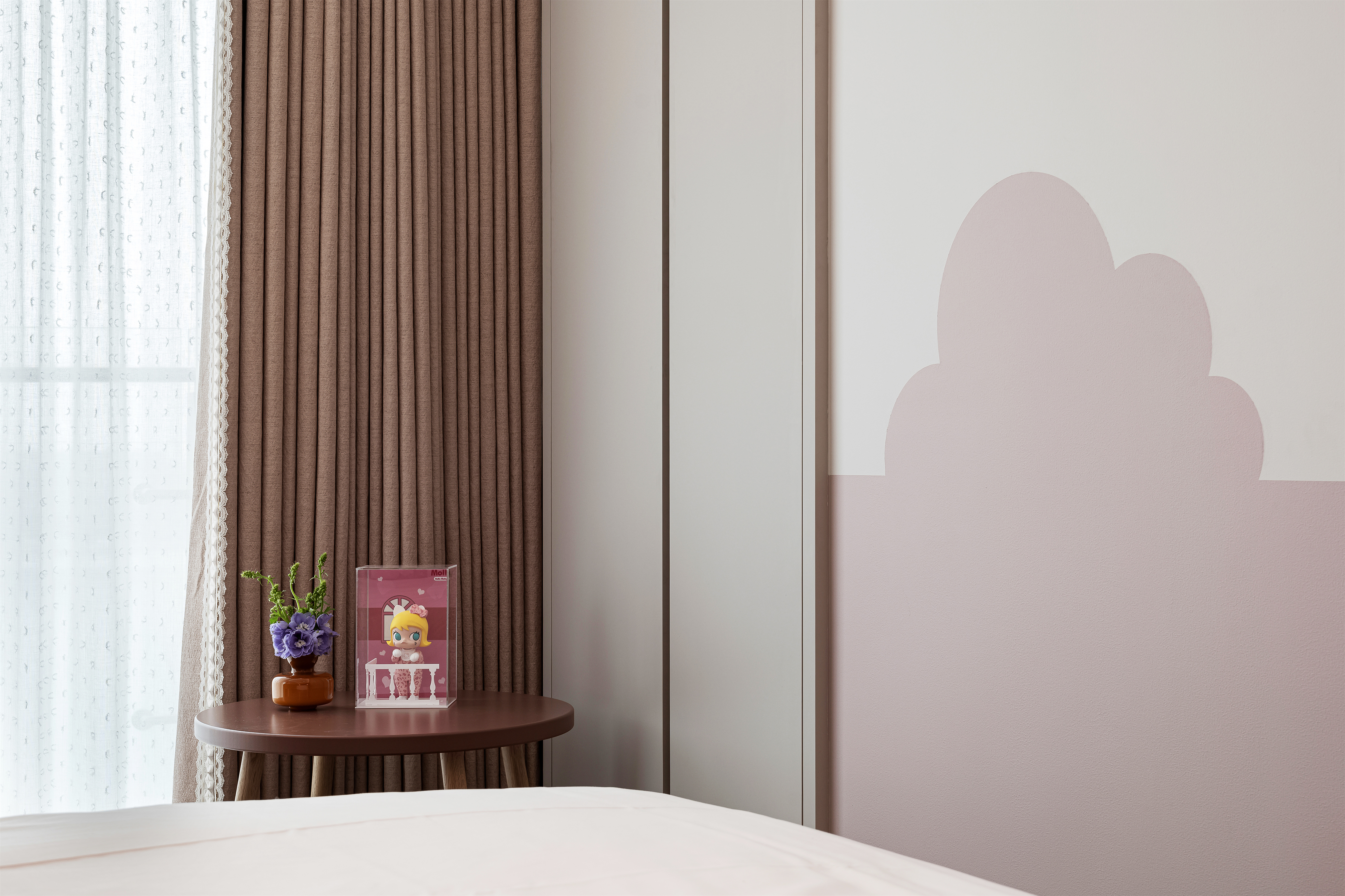 设计选材:我们用仿地毯砖为客厅铺上了一块直径四米的圆形“地毯”,上面细腻的黑白千鸟格图案打破了地板大面积白色的单调,在便于日常打理的前提下,赋予了空间更加丰富的层次感。我们也尊重每个家庭成员的个性与喜好,将每个卧室打造成独属于他们的小天地。主卧的沉稳深邃是主人看尽繁华,回归本真的人生领悟,男孩房的高级灰是少年对于时尚个性的追求,大女孩房的法式浪漫是少女对于优雅生活的向往,而小女孩房的粉嫩正如家中最可爱的小天使脸上的笑容一样甜美。