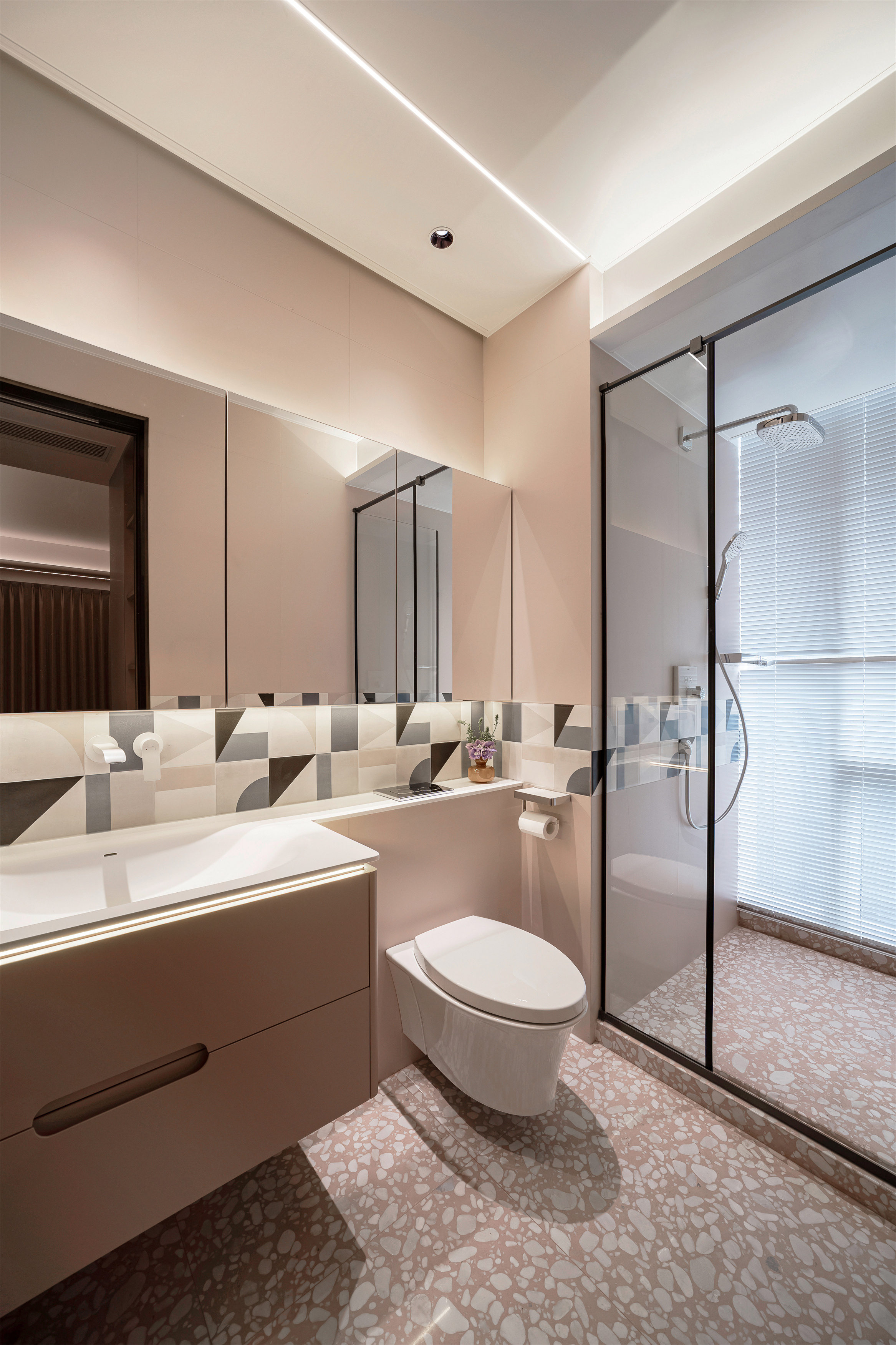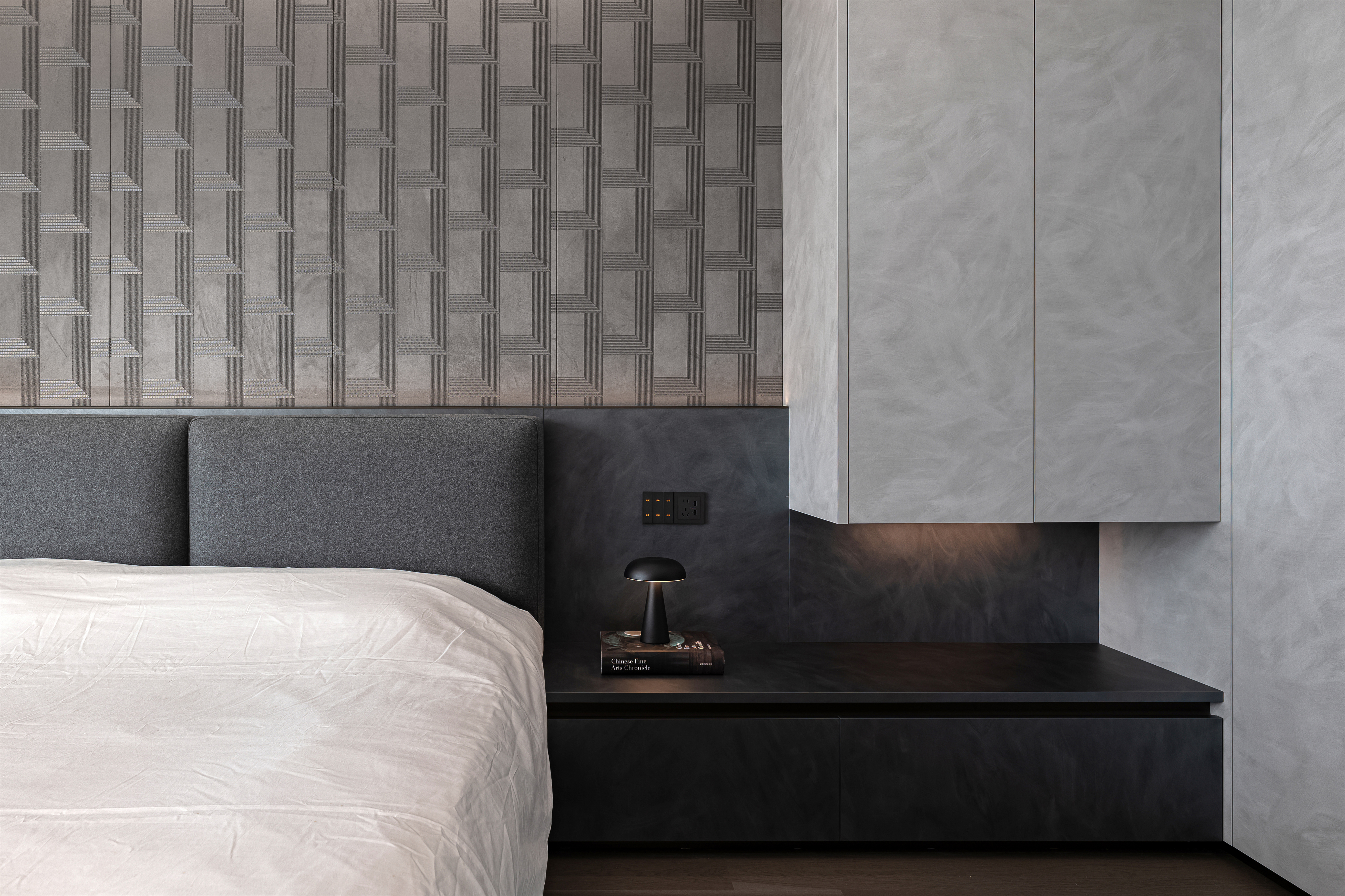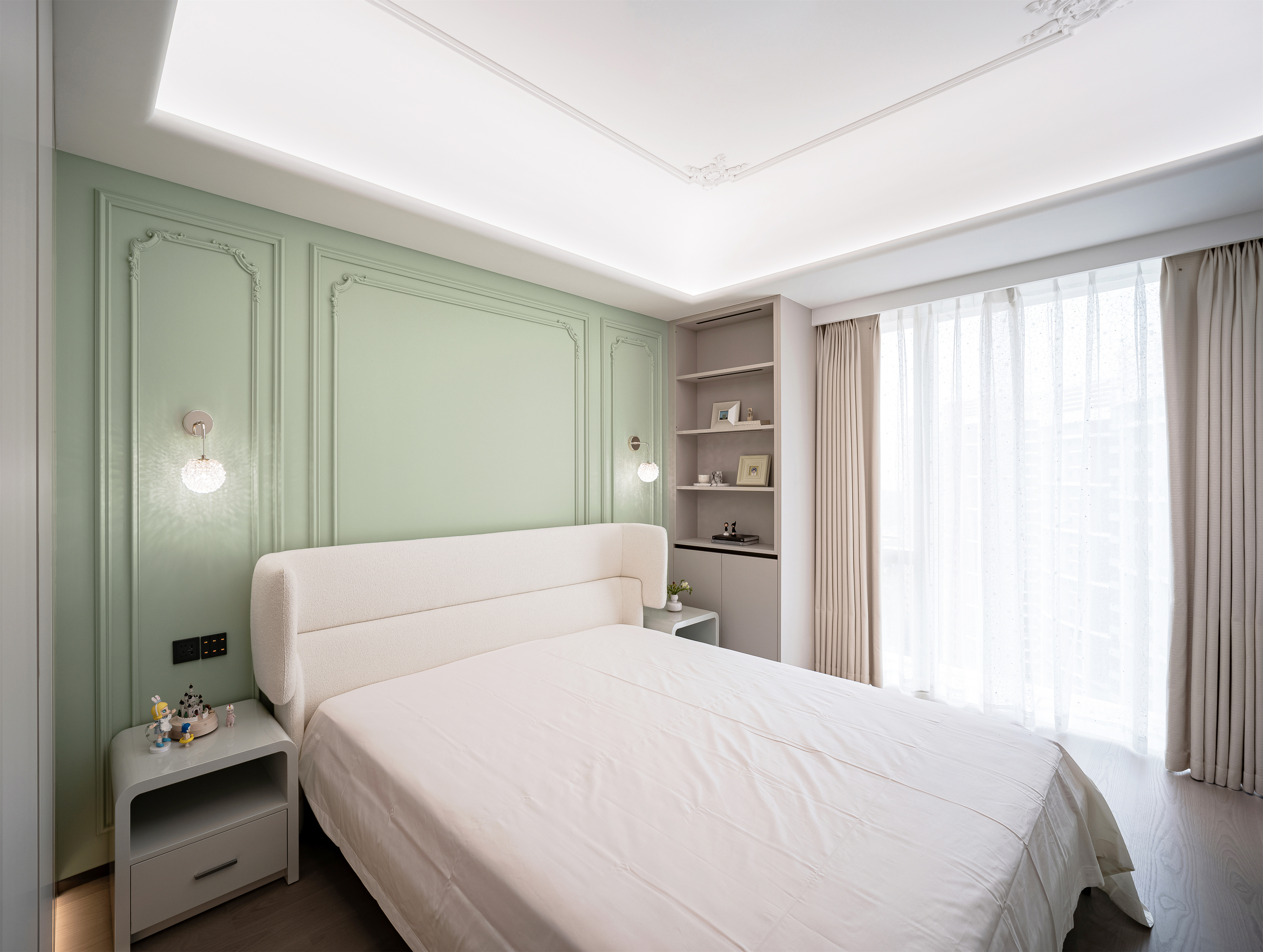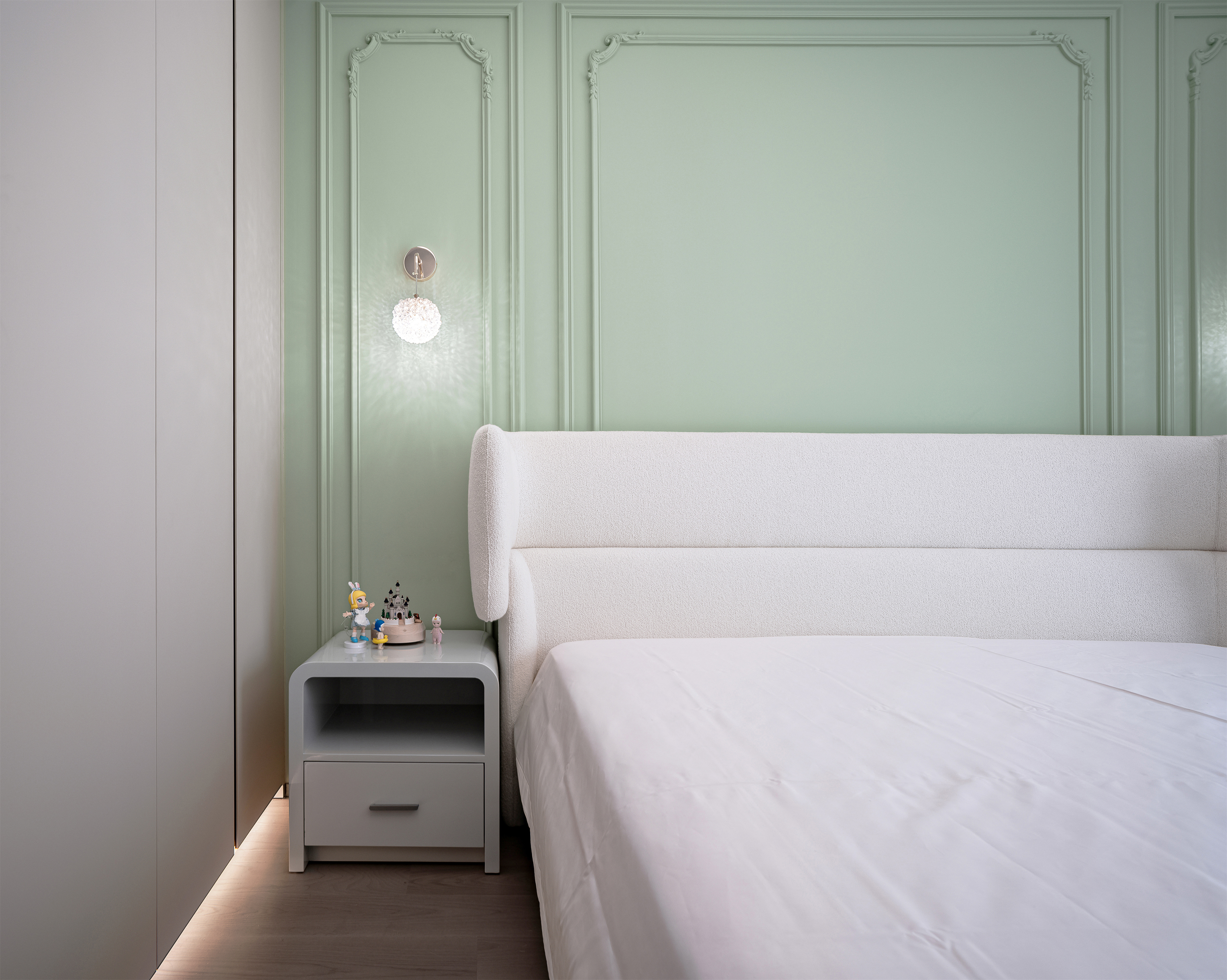 设计选材:我们用仿地毯砖为客厅铺上了一块直径四米的圆形“地毯”,上面细腻的黑白千鸟格图案打破了地板大面积白色的单调,在便于日常打理的前提下,赋予了空间更加丰富的层次感。我们也尊重每个家庭成员的个性与喜好,将每个卧室打造成独属于他们的小天地。主卧的沉稳深邃是主人看尽繁华,回归本真的人生领悟,男孩房的高级灰是少年对于时尚个性的追求,大女孩房的法式浪漫是少女对于优雅生活的向往,而小女孩房的粉嫩正如家中最可爱的小天使脸上的笑容一样甜美。