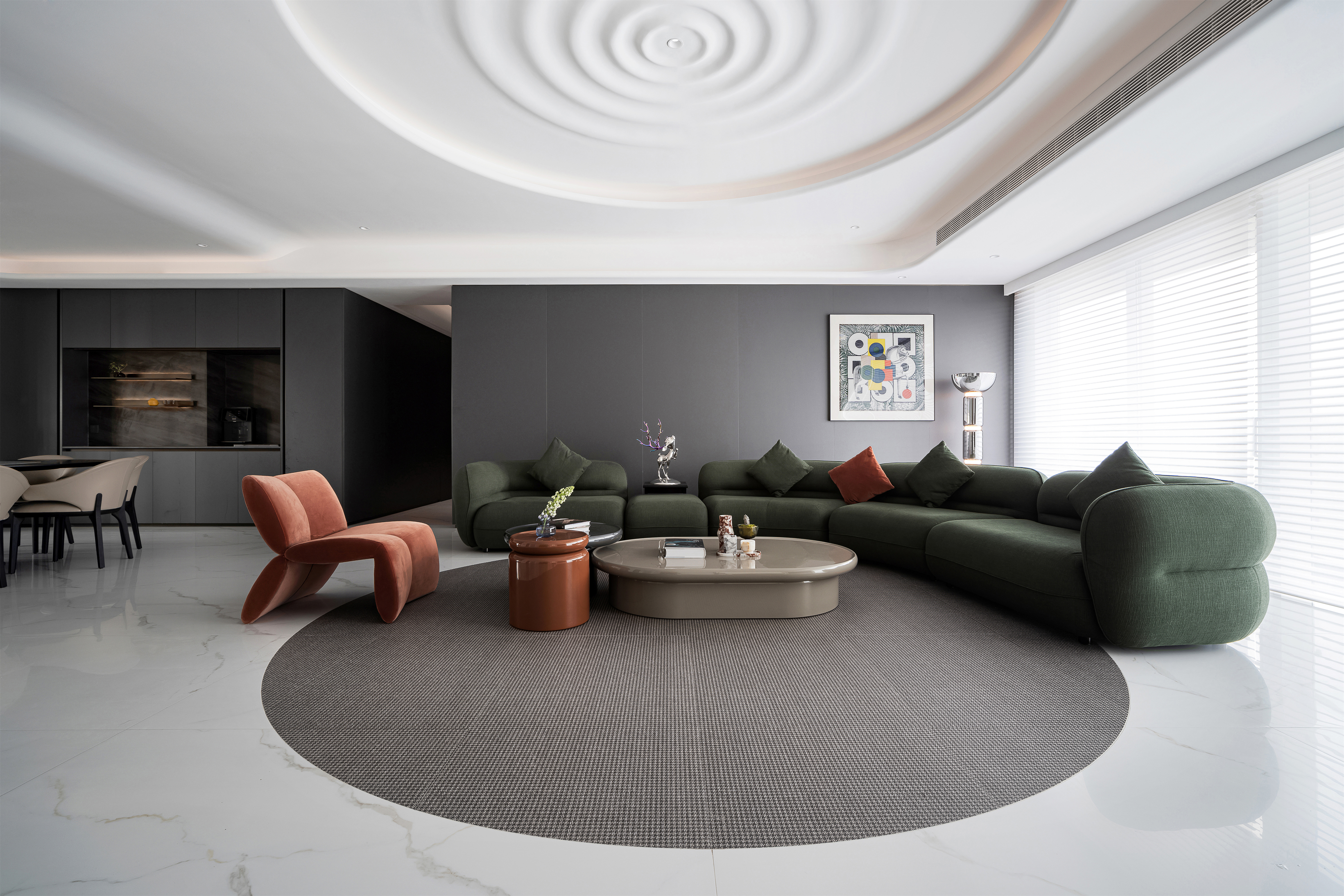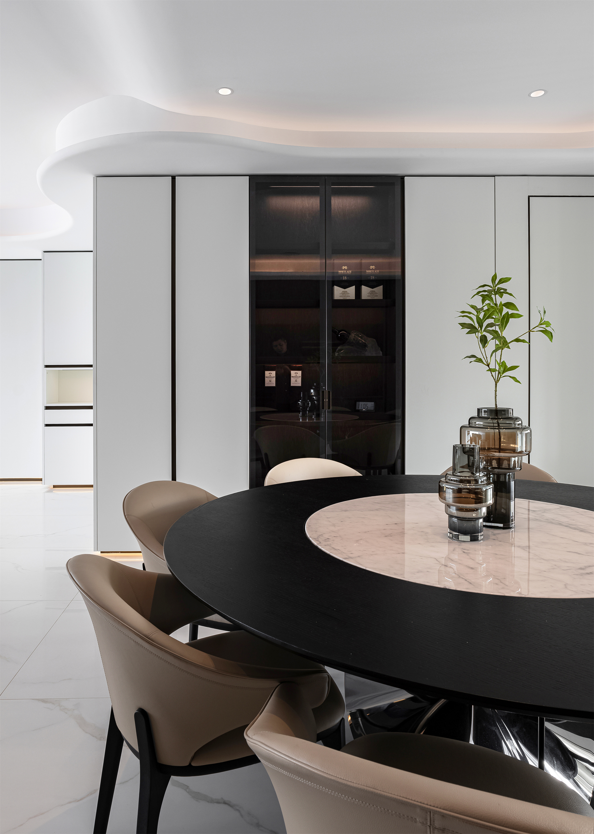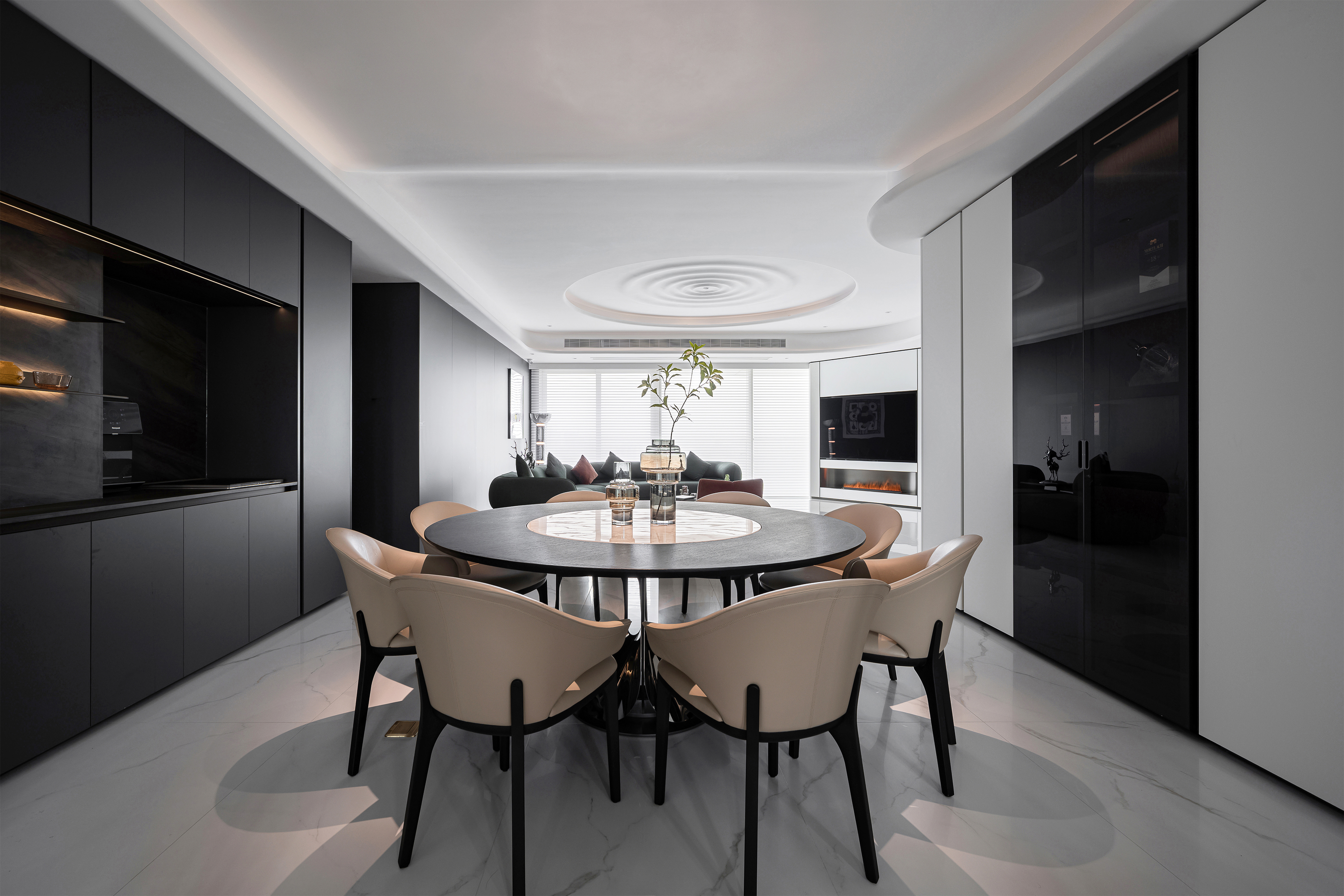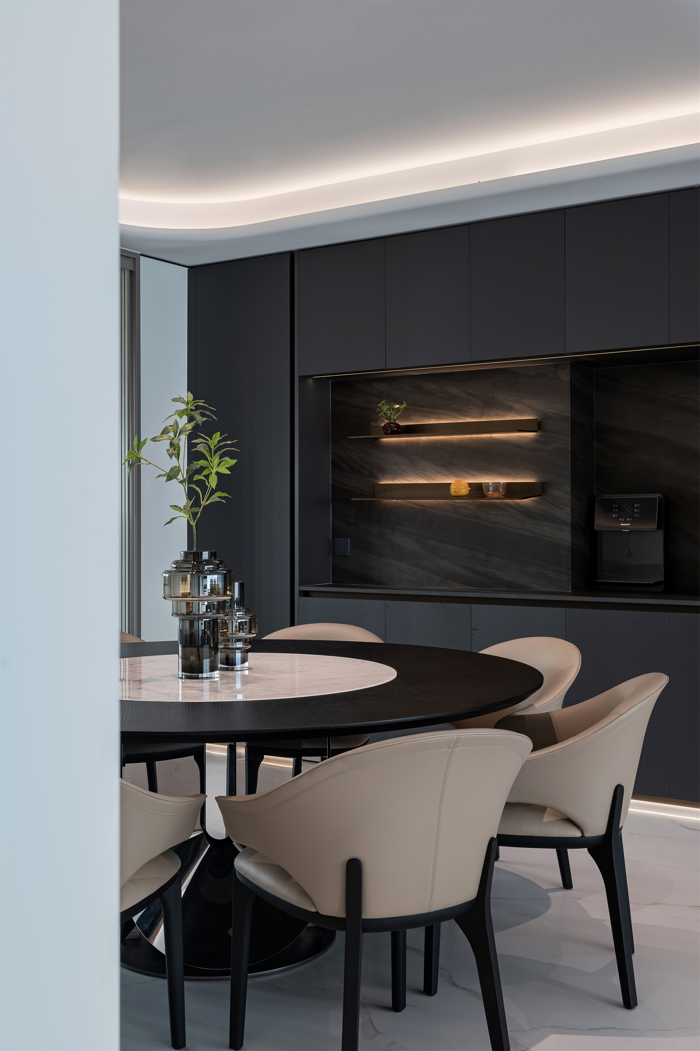空间意境:客厅吊顶自由柔美的曲线与水波涟漪的造型,仿佛是窗外海景的延伸。圆润饱满的“波波球”沙发环绕在客厅中央,搭配着巨大的圆形“地毯”和水波涟漪吊顶,似一双无形的大手,将一家人环抱在一起嬉笑打闹,畅谈生活。壁炉里的“火光”闪烁,橙红色的光影洒在家人的脸上,温暖而舒适。基于通透明亮且宽敞的空间优势,我们借用深邃的黑色来加强整体客餐厅的气场,凝聚空间焦点。黑与白,这两种极致的颜色既彼此抗衡,又互为衬托,在空间中呈现出严谨的秩序与和谐。在这样极简的色调中,以一抹墨绿,几许珊瑚红为点缀,打破了场域的沉寂,与窗外涌入的海景,共同渲染出“海上家”的宁静与悠然。
