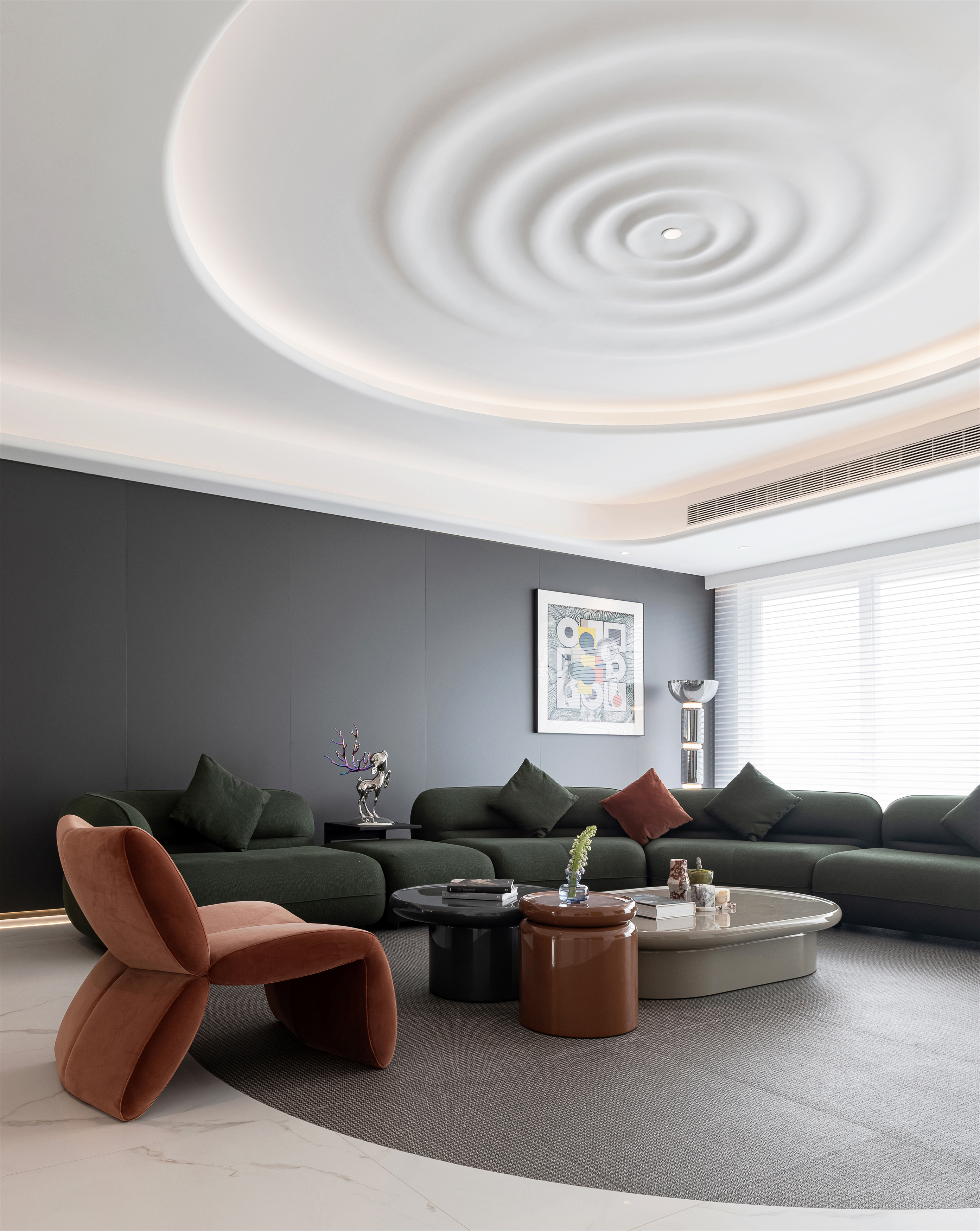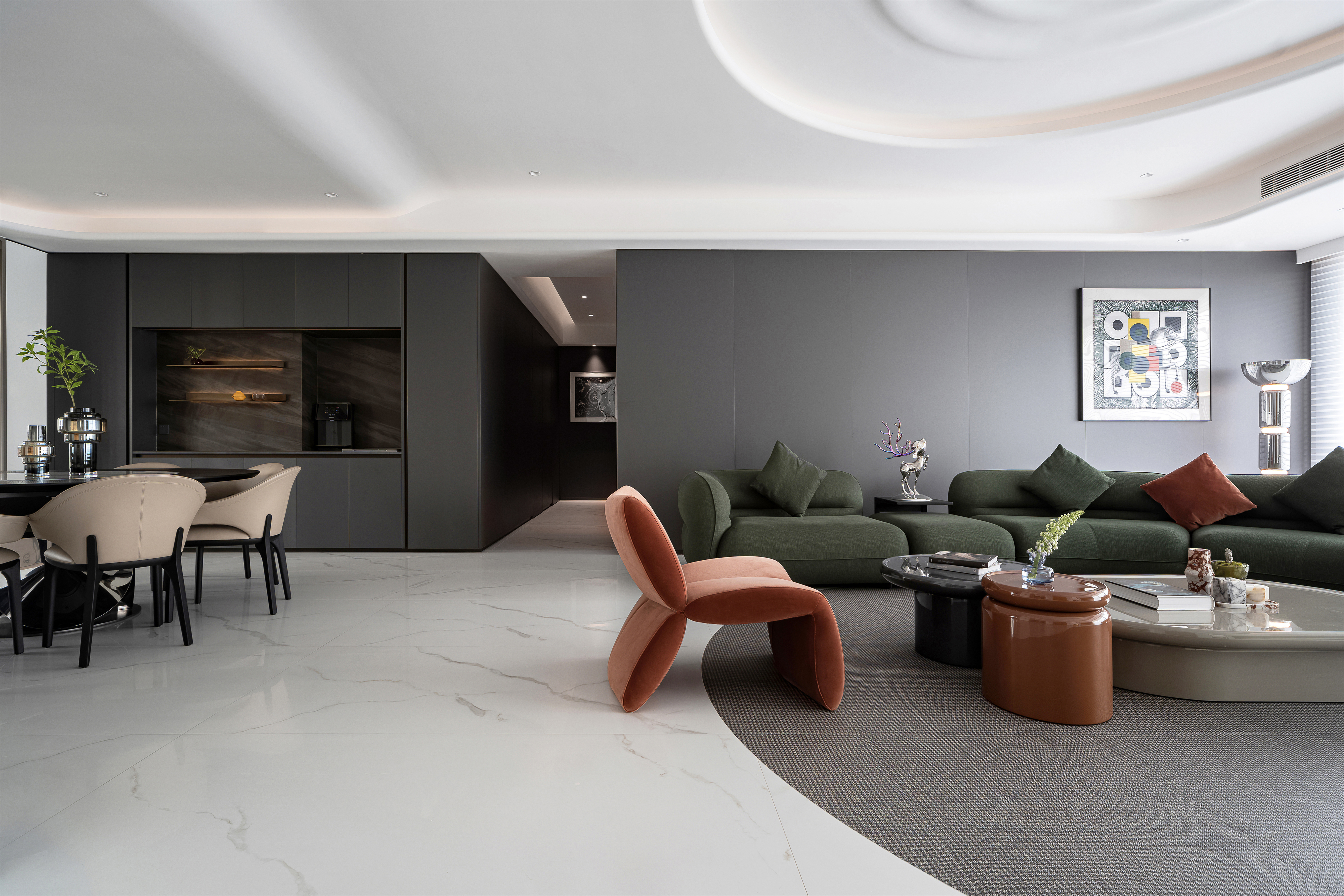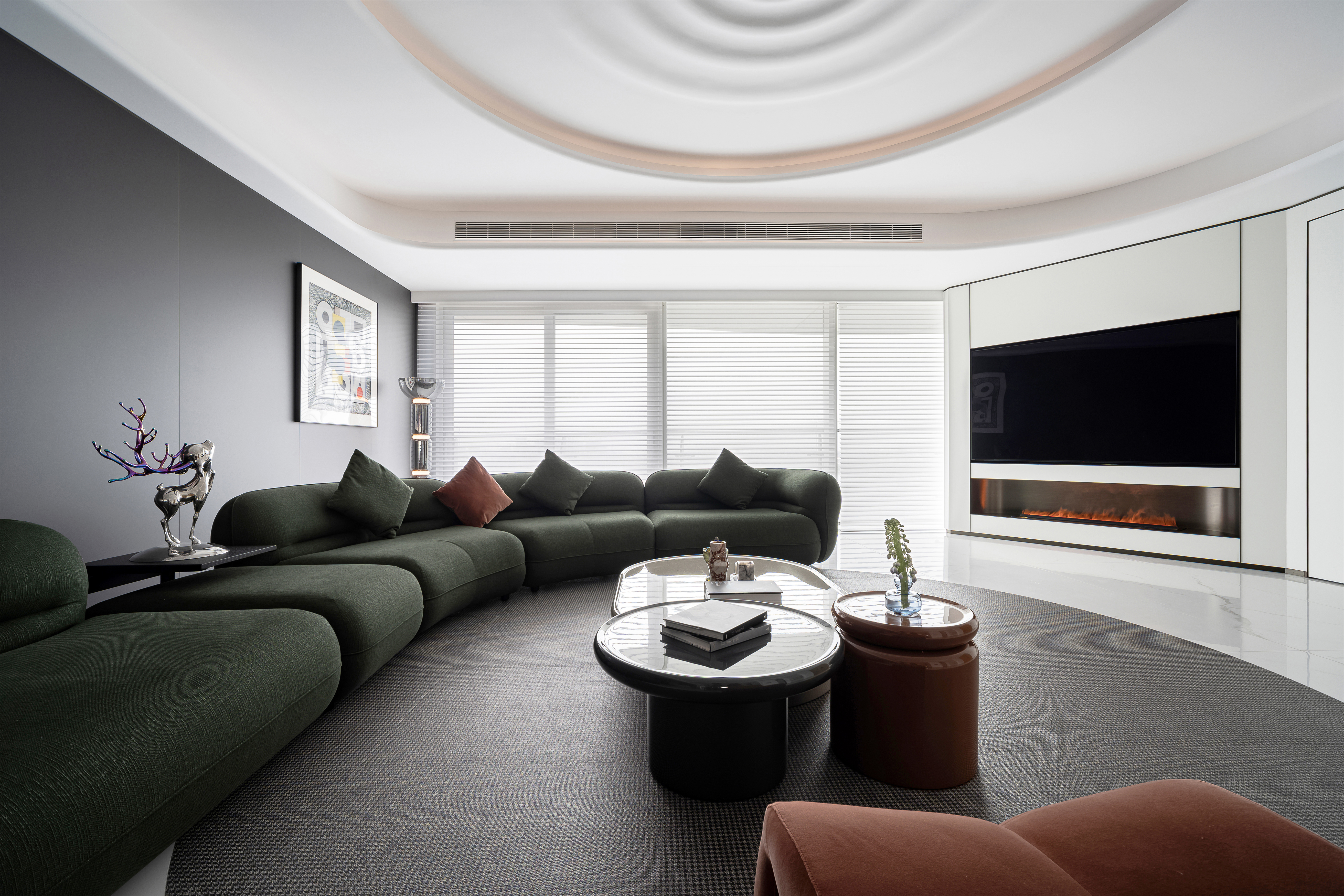 空间意境:客厅吊顶自由柔美的曲线与水波涟漪的造型,仿佛是窗外海景的延伸。圆润饱满的“波波球”沙发环绕在客厅中央,搭配着巨大的圆形“地毯”和水波涟漪吊顶,似一双无形的大手,将一家人环抱在一起嬉笑打闹,畅谈生活。壁炉里的“火光”闪烁,橙红色的光影洒在家人的脸上,温暖而舒适。基于通透明亮且宽敞的空间优势,我们借用深邃的黑色来加强整体客餐厅的气场,凝聚空间焦点。黑与白,这两种极致的颜色既彼此抗衡,又互为衬托,在空间中呈现出严谨的秩序与和谐。在这样极简的色调中,以一抹墨绿,几许珊瑚红为点缀,打破了场域的沉寂,与窗外涌入的海景,共同渲染出“海上家”的宁静与悠然。