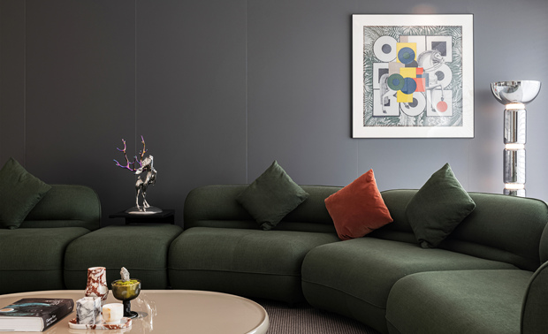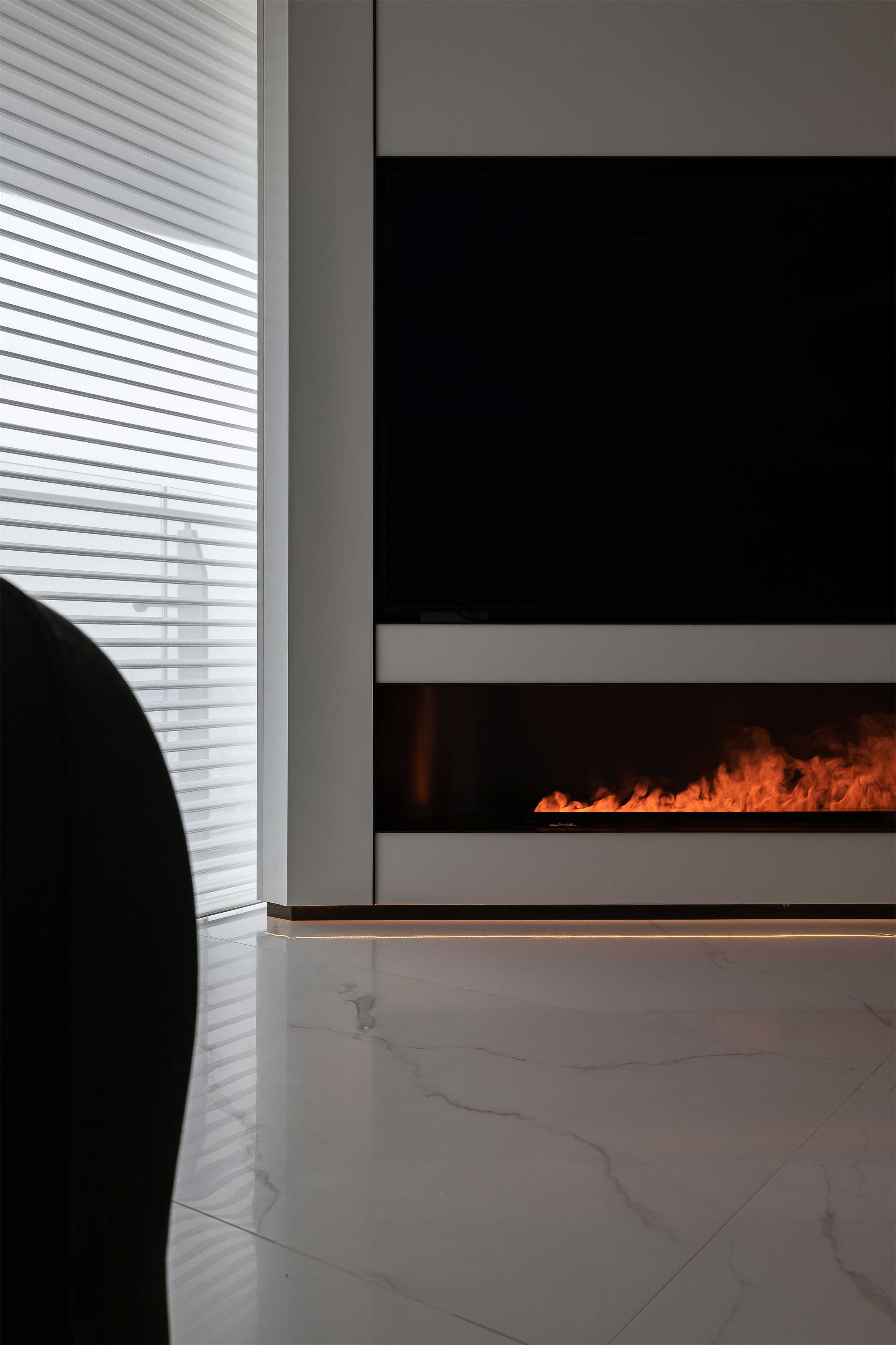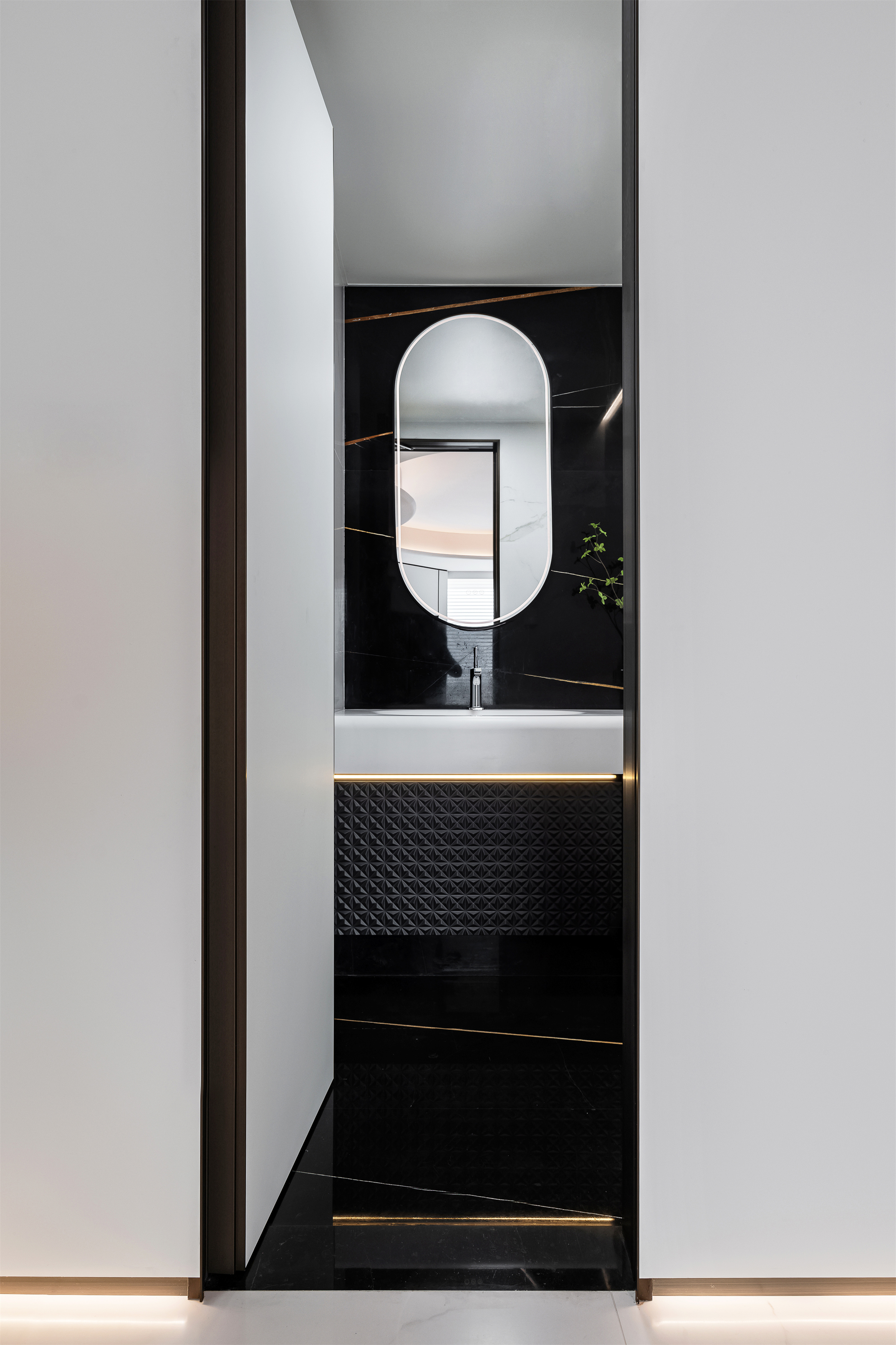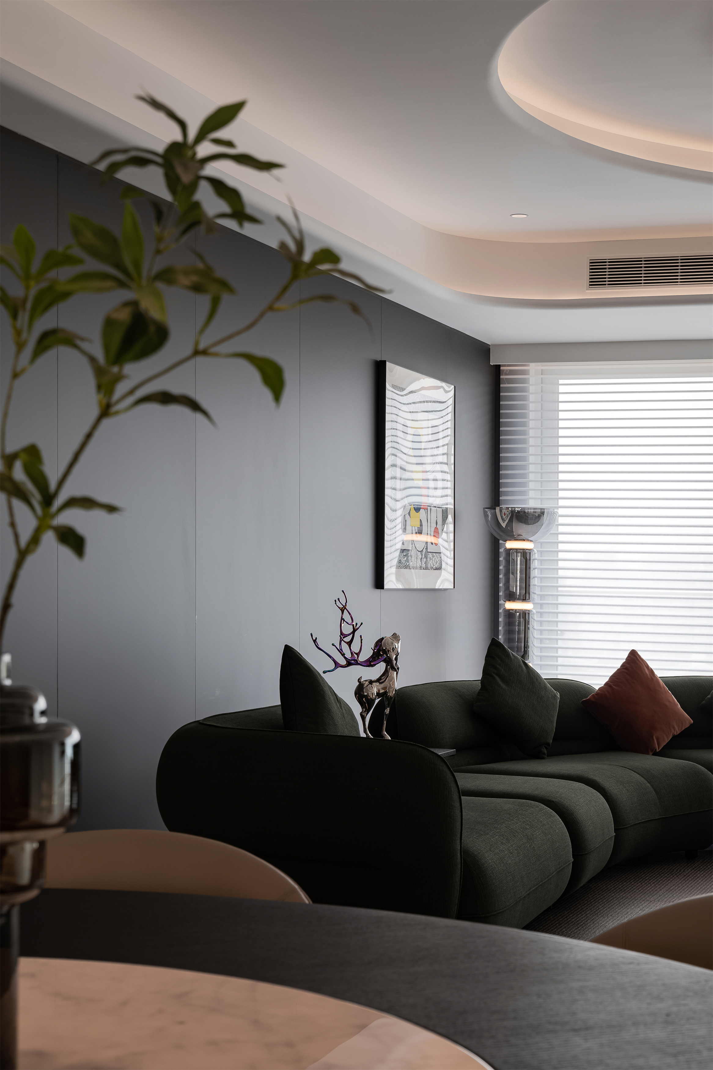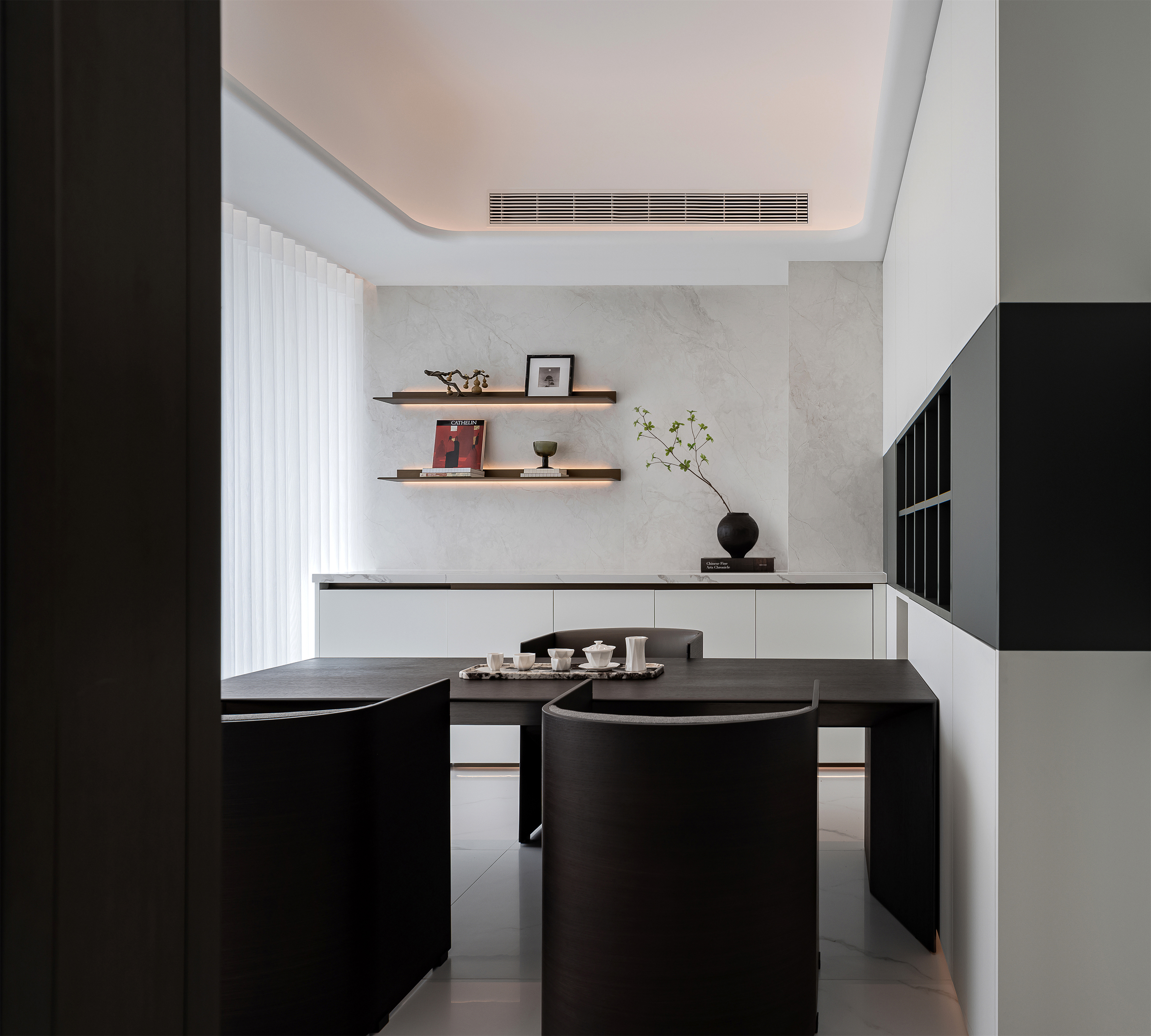 空间意境:客厅吊顶自由柔美的曲线与水波涟漪的造型,仿佛是窗外海景的延伸。圆润饱满的“波波球”沙发环绕在客厅中央,搭配着巨大的圆形“地毯”和水波涟漪吊顶,似一双无形的大手,将一家人环抱在一起嬉笑打闹,畅谈生活。壁炉里的“火光”闪烁,橙红色的光影洒在家人的脸上,温暖而舒适。基于通透明亮且宽敞的空间优势,我们借用深邃的黑色来加强整体客餐厅的气场,凝聚空间焦点。黑与白,这两种极致的颜色既彼此抗衡,又互为衬托,在空间中呈现出严谨的秩序与和谐。在这样极简的色调中,以一抹墨绿,几许珊瑚红为点缀,打破了场域的沉寂,与窗外涌入的海景,共同渲染出“海上家”的宁静与悠然。