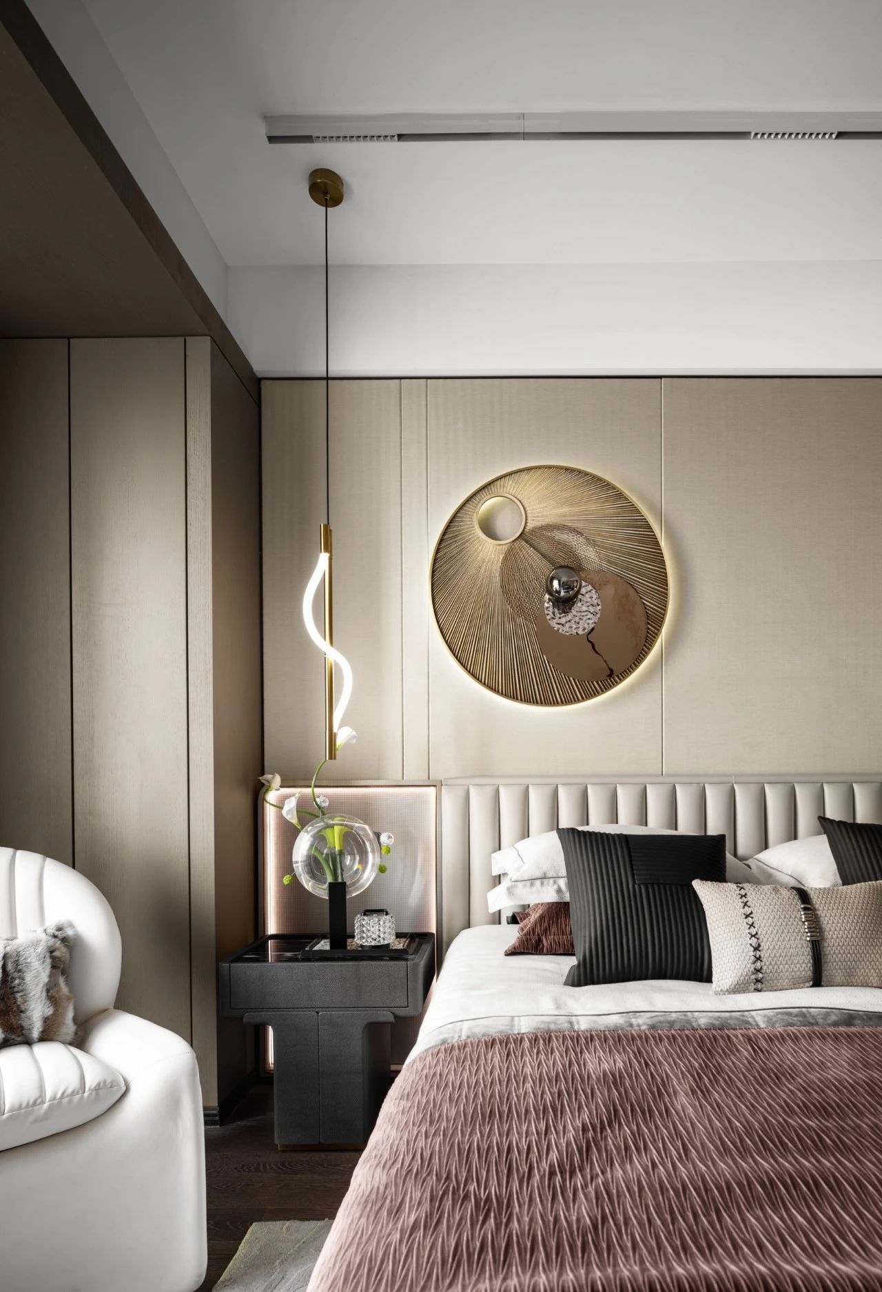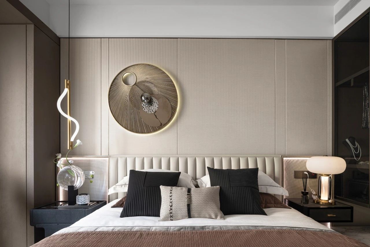 卧室的墙面采用了浅色系的壁纸,搭配金属装置画,营造出一种宁静而奢华的氛围。