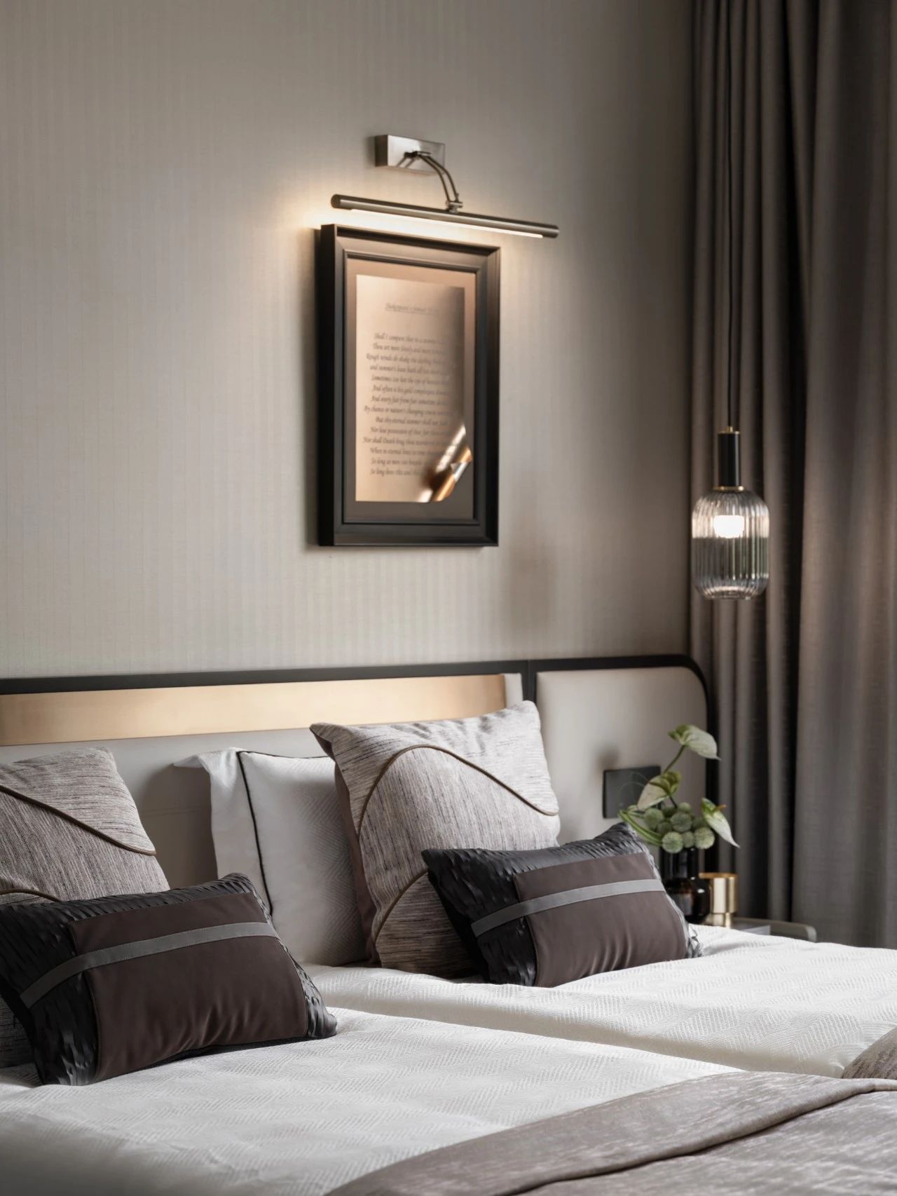 墙面采用浅色系壁纸,搭配金属装置画,营造宁静奢华氛围。