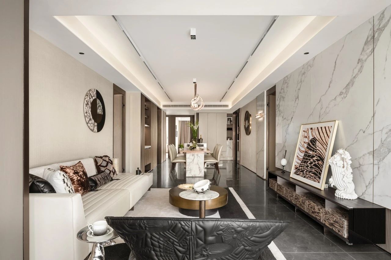 客厅的空间则是一种古典与现代完美融合的体现。皮质沙发搭配金属茶几,仿佛带人回到了那个优雅的年代。墙上的抽象画与现代艺术品相得益彰,展现出主人的品味与修养。